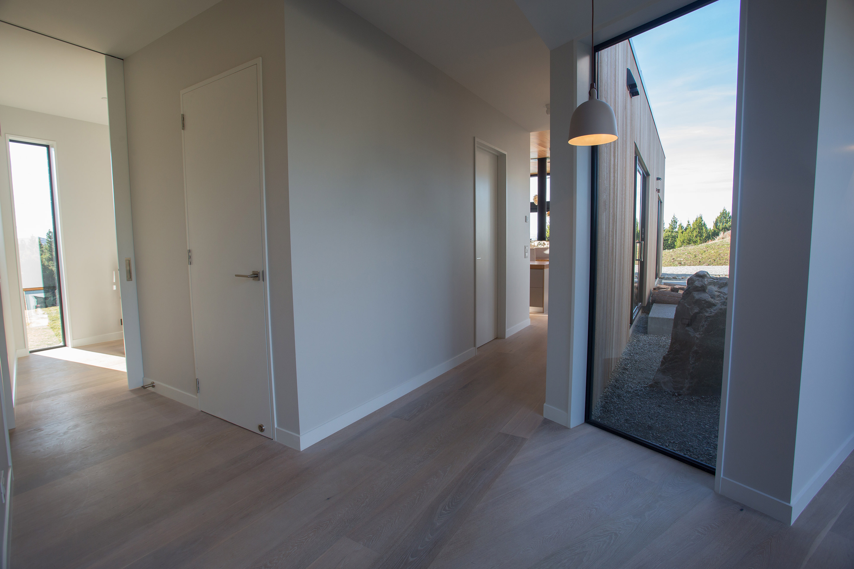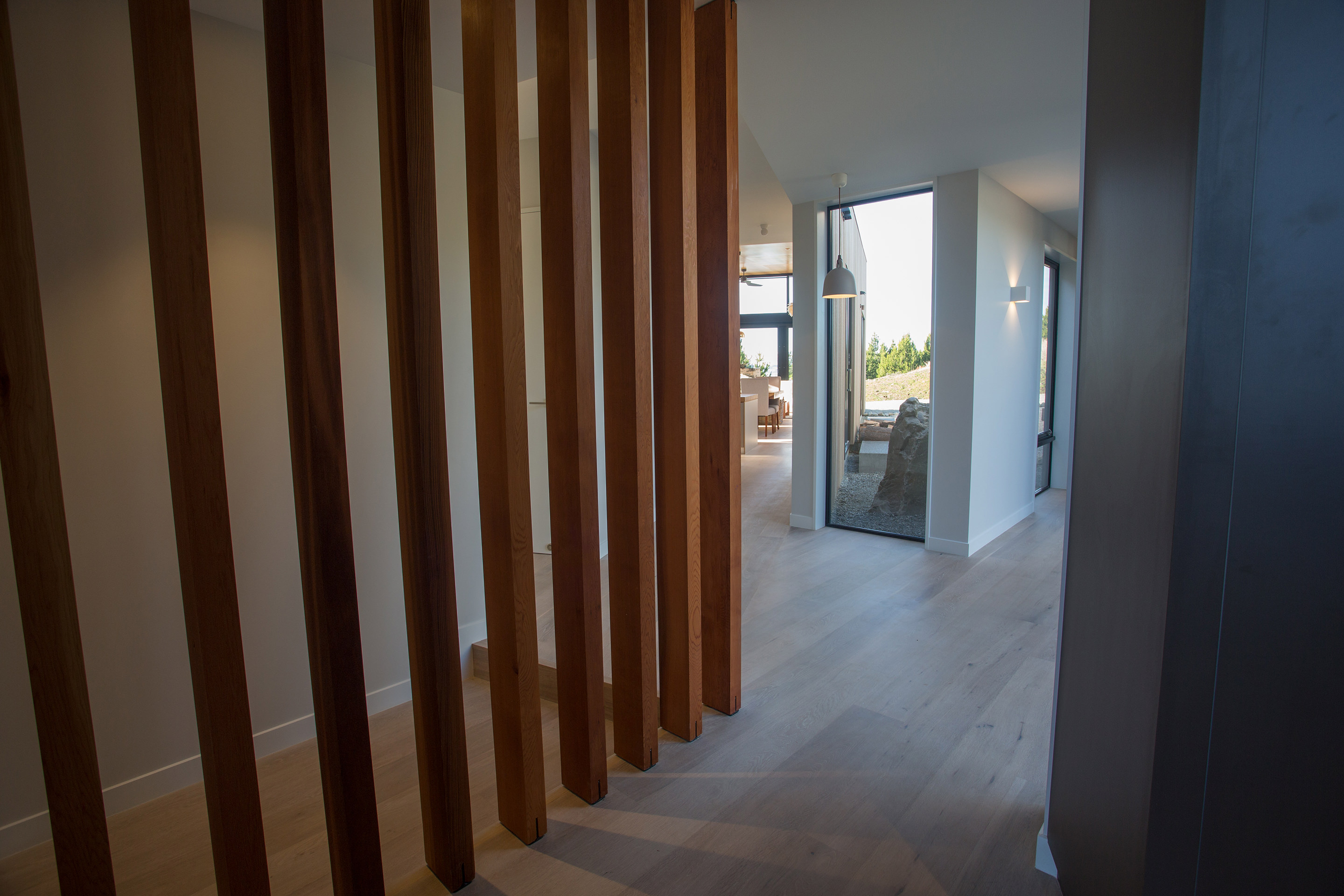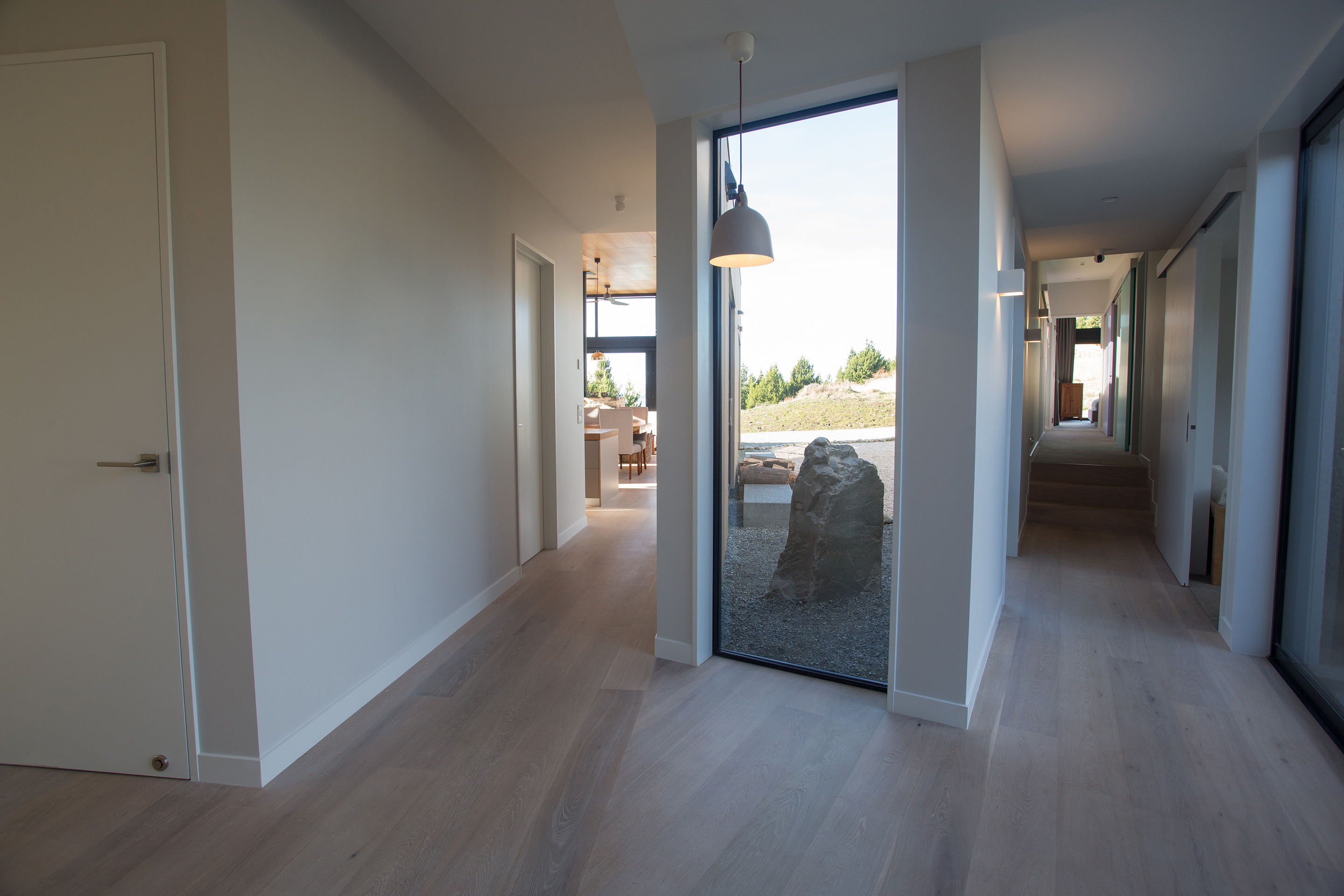 Upon entering the house, a central floor-to-ceiling window teases with a peek at the vista to come. It also acts as a crossroads that begs the question: left or right?