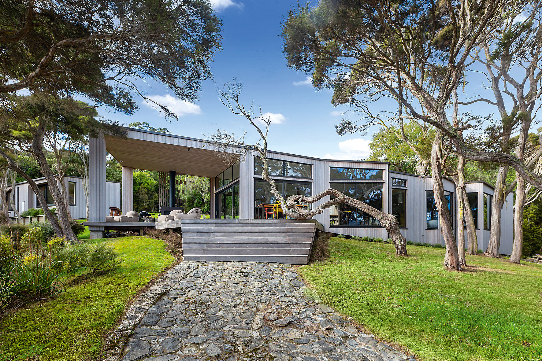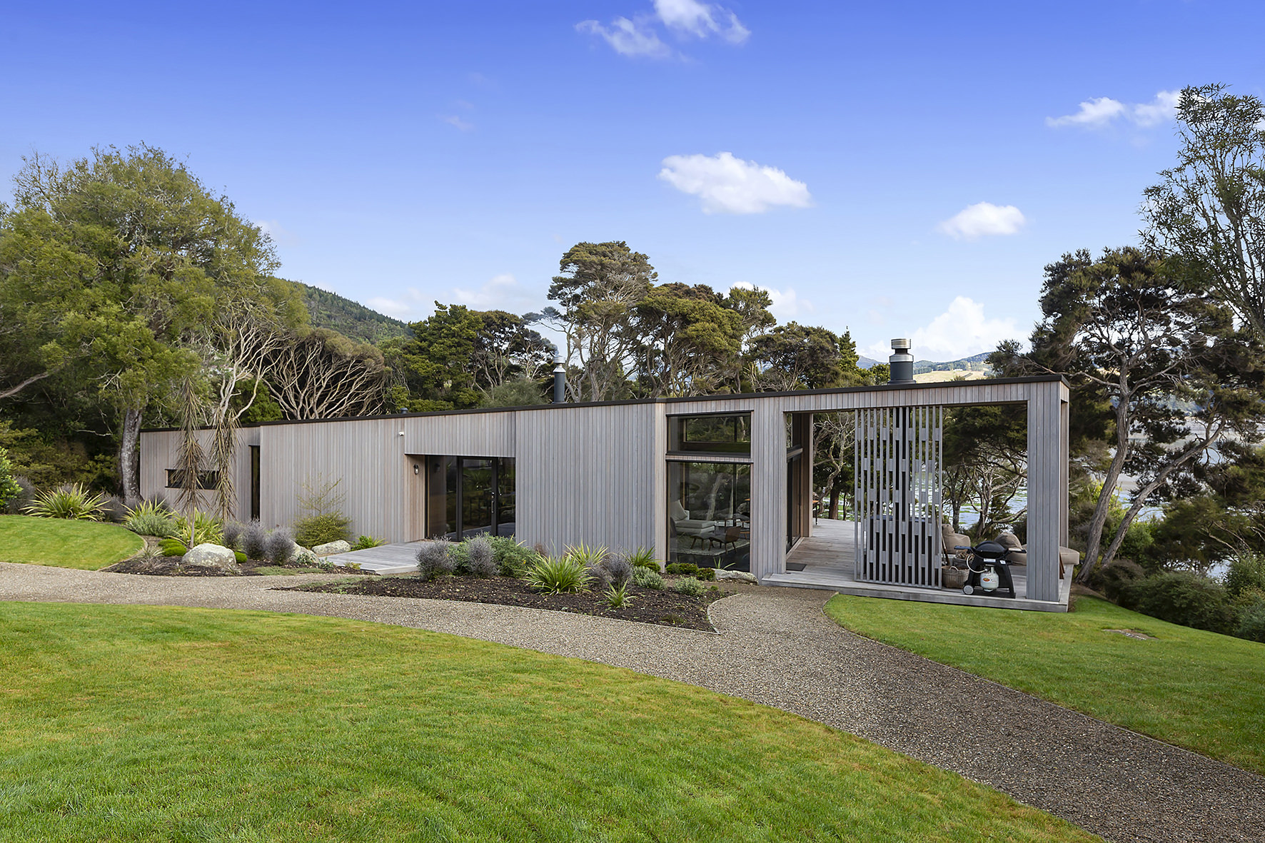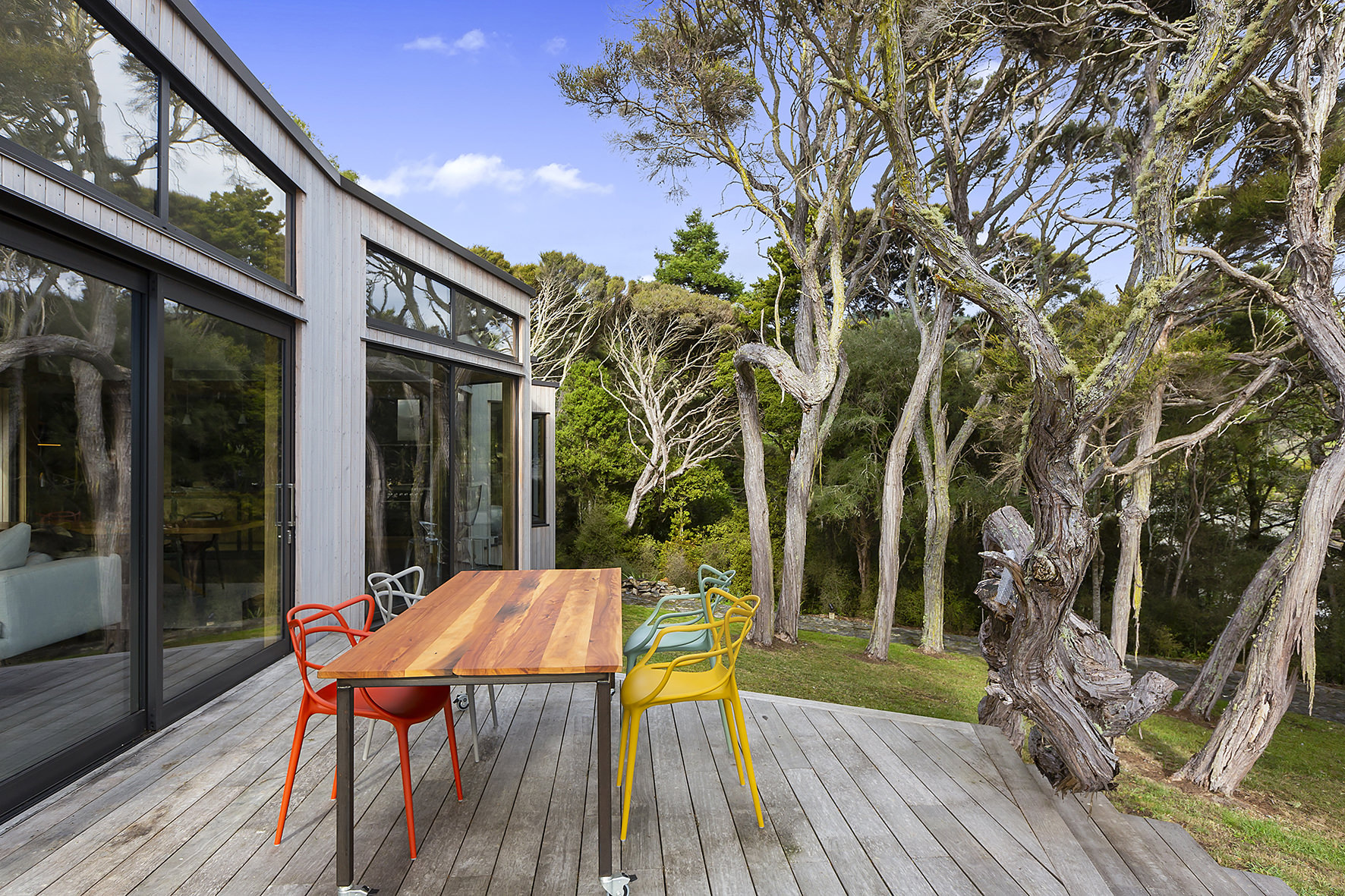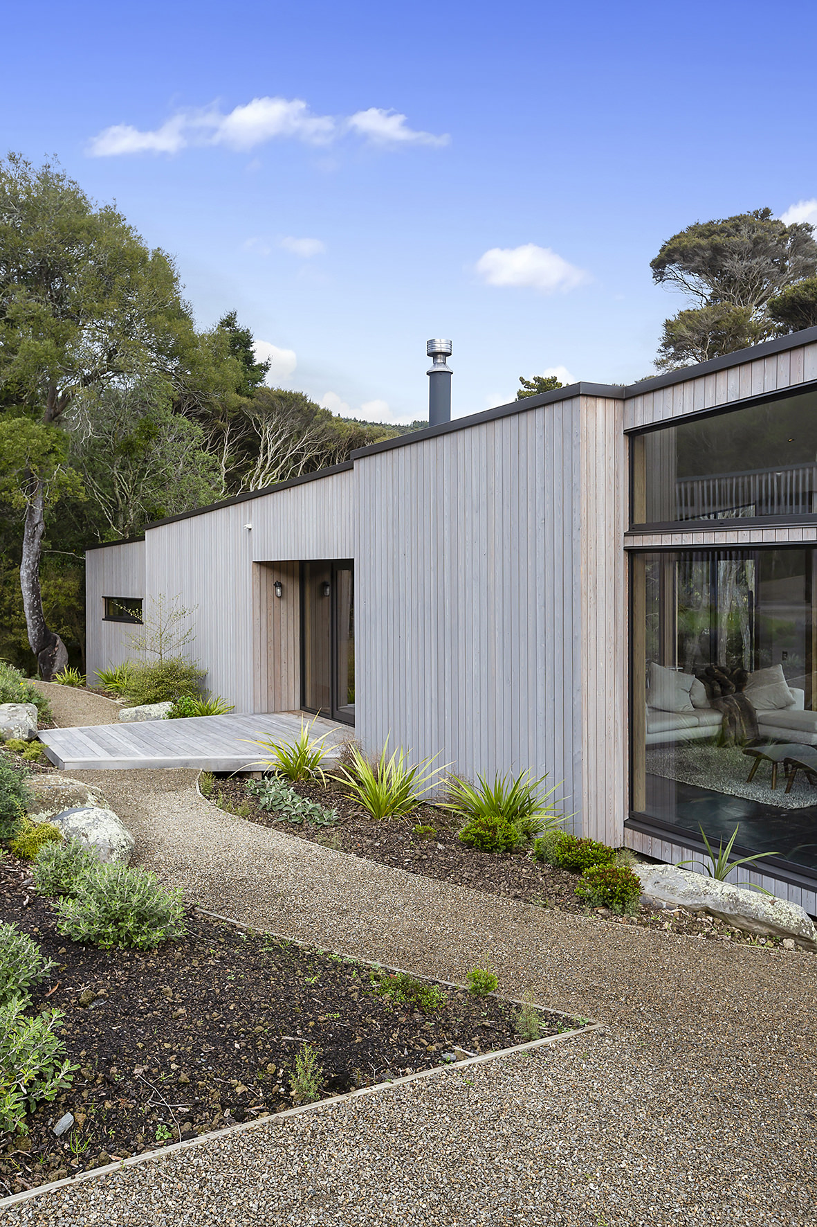 An artful escape away from the city, this home in a seaside settlement north of Dunedin is a natural wonder. The design responds beautifully to the land and its trees. One branch bows poetically to meet the deck. The home’s exterior timber cladding is a fitting response.