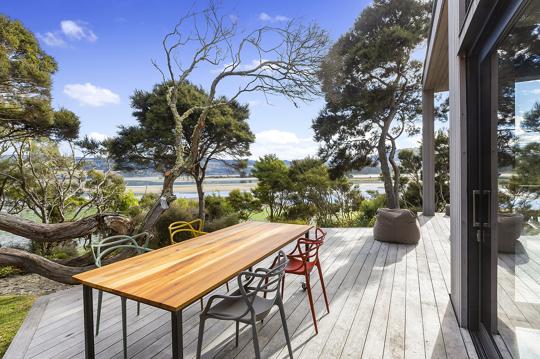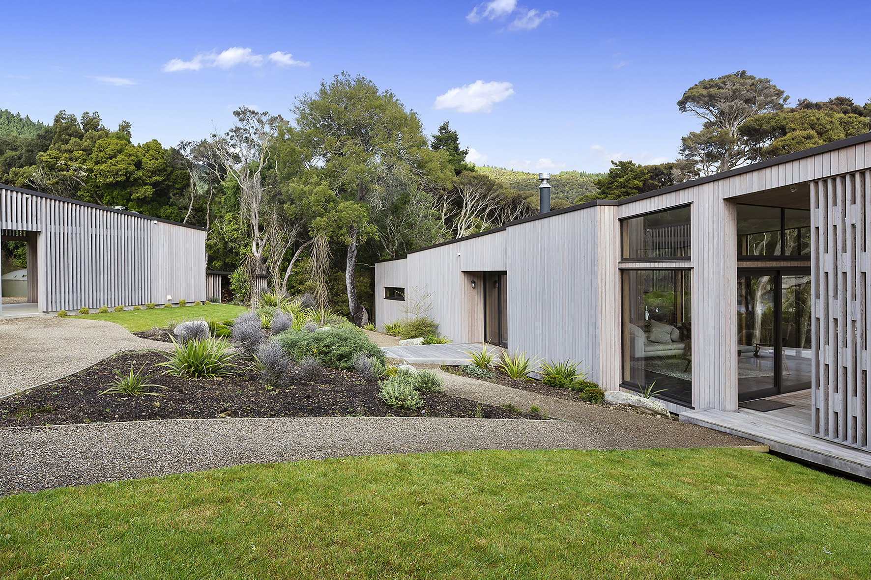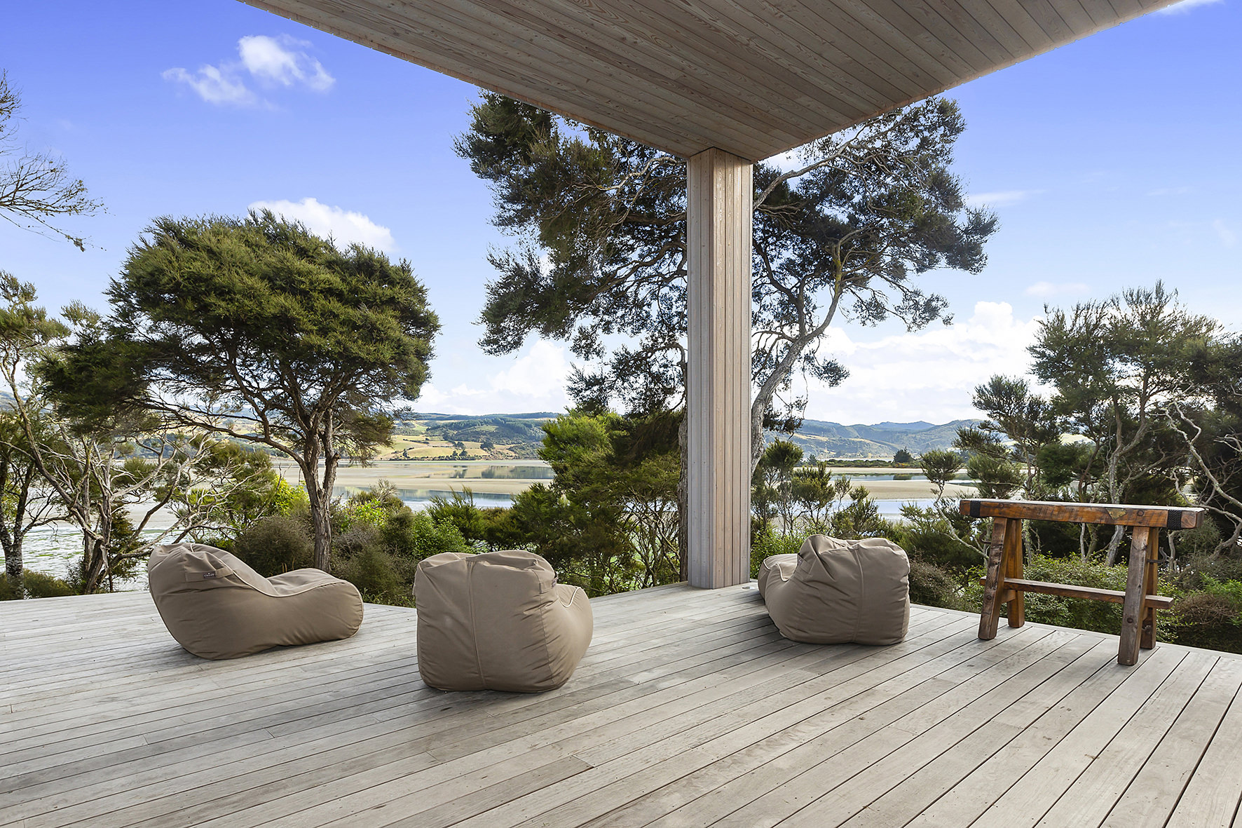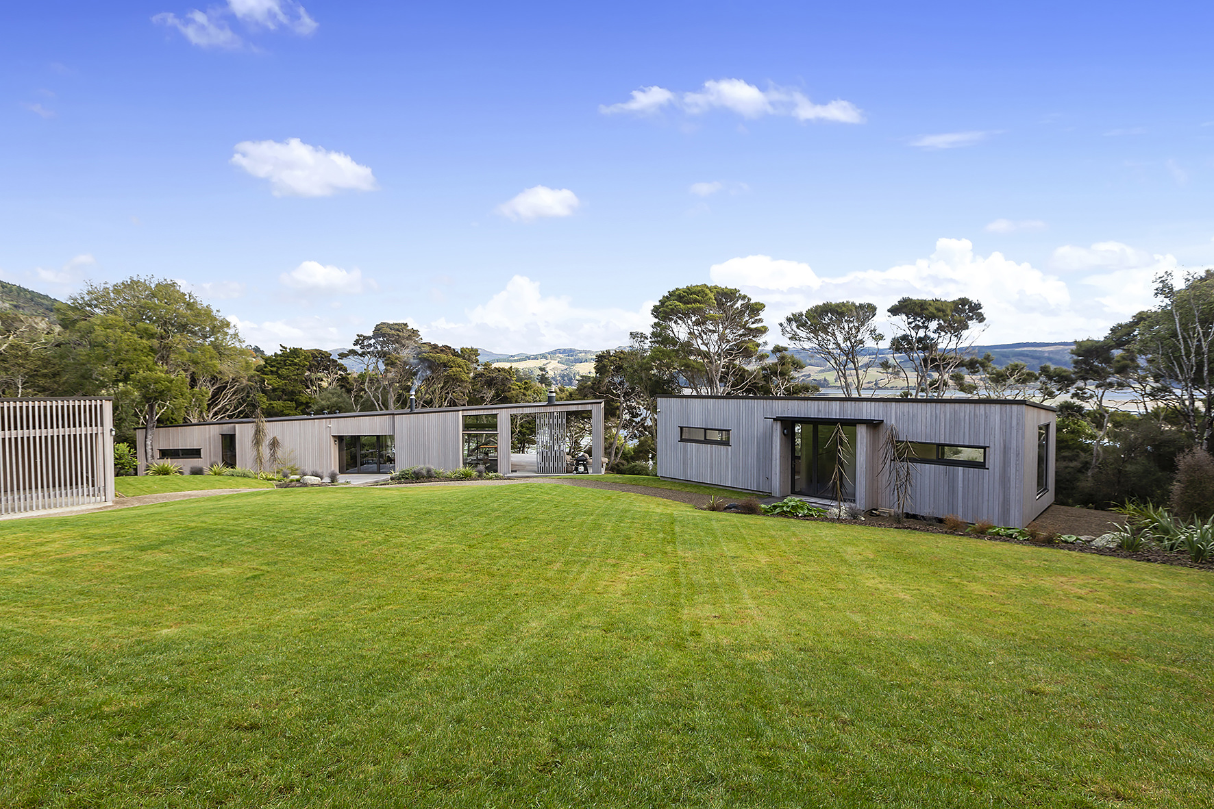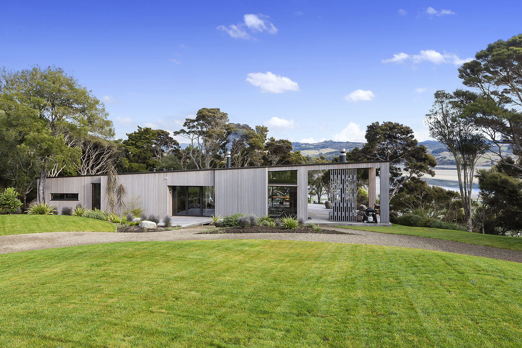 An artful escape away from the city, this home in a seaside settlement north of Dunedin is a natural wonder. The design responds beautifully to the land and its trees. One branch bows poetically to meet the deck. The home’s exterior timber cladding is a fitting response.