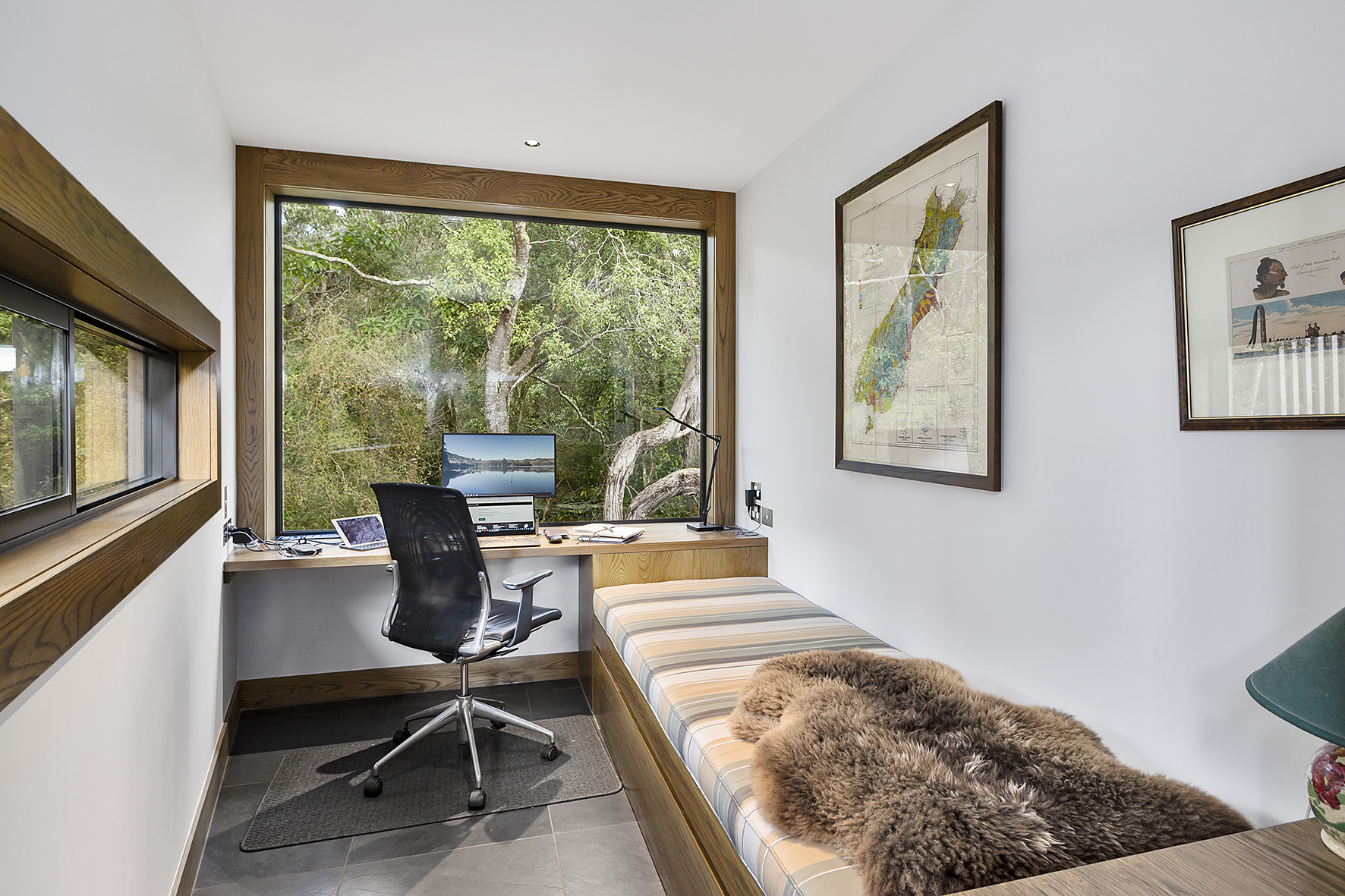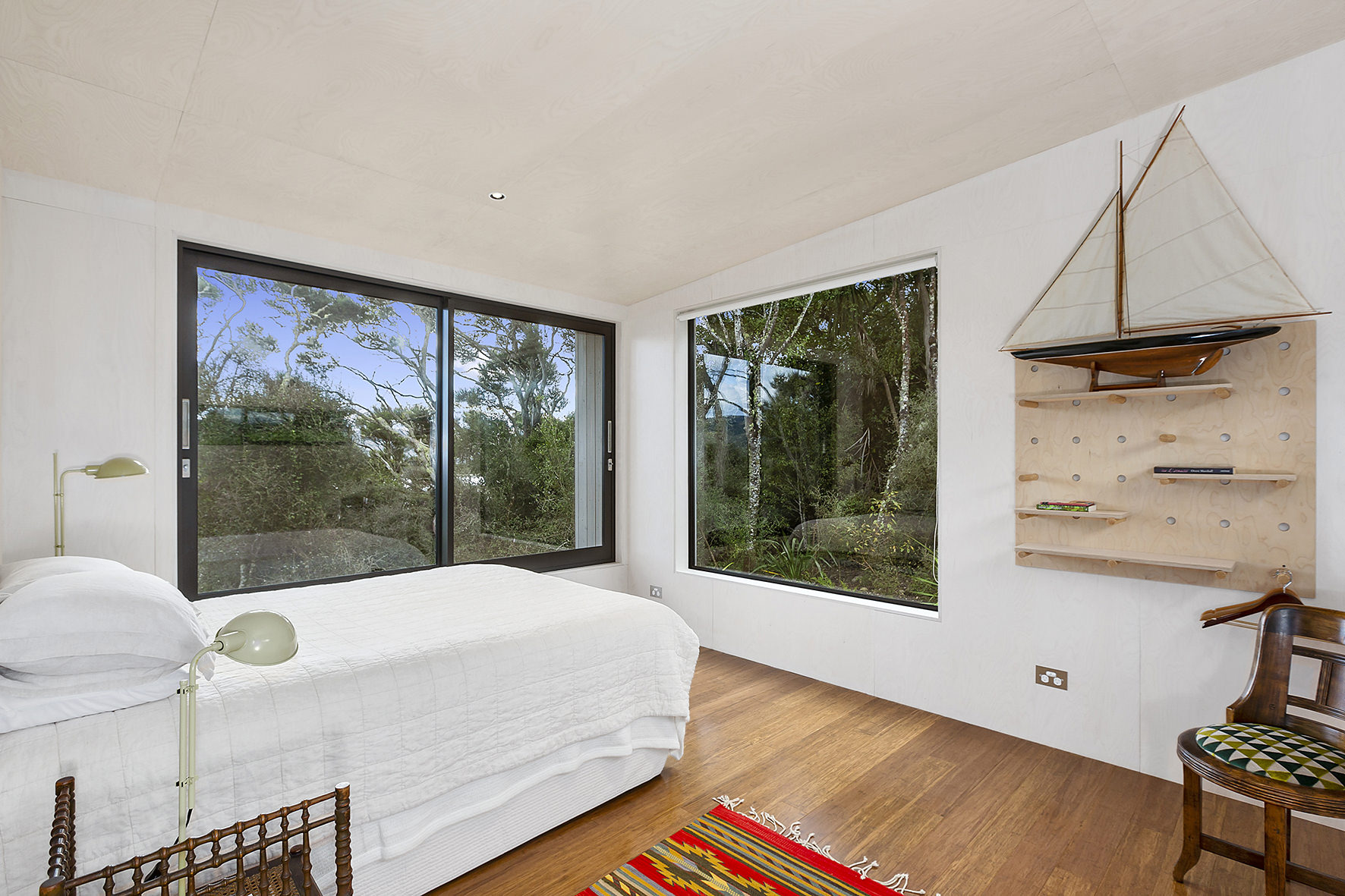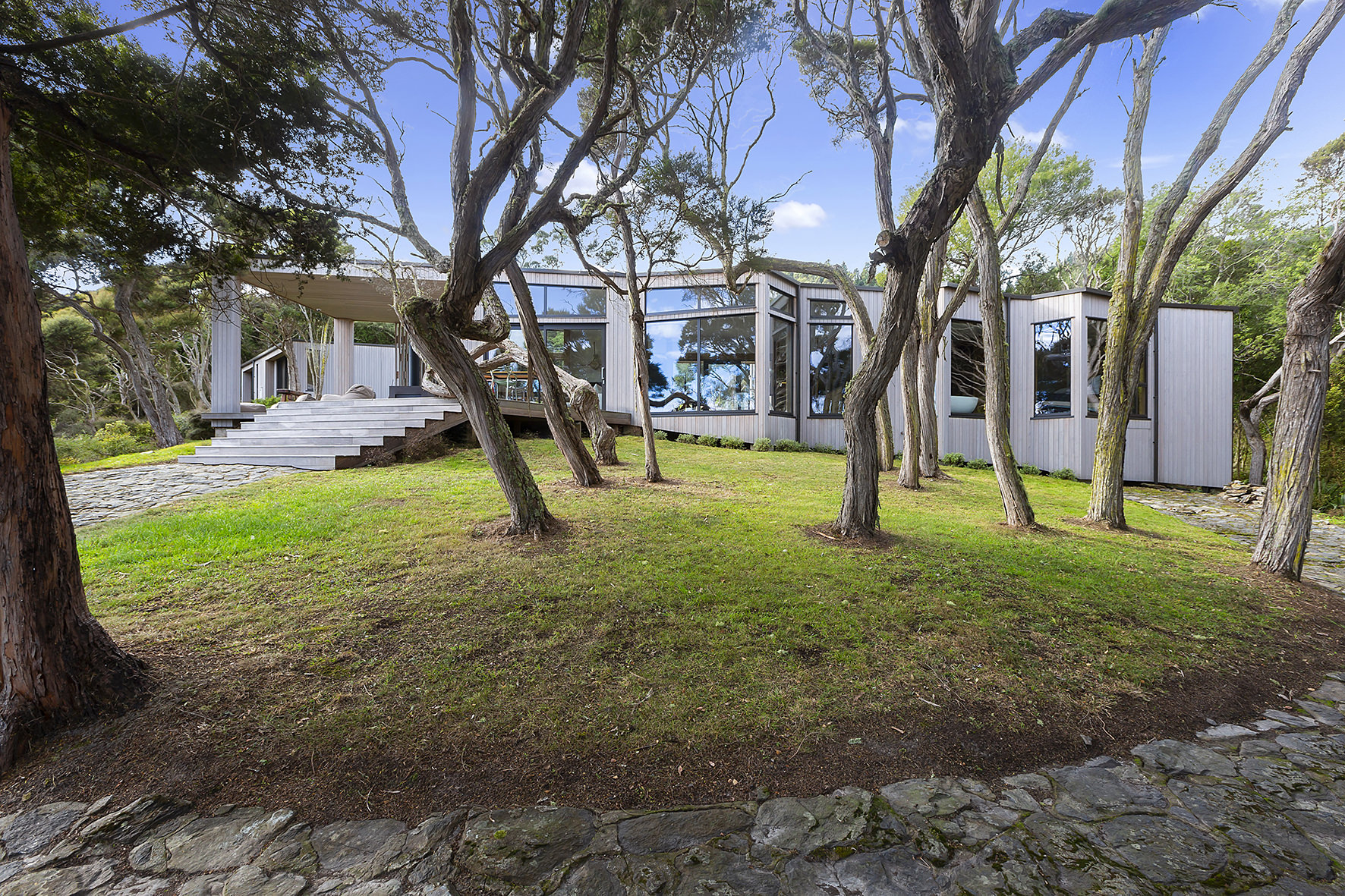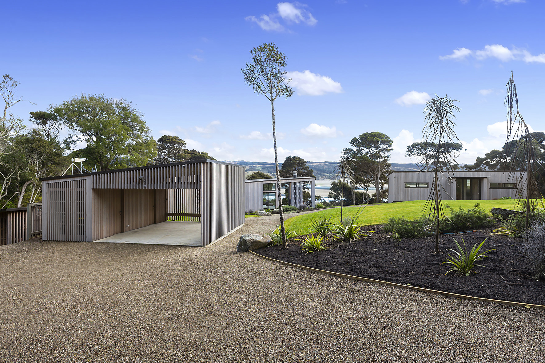 An artful escape away from the city, this home in a seaside settlement north of Dunedin is a natural wonder. The design responds beautifully to the land and its trees. One branch bows poetically to meet the deck. The home’s exterior timber cladding is a fitting response.