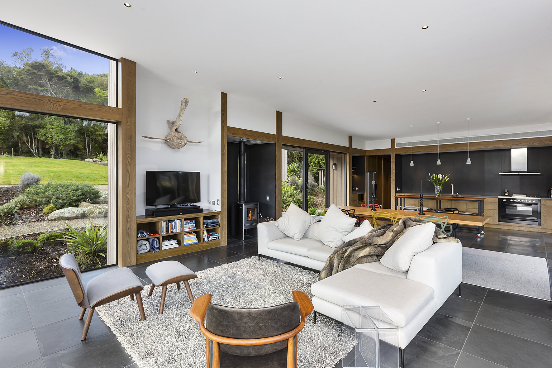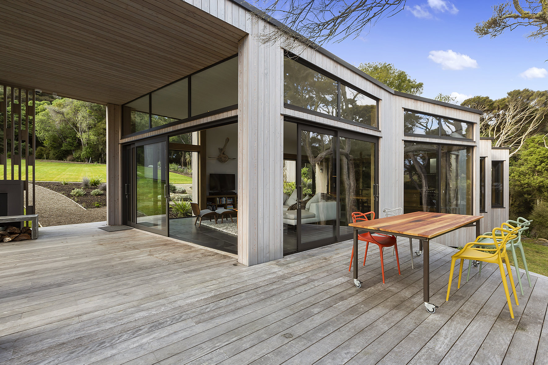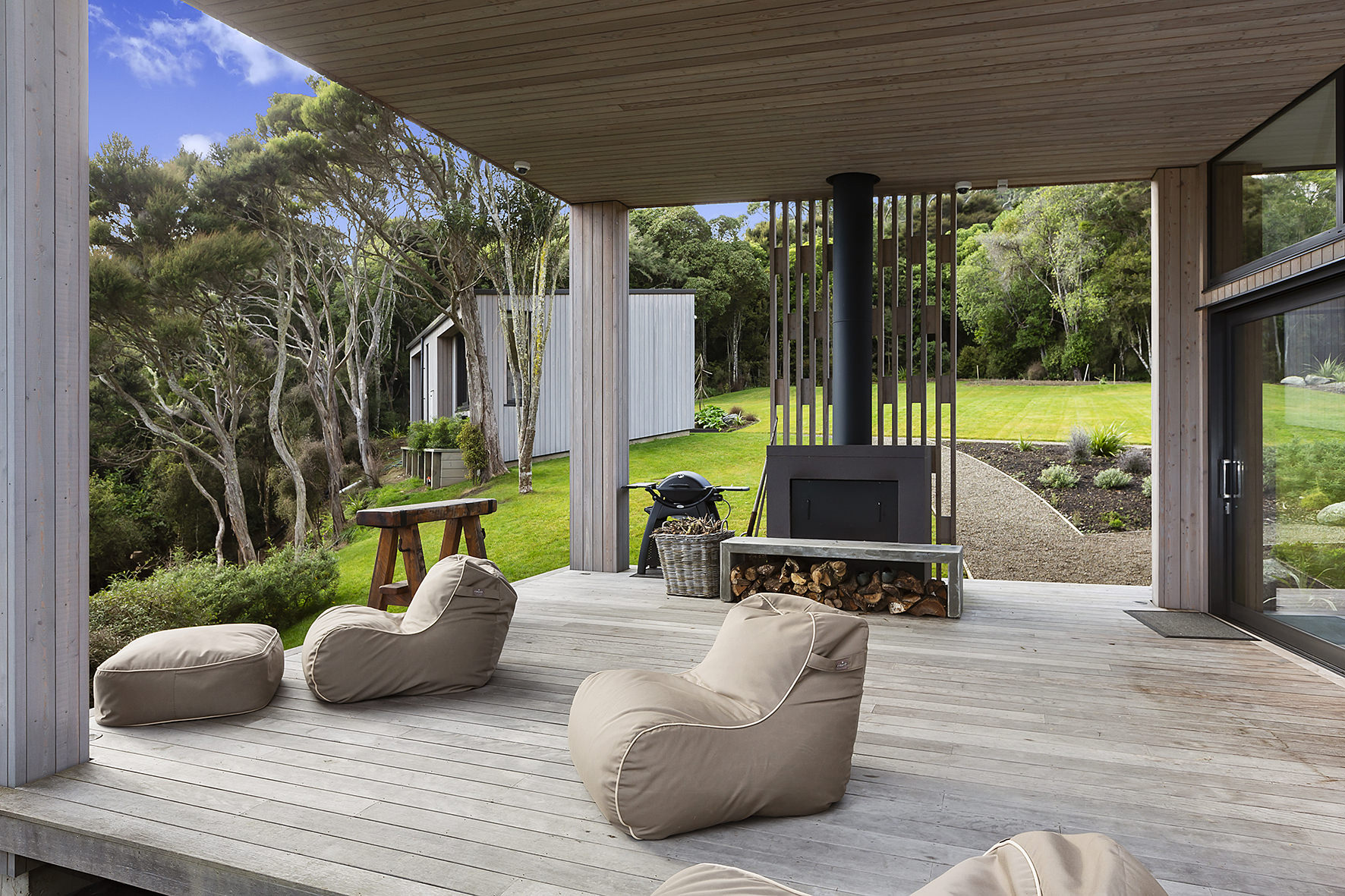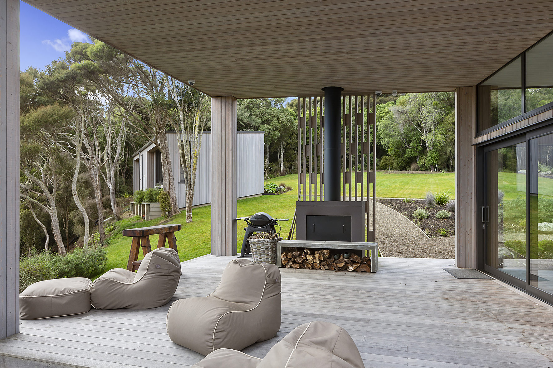 An expansive deck wraps around the open-plan living space, fully immersed in nature. A freestanding wood burner set before a beautiful precast concrete screen ensures the outdoor domain can be enjoyed late into the night. The deck’s timber ceiling is in keeping with the exterior cladding.