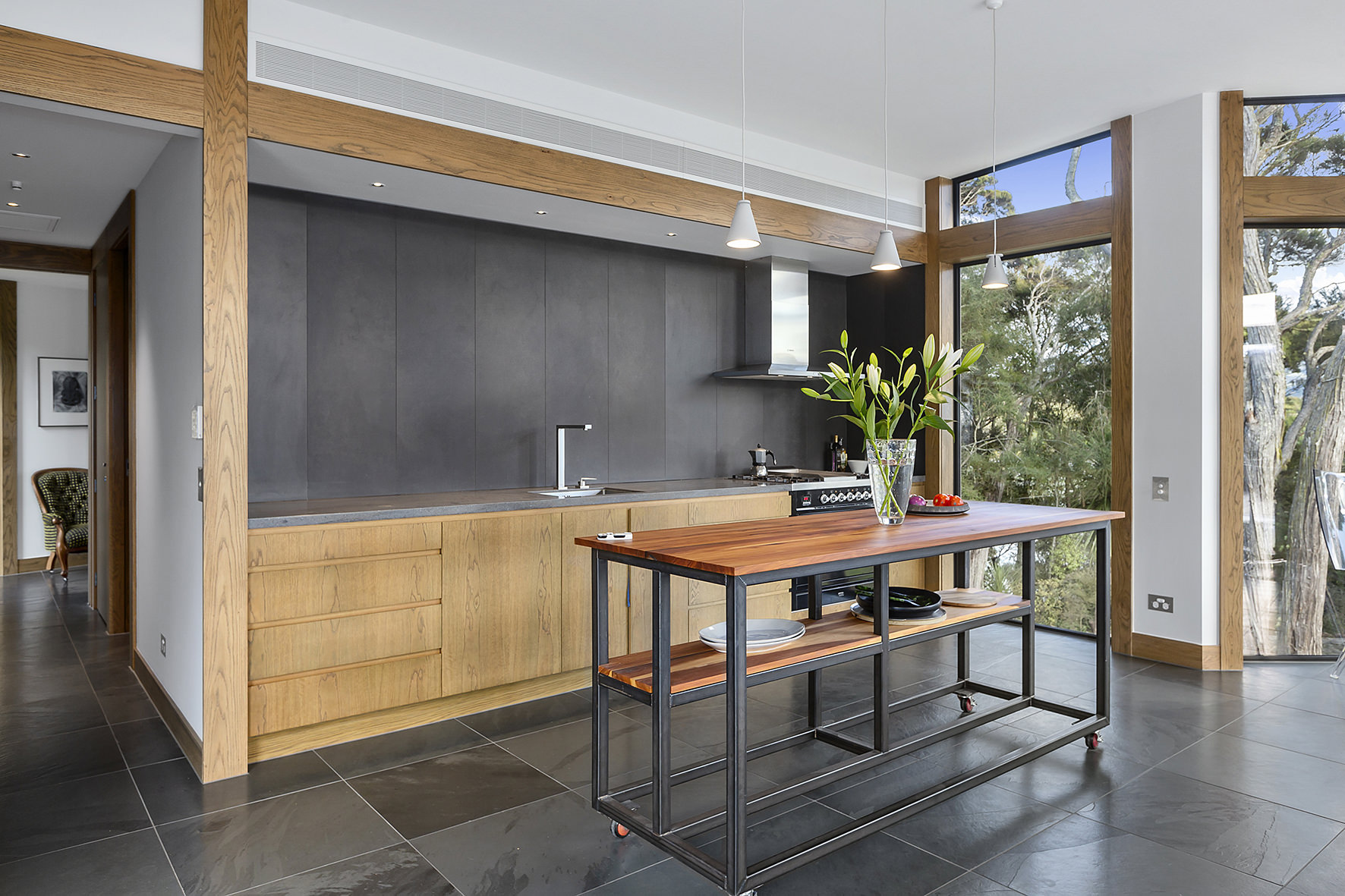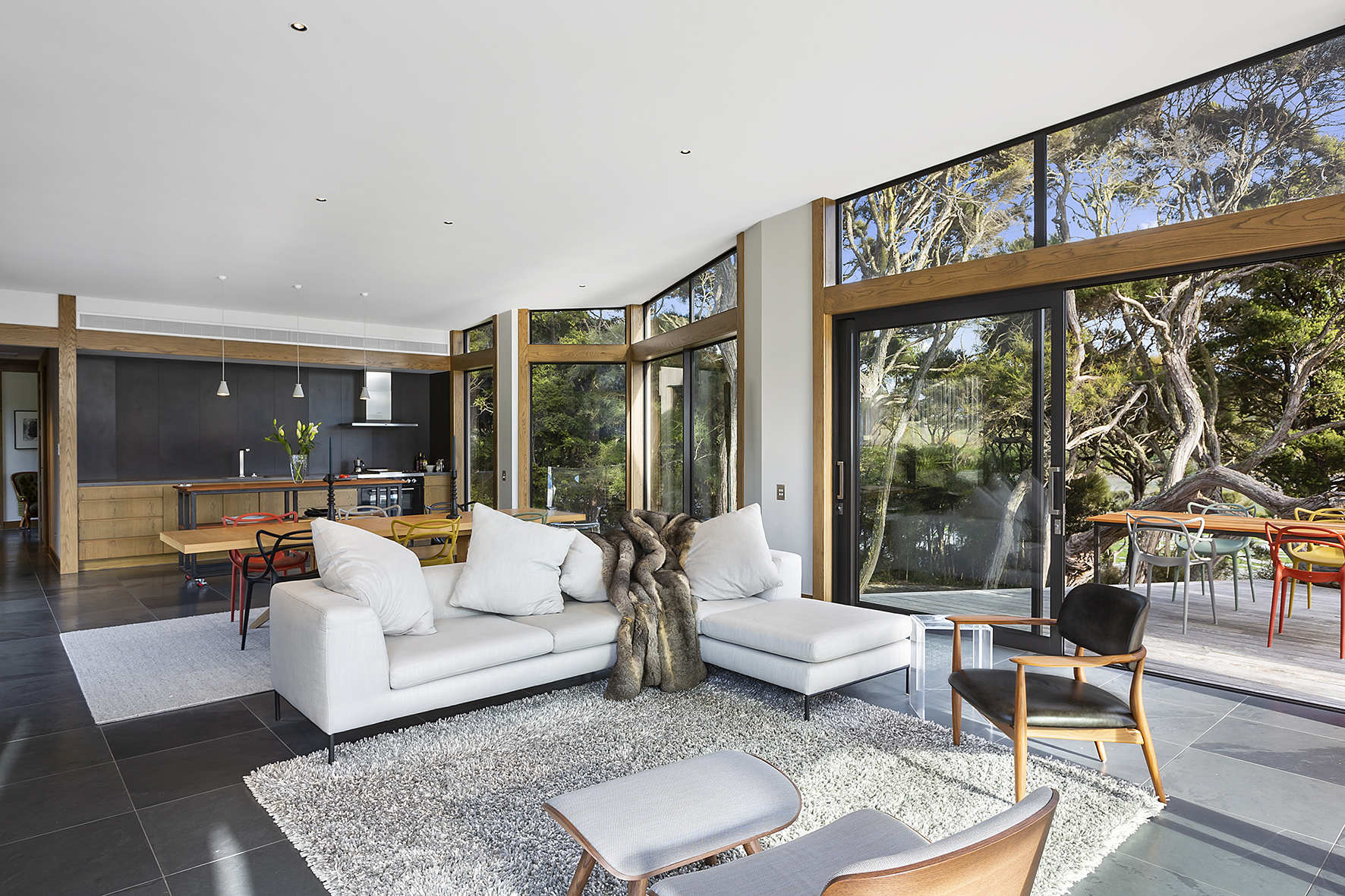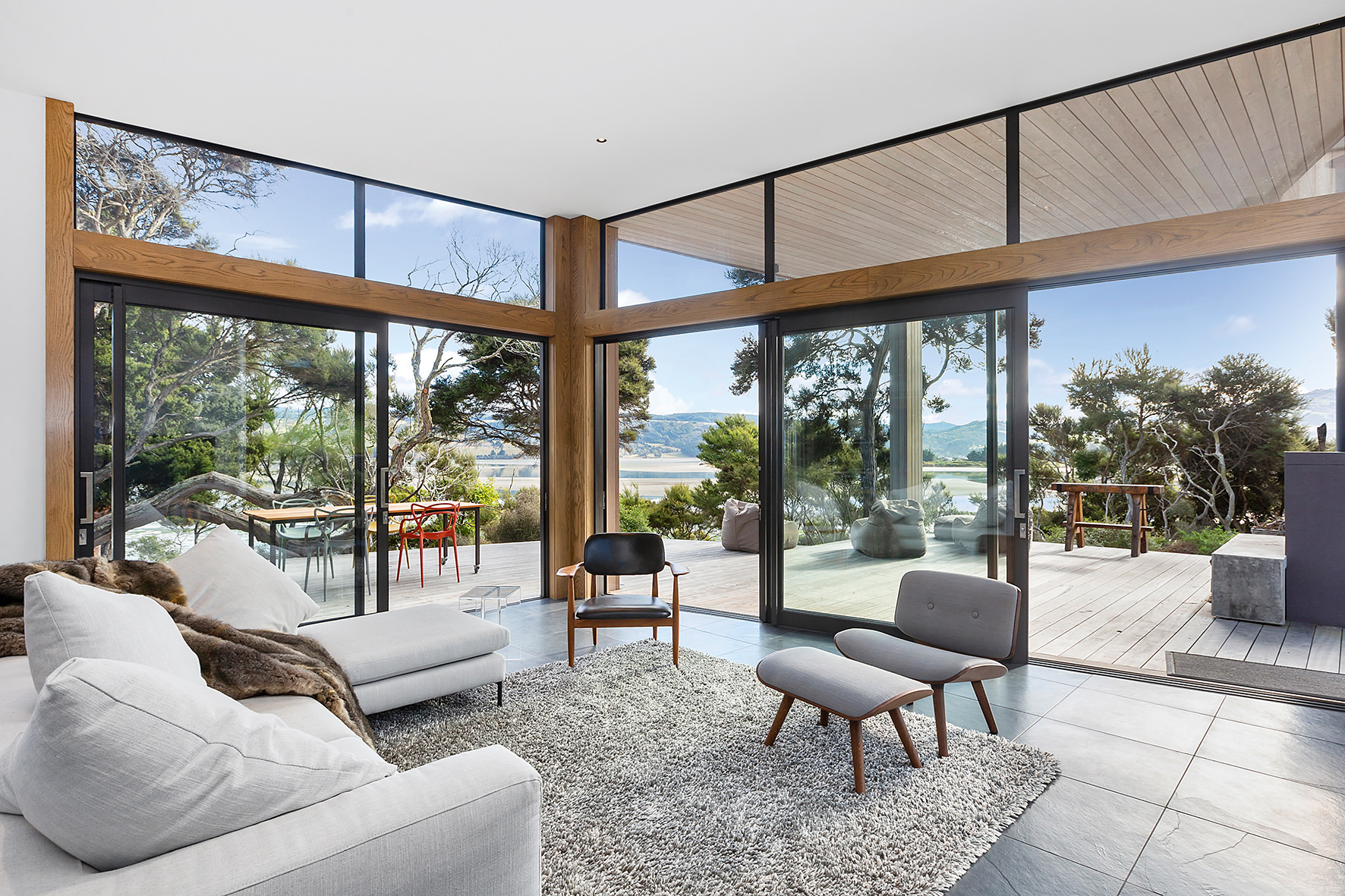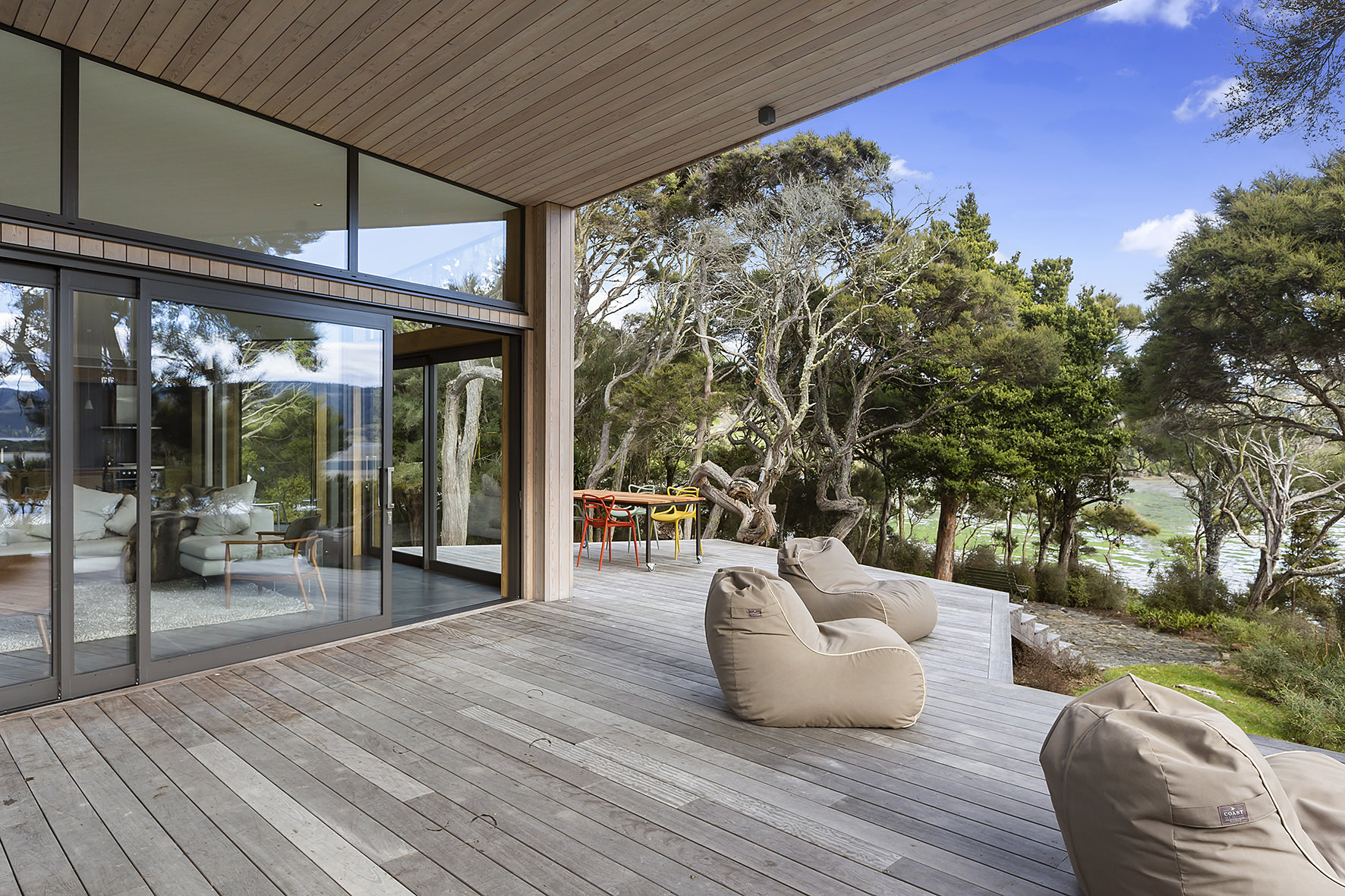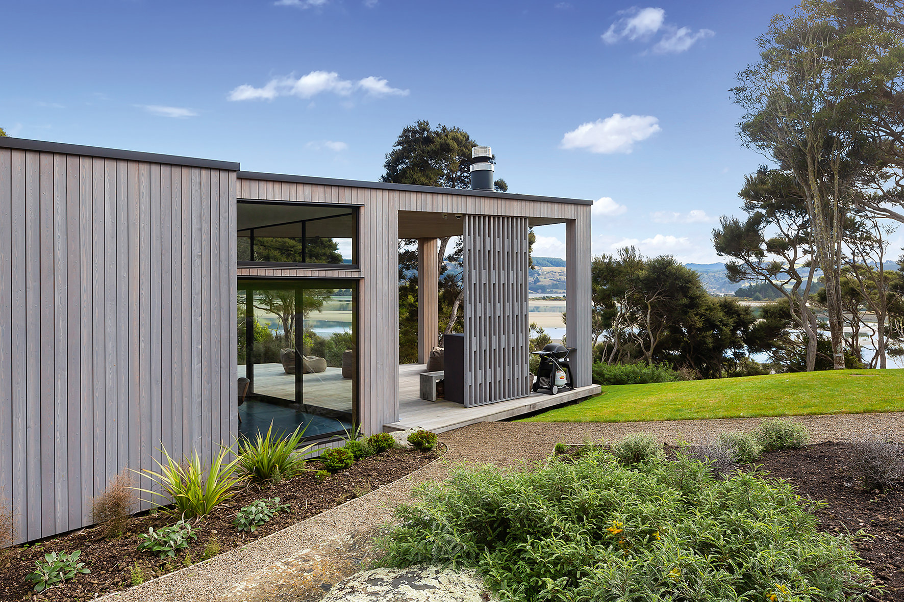 An expansive deck wraps around the open-plan living space, fully immersed in nature. A freestanding wood burner set before a beautiful precast concrete screen ensures the outdoor domain can be enjoyed late into the night. The deck’s timber ceiling is in keeping with the exterior cladding.