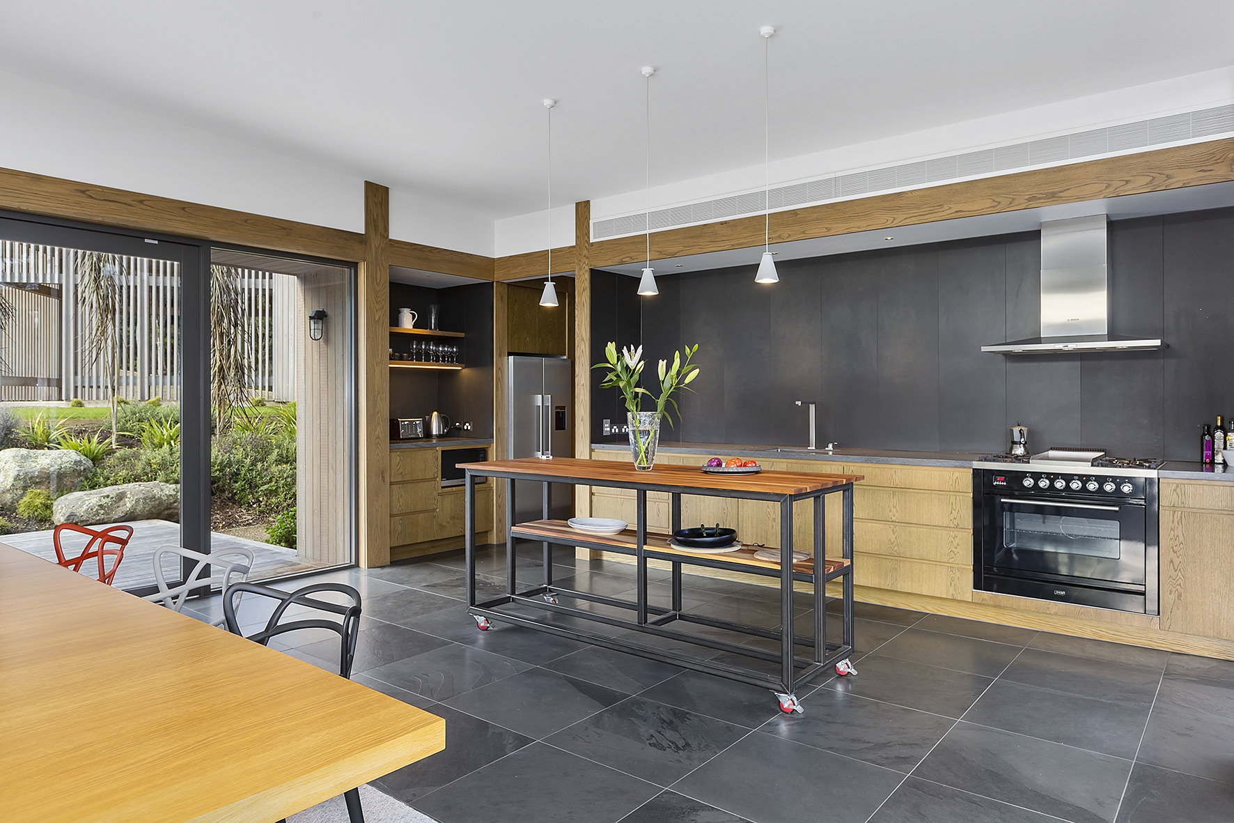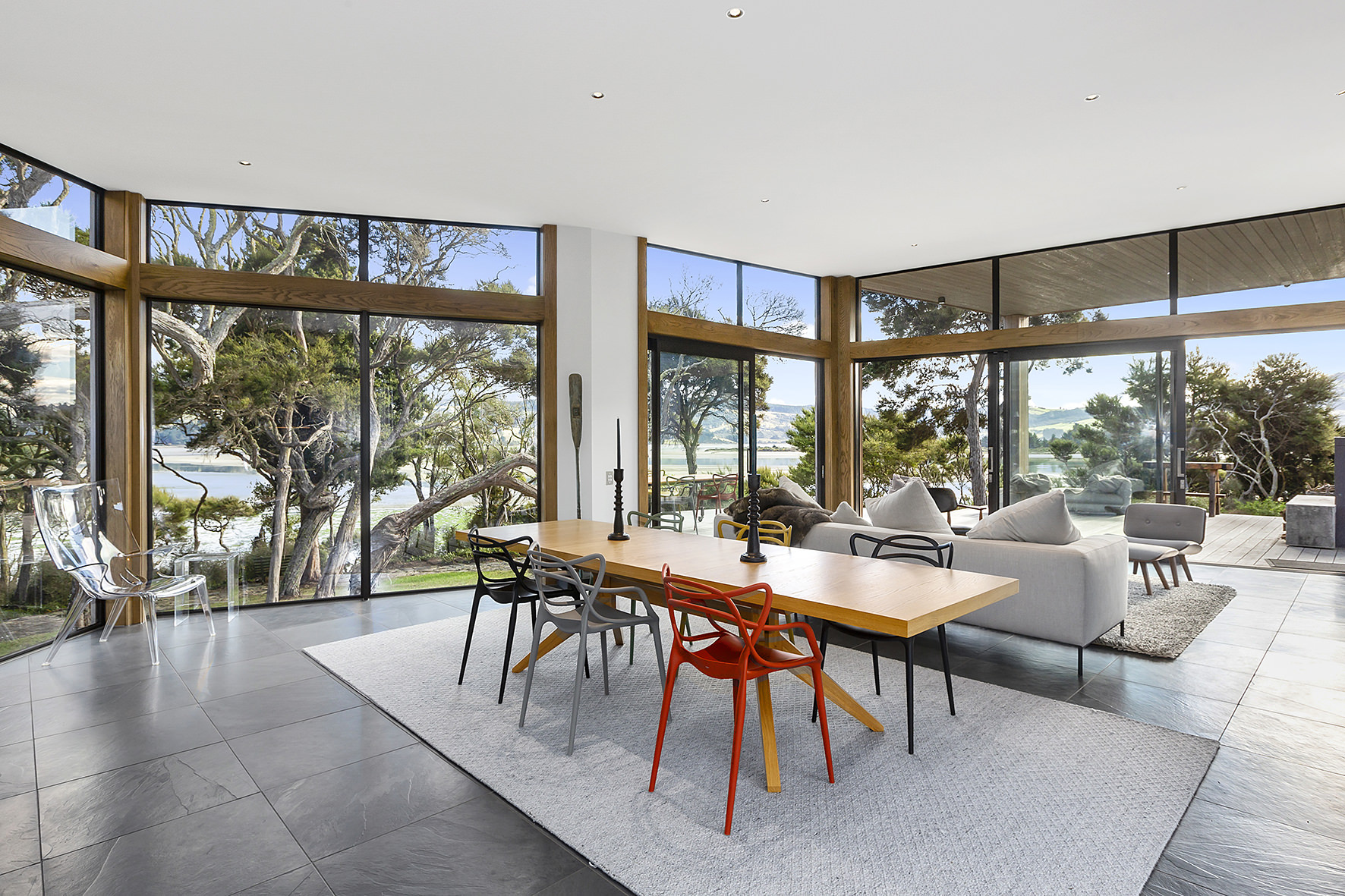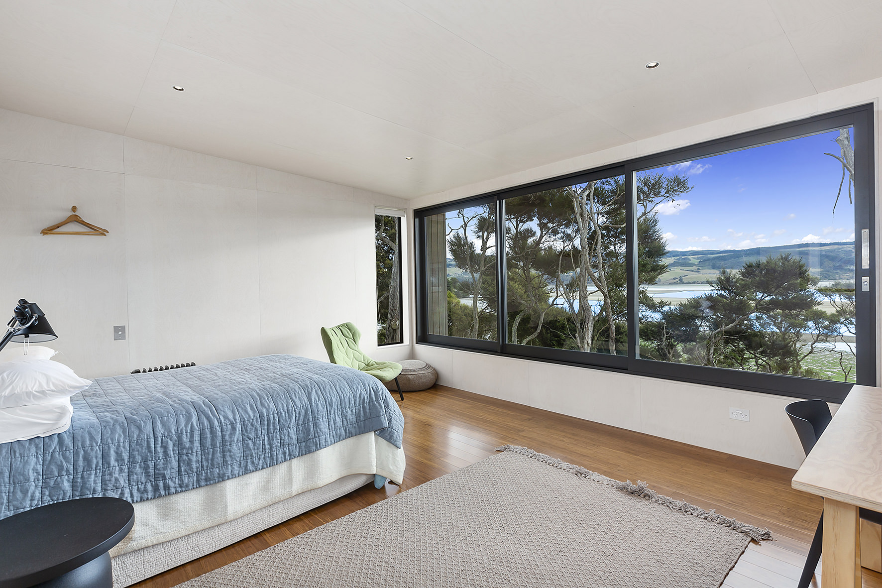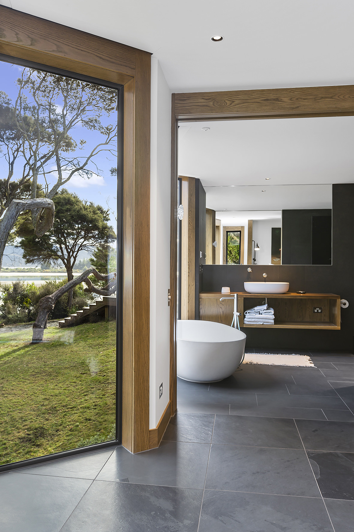 An expansive deck wraps around the open-plan living space, fully immersed in nature. A freestanding wood burner set before a beautiful precast concrete screen ensures the outdoor domain can be enjoyed late into the night. The deck’s timber ceiling is in keeping with the exterior cladding.