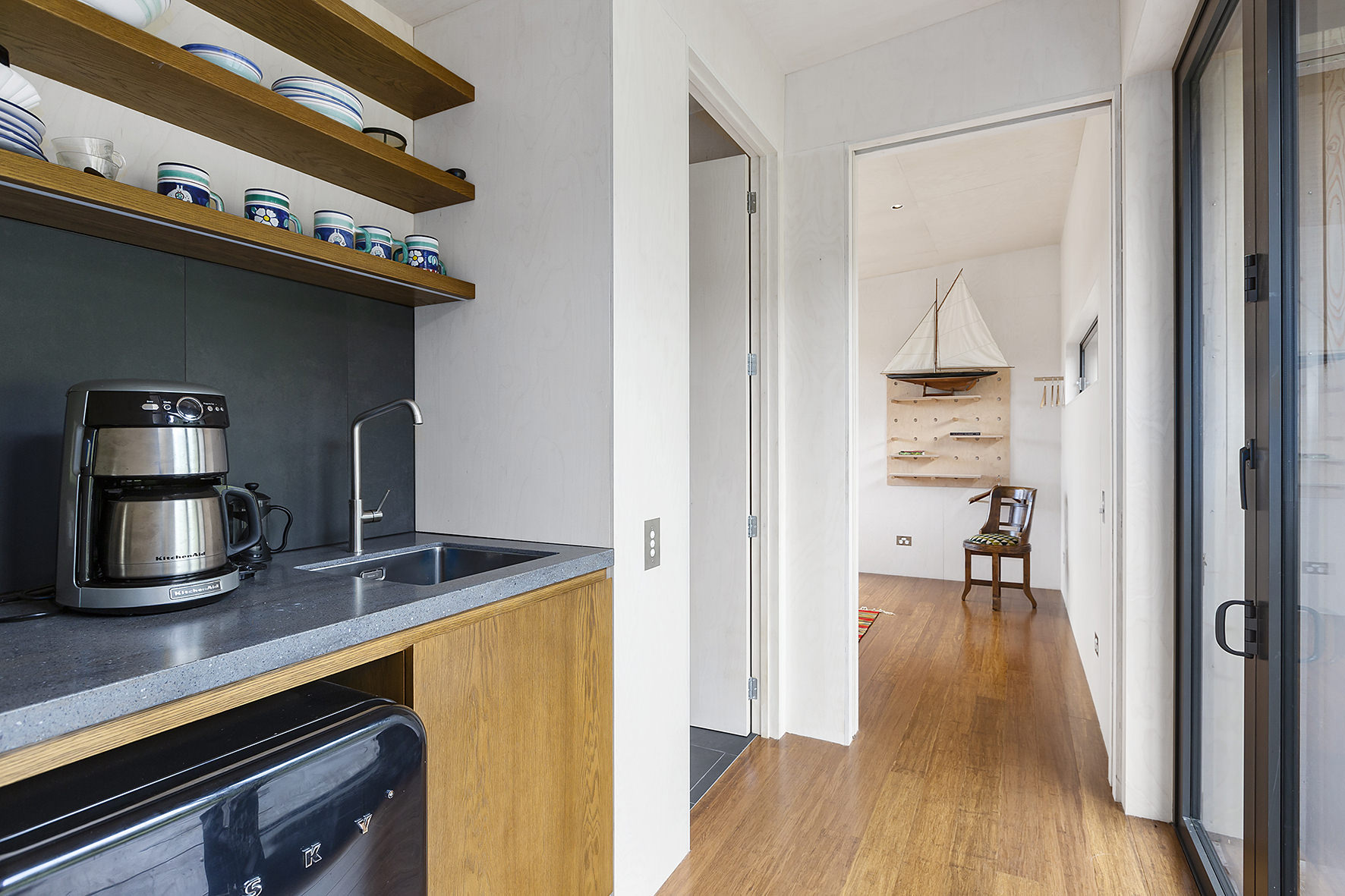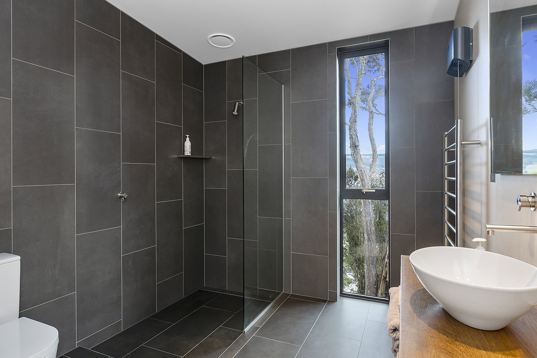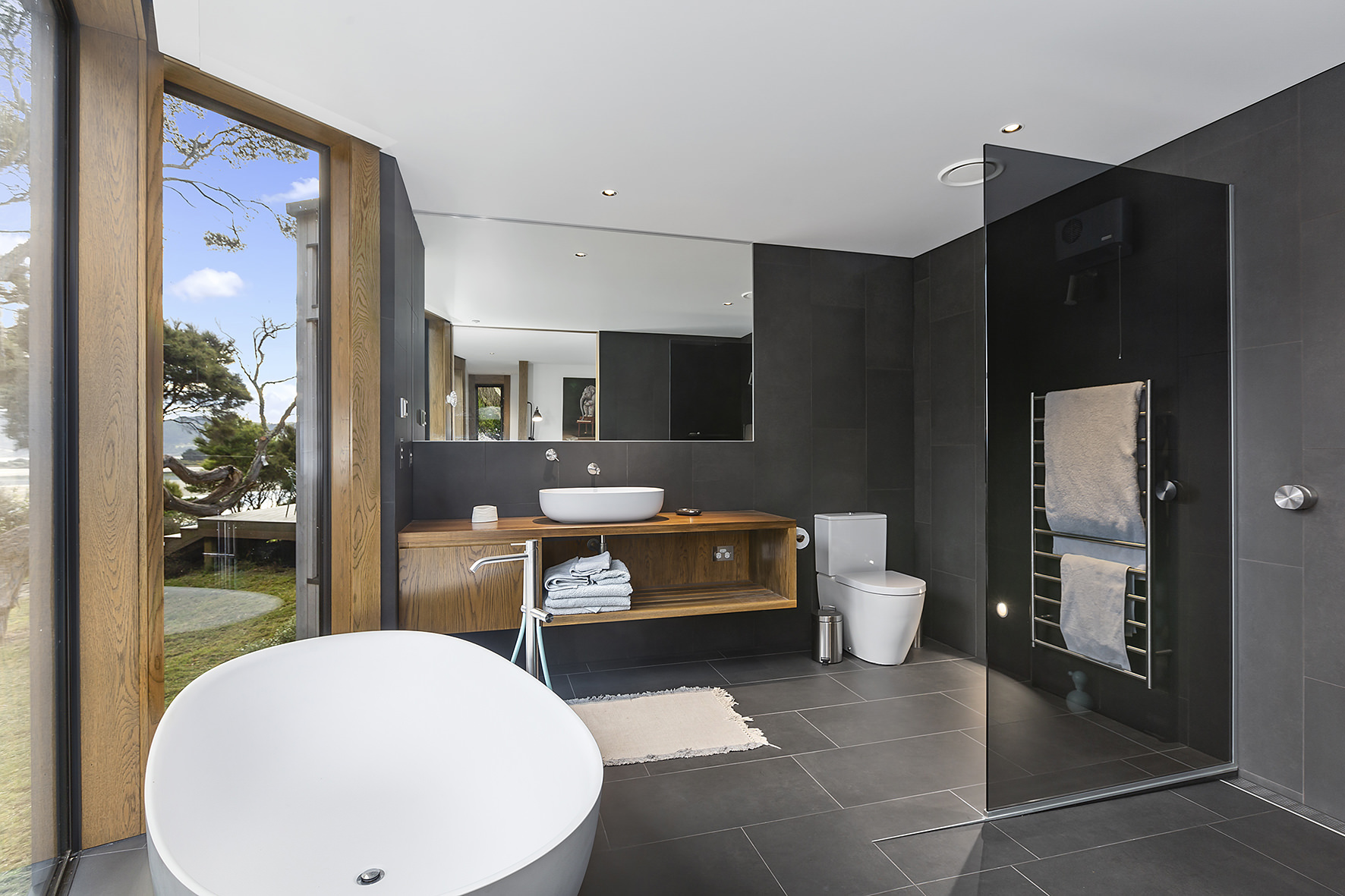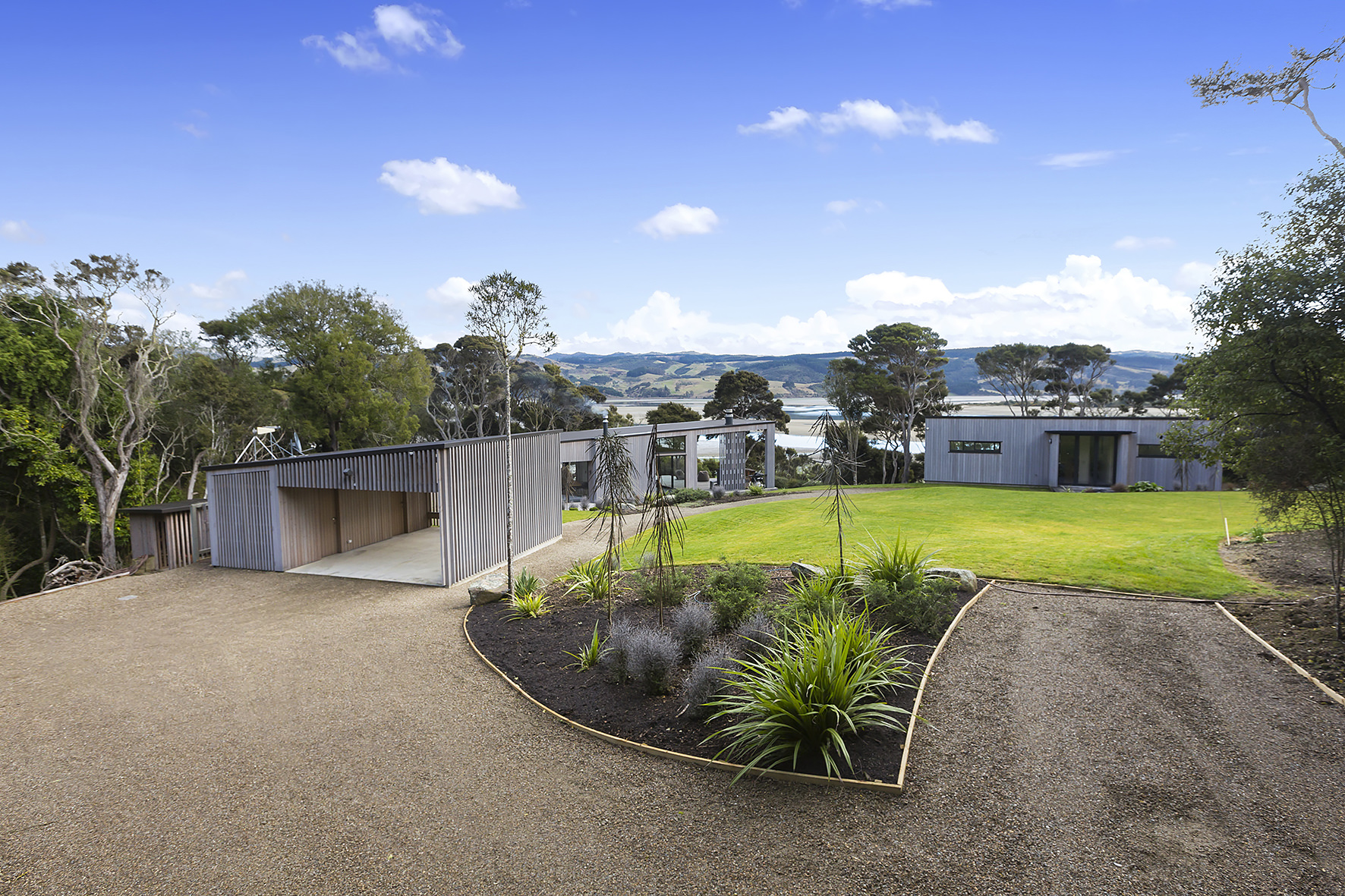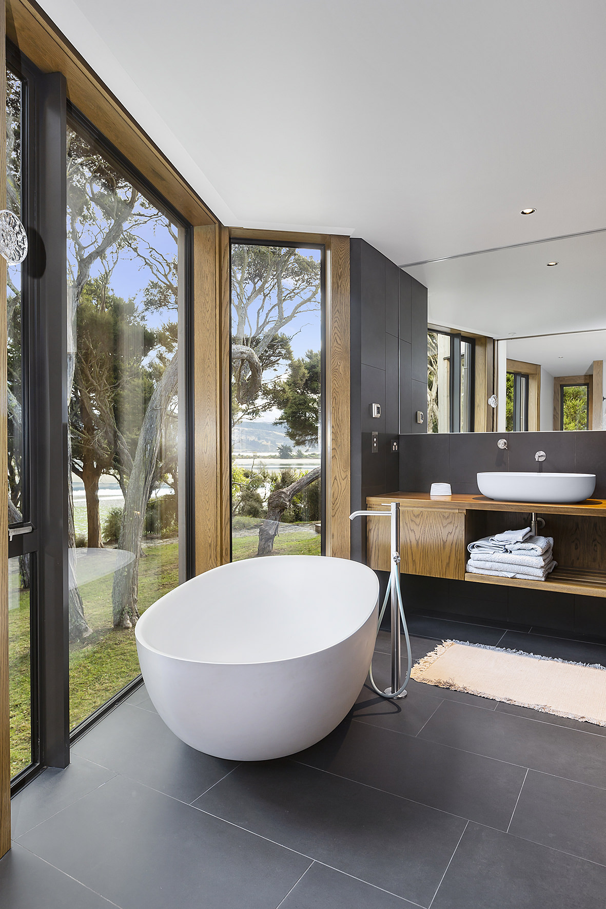 An expansive deck wraps around the open-plan living space, fully immersed in nature. A freestanding wood burner set before a beautiful precast concrete screen ensures the outdoor domain can be enjoyed late into the night. The deck’s timber ceiling is in keeping with the exterior cladding.