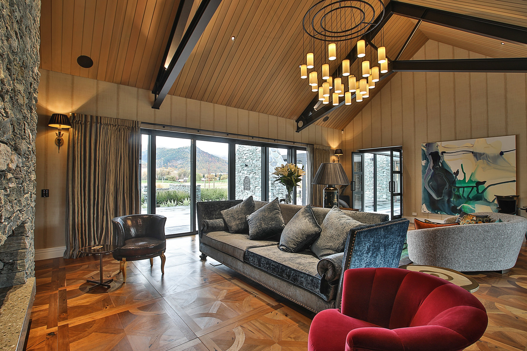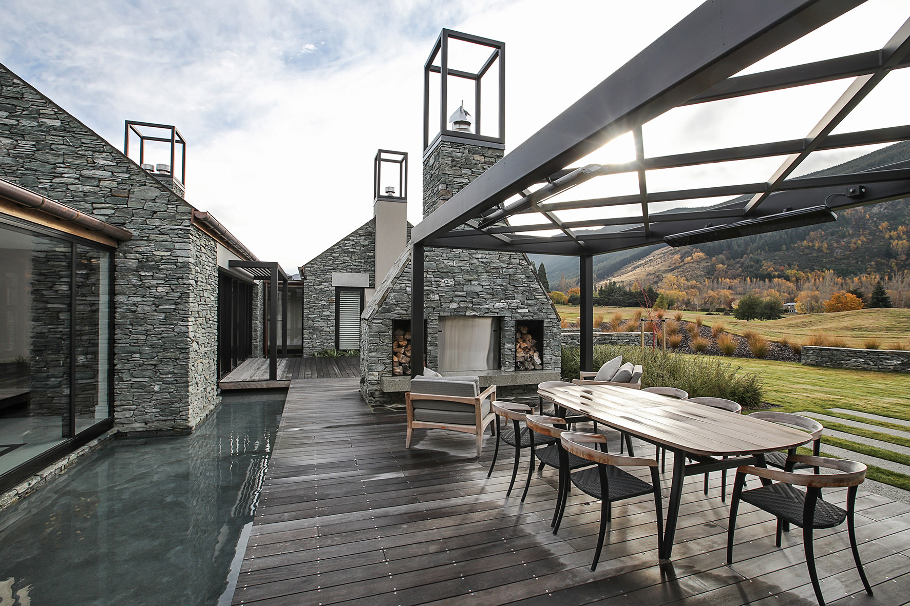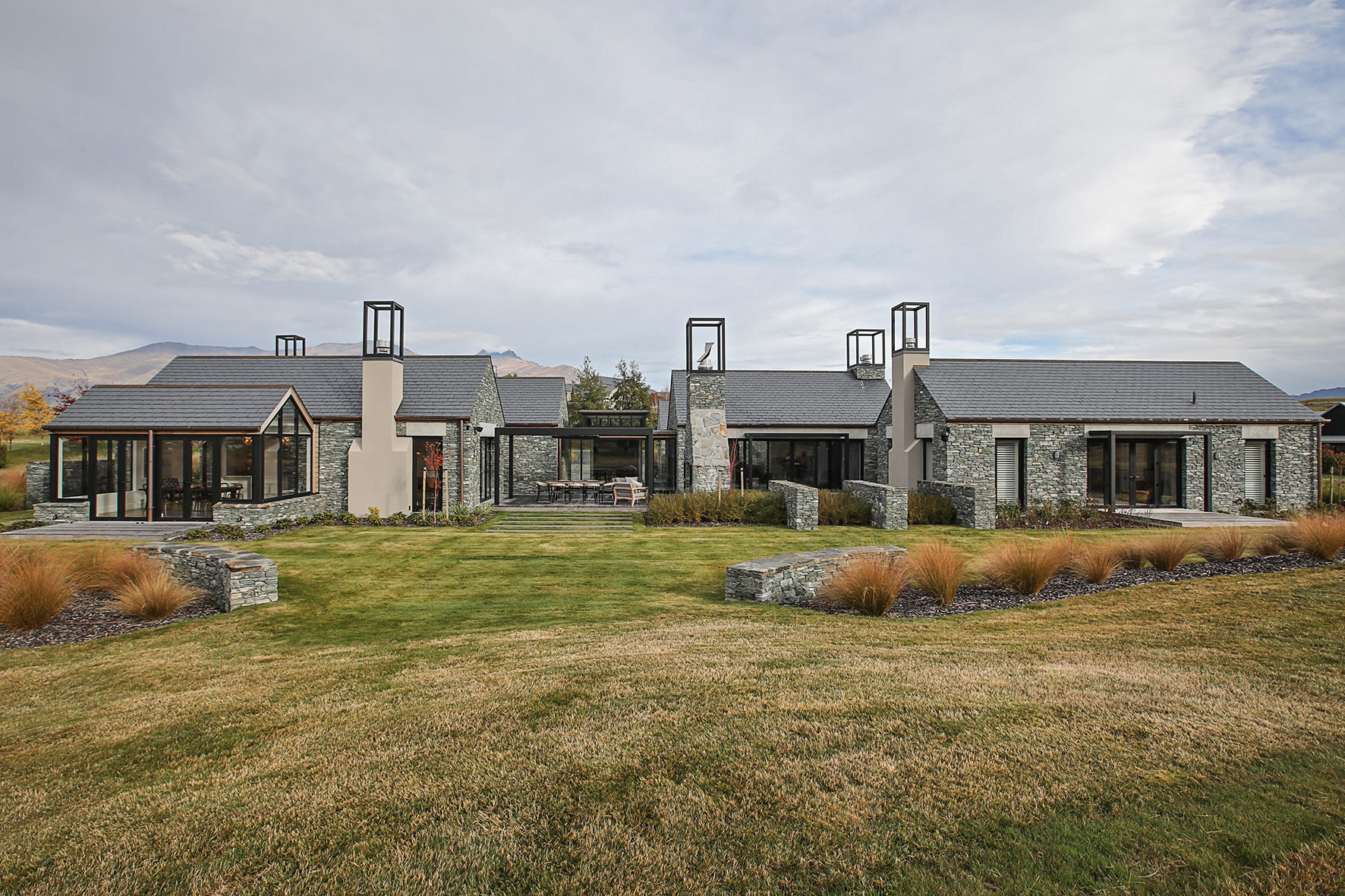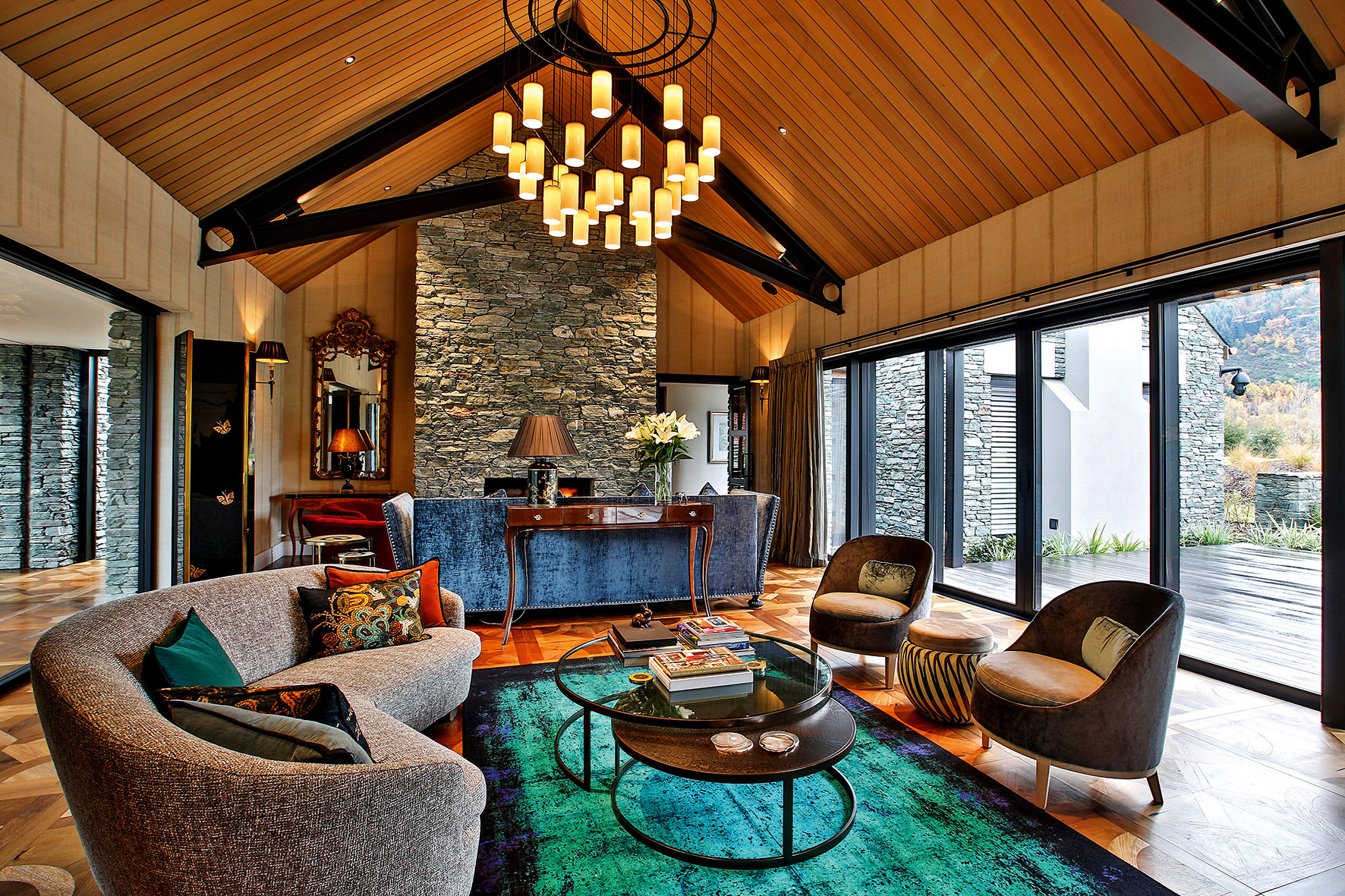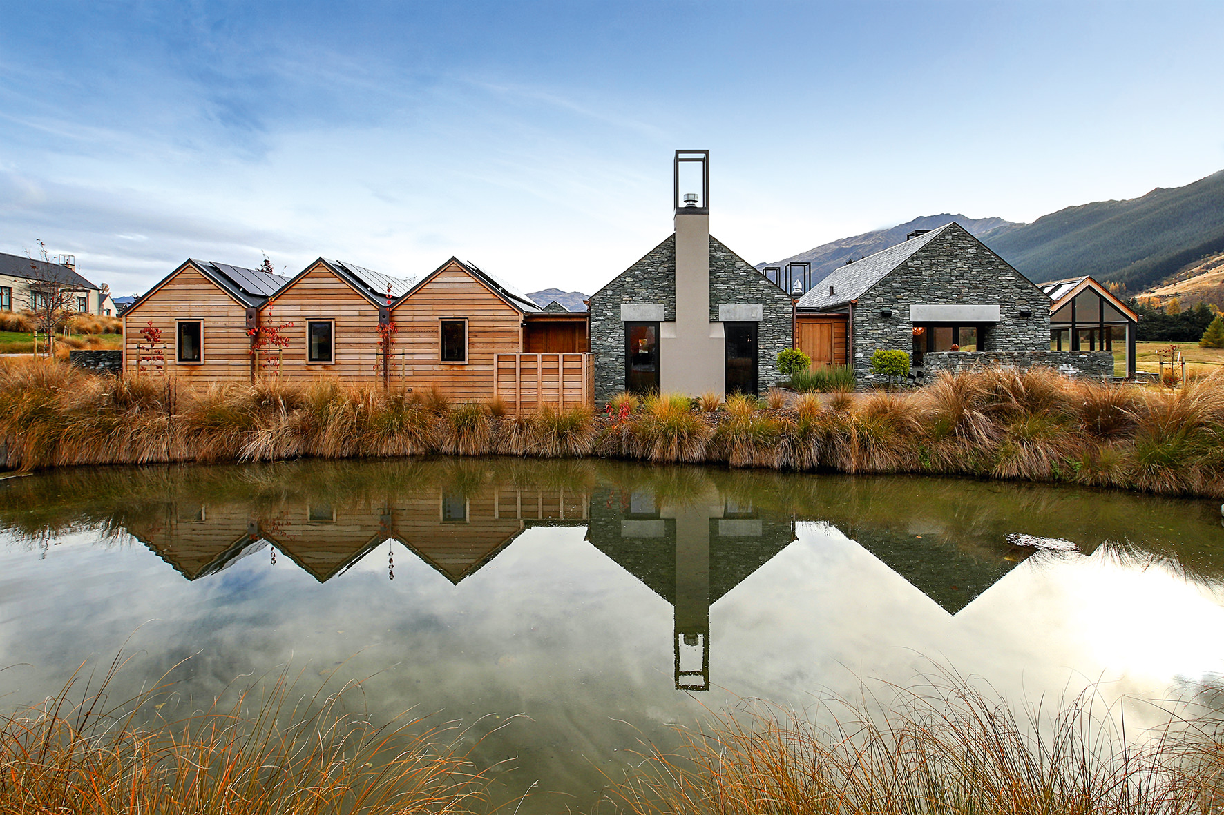 Luxuriating on the water’s edge, this home with a palatial 900sqm footprint melds into the natural environment. Zigzagging rooftops echo the surrounding mountain peaks. Pine and stack-stoned schist cladding exude raw appeal.