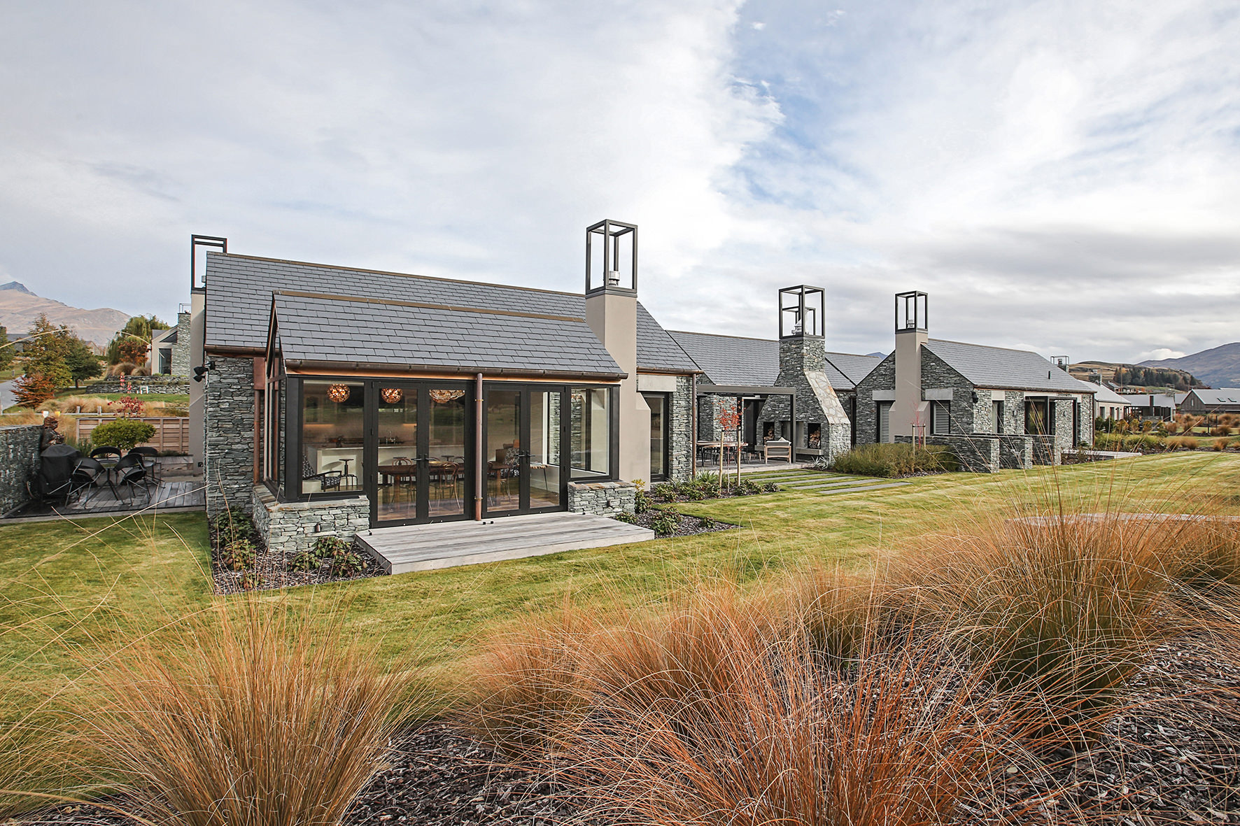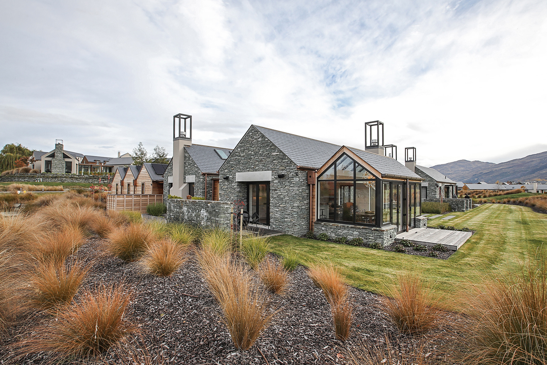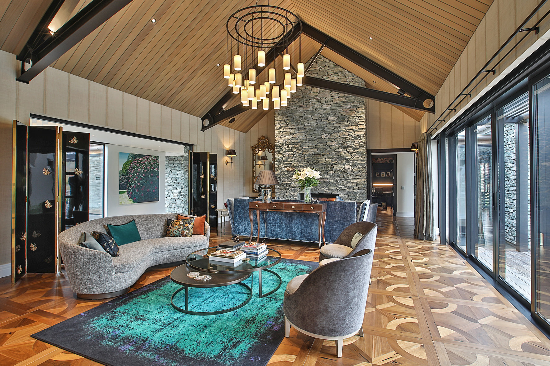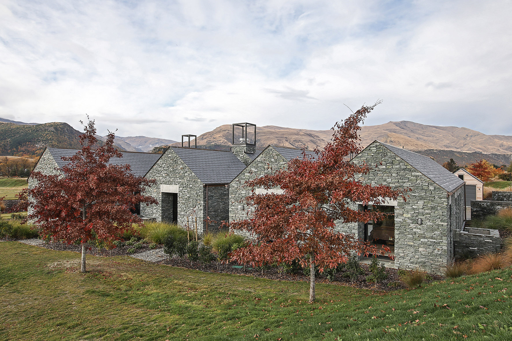 Luxuriating on the water’s edge, this home with a palatial 900sqm footprint melds into the natural environment. Zigzagging rooftops echo the surrounding mountain peaks. Pine and stack-stoned schist cladding exude raw appeal.