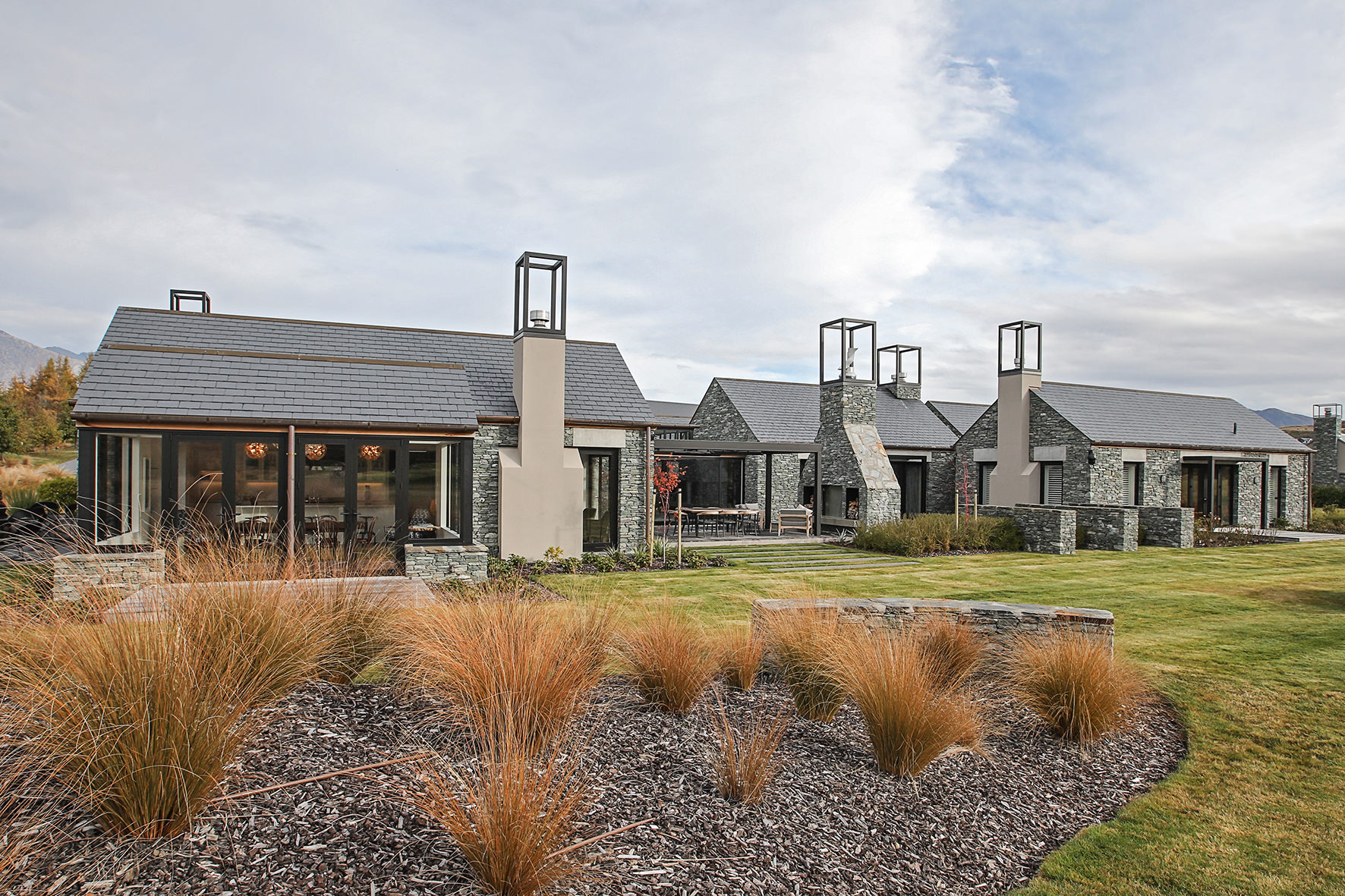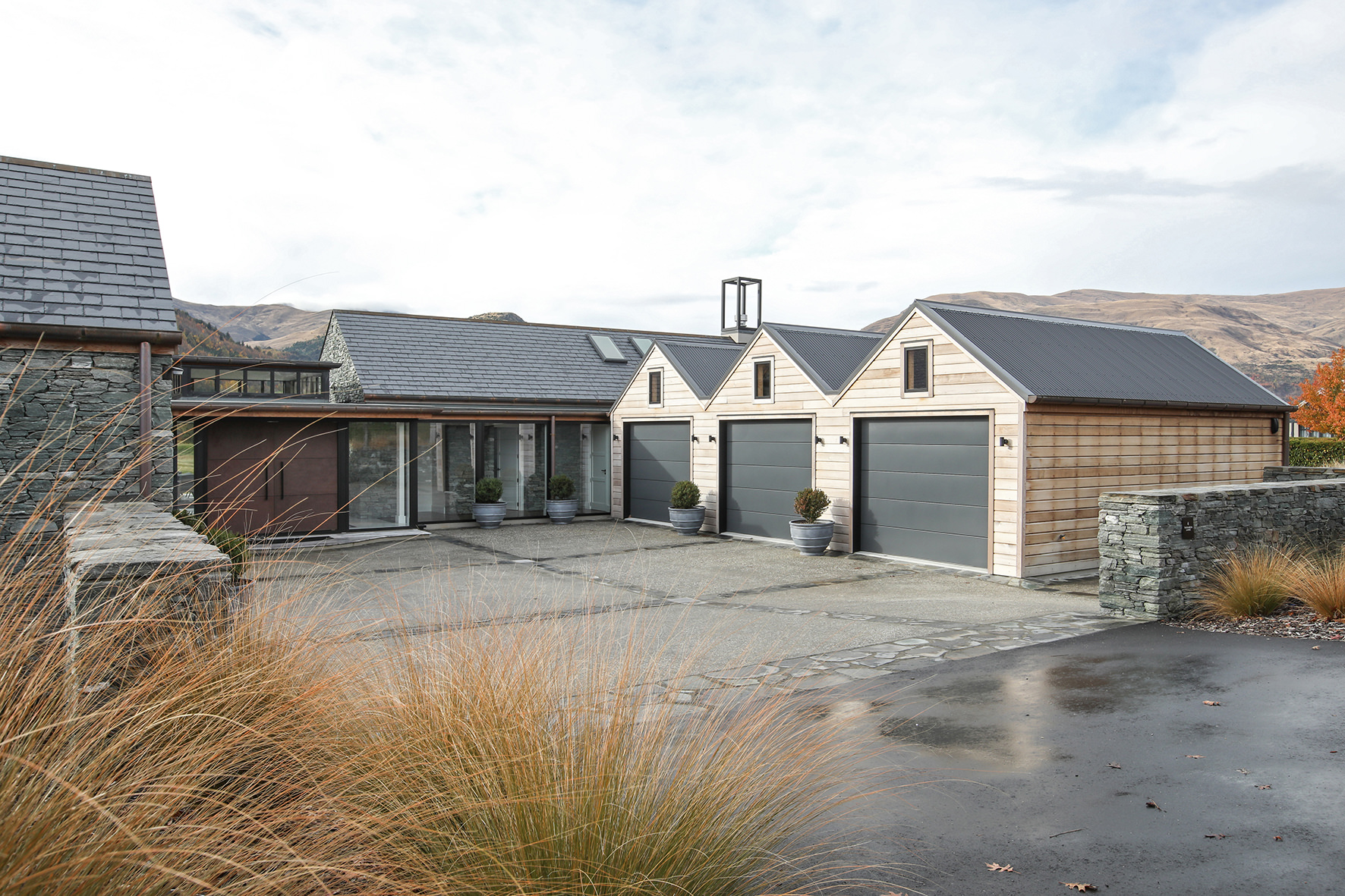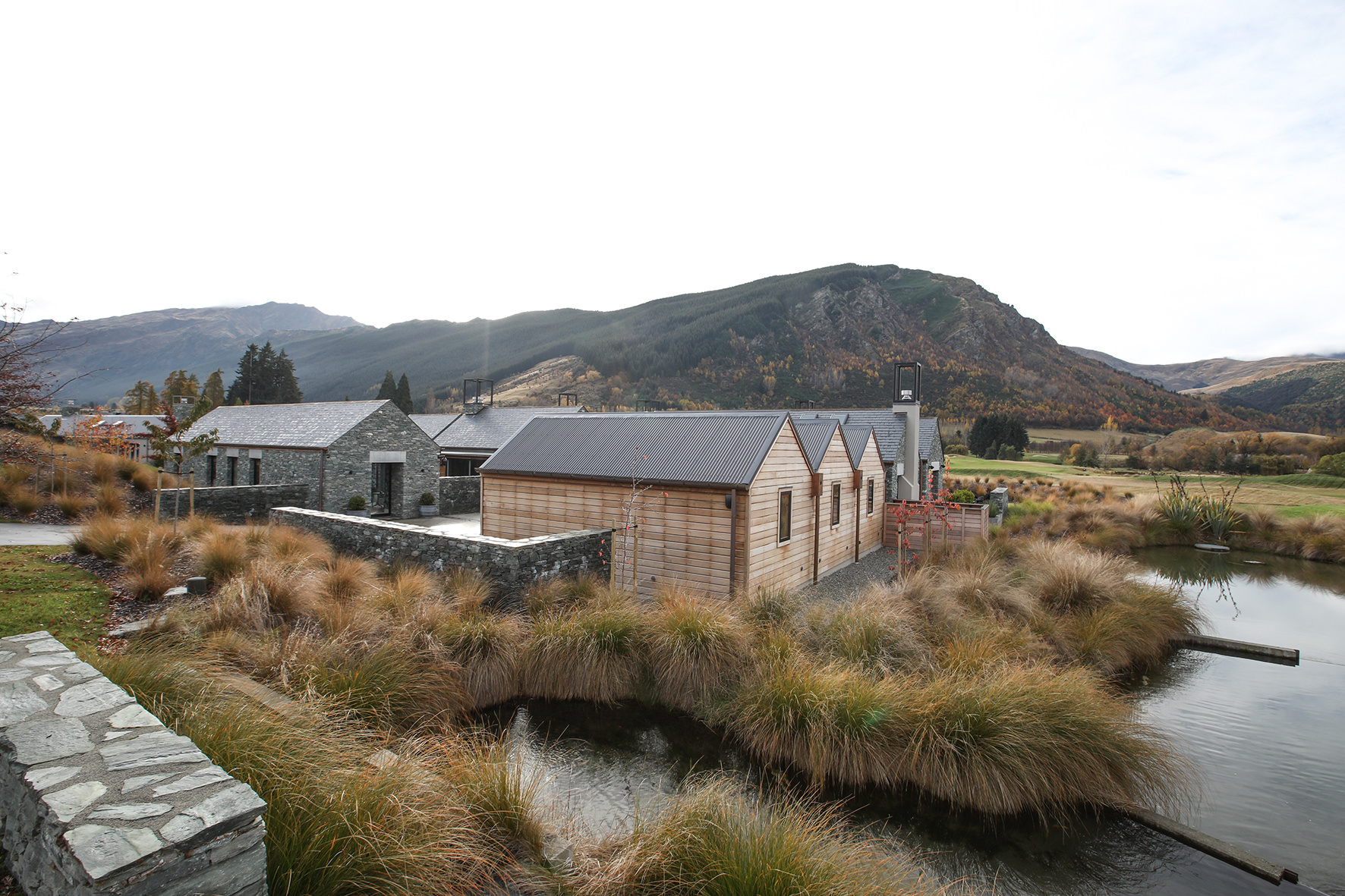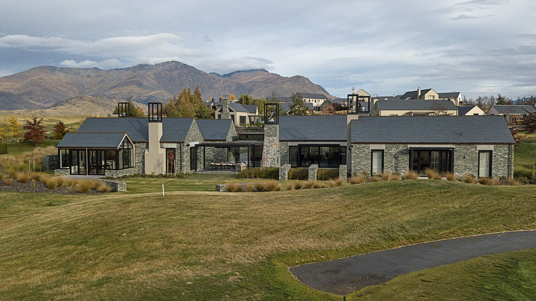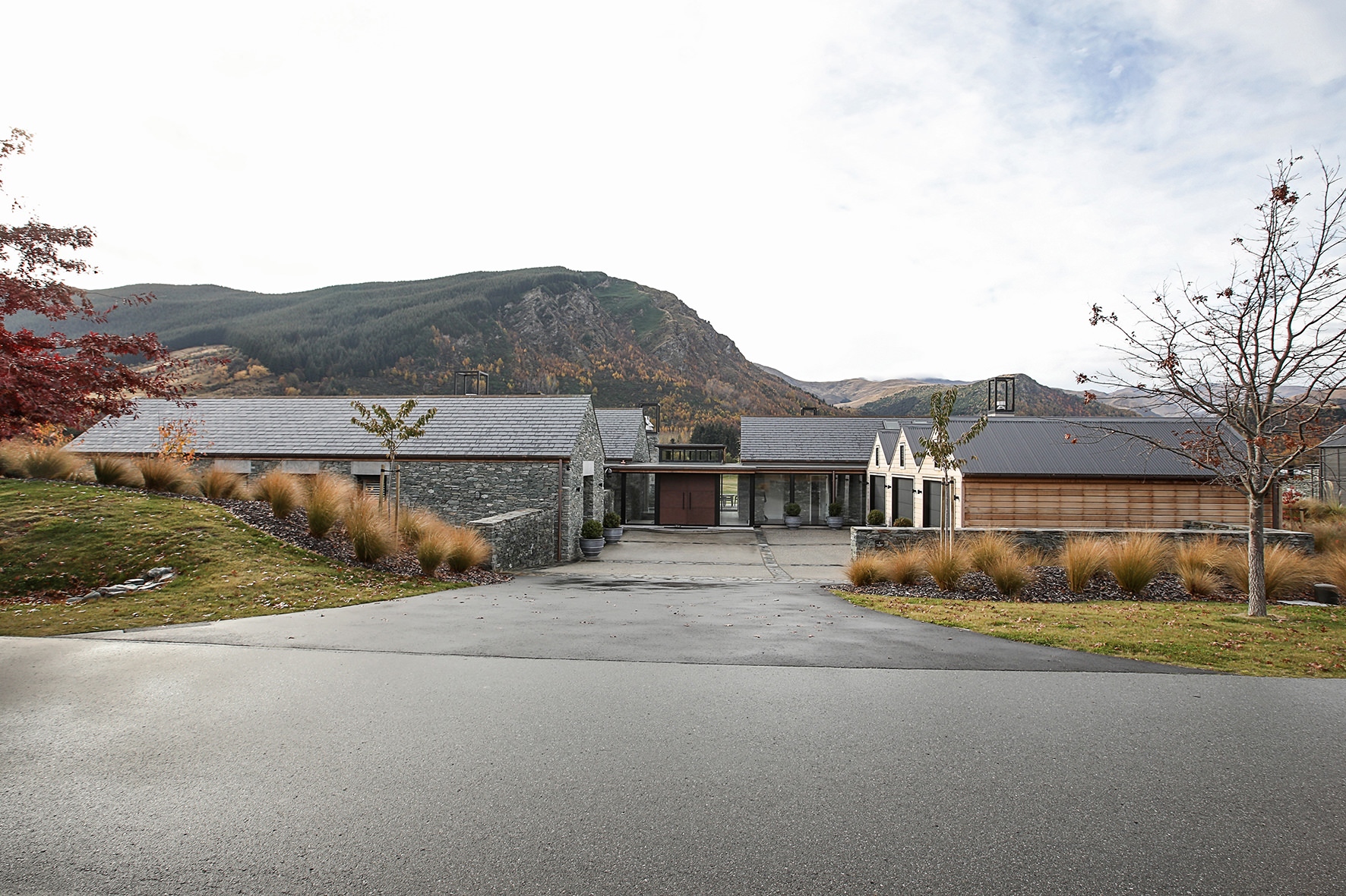 Luxuriating on the water’s edge, this home with a palatial 900sqm footprint melds into the natural environment. Zigzagging rooftops echo the surrounding mountain peaks. Pine and stack-stoned schist cladding exude raw appeal.