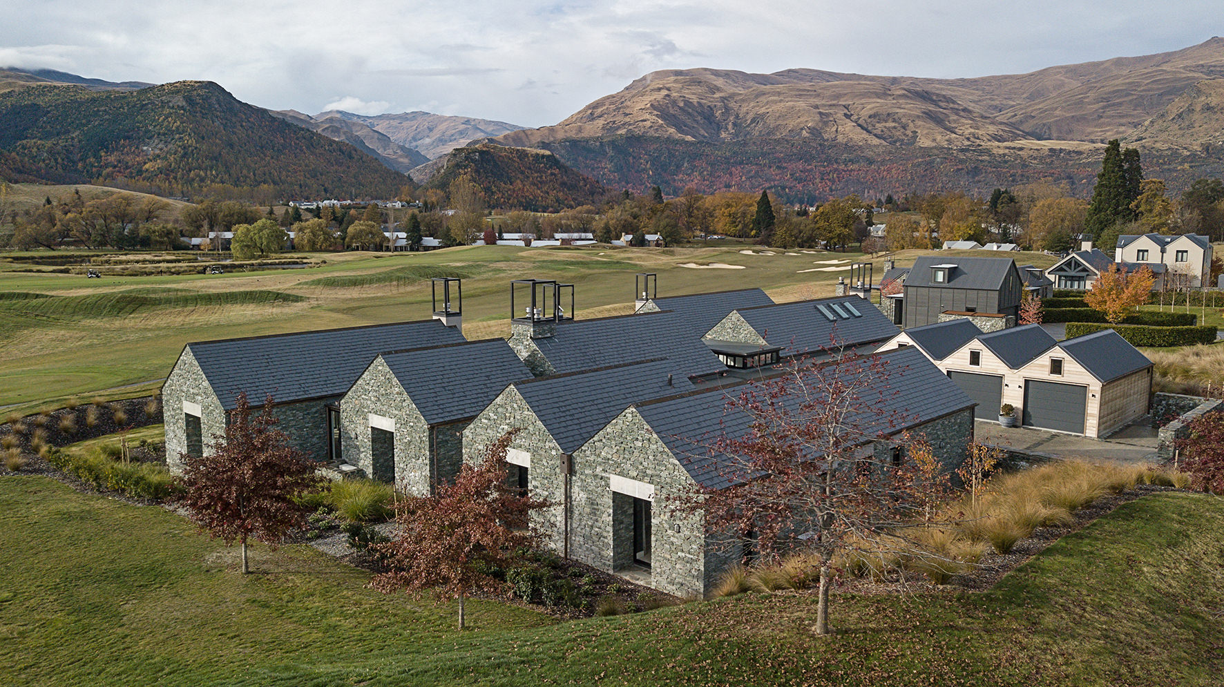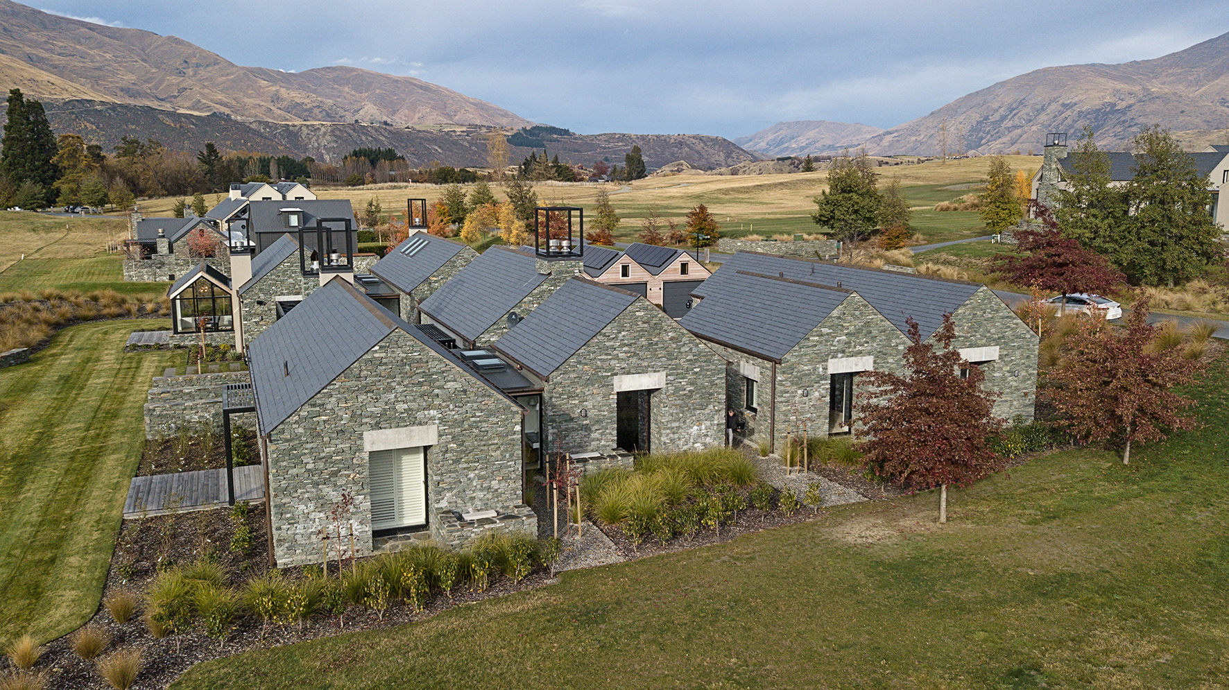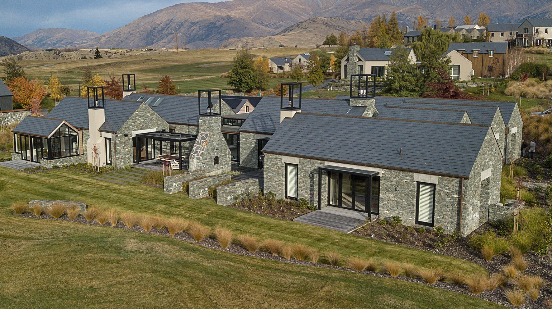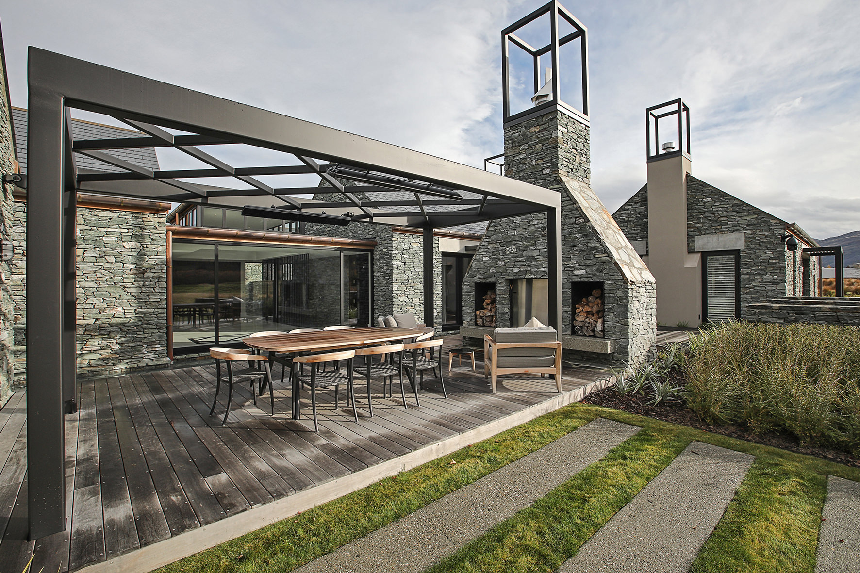 Luxuriating on the water’s edge, this home with a palatial 900sqm footprint melds into the natural environment. Zigzagging rooftops echo the surrounding mountain peaks. Pine and stack-stoned schist cladding exude raw appeal.