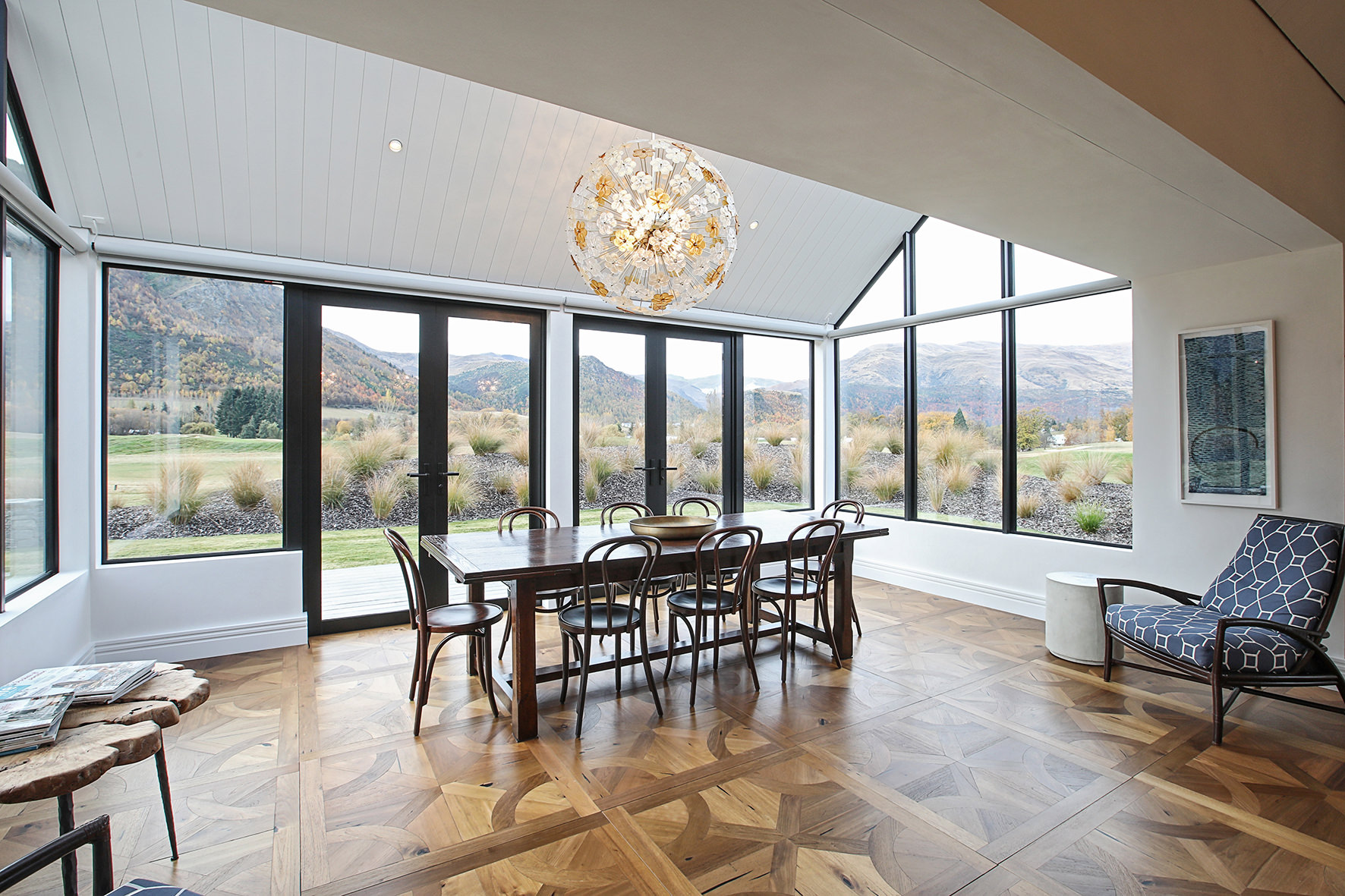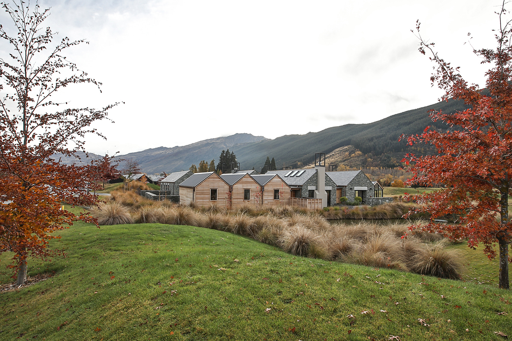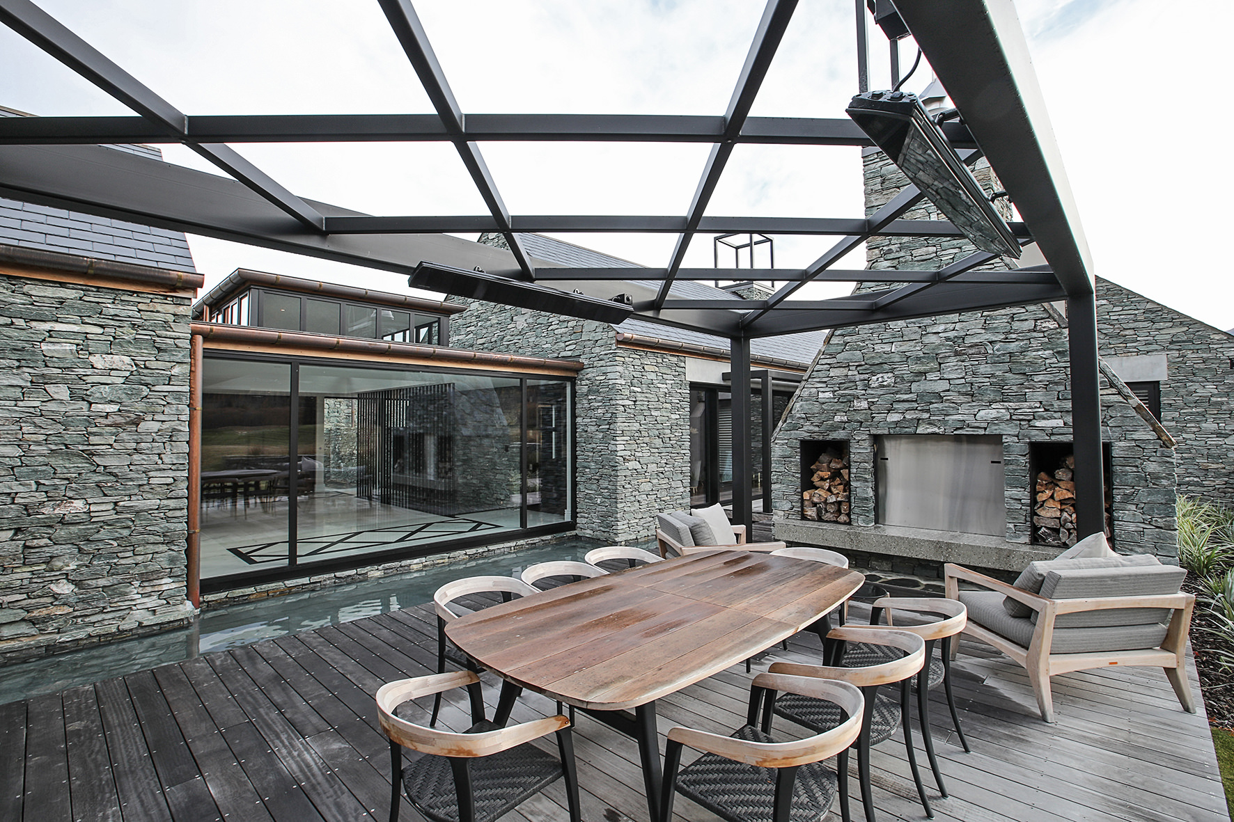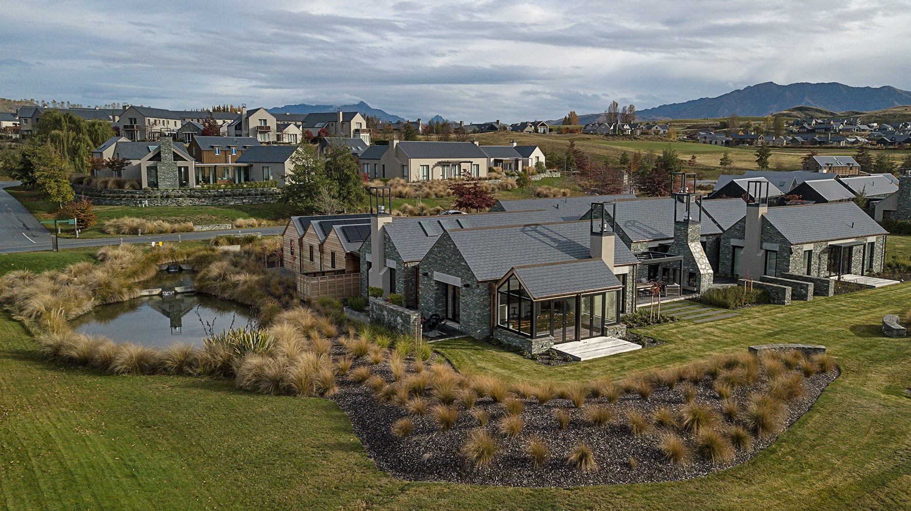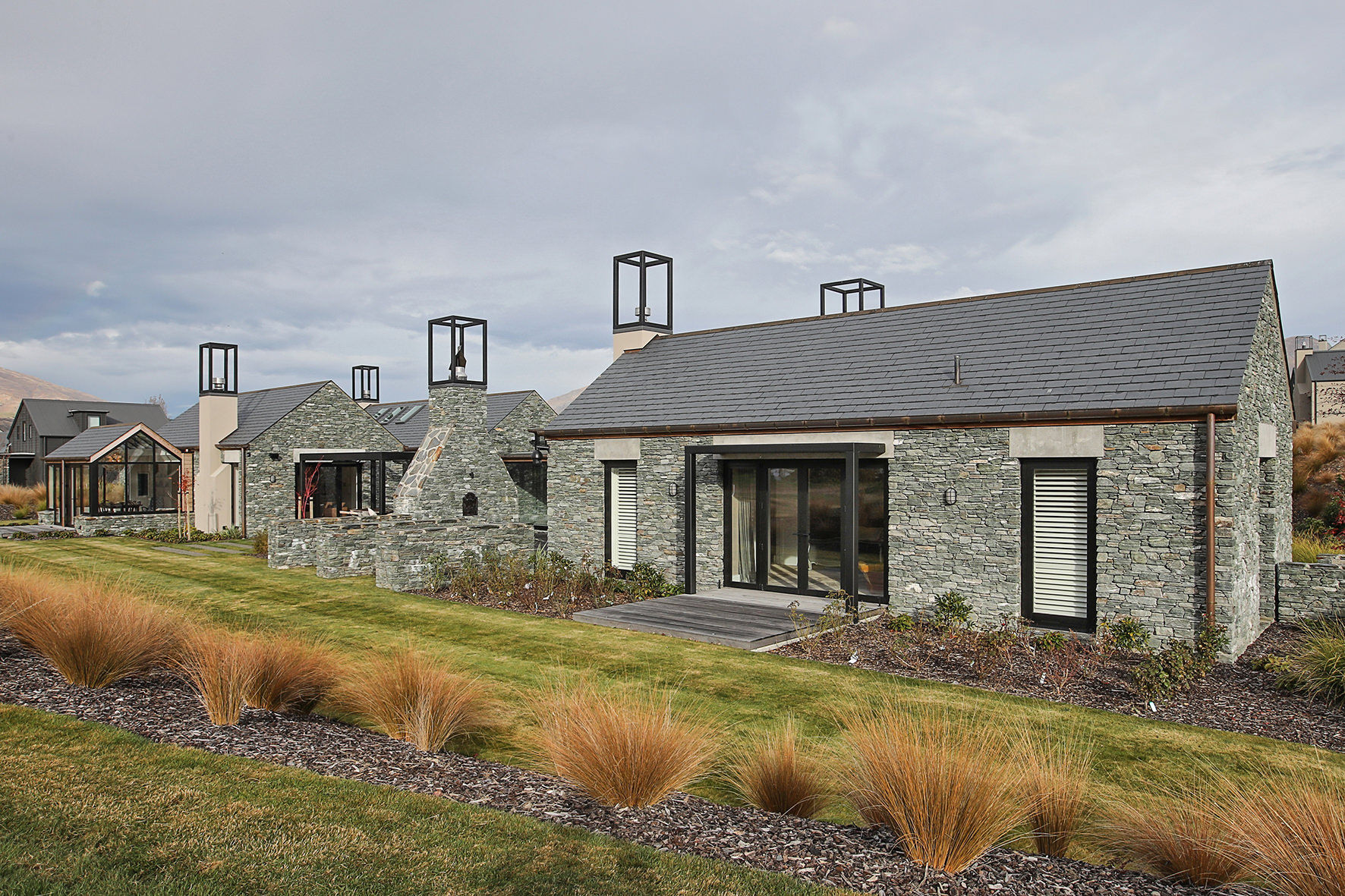 Luxuriating on the water’s edge, this home with a palatial 900sqm footprint melds into the natural environment. Zigzagging rooftops echo the surrounding mountain peaks. Pine and stack-stoned schist cladding exude raw appeal.