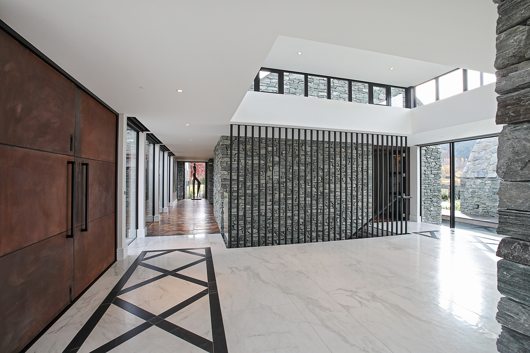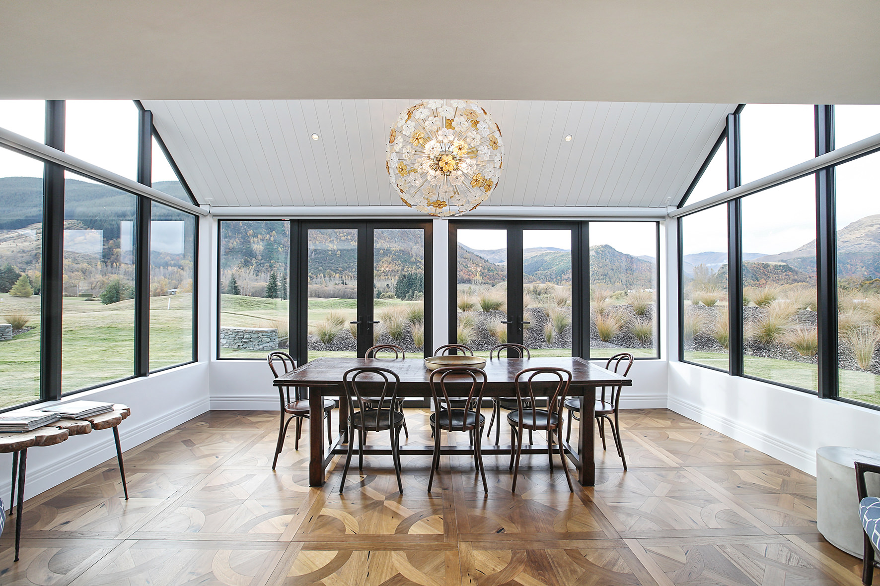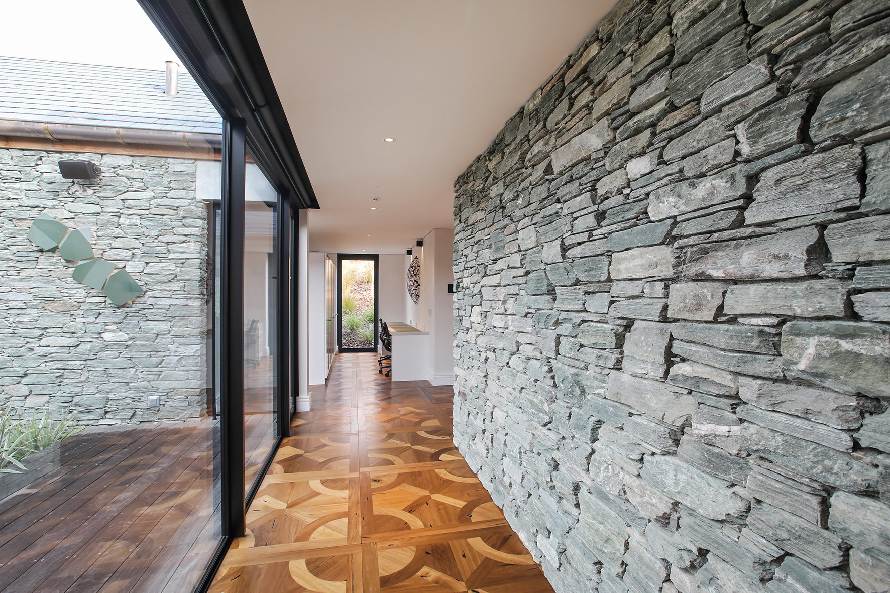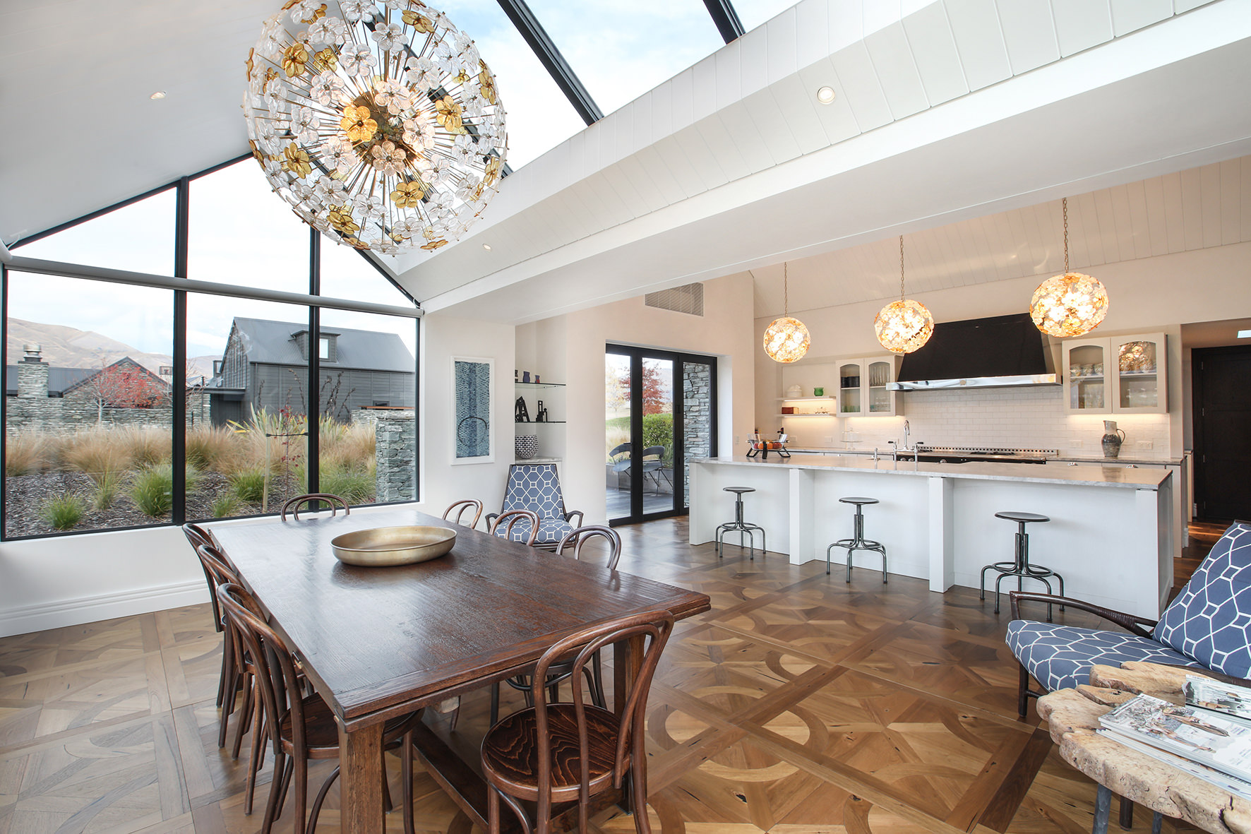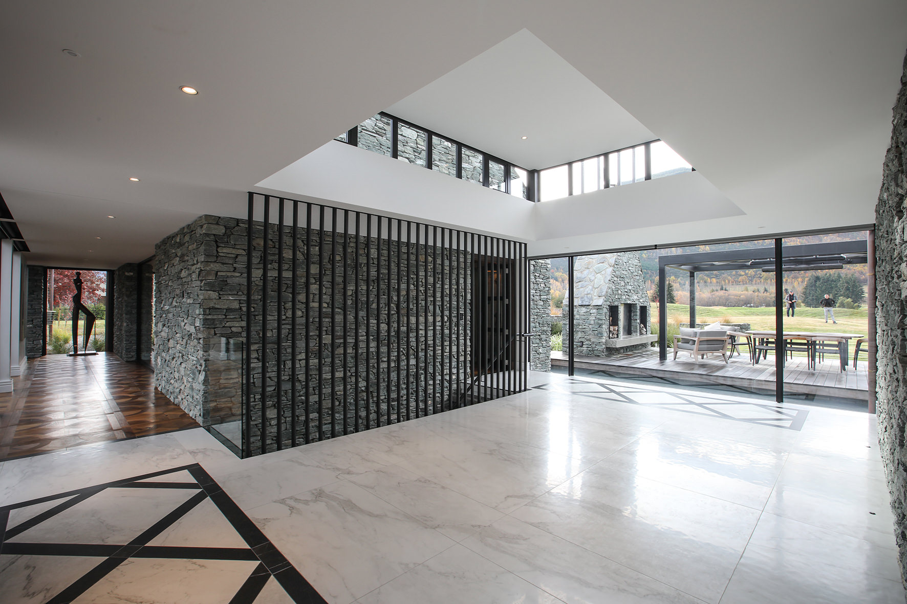 Luxuriating on the water’s edge, this home with a palatial 900sqm footprint melds into the natural environment. Zigzagging rooftops echo the surrounding mountain peaks. Pine and stack-stoned schist cladding exude raw appeal.