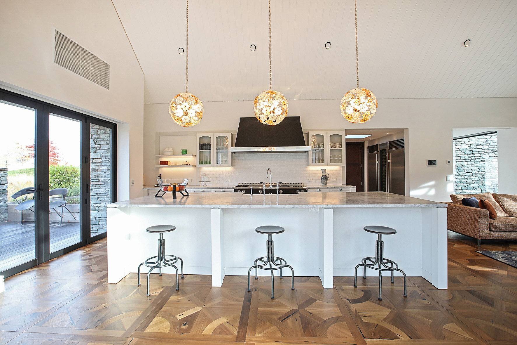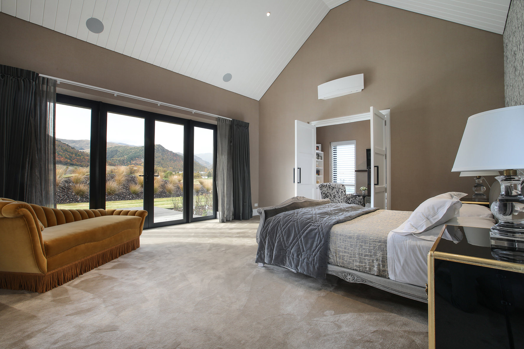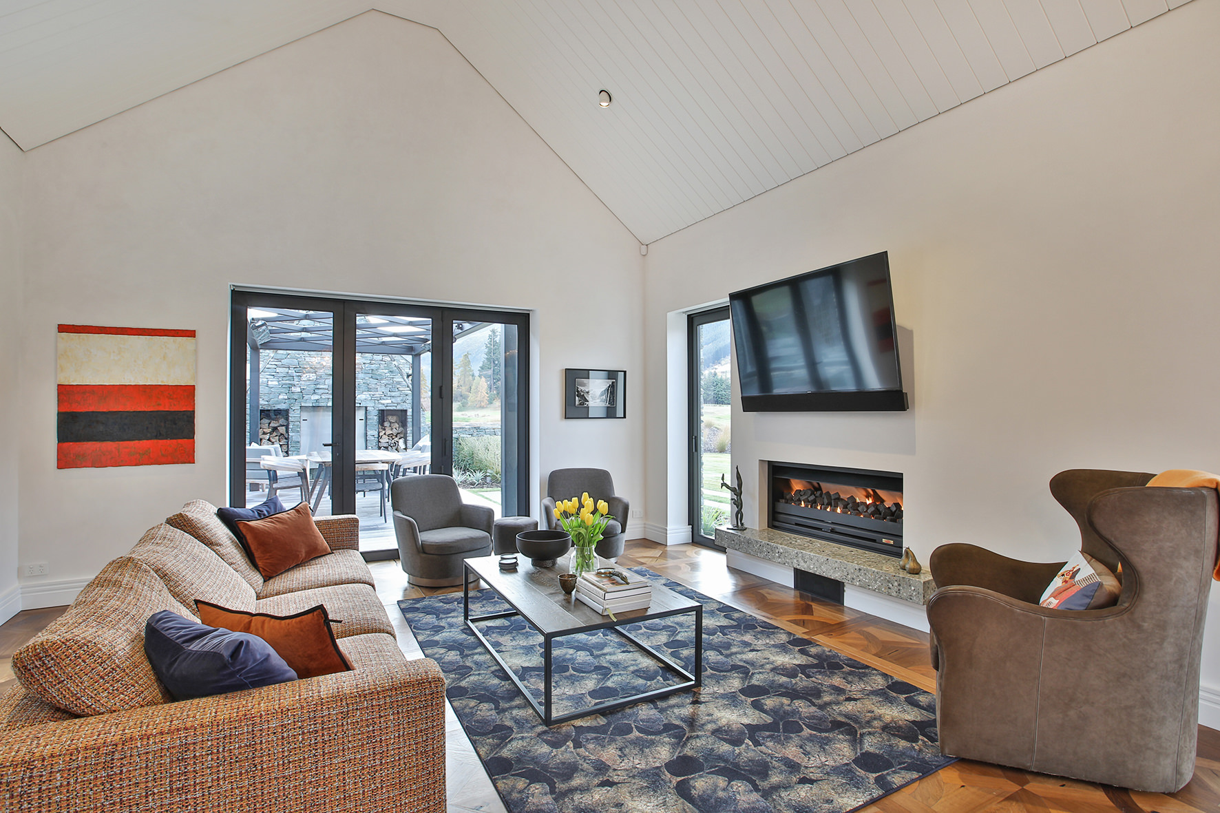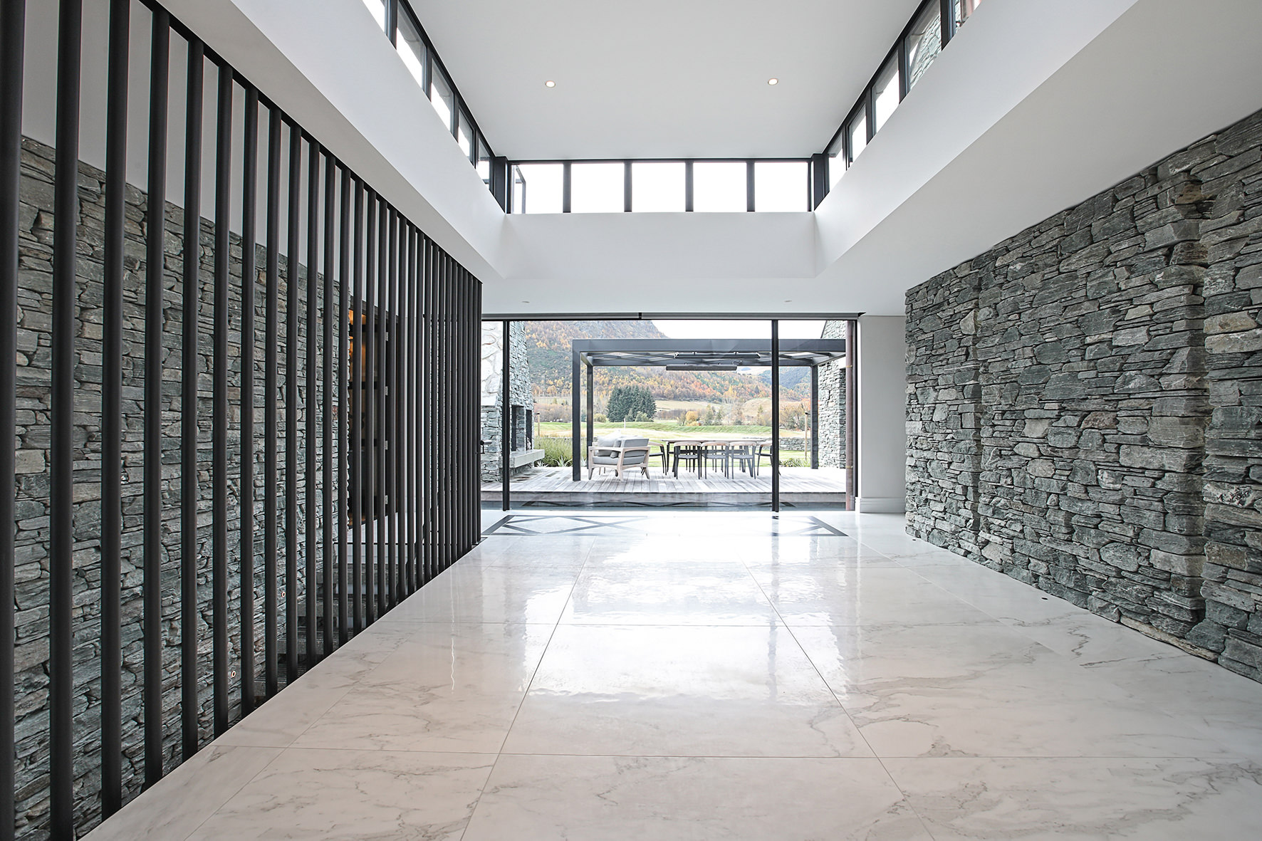 Luxuriating on the water’s edge, this home with a palatial 900sqm footprint melds into the natural environment. Zigzagging rooftops echo the surrounding mountain peaks. Pine and stack-stoned schist cladding exude raw appeal.