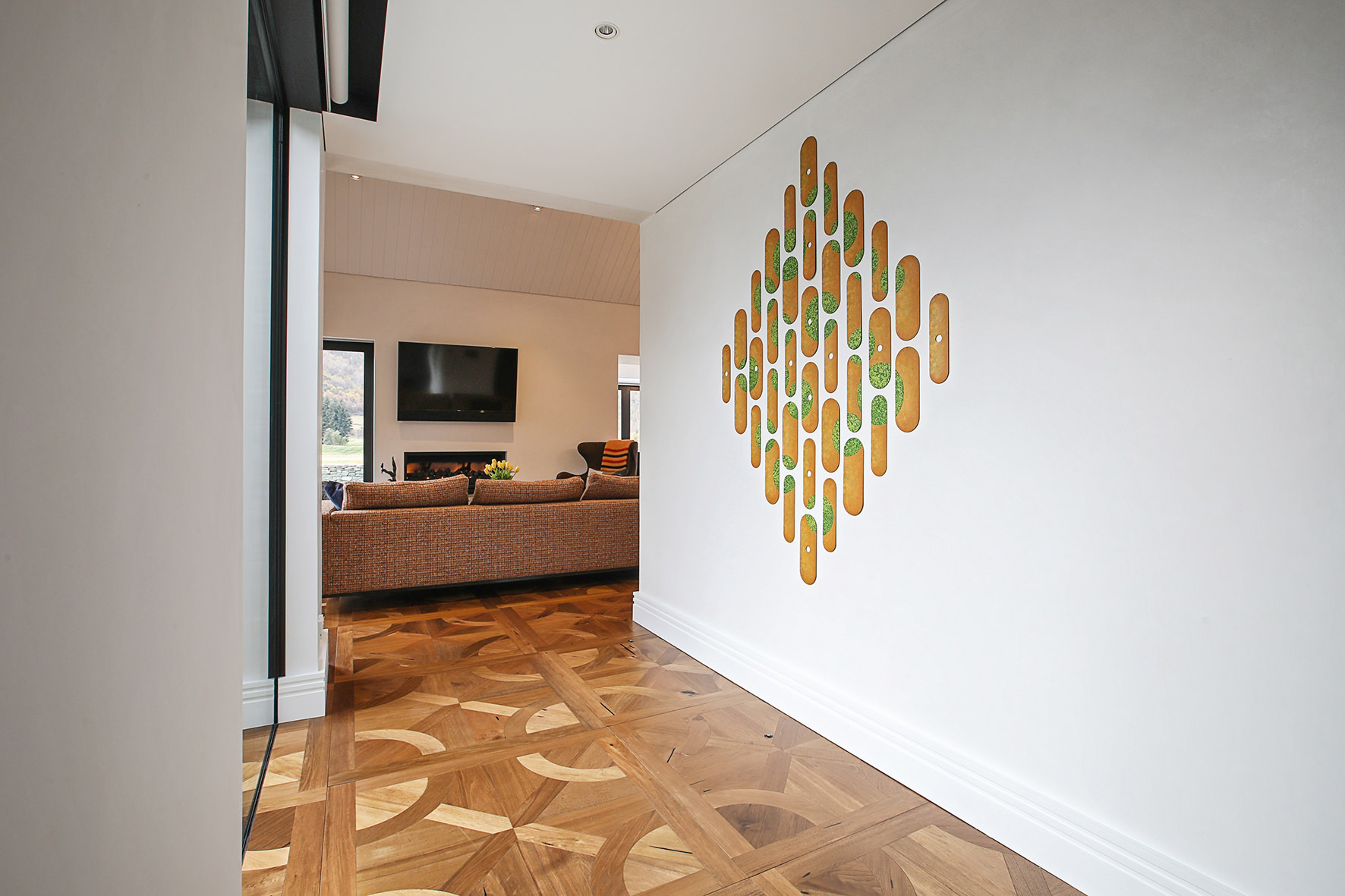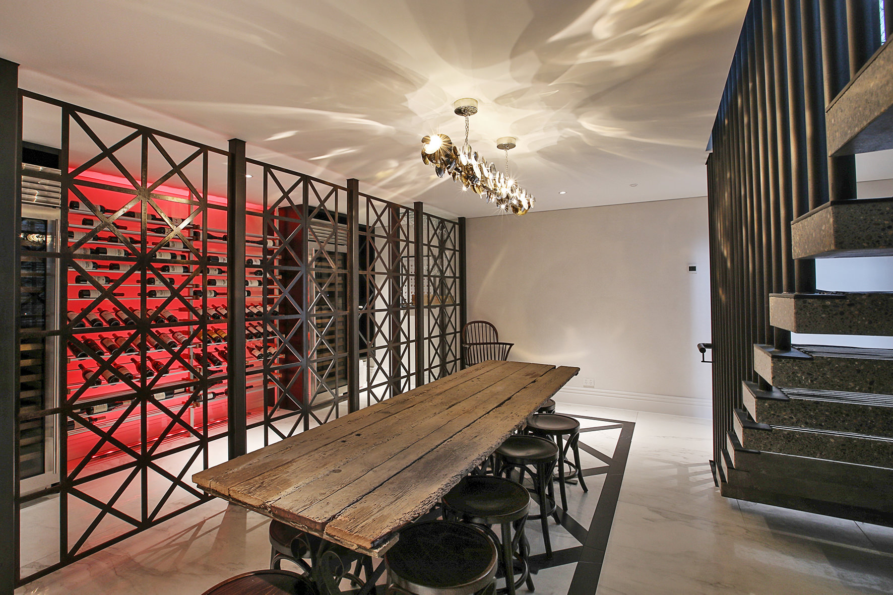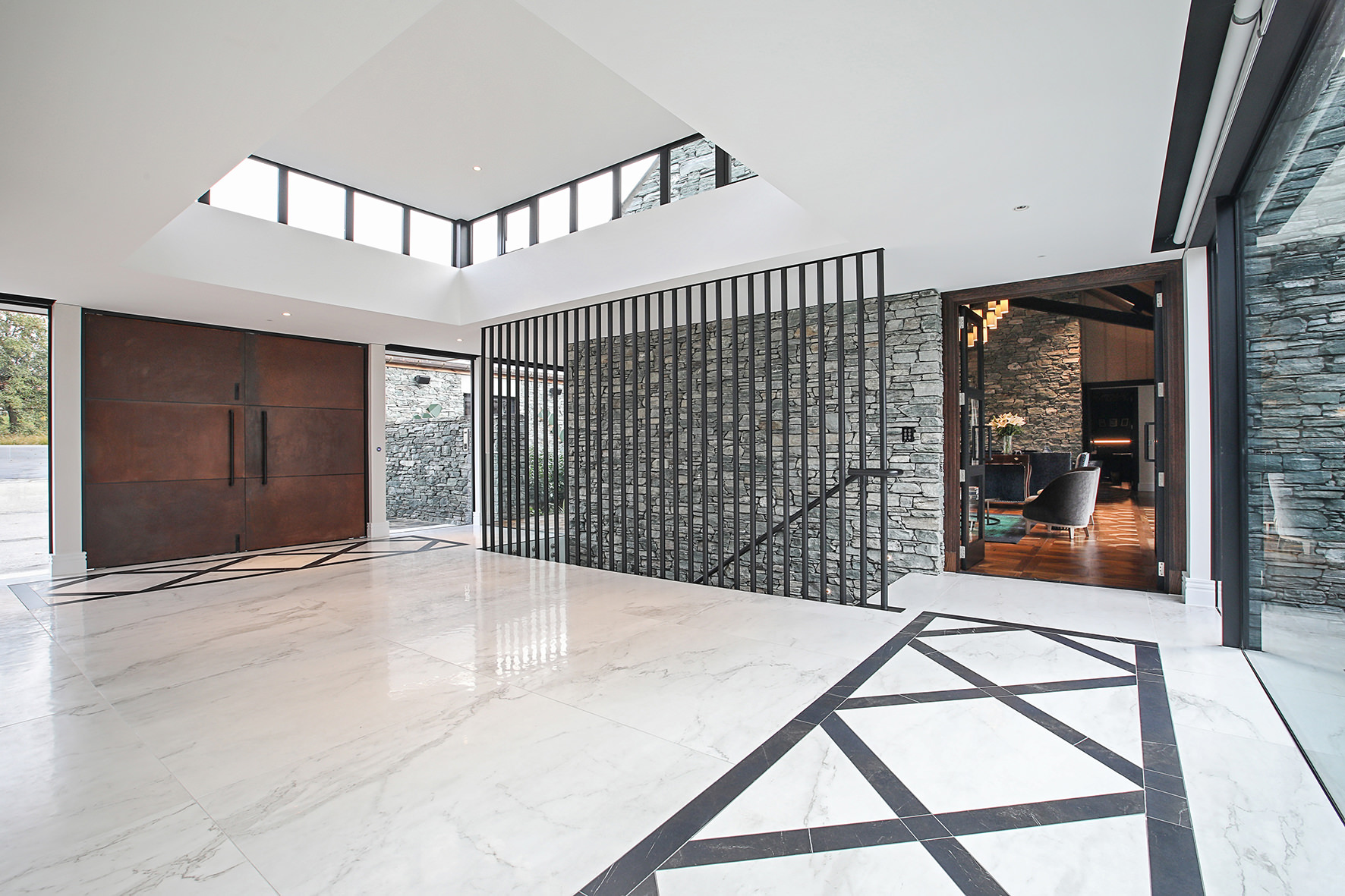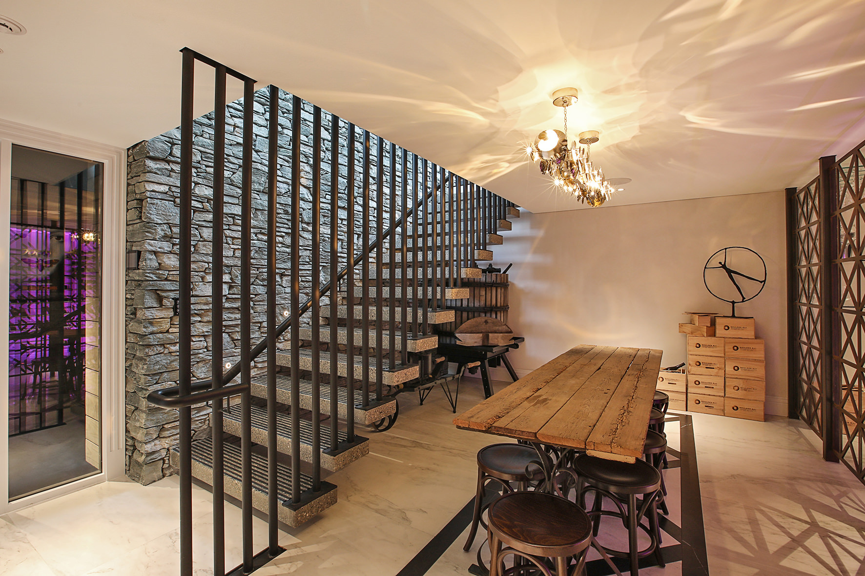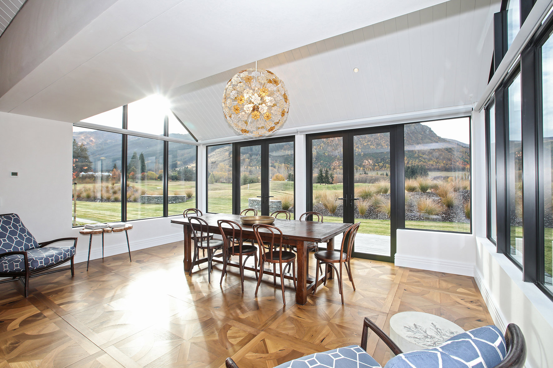 Luxuriating on the water’s edge, this home with a palatial 900sqm footprint melds into the natural environment. Zigzagging rooftops echo the surrounding mountain peaks. Pine and stack-stoned schist cladding exude raw appeal.