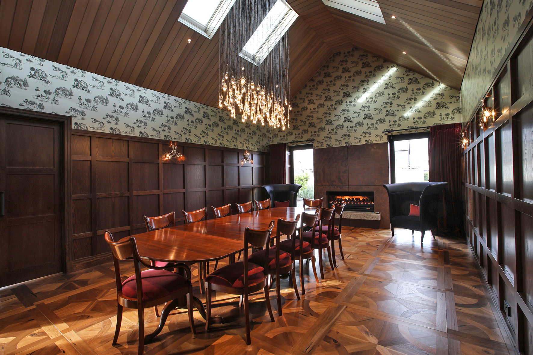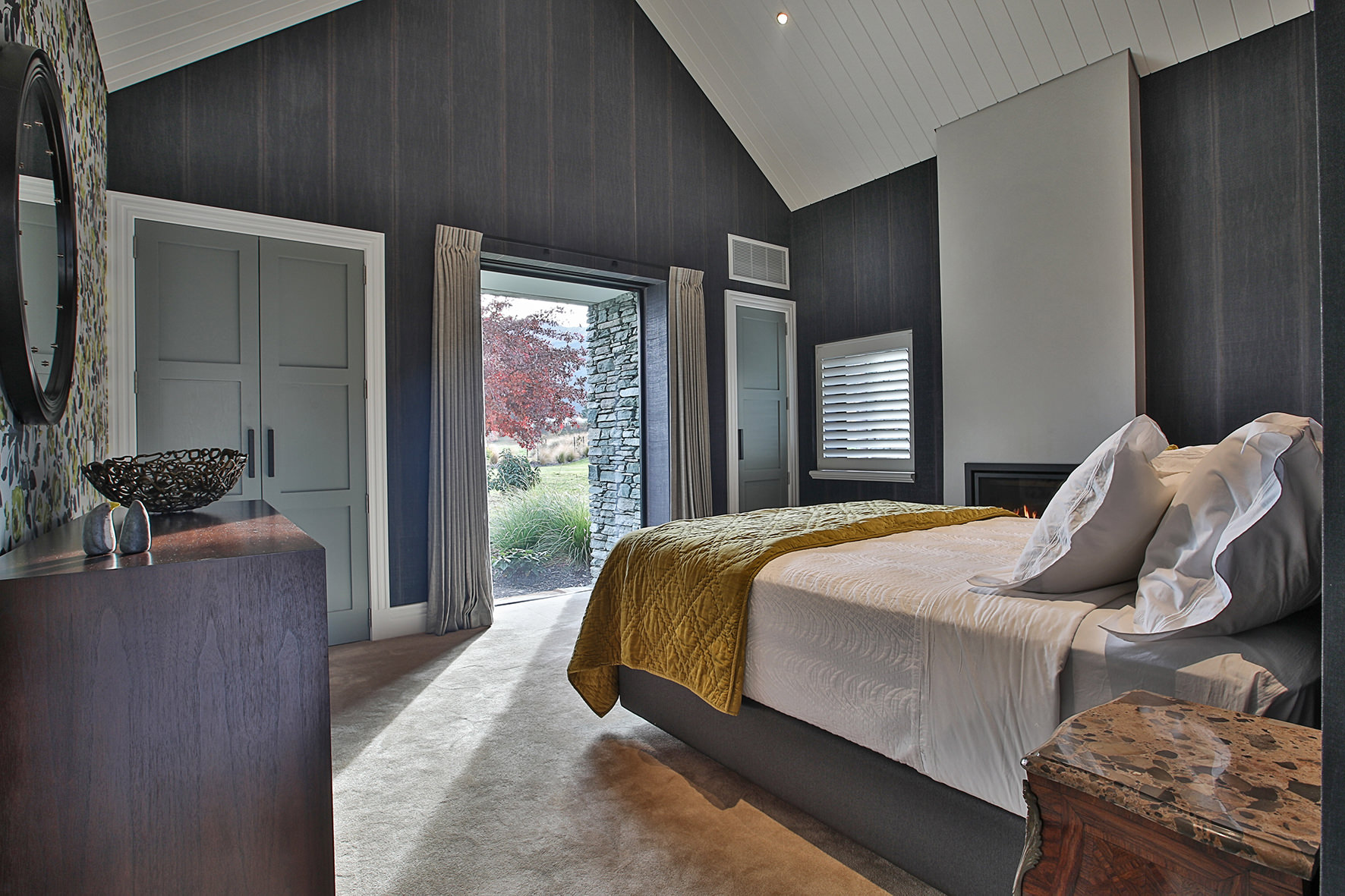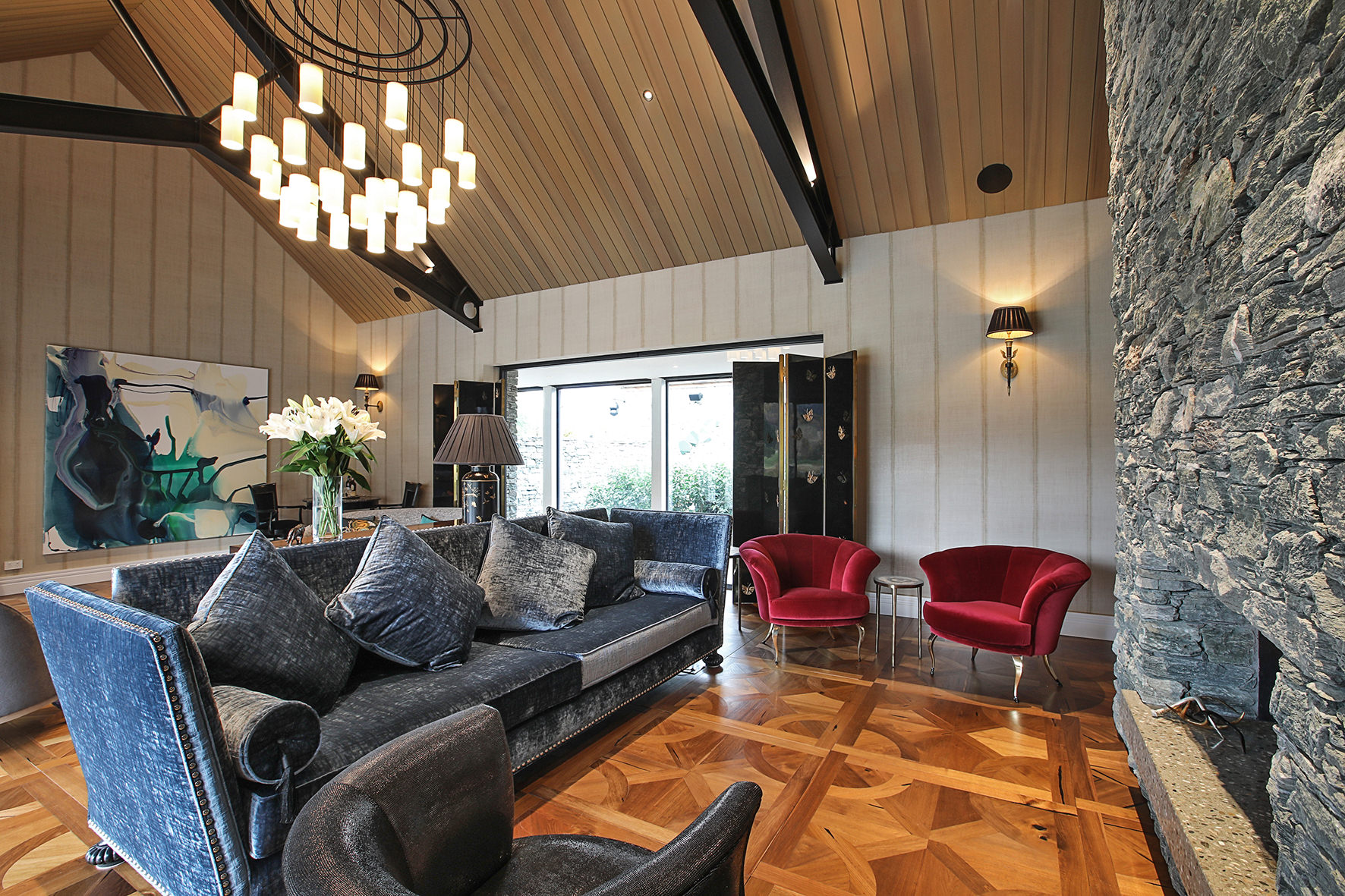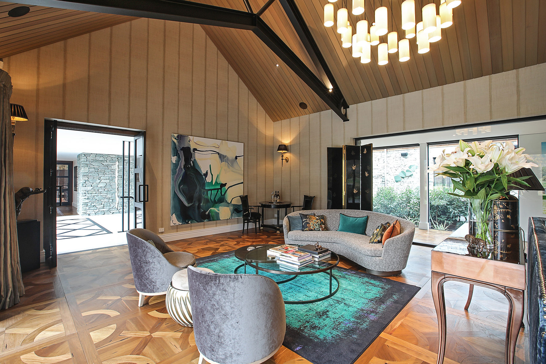 The four-bedroom, four-bathroom interior is as rich and varied as nature, borrowing from the source. Raking cedar ceilings grace the lounge areas, with painted pine in the kitchen and living domain. Both the study and the large dining room feature oak panelled wall linings.