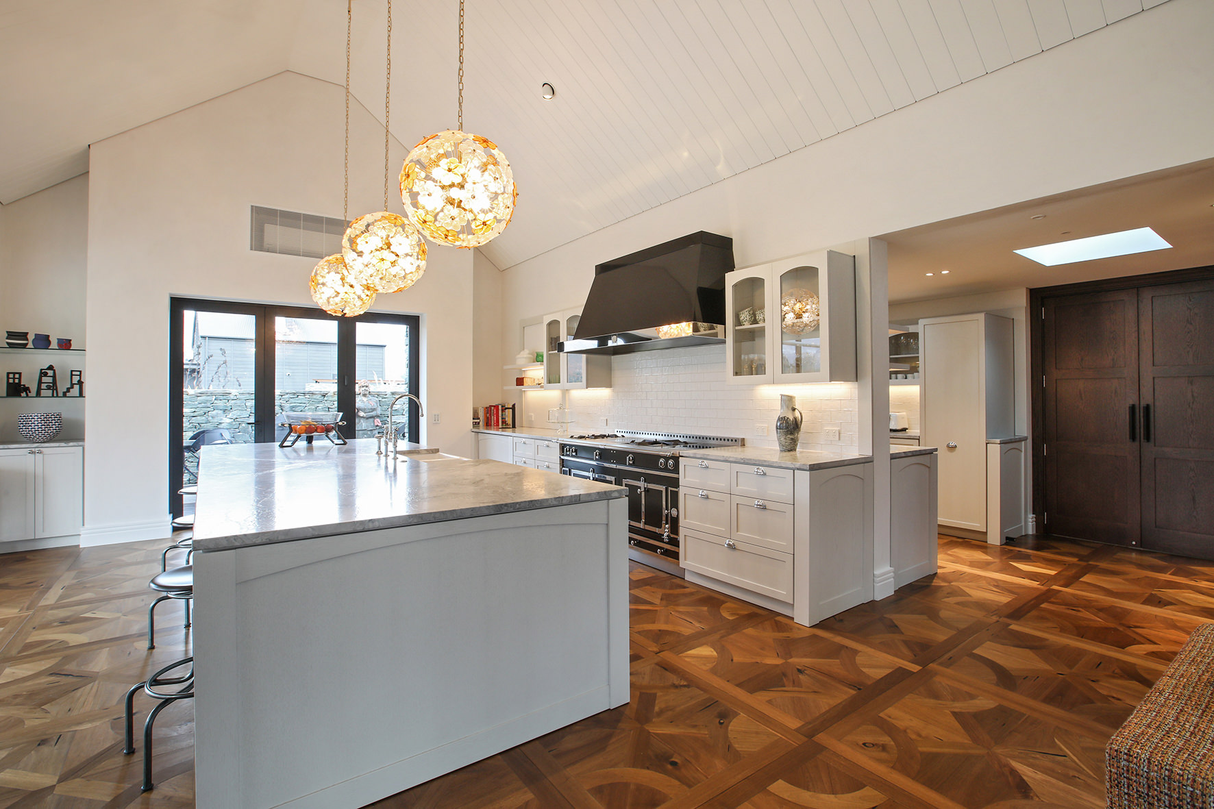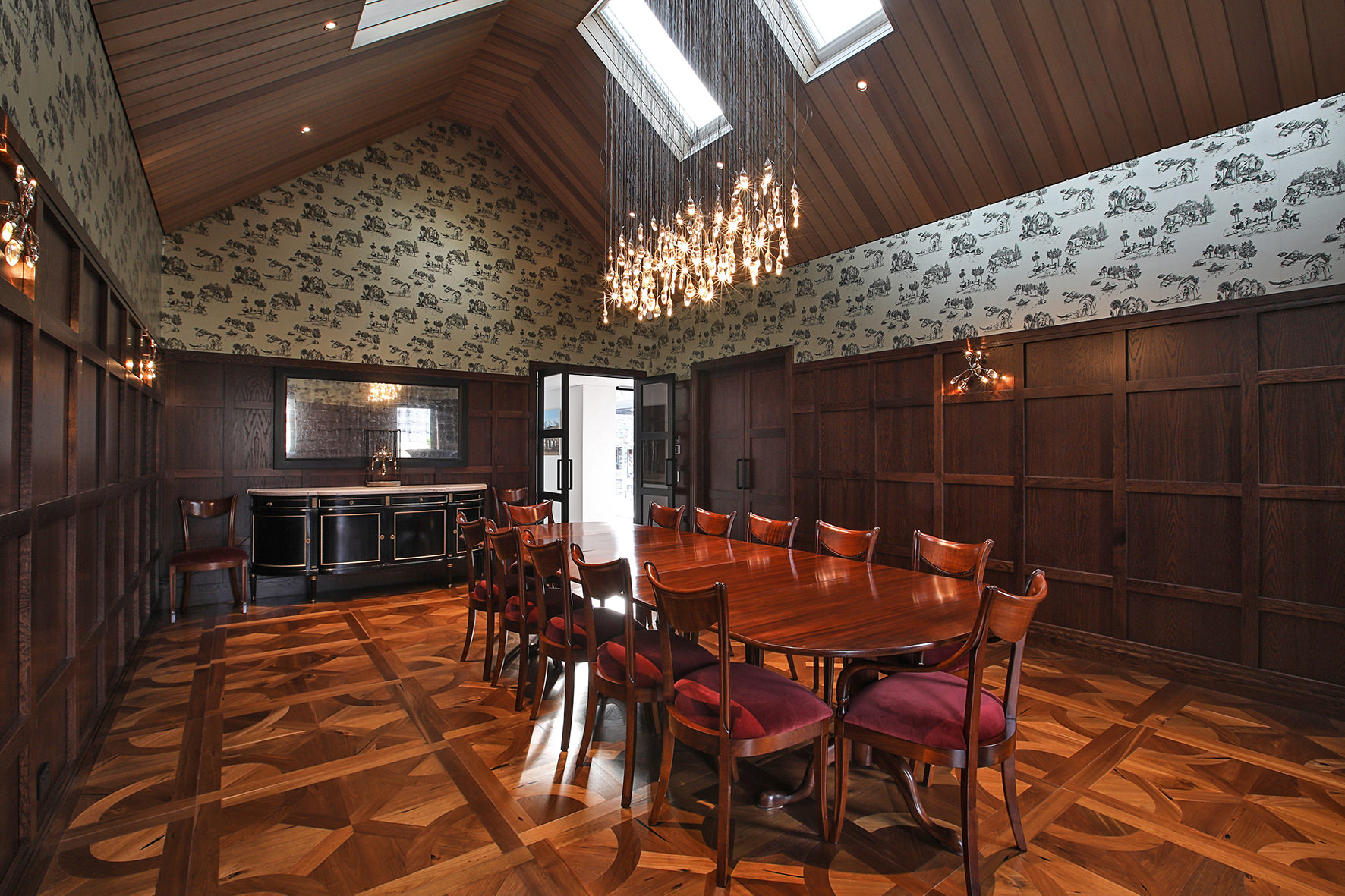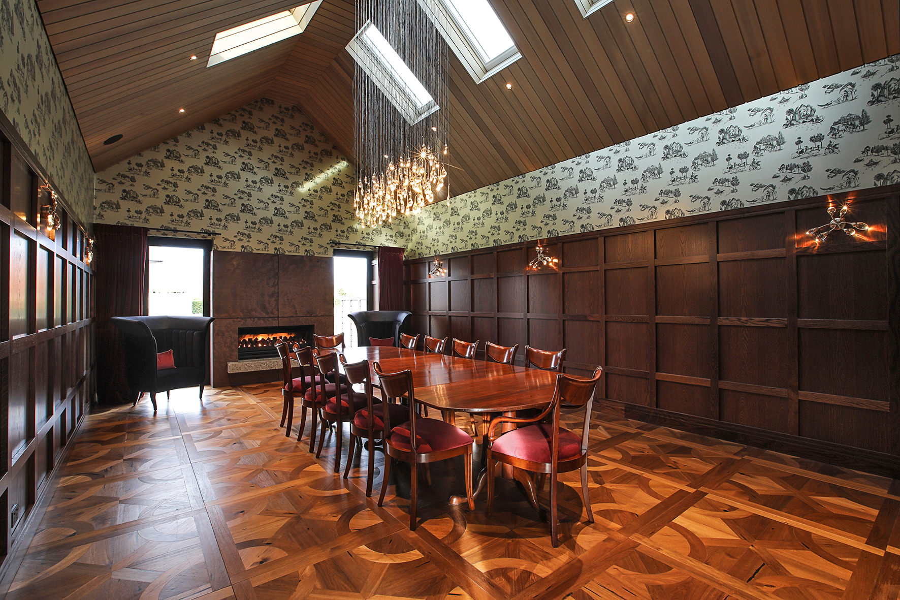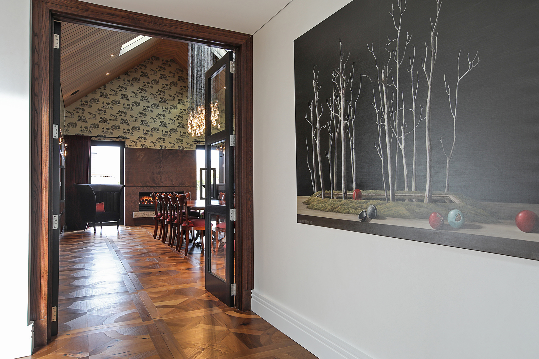 The four-bedroom, four-bathroom interior is as rich and varied as nature, borrowing from the source. Raking cedar ceilings grace the lounge areas, with painted pine in the kitchen and living domain. Both the study and the large dining room feature oak panelled wall linings.