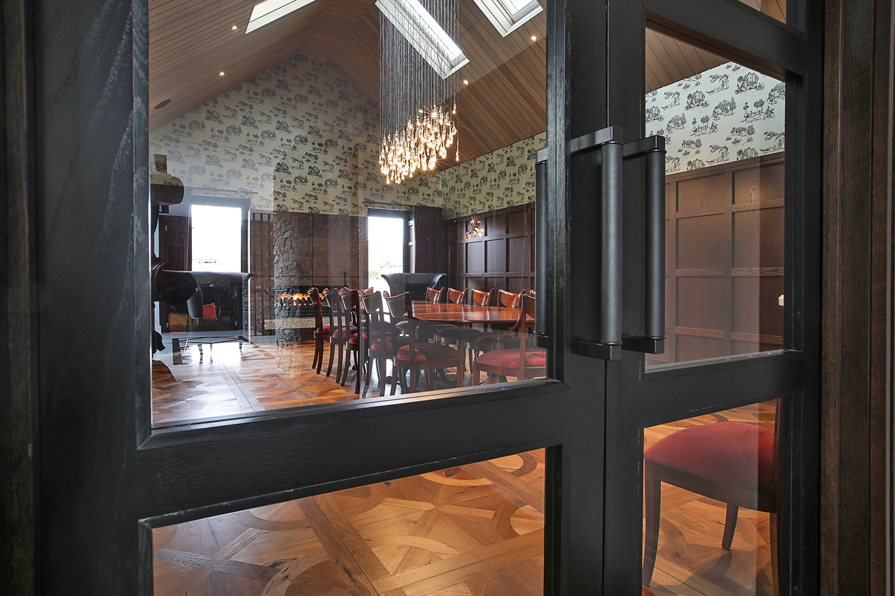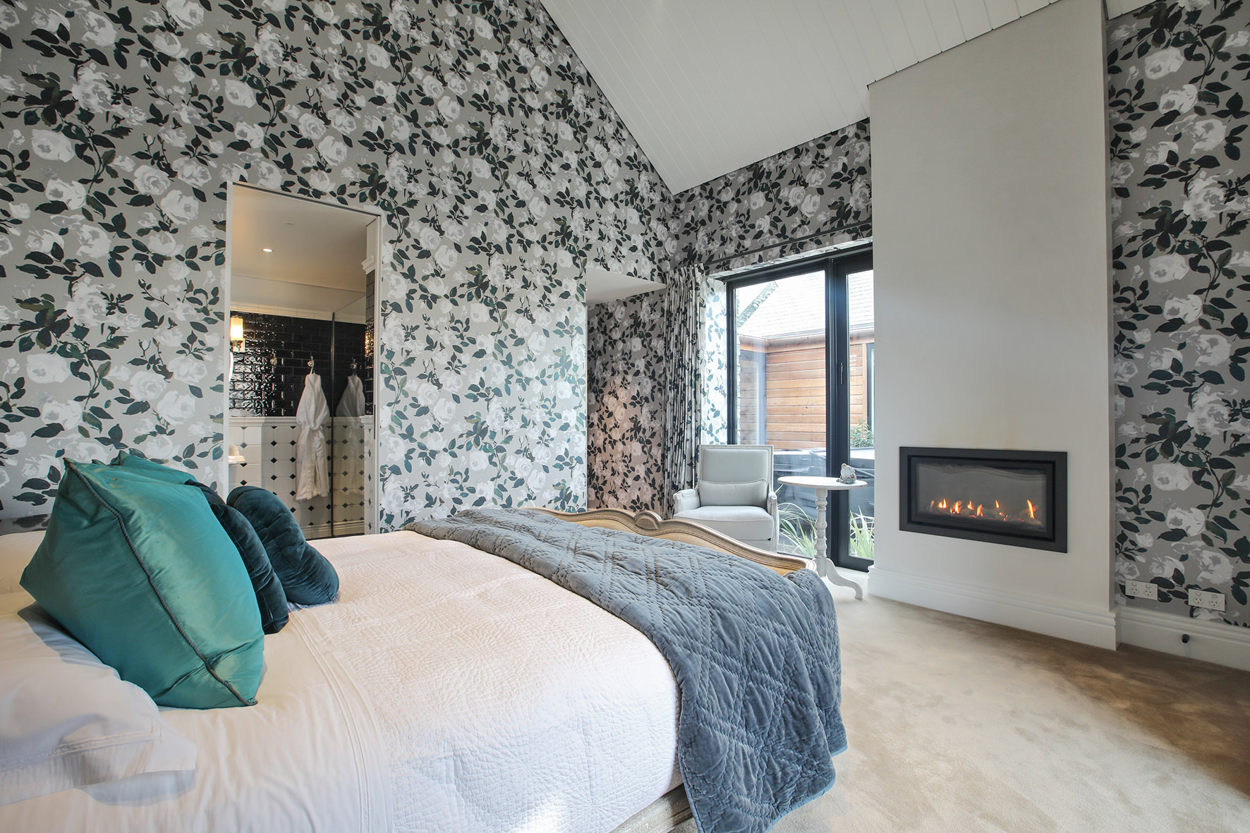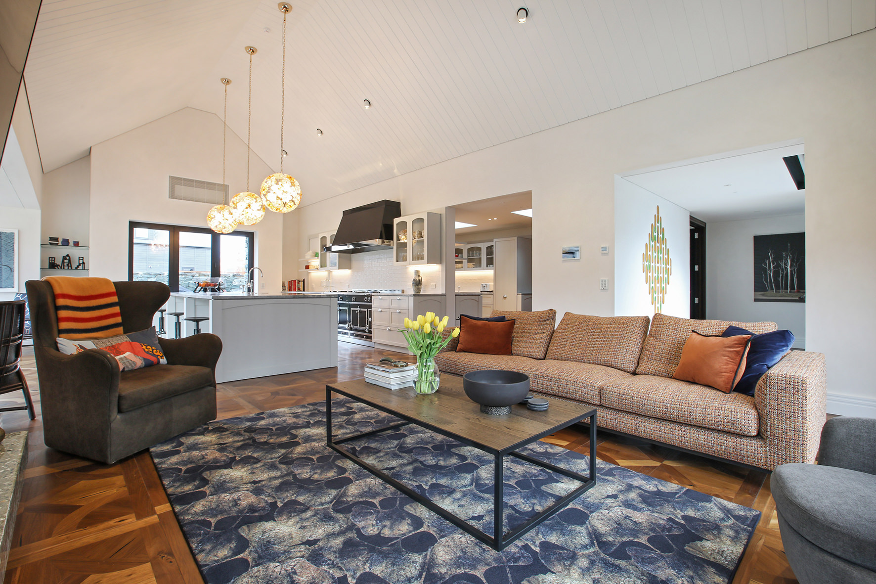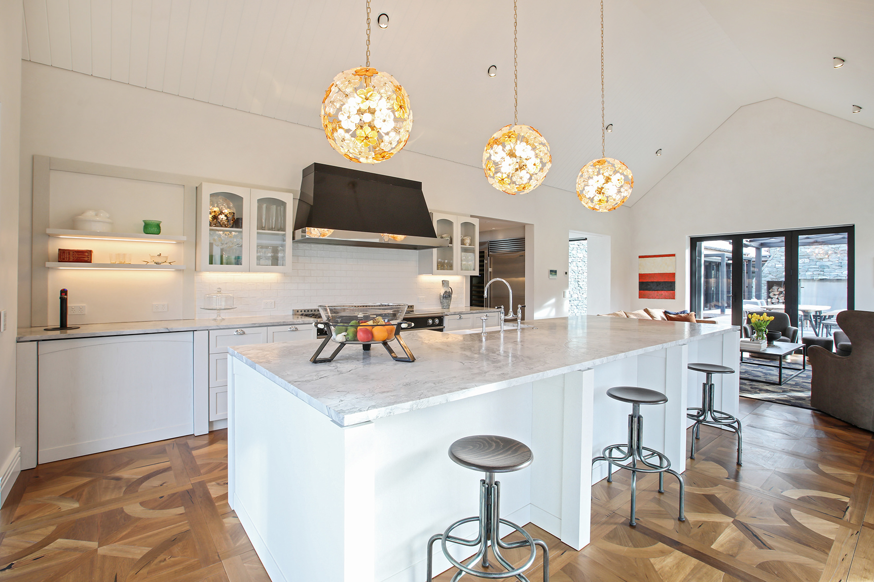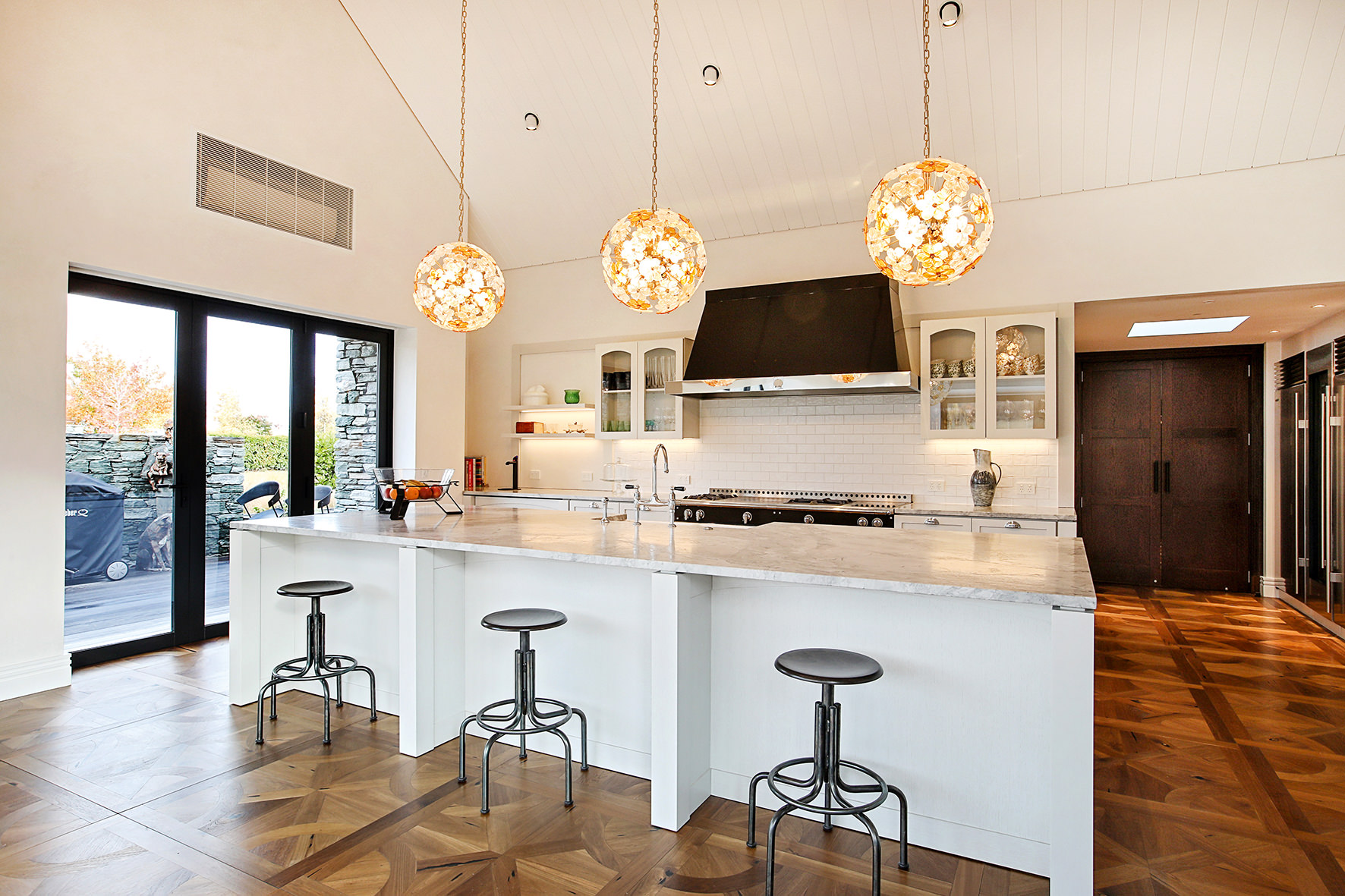 The four-bedroom, four-bathroom interior is as rich and varied as nature, borrowing from the source. Raking cedar ceilings grace the lounge areas, with painted pine in the kitchen and living domain. Both the study and the large dining room feature oak panelled wall linings.