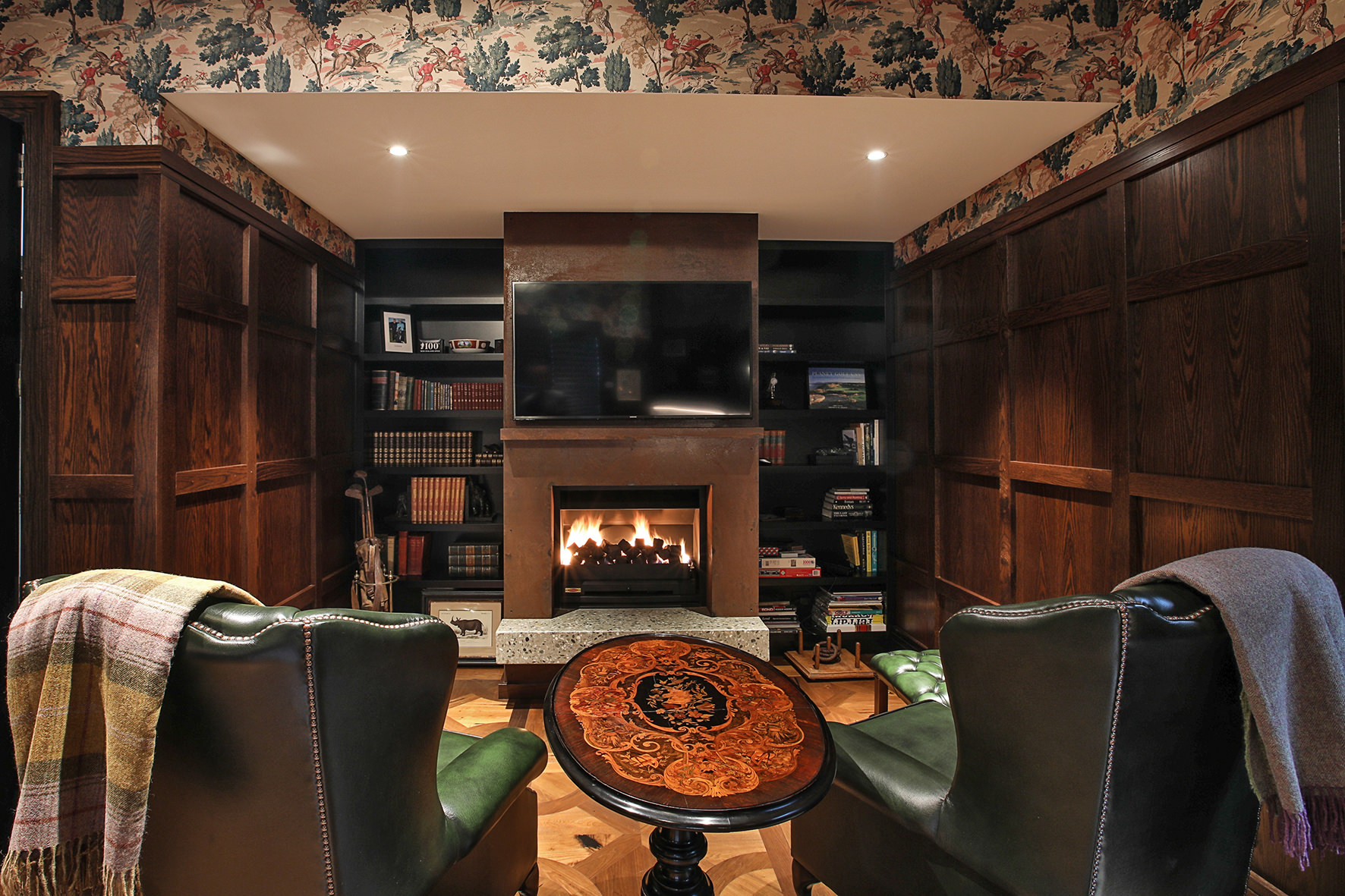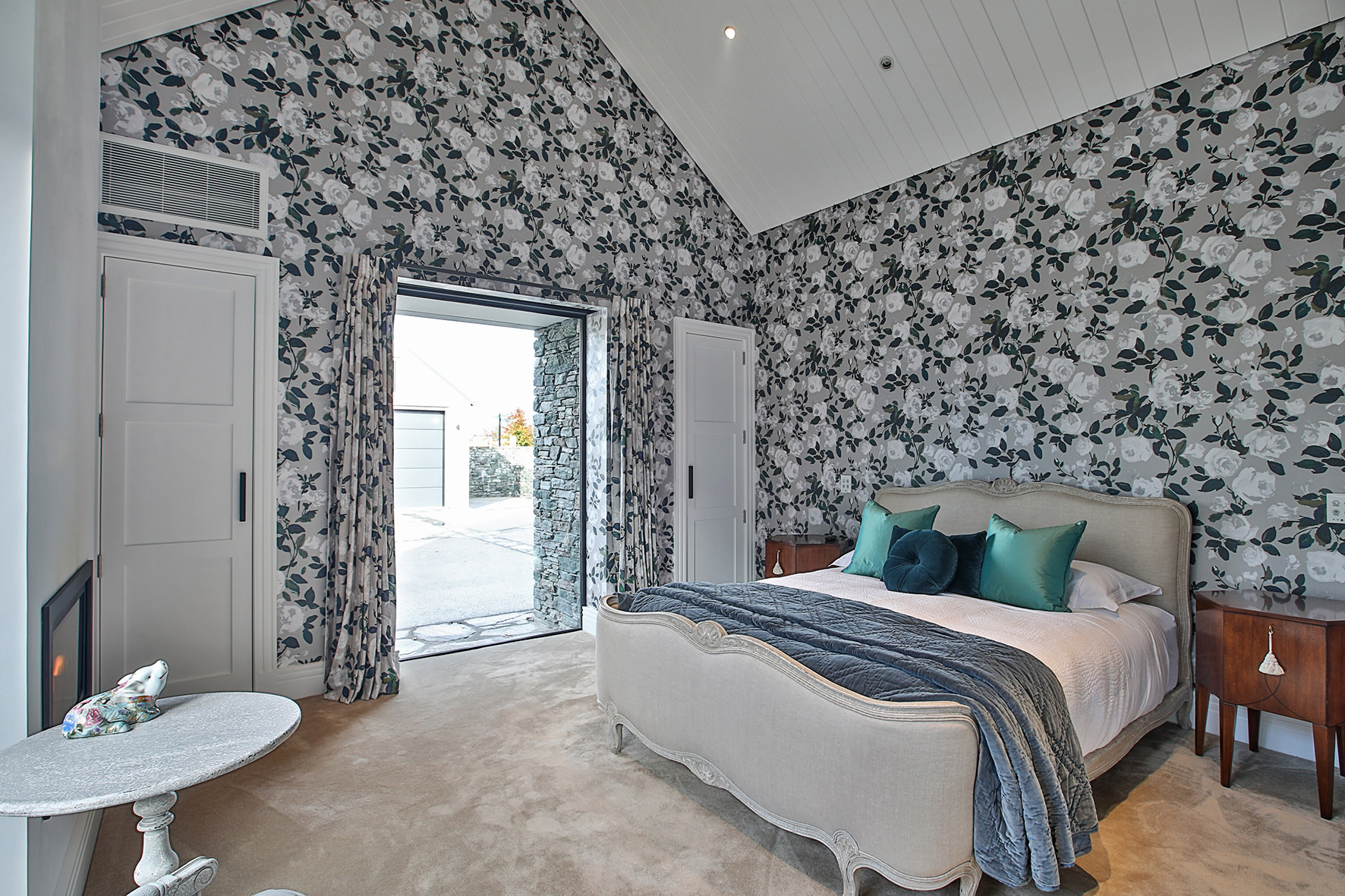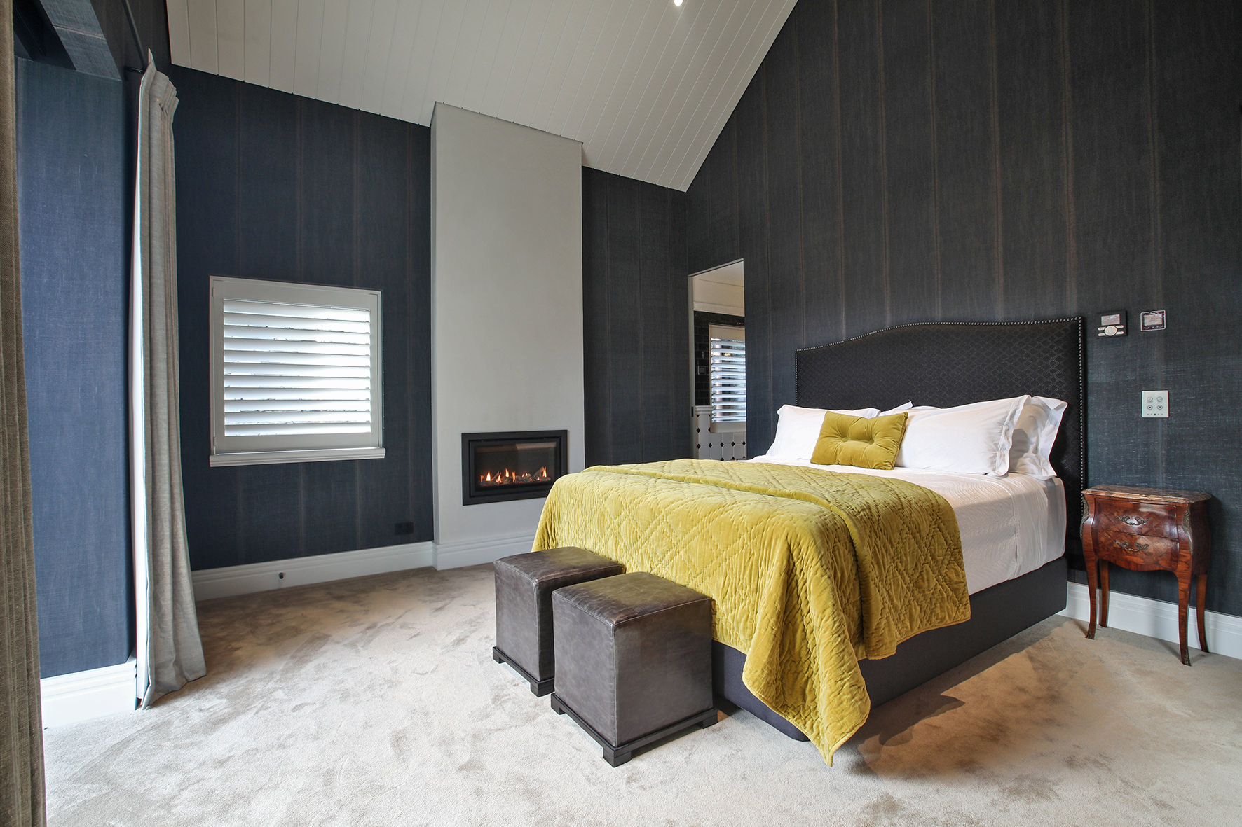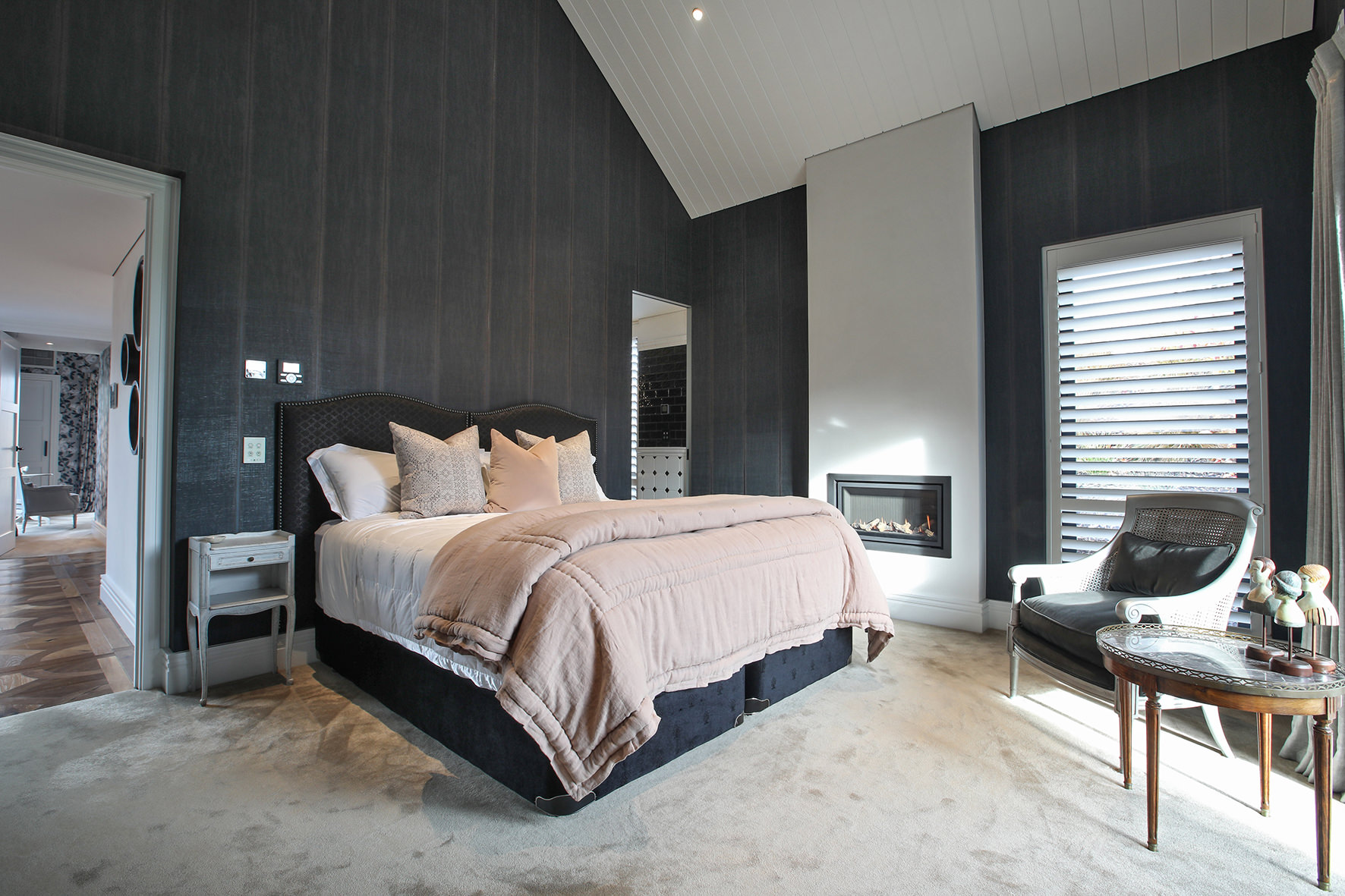 The four-bedroom, four-bathroom interior is as rich and varied as nature, borrowing from the source. Raking cedar ceilings grace the lounge areas, with painted pine in the kitchen and living domain. Both the study and the large dining room feature oak panelled wall linings.