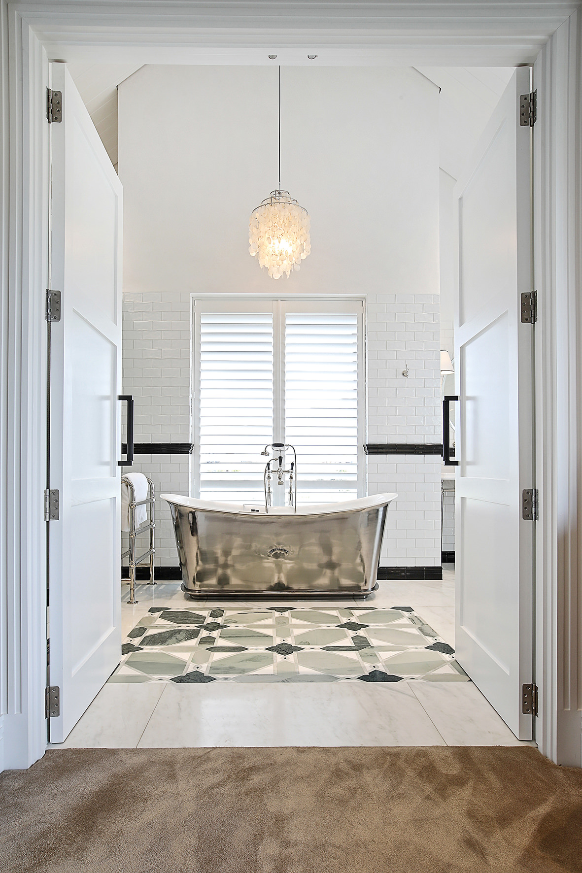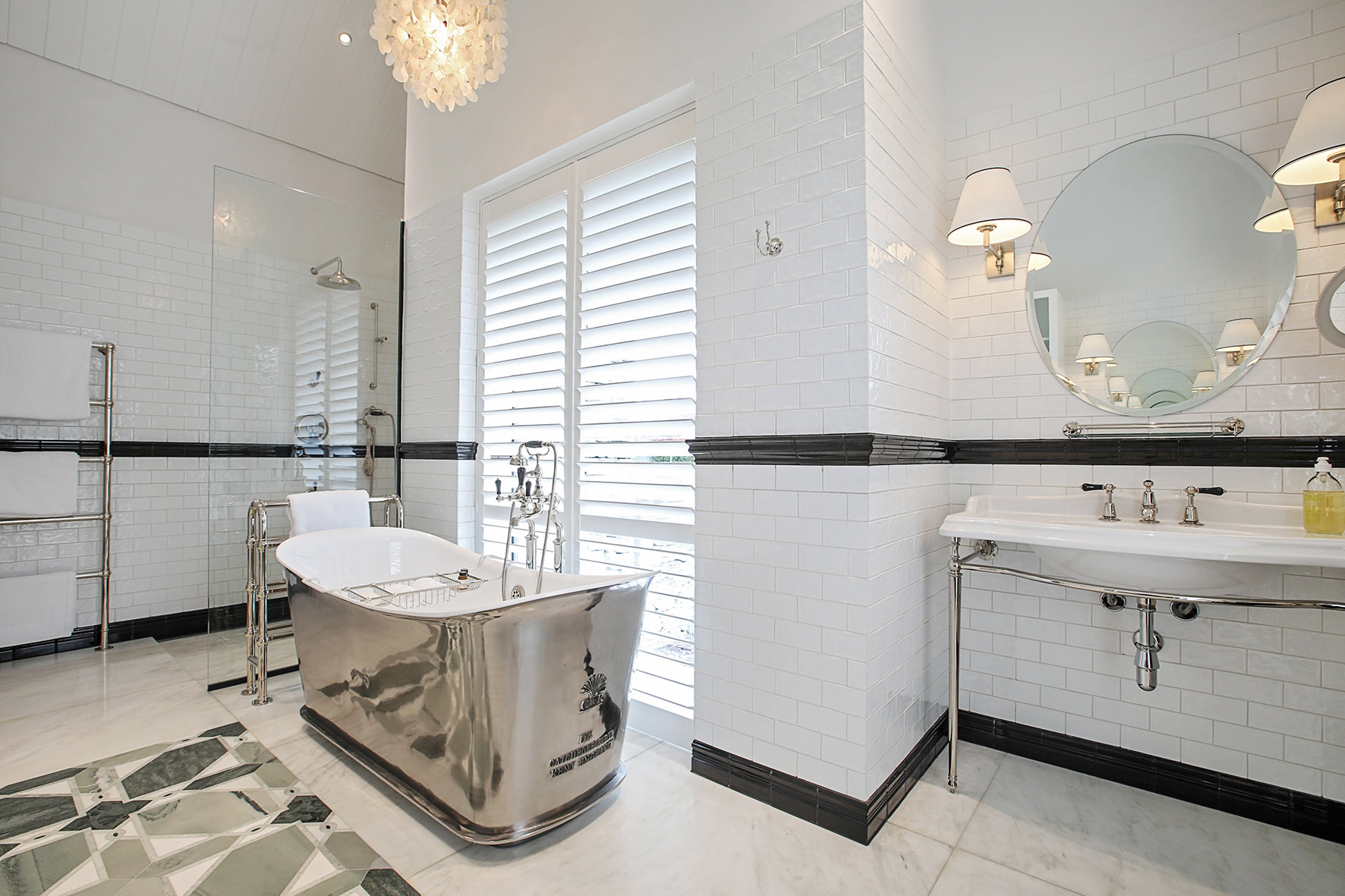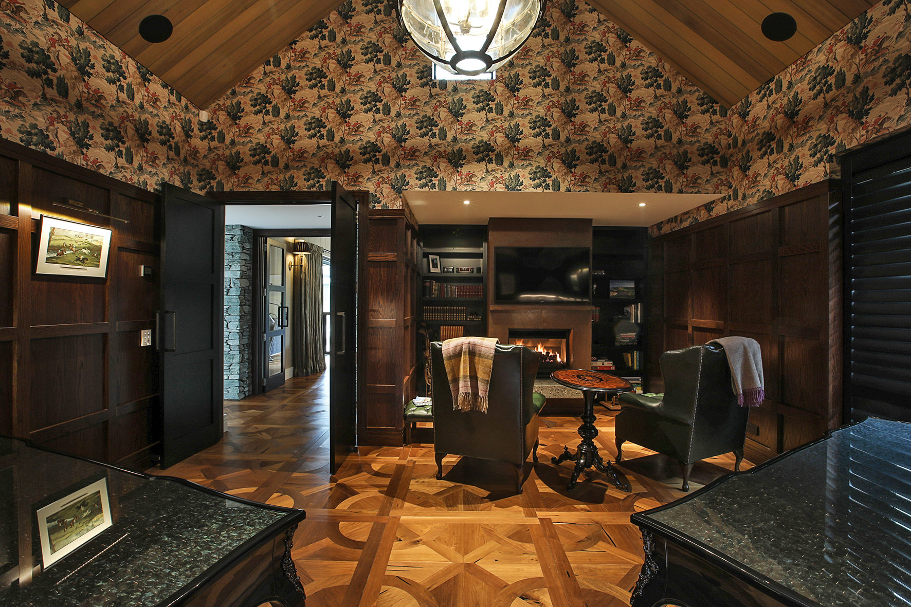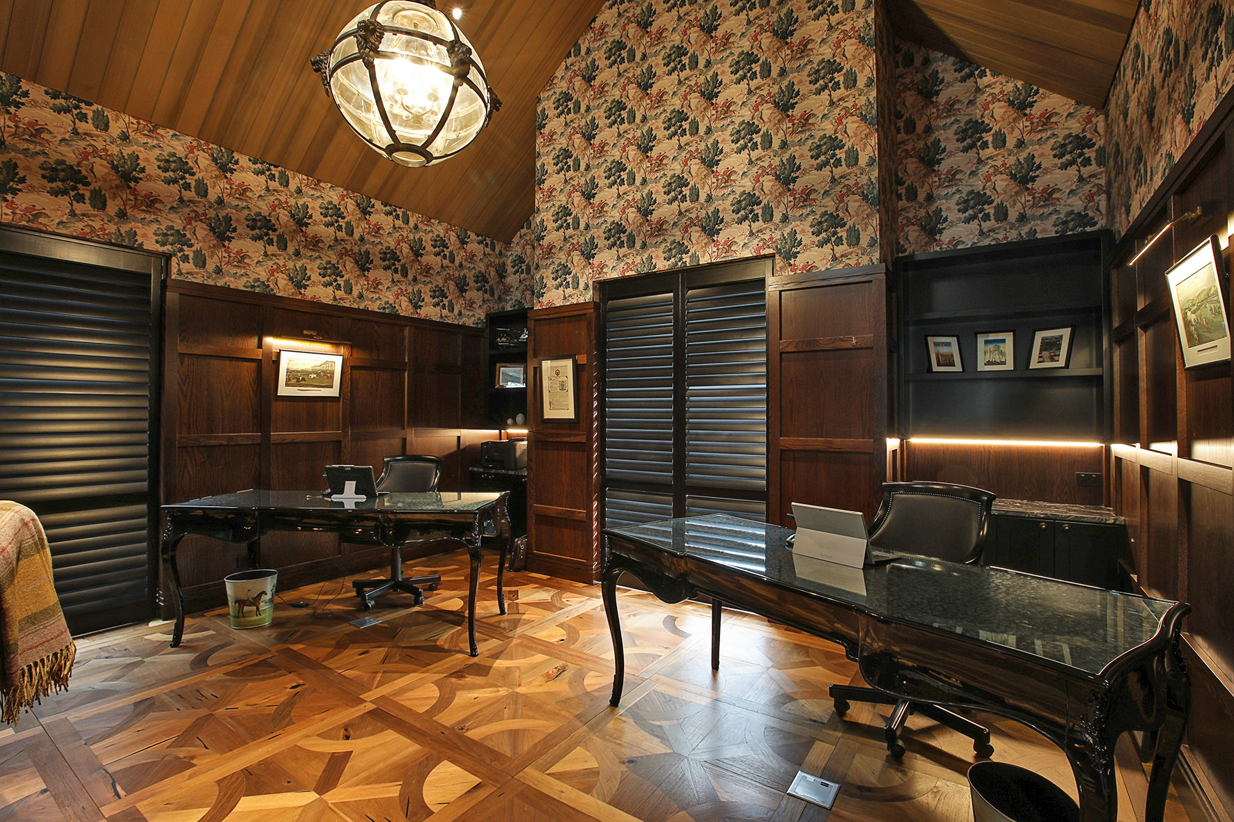 Imported elements, such as wallpapers, Italian marble and light fixtures, English bathroom fittings, and flooring from San Francisco lend this home a worldly feel.