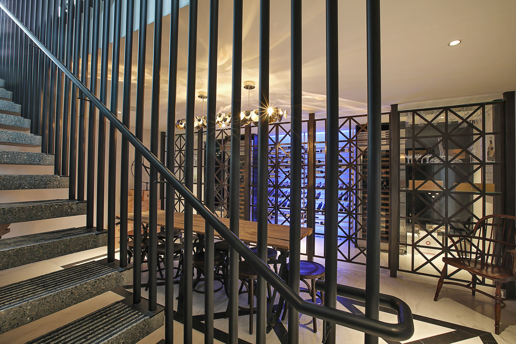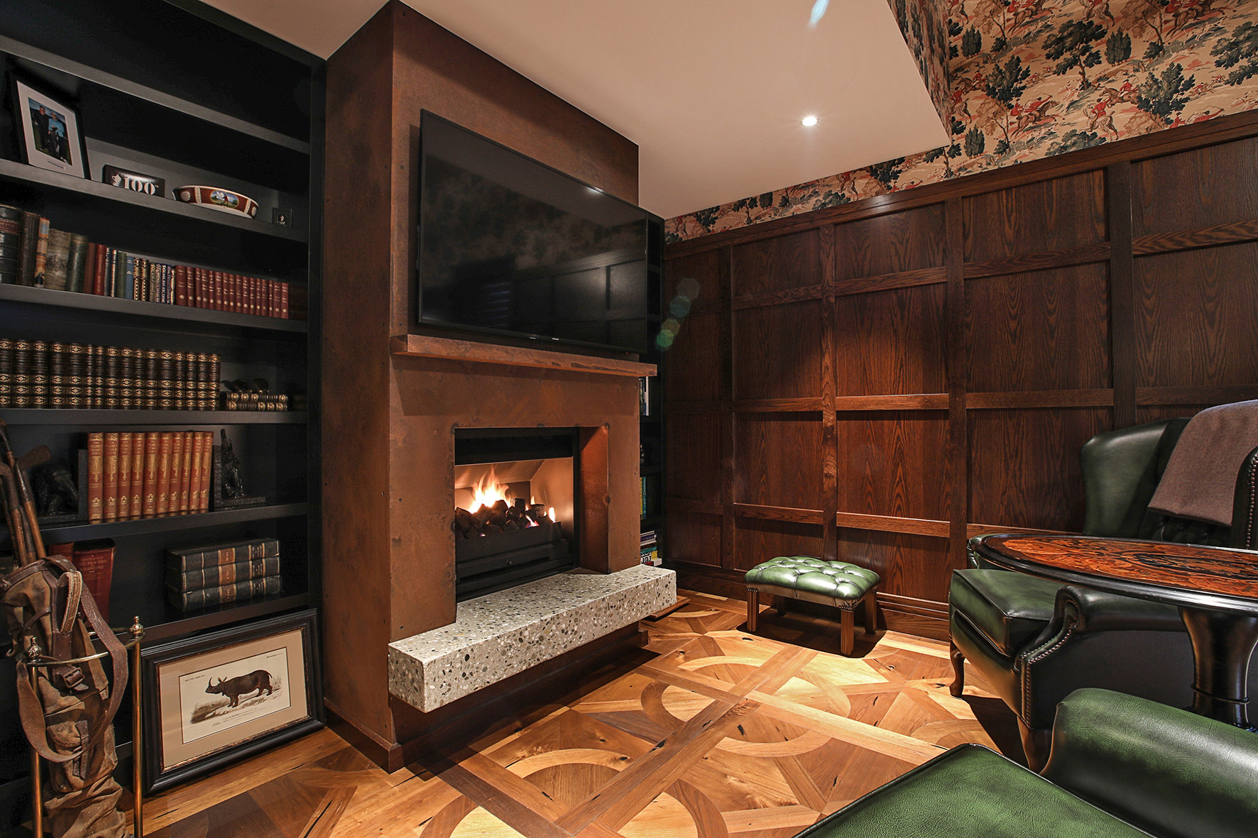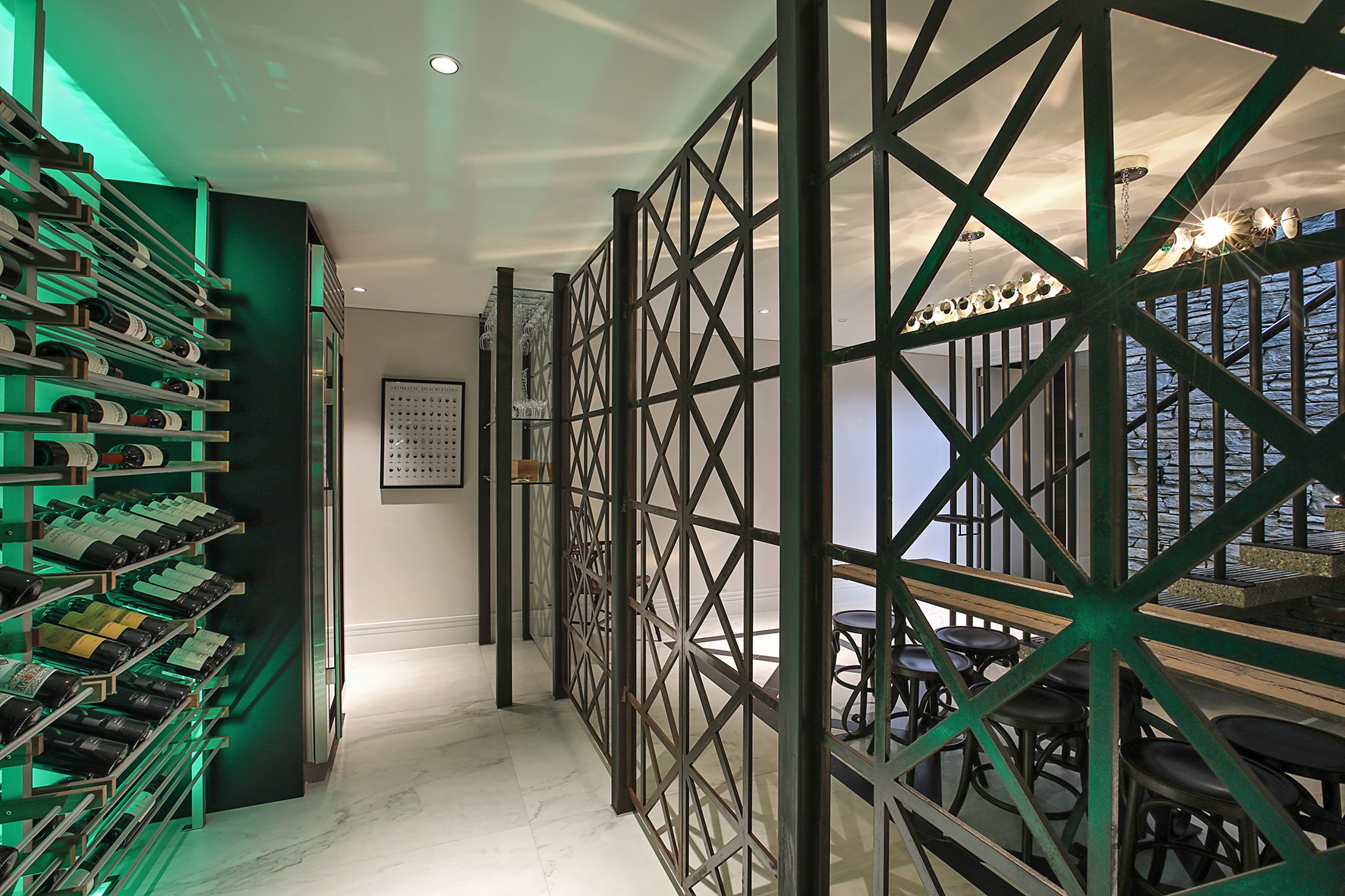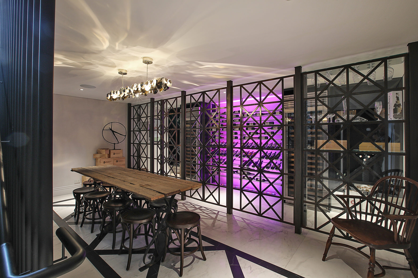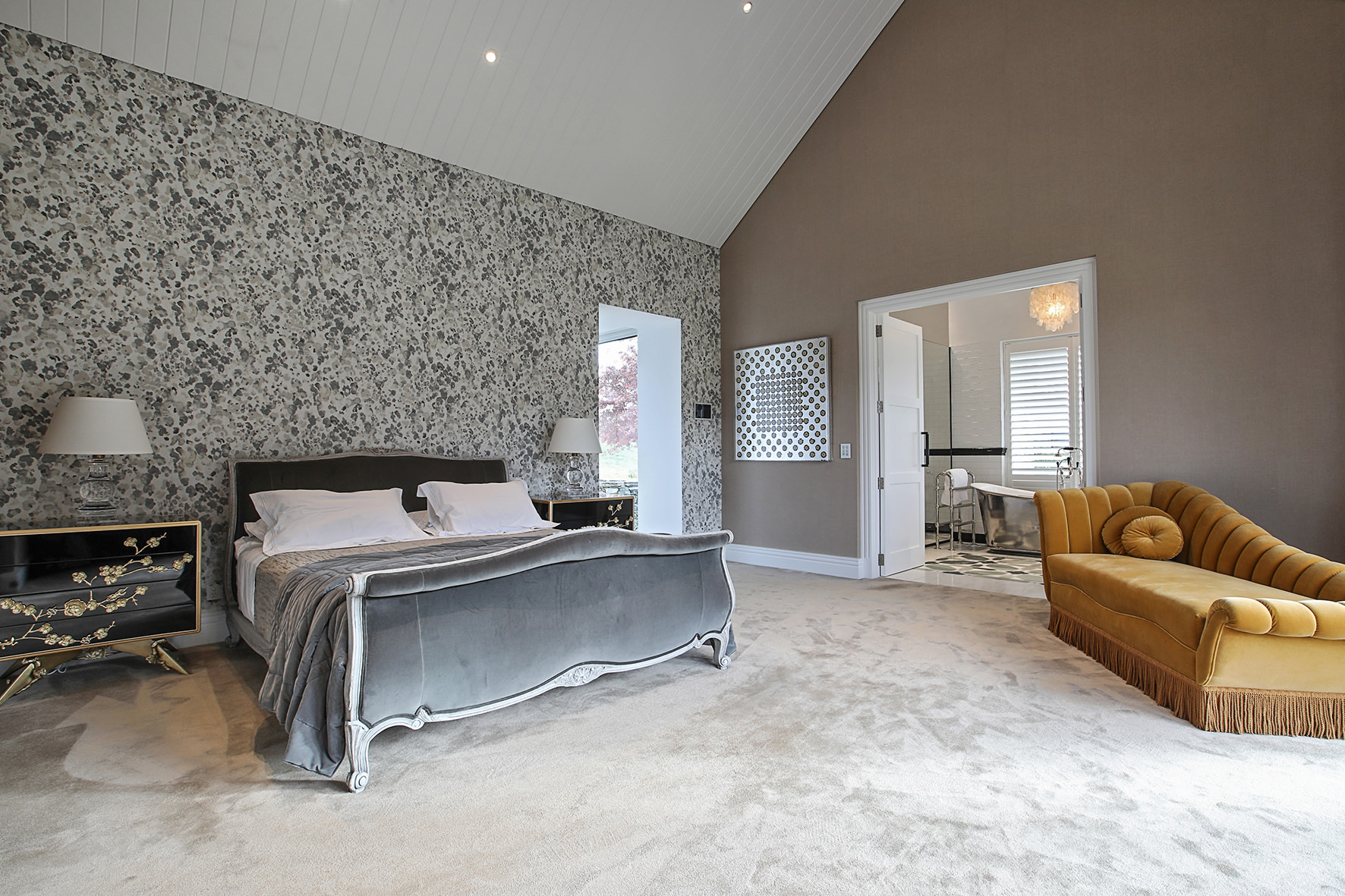 Imported elements, such as wallpapers, Italian marble and light fixtures, English bathroom fittings, and flooring from San Francisco lend this home a worldly feel.
