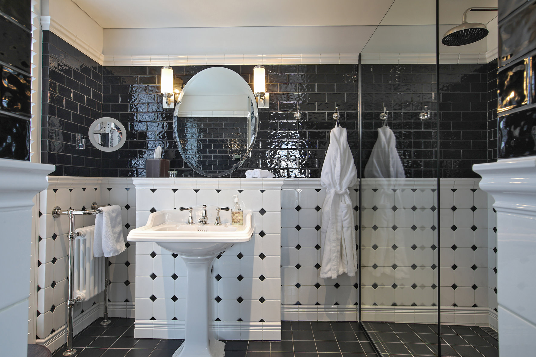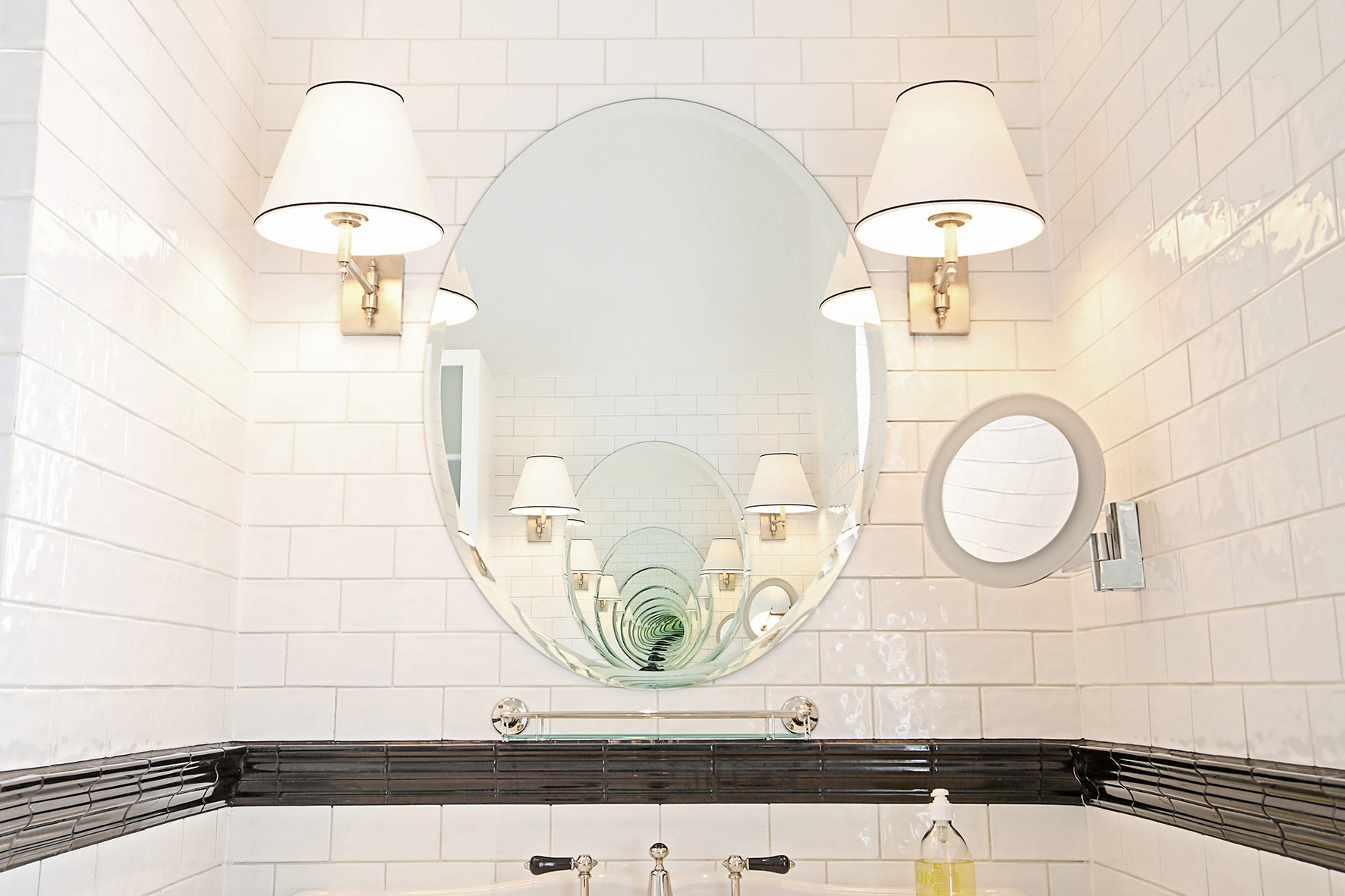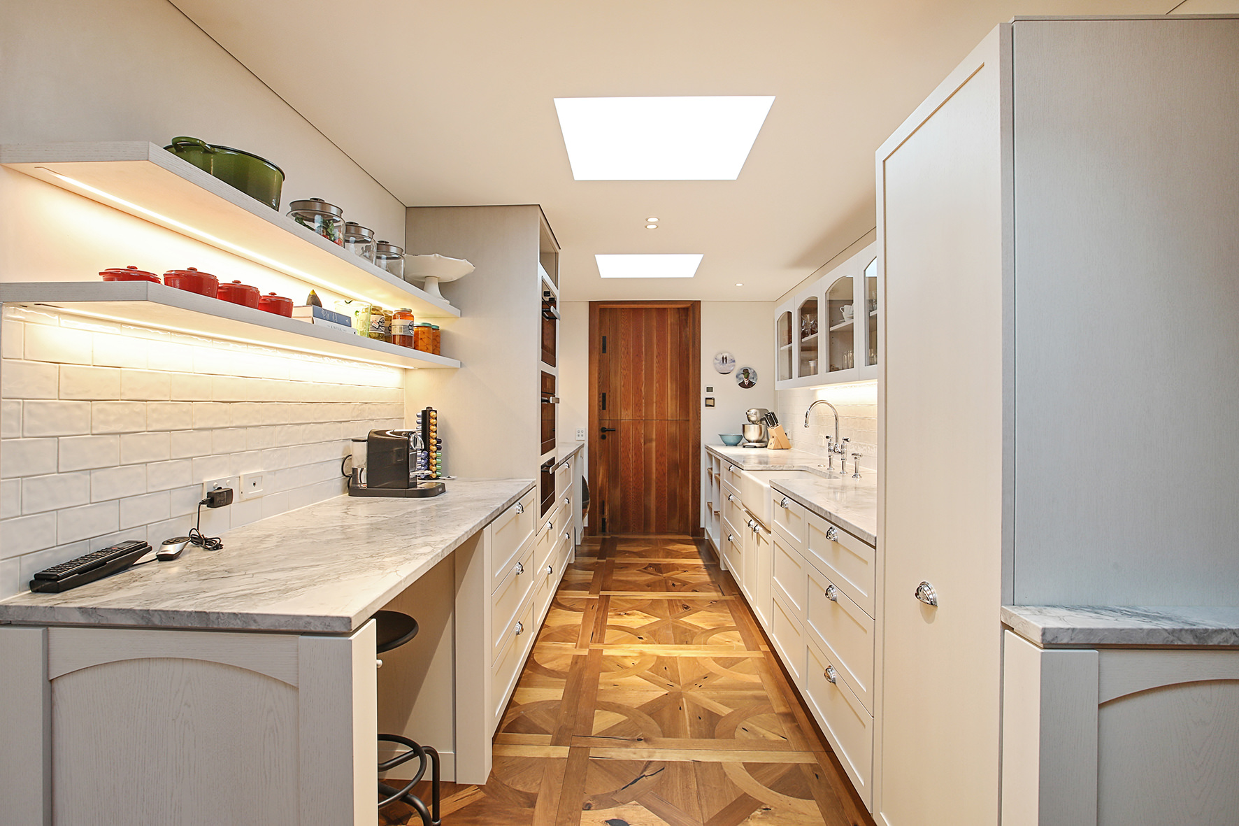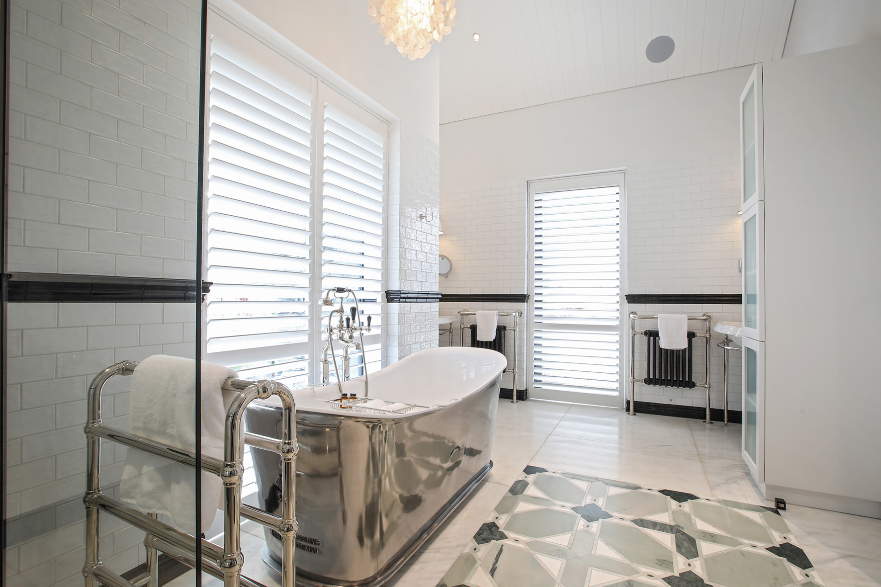 Imported elements, such as wallpapers, Italian marble and light fixtures, English bathroom fittings, and flooring from San Francisco lend this home a worldly feel.