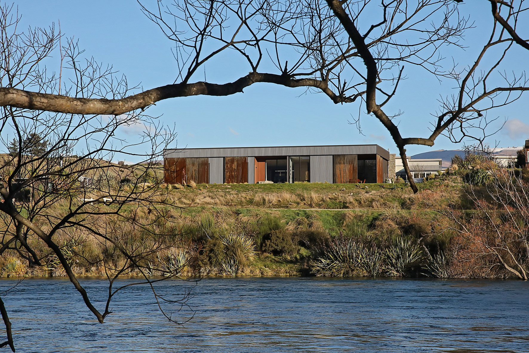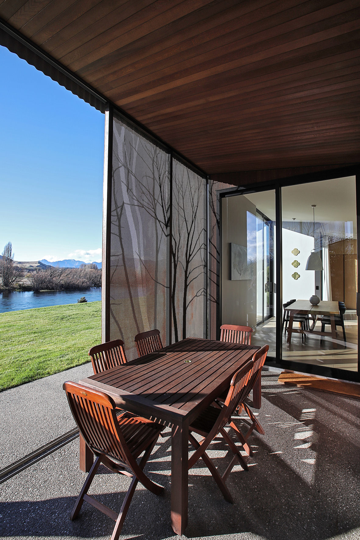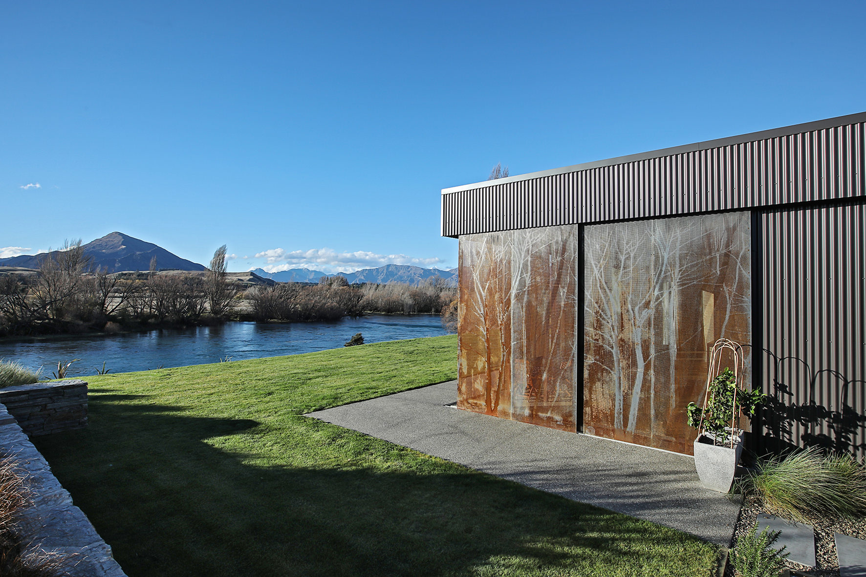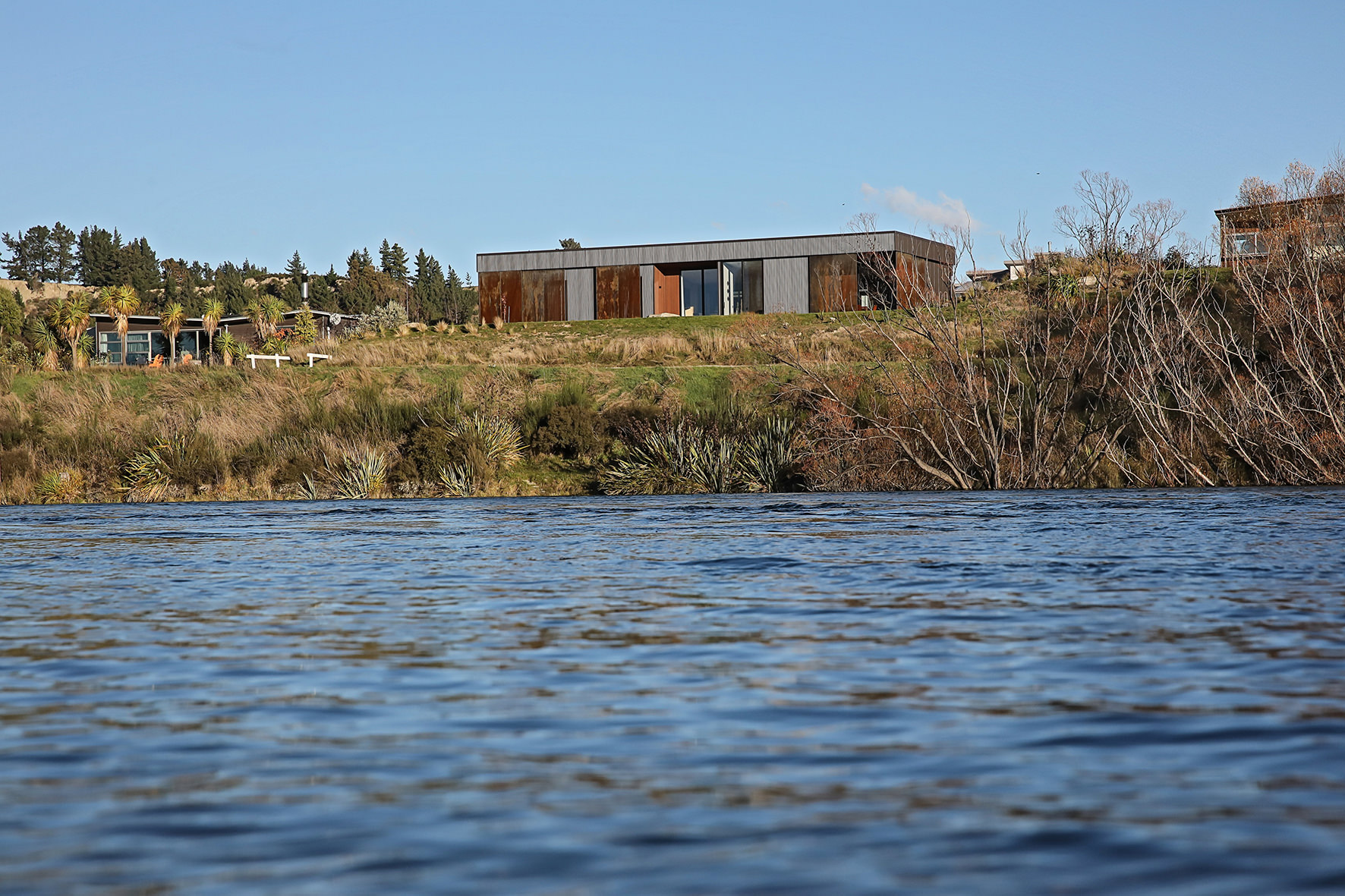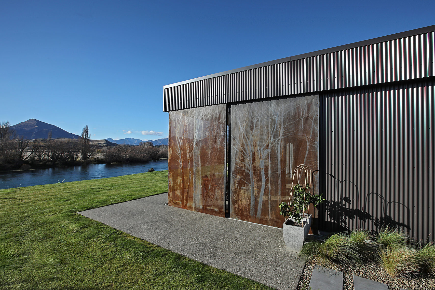 Reclining by a river-front, this architecturally designed residence is resplendent in vertical cedar and sliding steel feature panels. Large windows and doors make the most of the views. The bespoke panel doors offer additional privacy when desired.