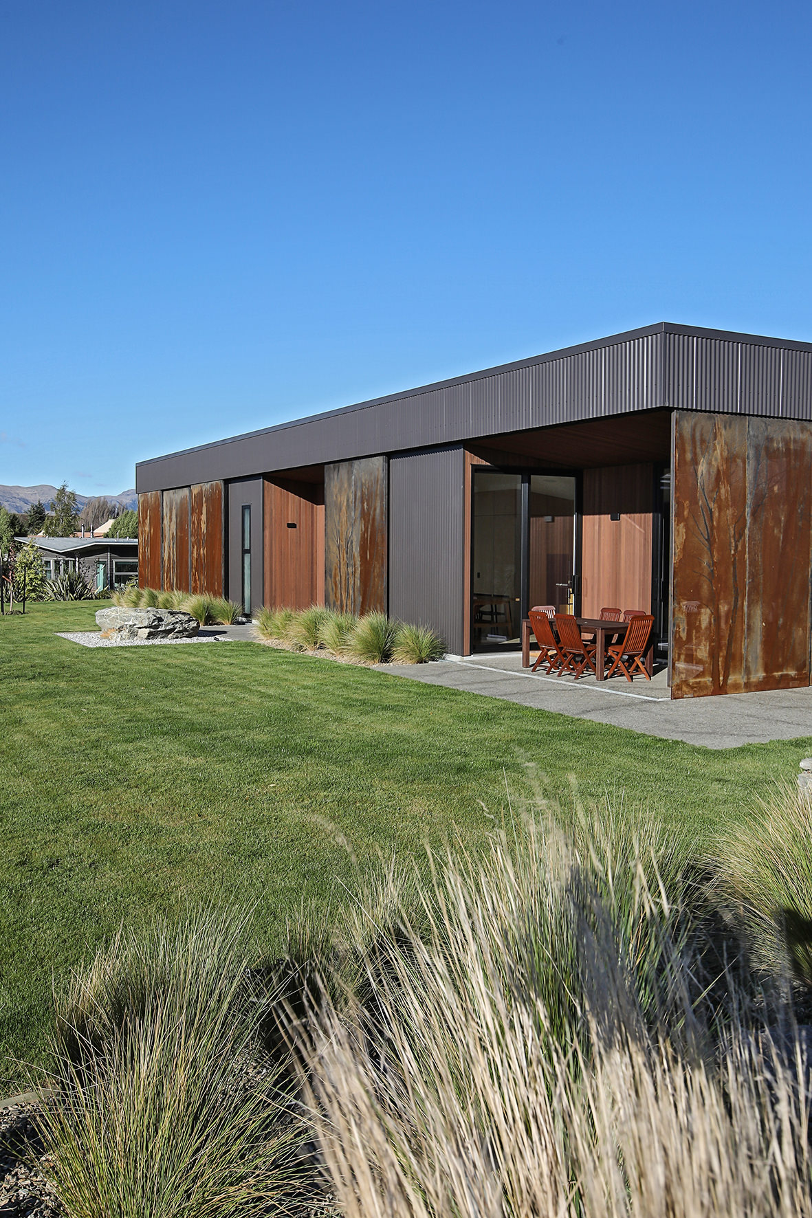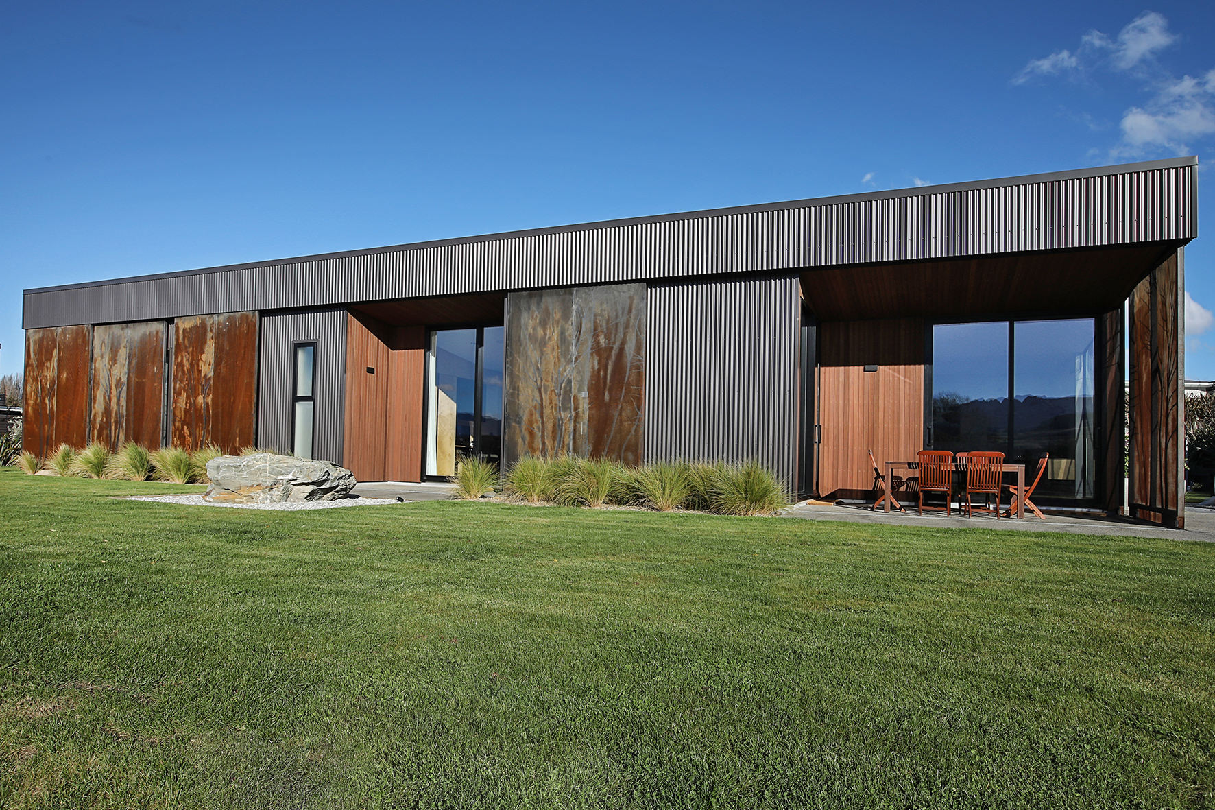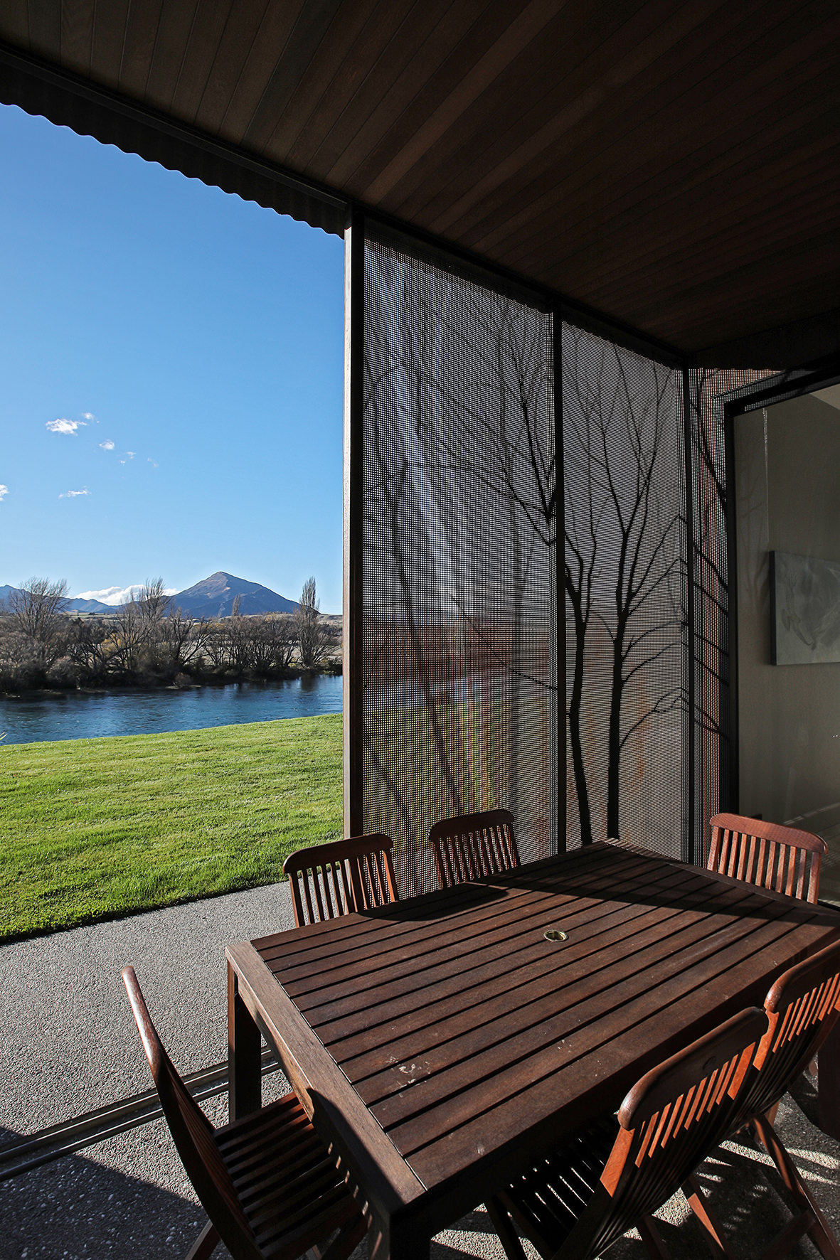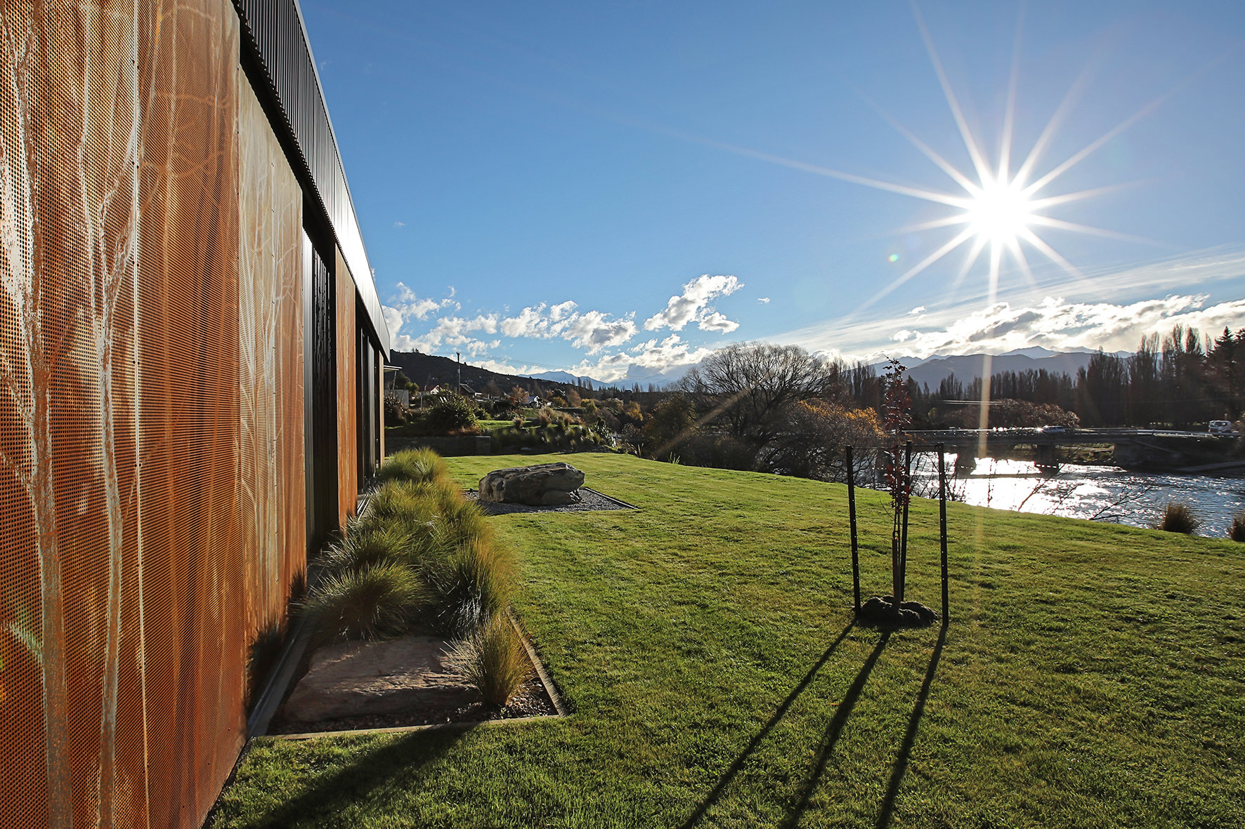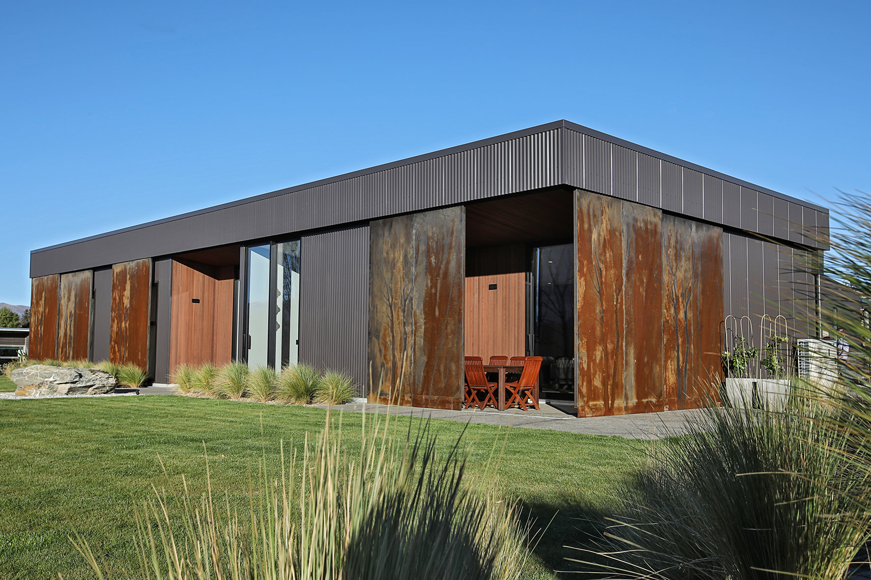 Reclining by a river-front, this architecturally designed residence is resplendent in vertical cedar and sliding steel feature panels. Large windows and doors make the most of the views. The bespoke panel doors offer additional privacy when desired.