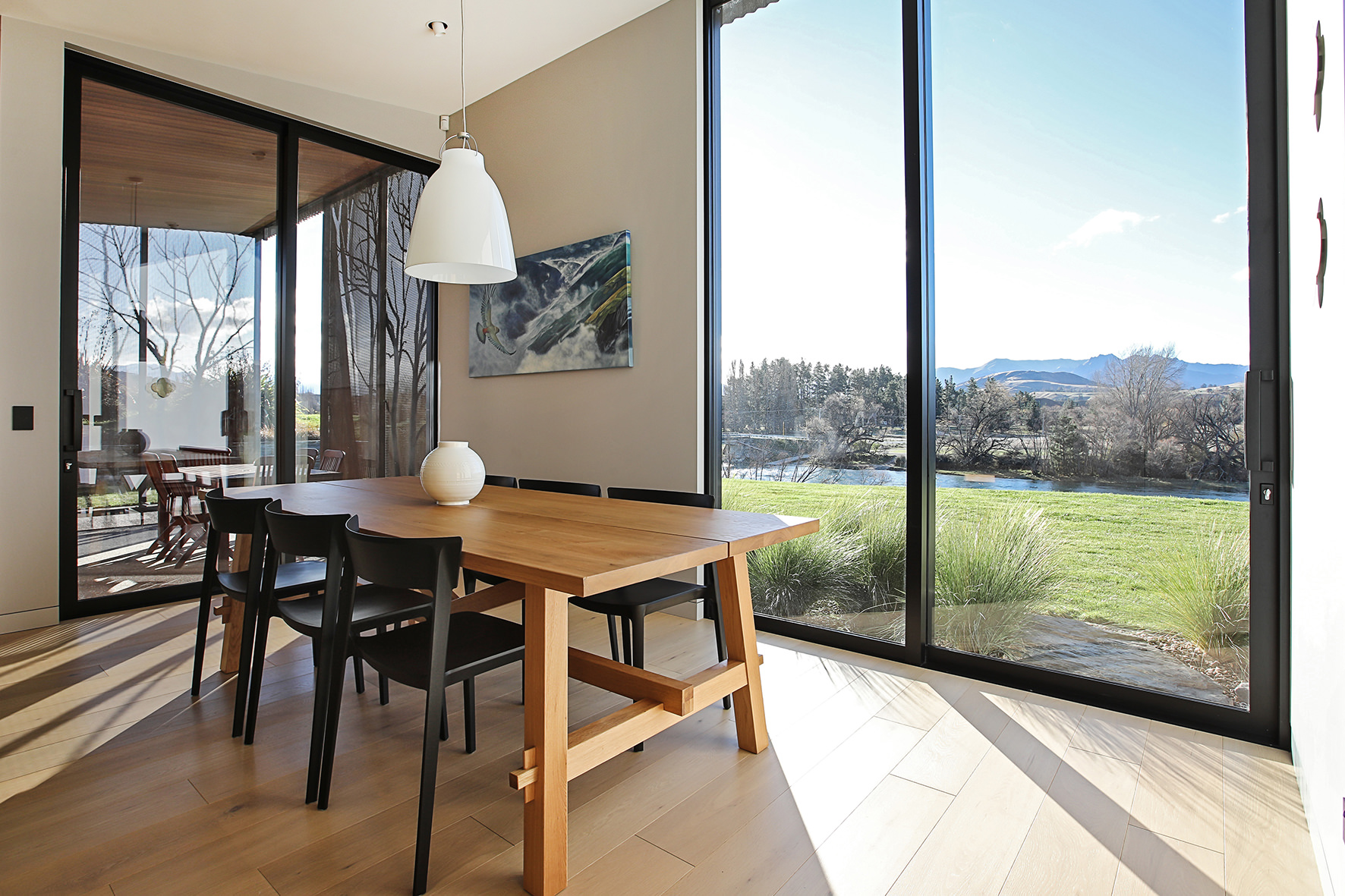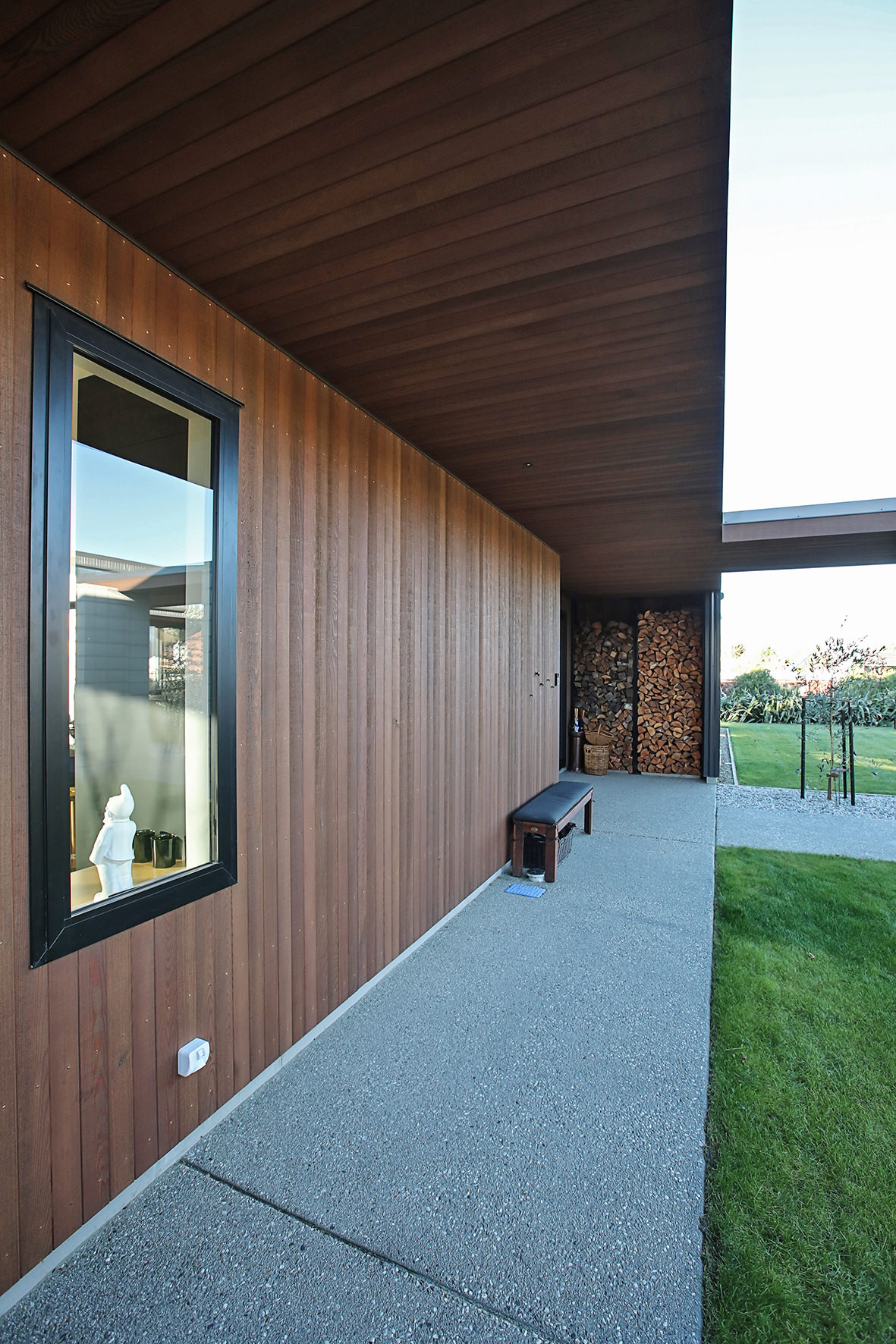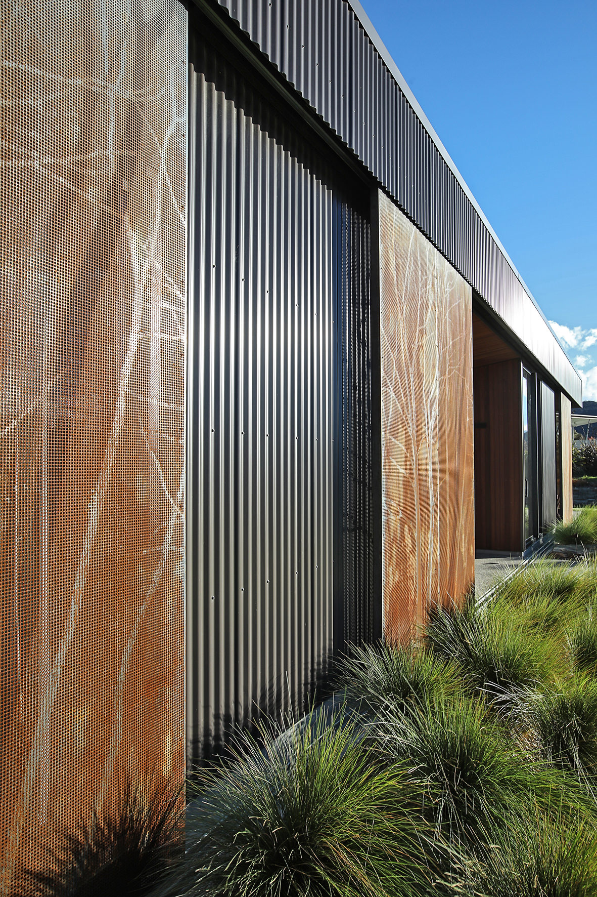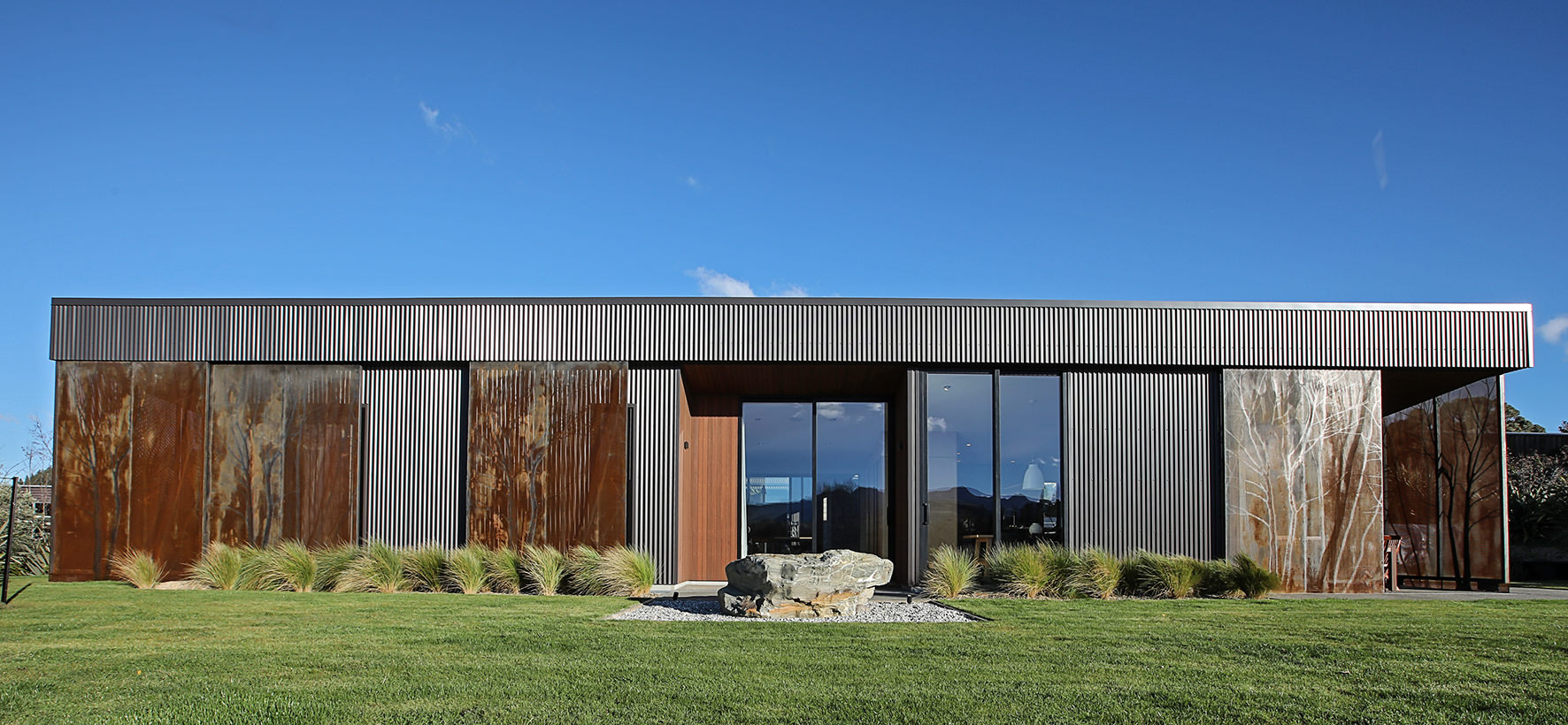 Reclining by a river-front, this architecturally designed residence is resplendent in vertical cedar and sliding steel feature panels. Large windows and doors make the most of the views. The bespoke panel doors offer additional privacy when desired.