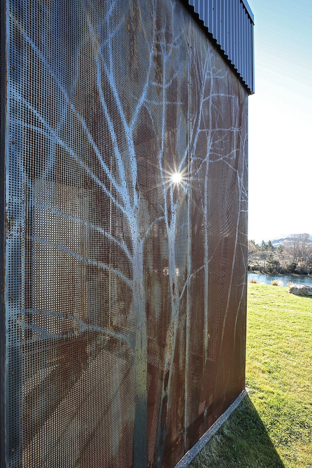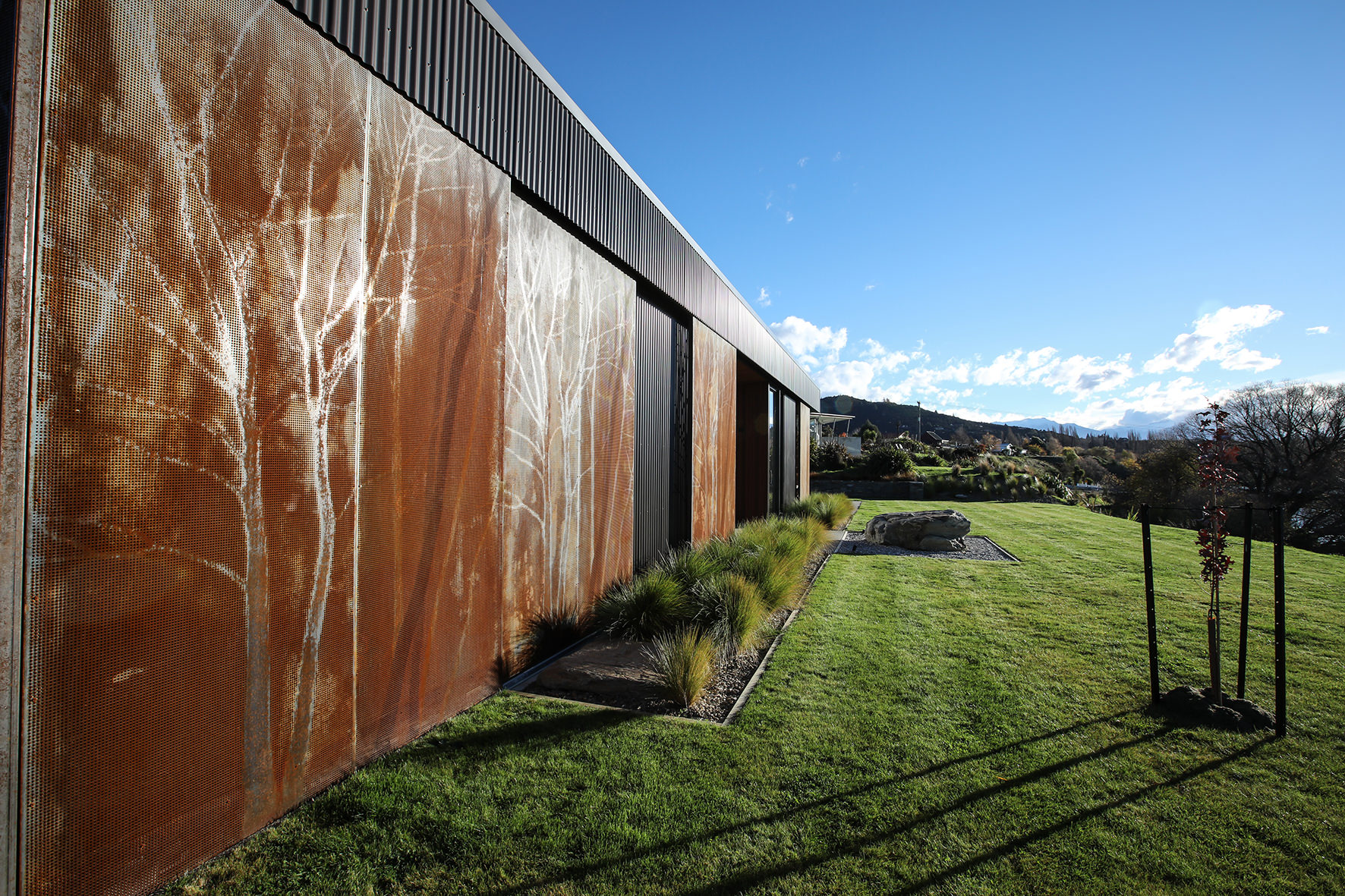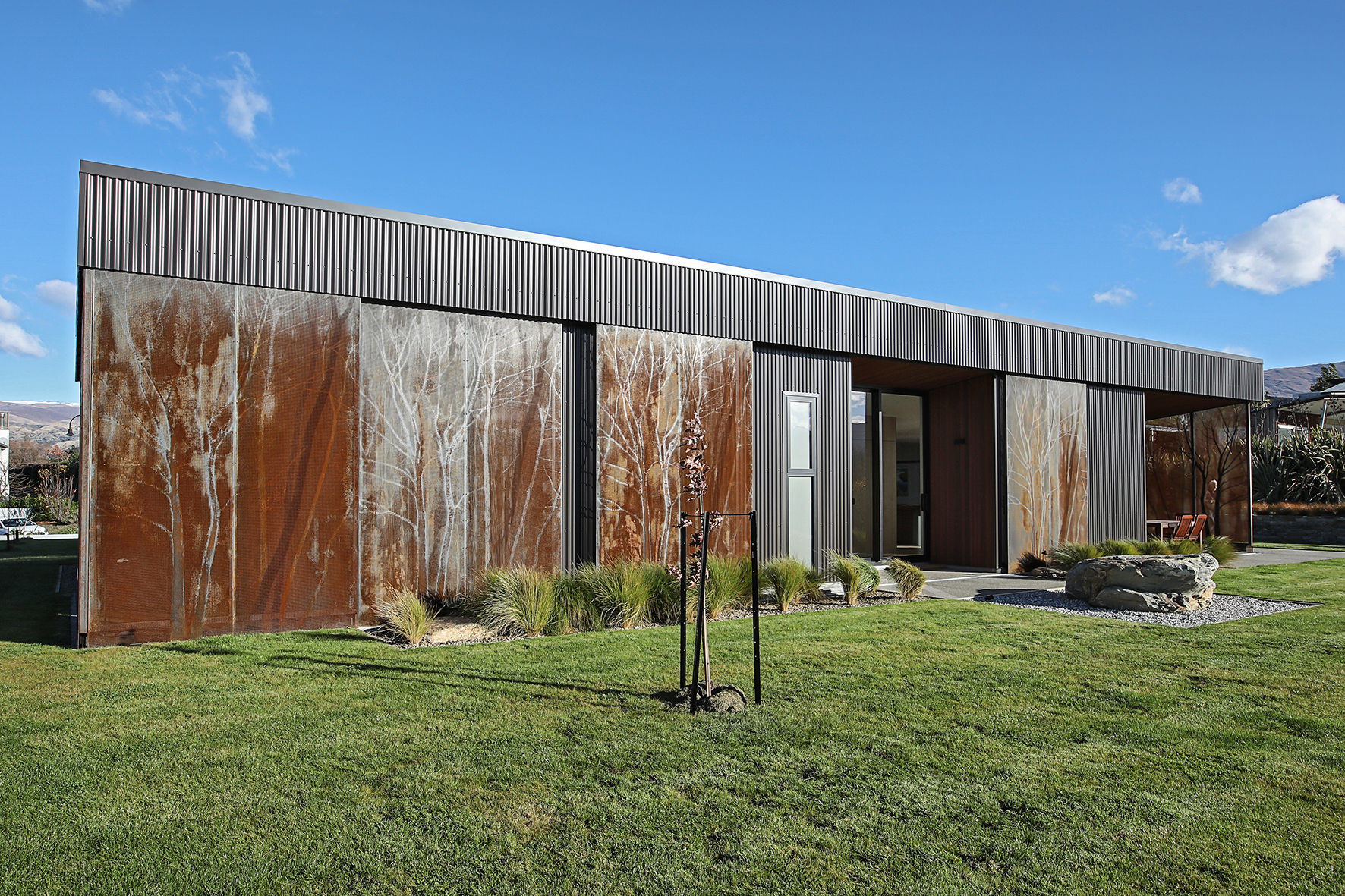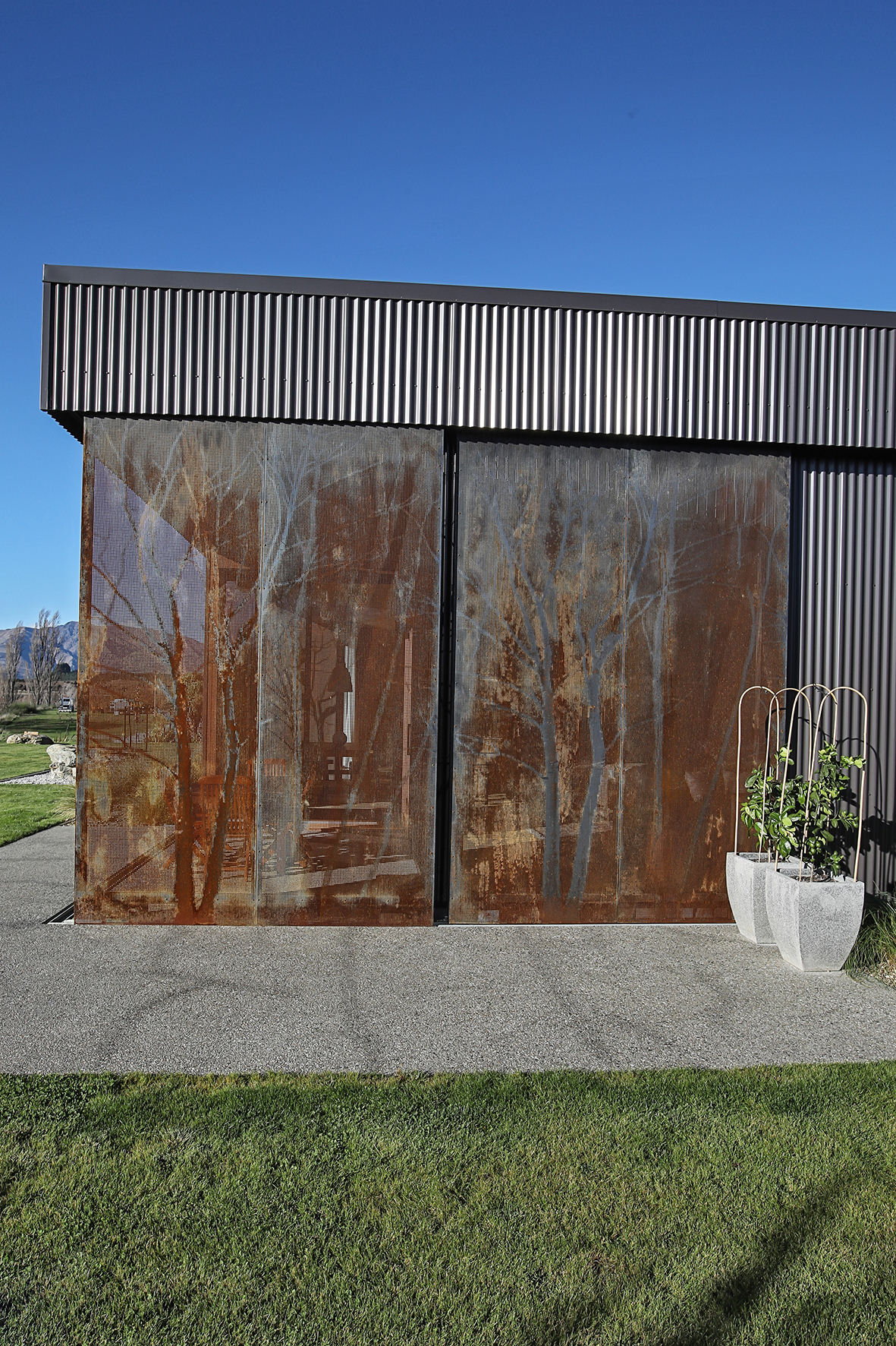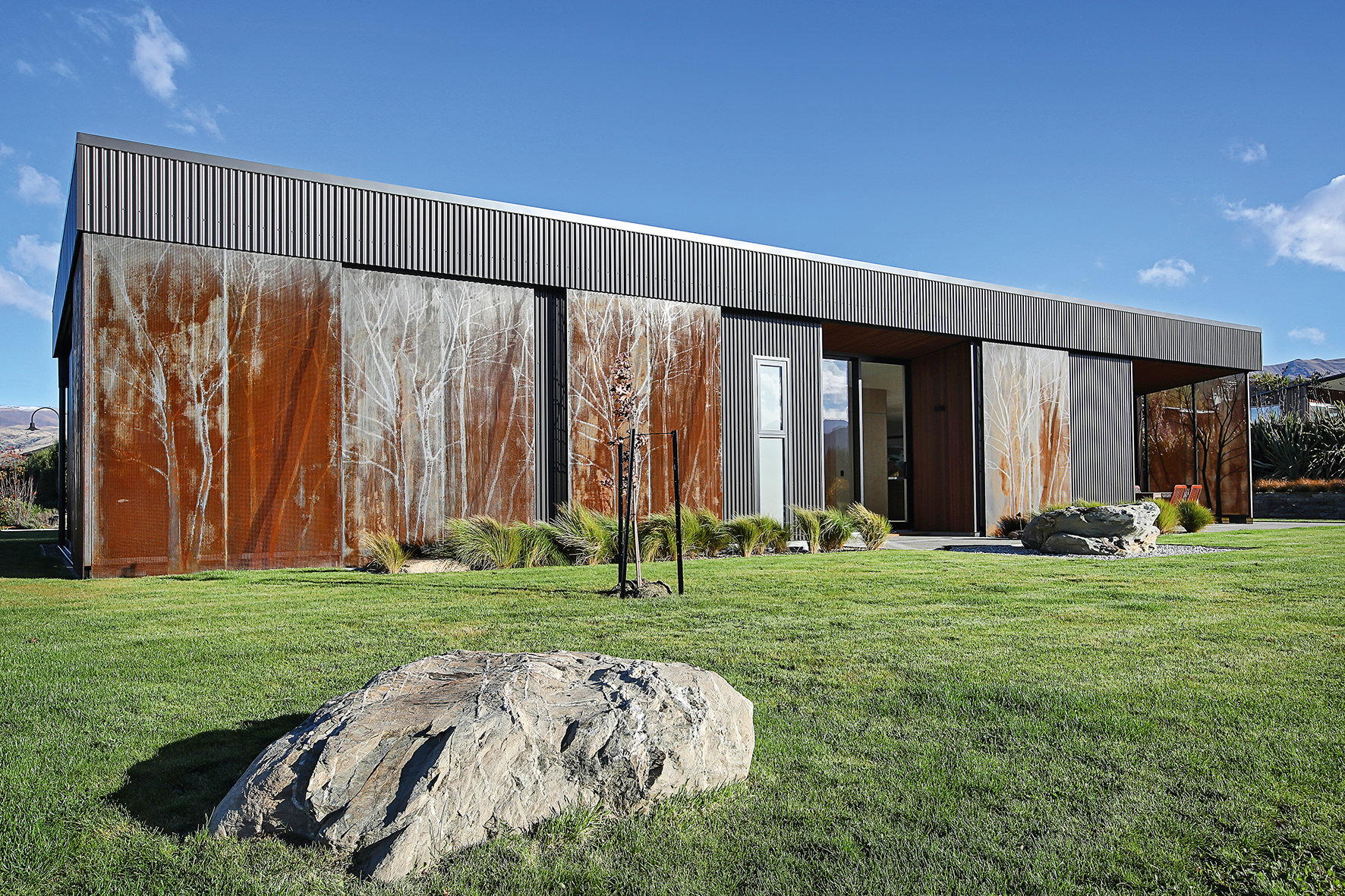 Reclining by a river-front, this architecturally designed residence is resplendent in vertical cedar and sliding steel feature panels. Large windows and doors make the most of the views. The bespoke panel doors offer additional privacy when desired.
