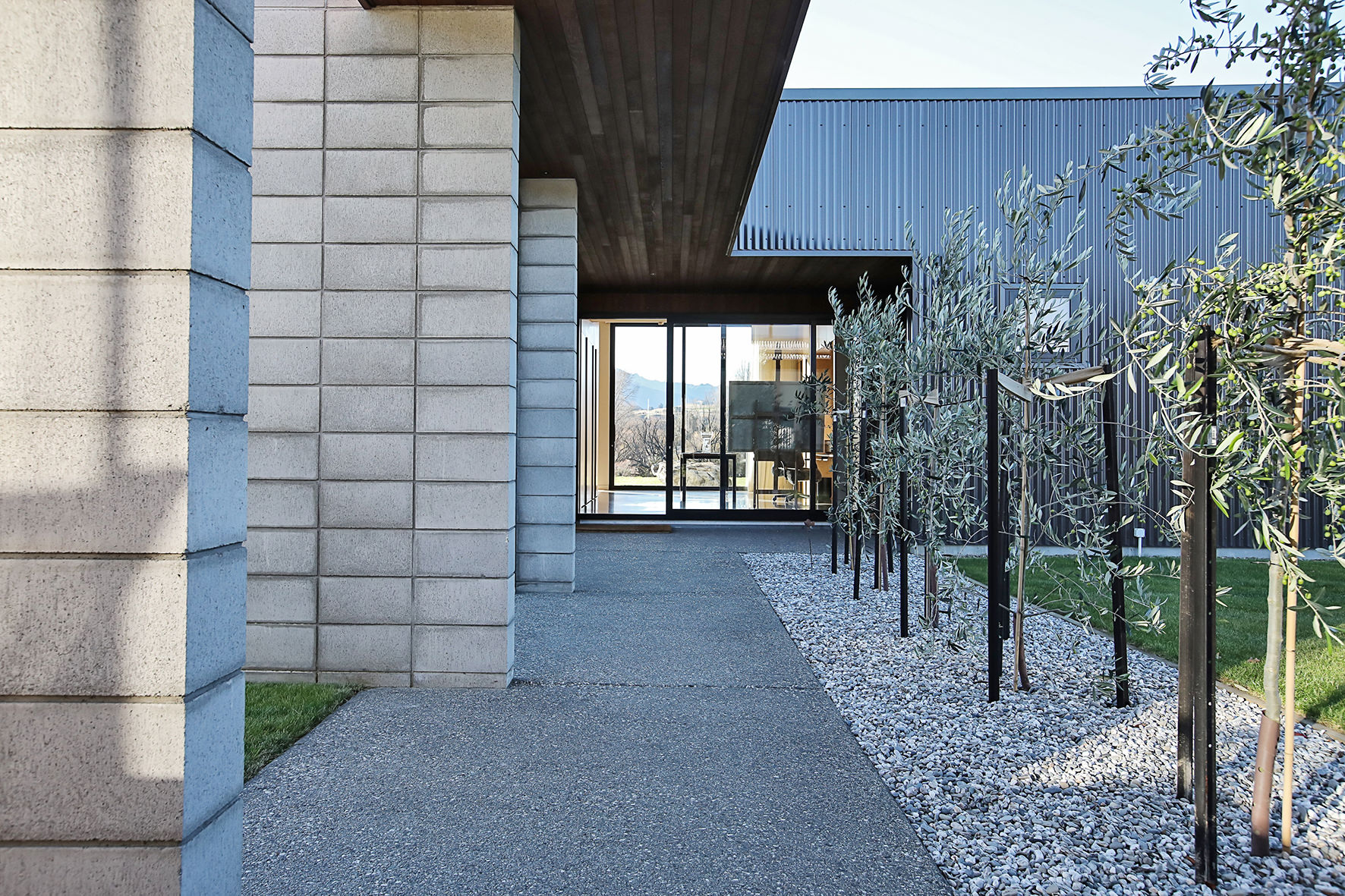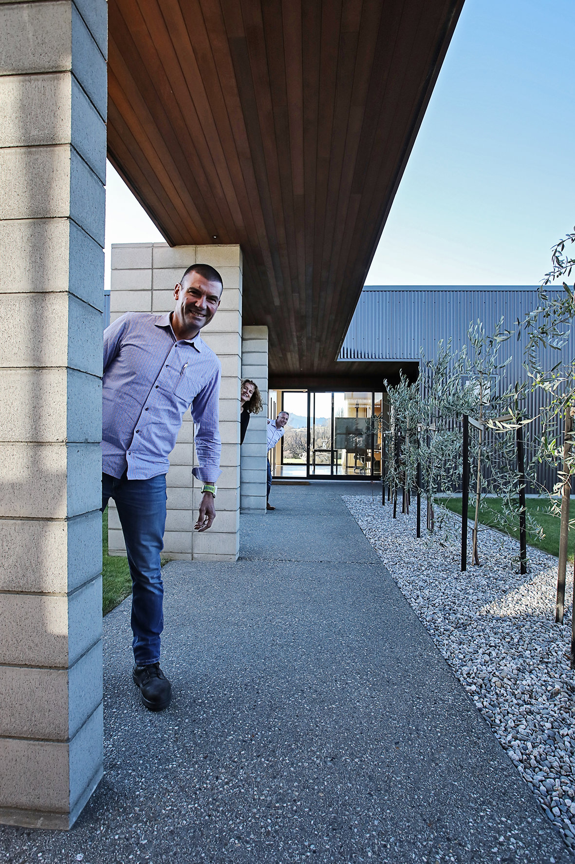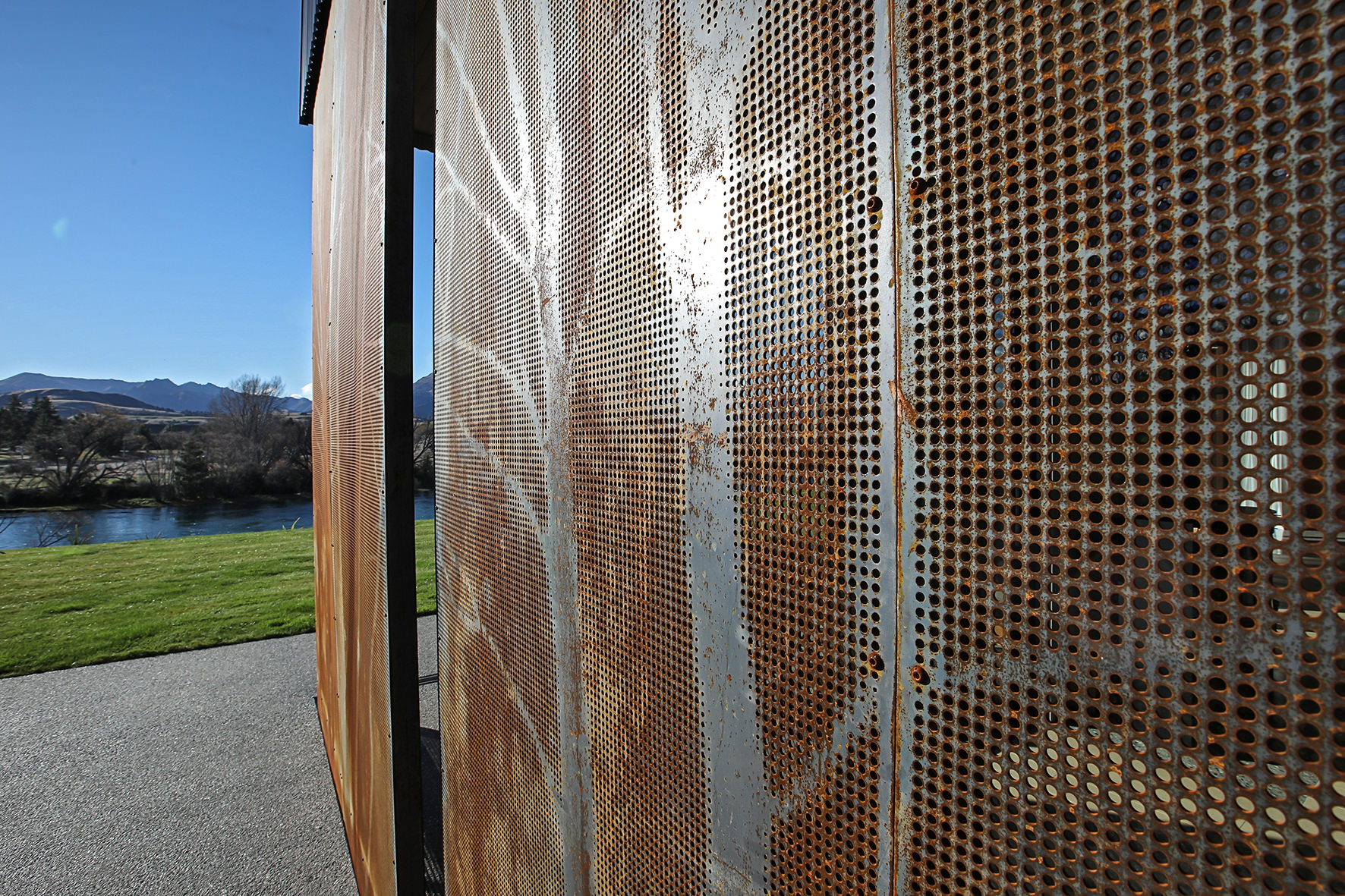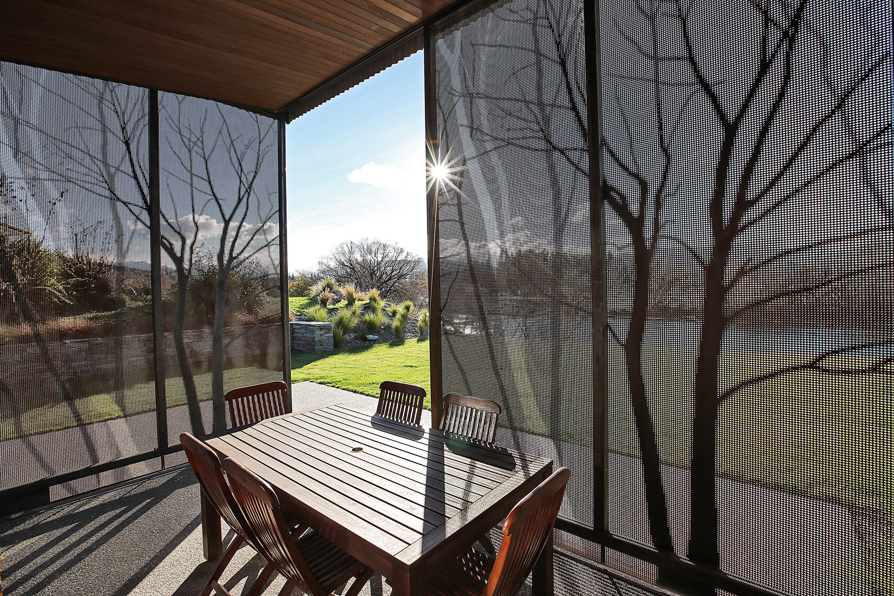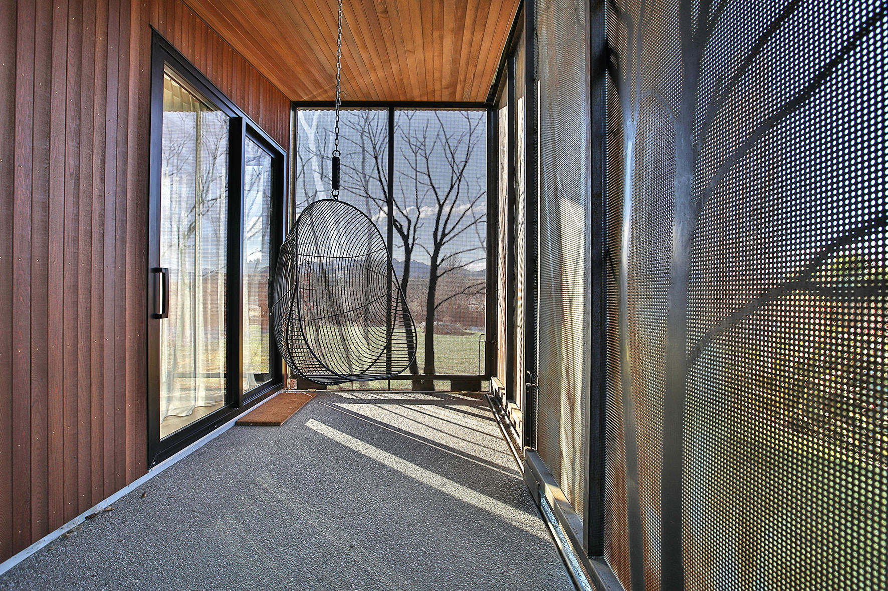 Reclining by a river-front, this architecturally designed residence is resplendent in vertical cedar and sliding steel feature panels. Large windows and doors make the most of the views. The bespoke panel doors offer additional privacy when desired.