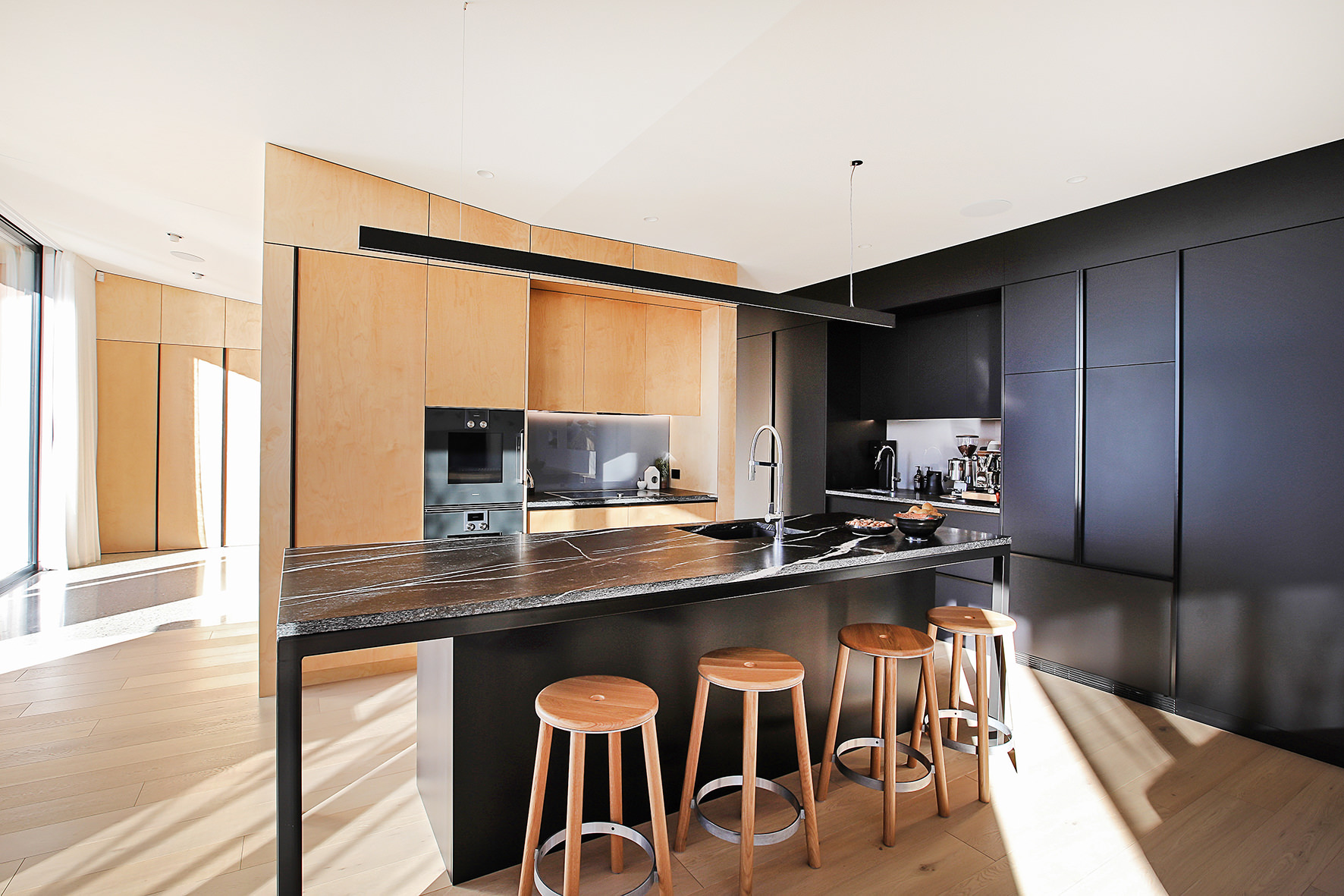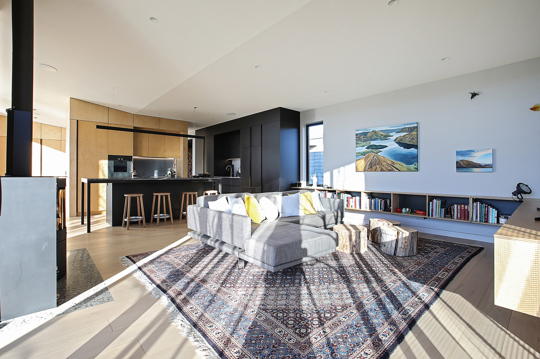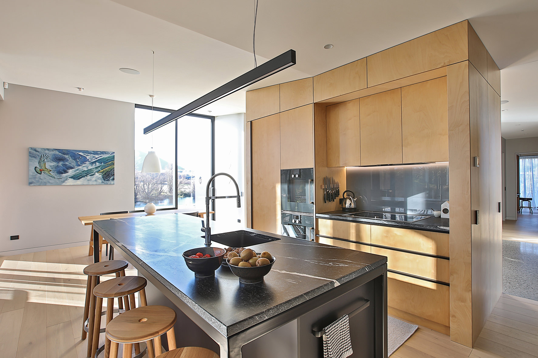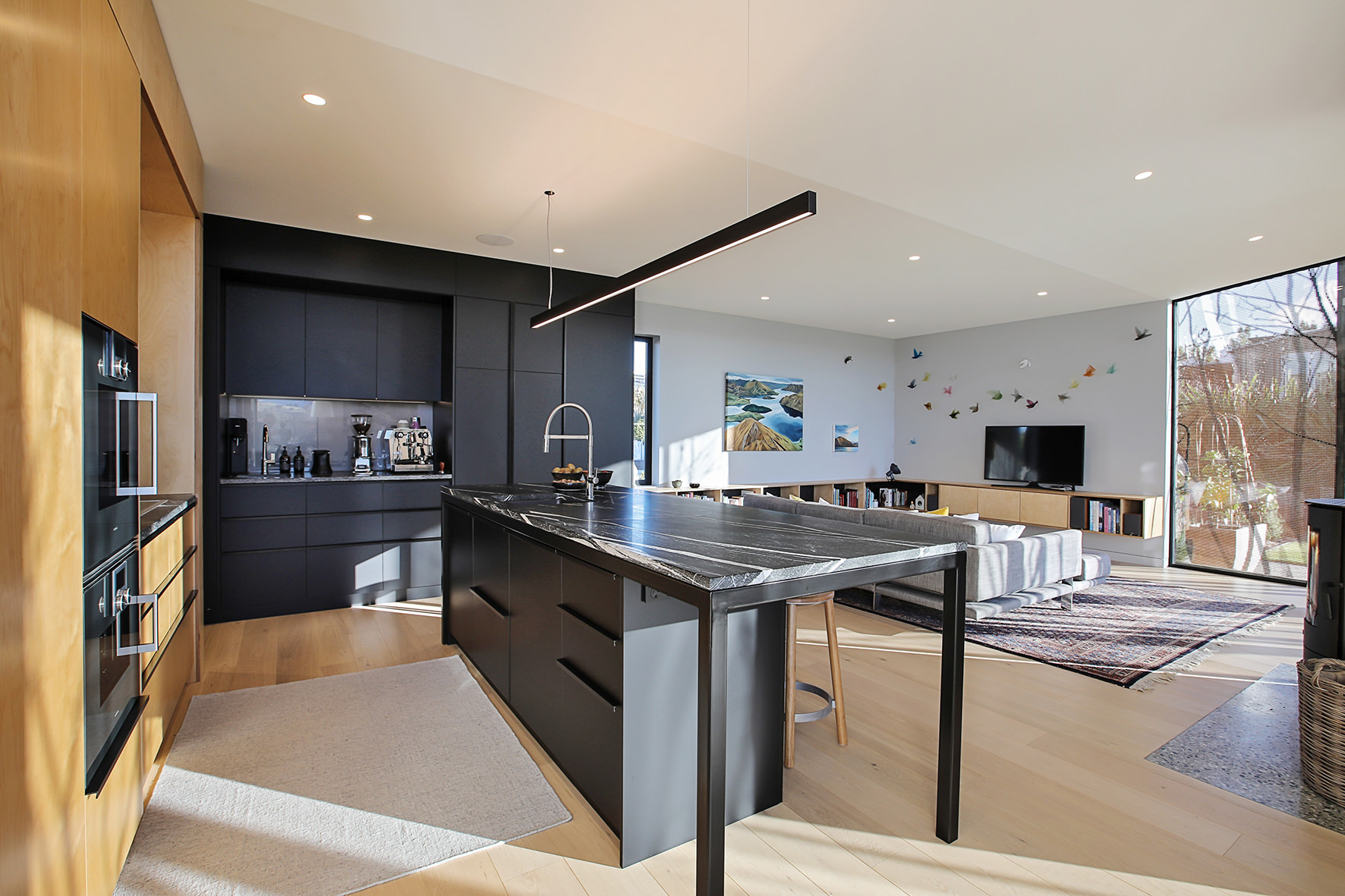 Timber floors through the living areas and bedrooms are supplemented with polished concrete floors in the entry/art space. The high ceiling draws light into the smartly designed kitchen, the hub of the home.