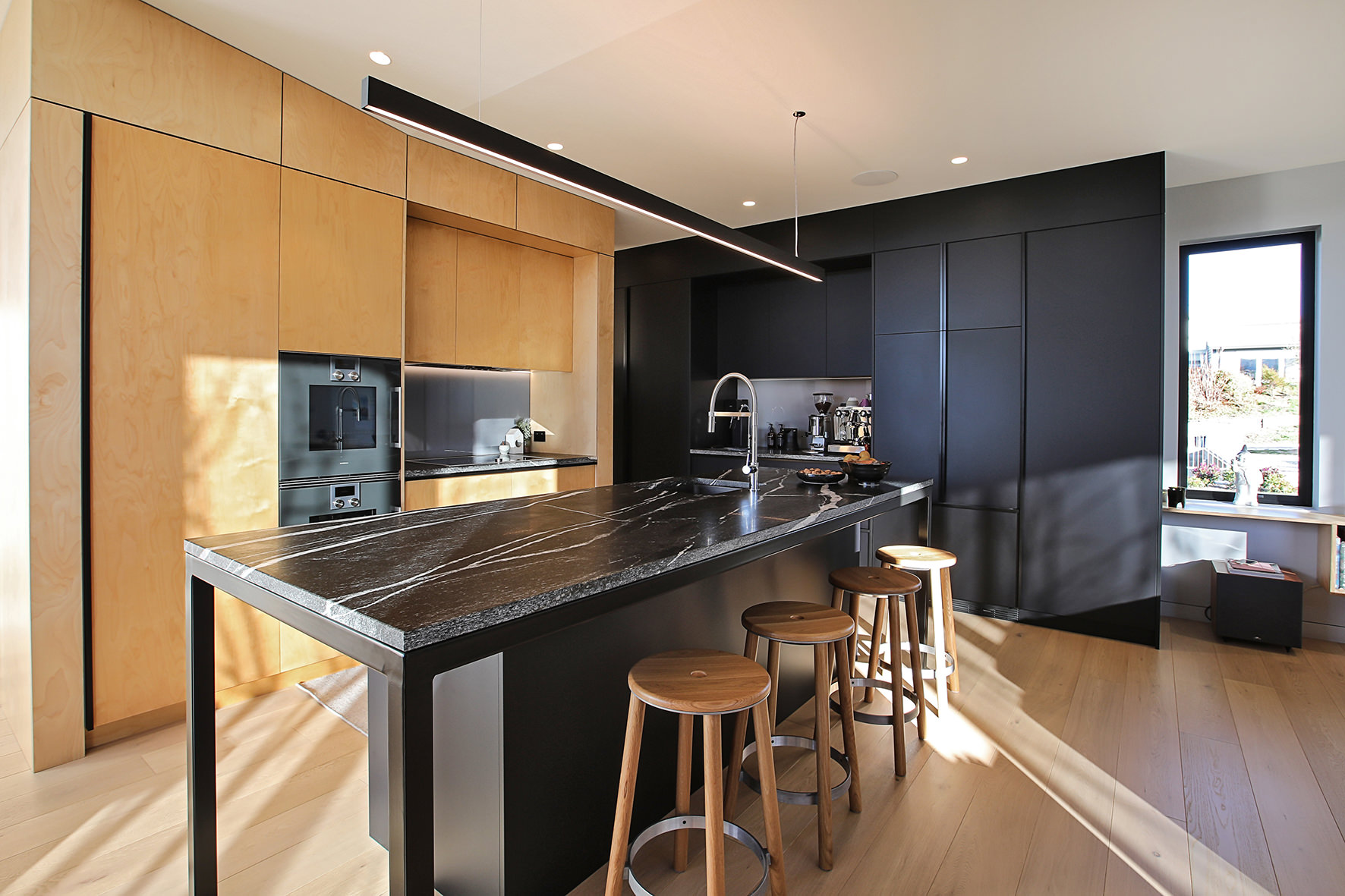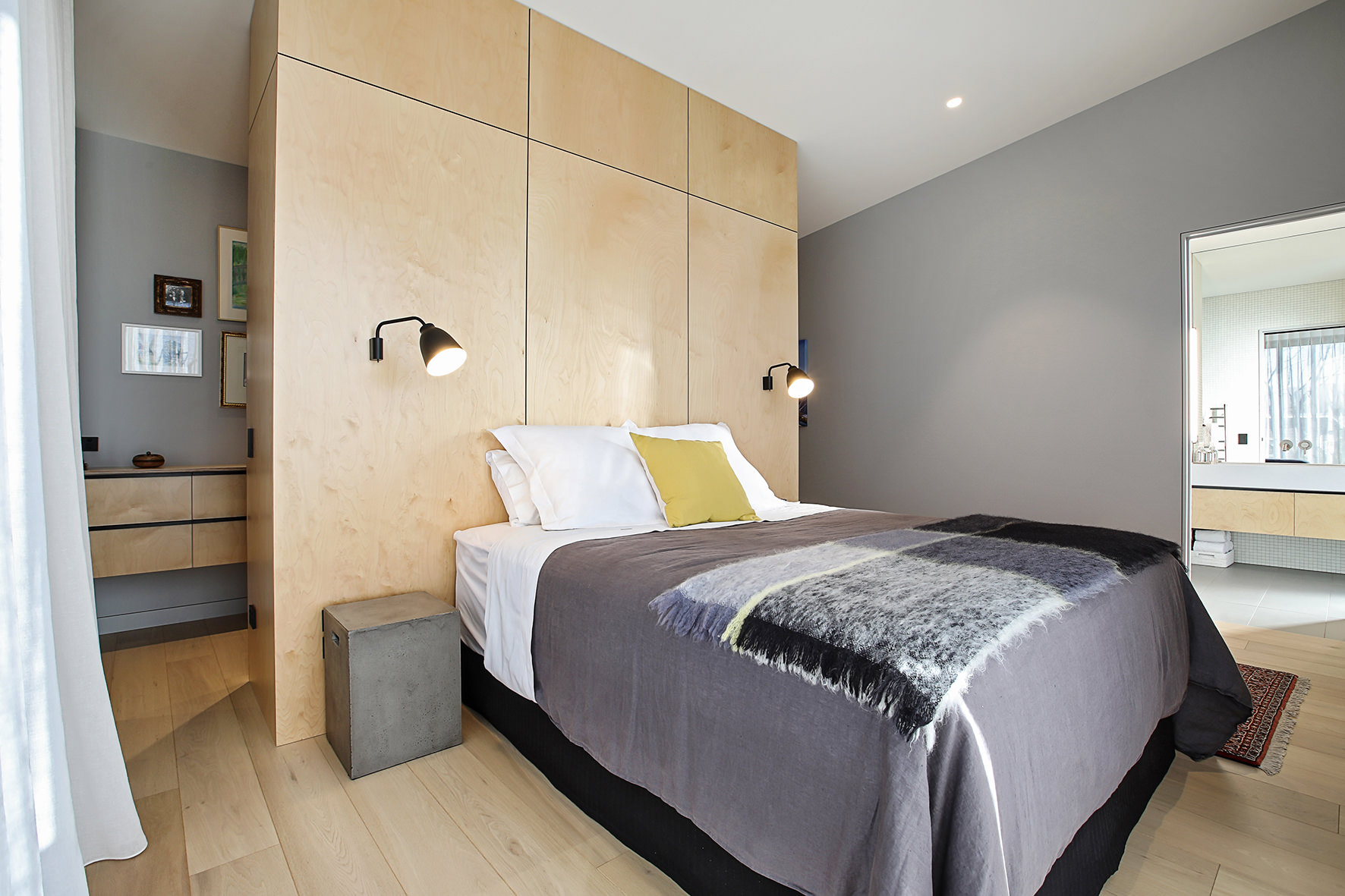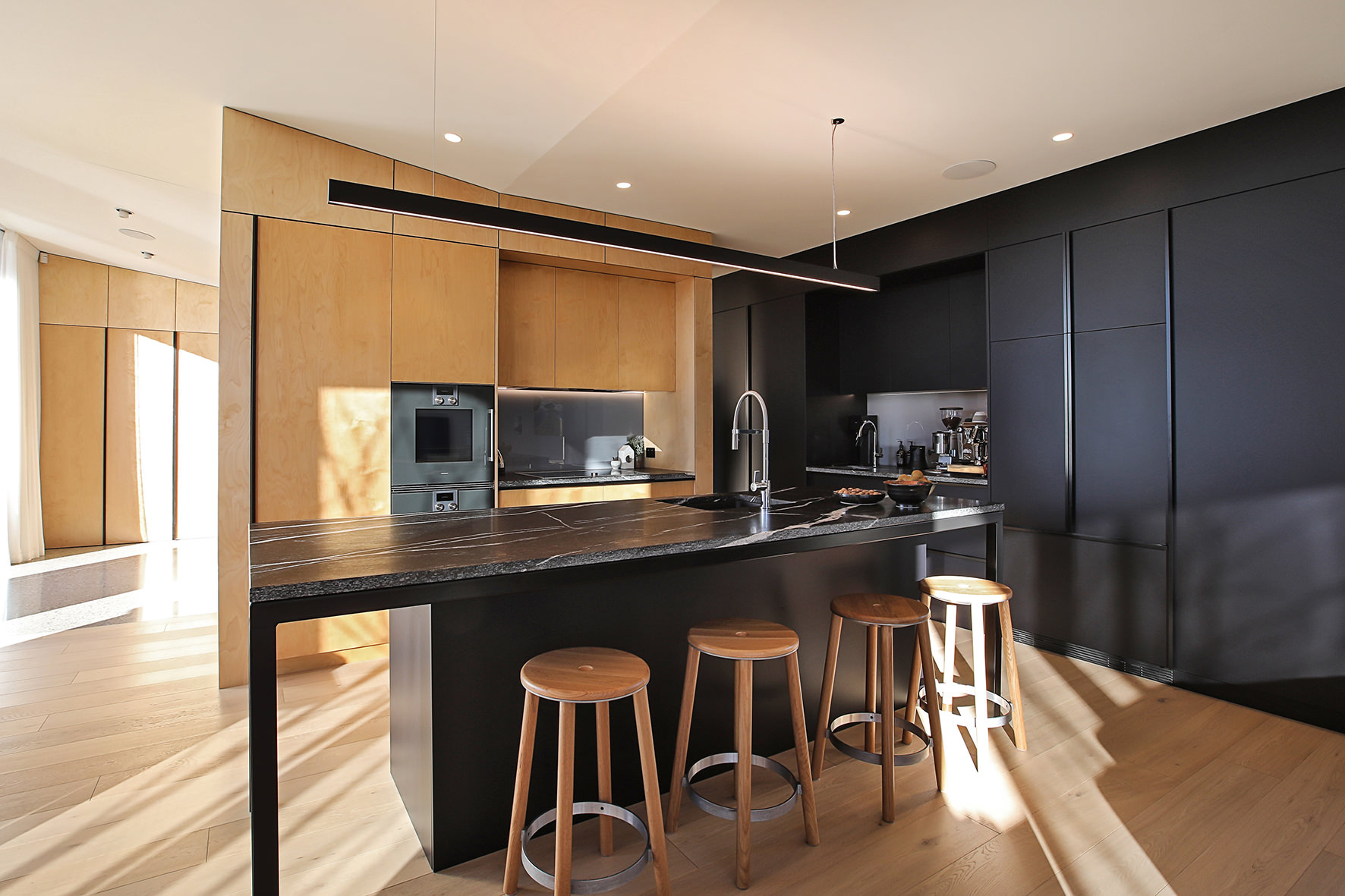Timber floors through the living areas and bedrooms are supplemented with polished concrete floors in the entry/art space. The high ceiling draws light into the smartly designed kitchen, the hub of the home.