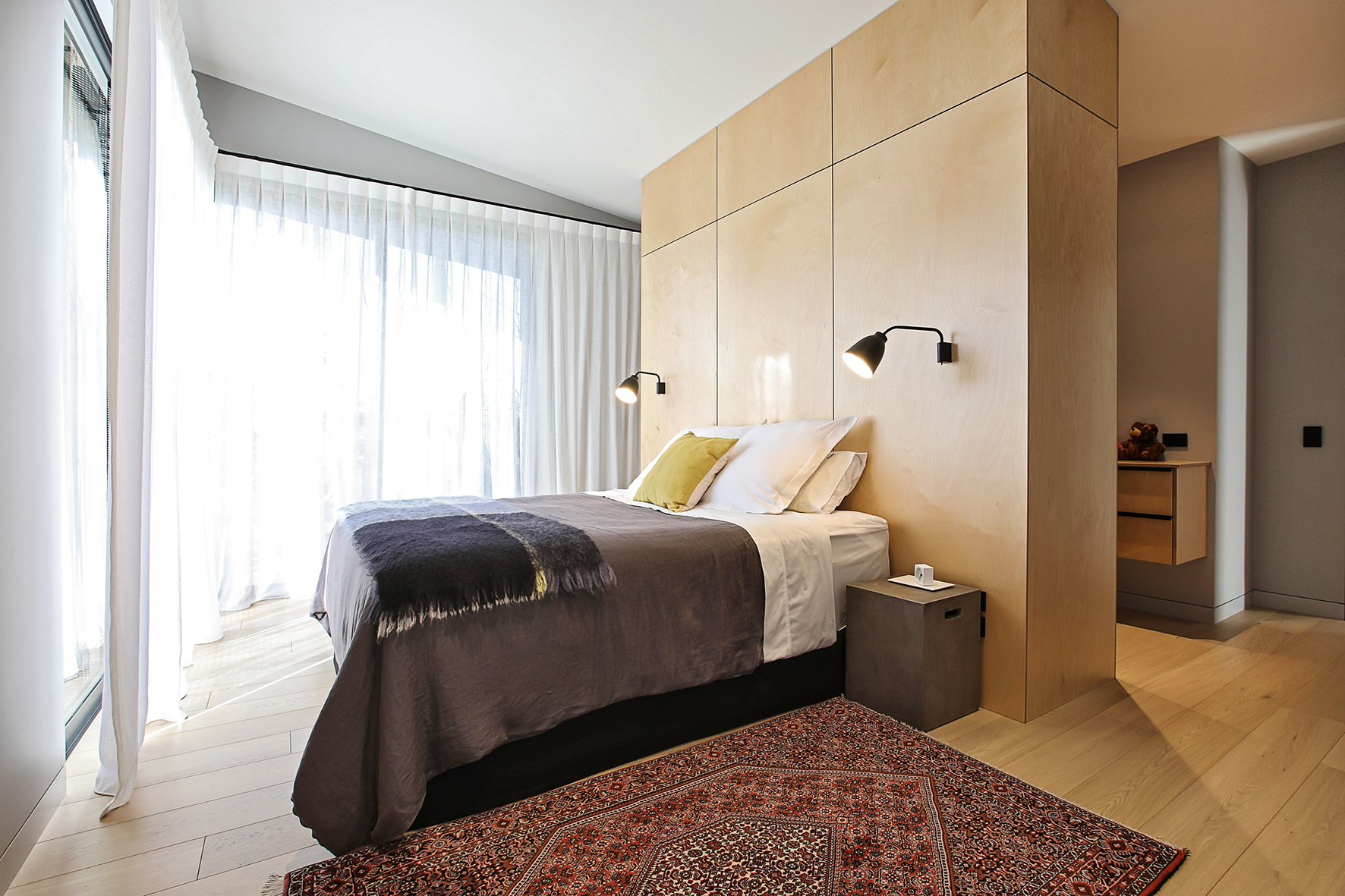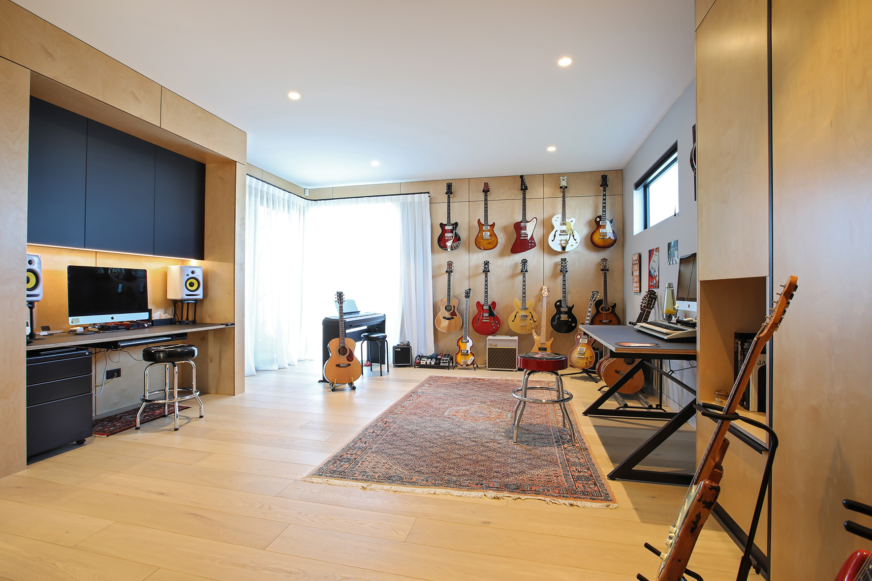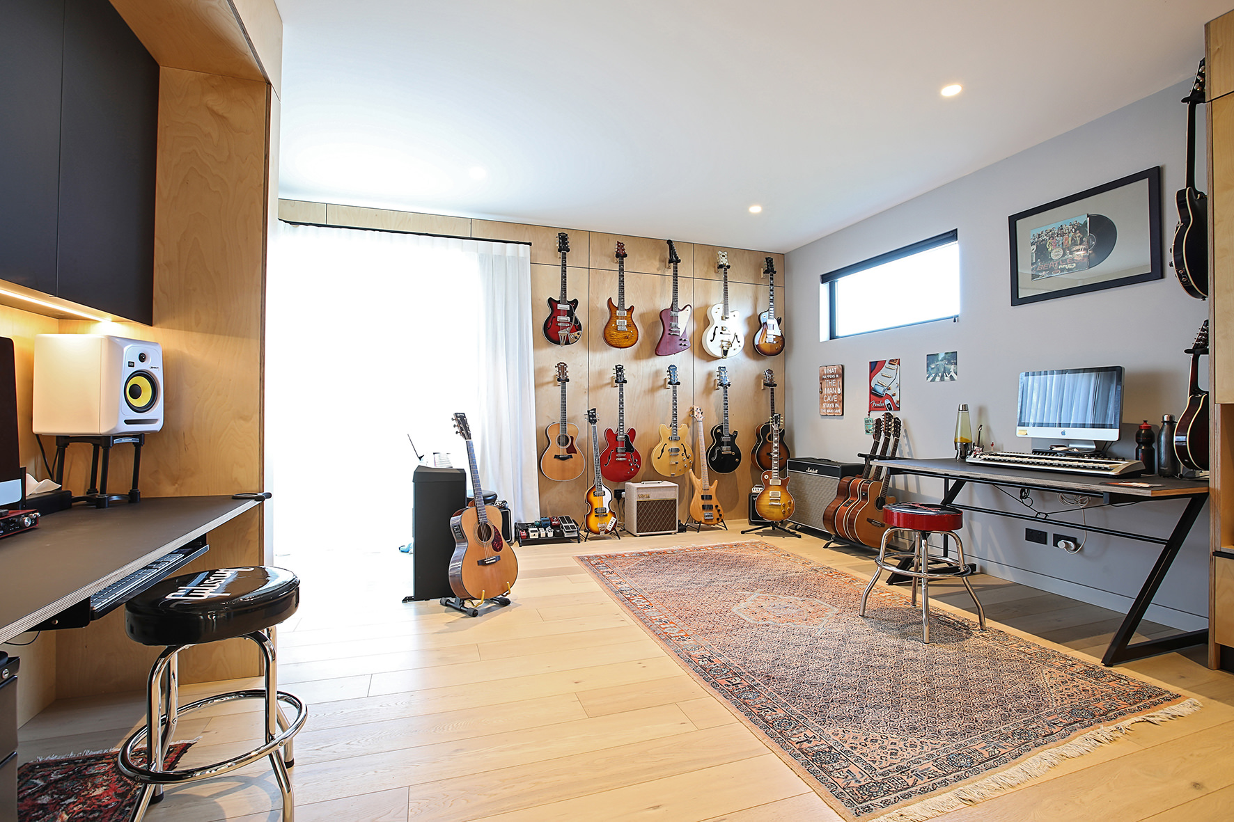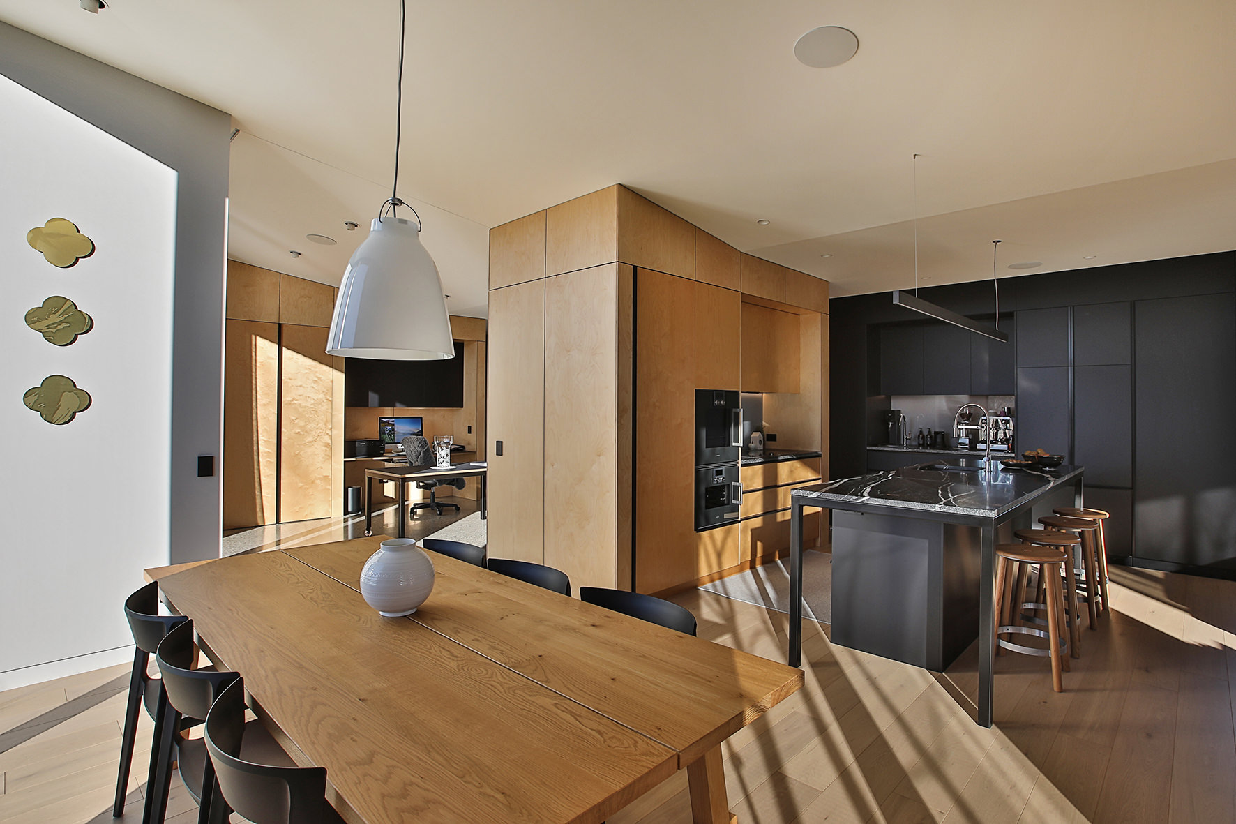 Timber floors through the living areas and bedrooms are supplemented with polished concrete floors in the entry/art space. The high ceiling draws light into the smartly designed kitchen, the hub of the home.