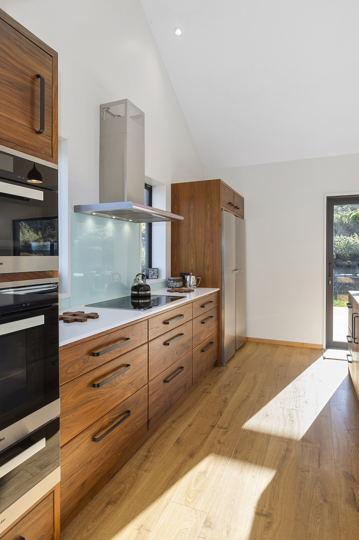 A woodburner sends out warmth and ambience from its perch in the living space. Wood floors tie in nicely with cedar cladding. High raking ceilings intensify the feeling of space and light within.