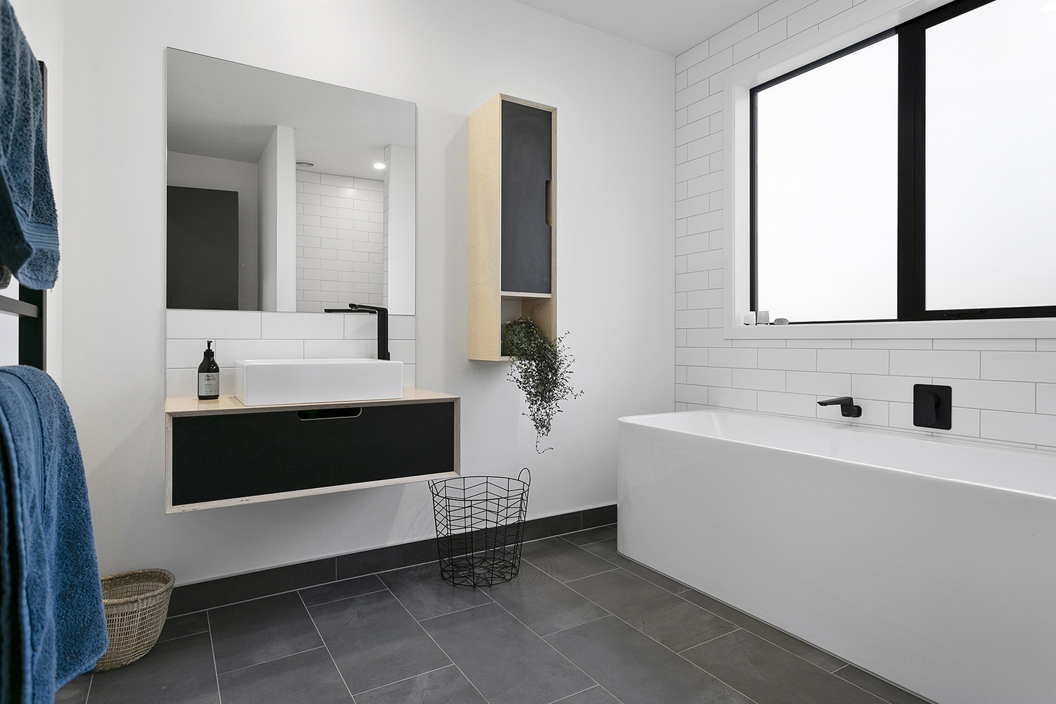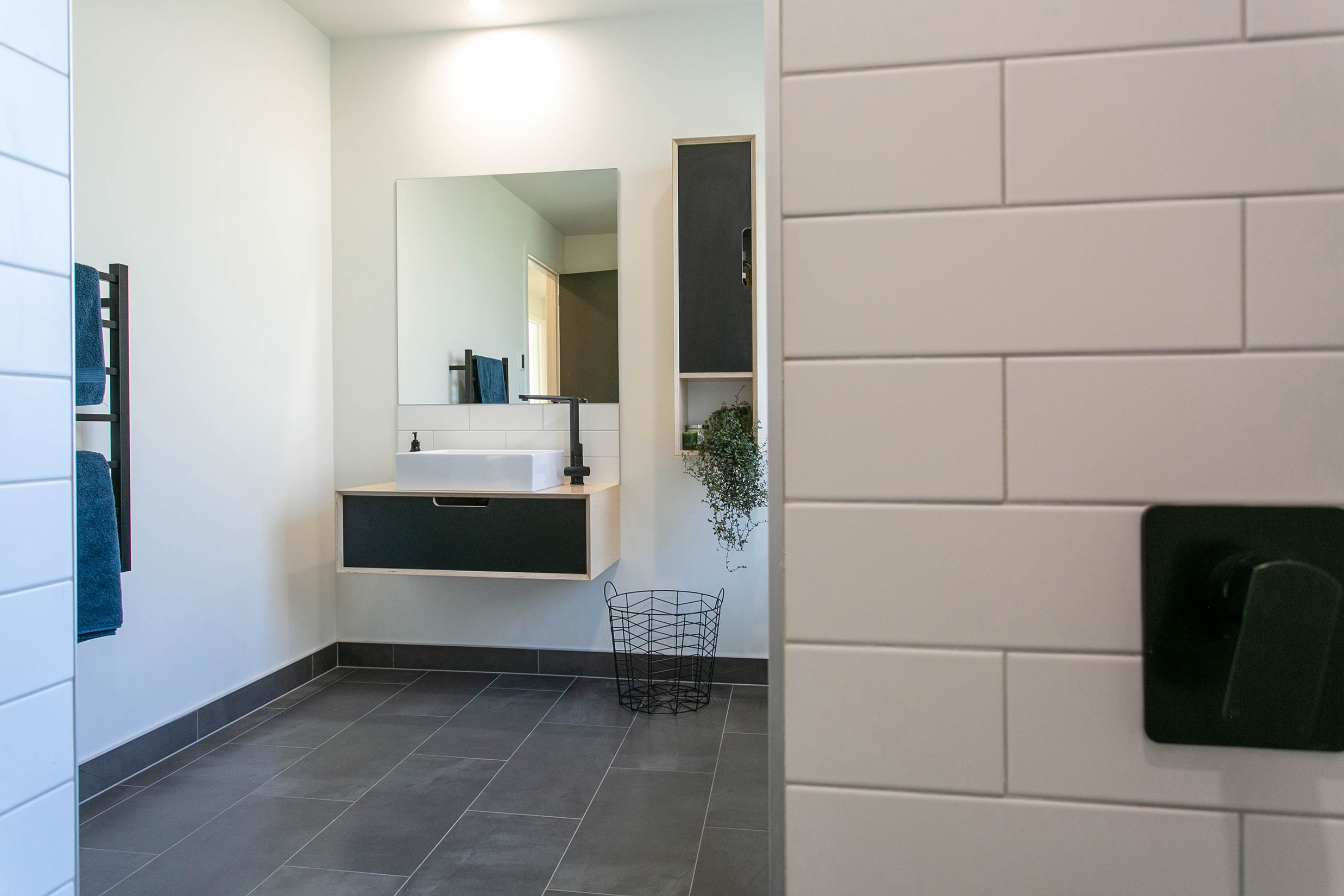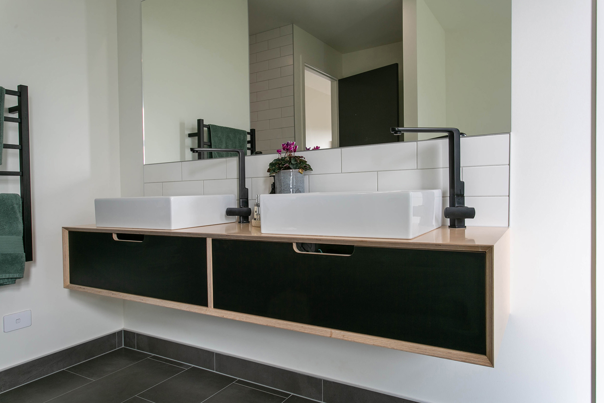 The stylish master ensuite and main bathroom feature simple but edgy ply vanities, crisp white subway tiles and modern matte black fittings. The overall effect is just dazzling.