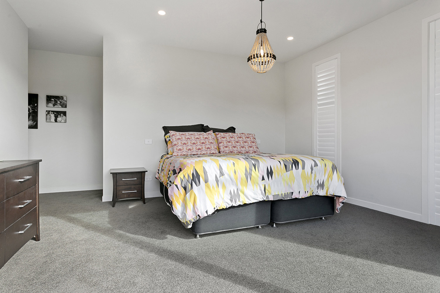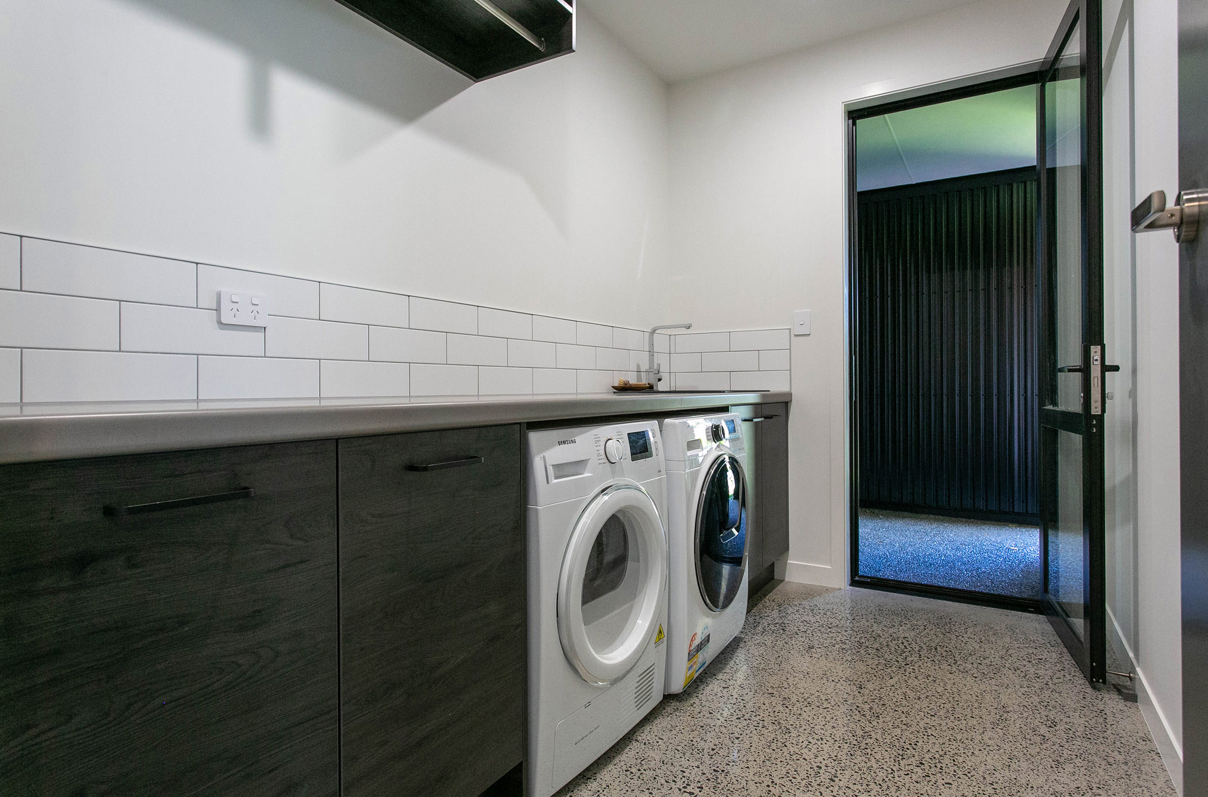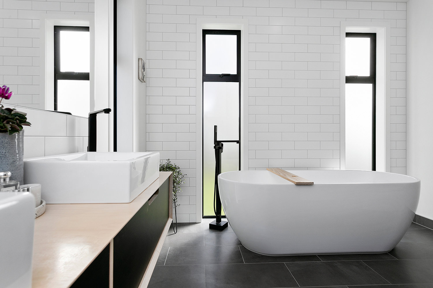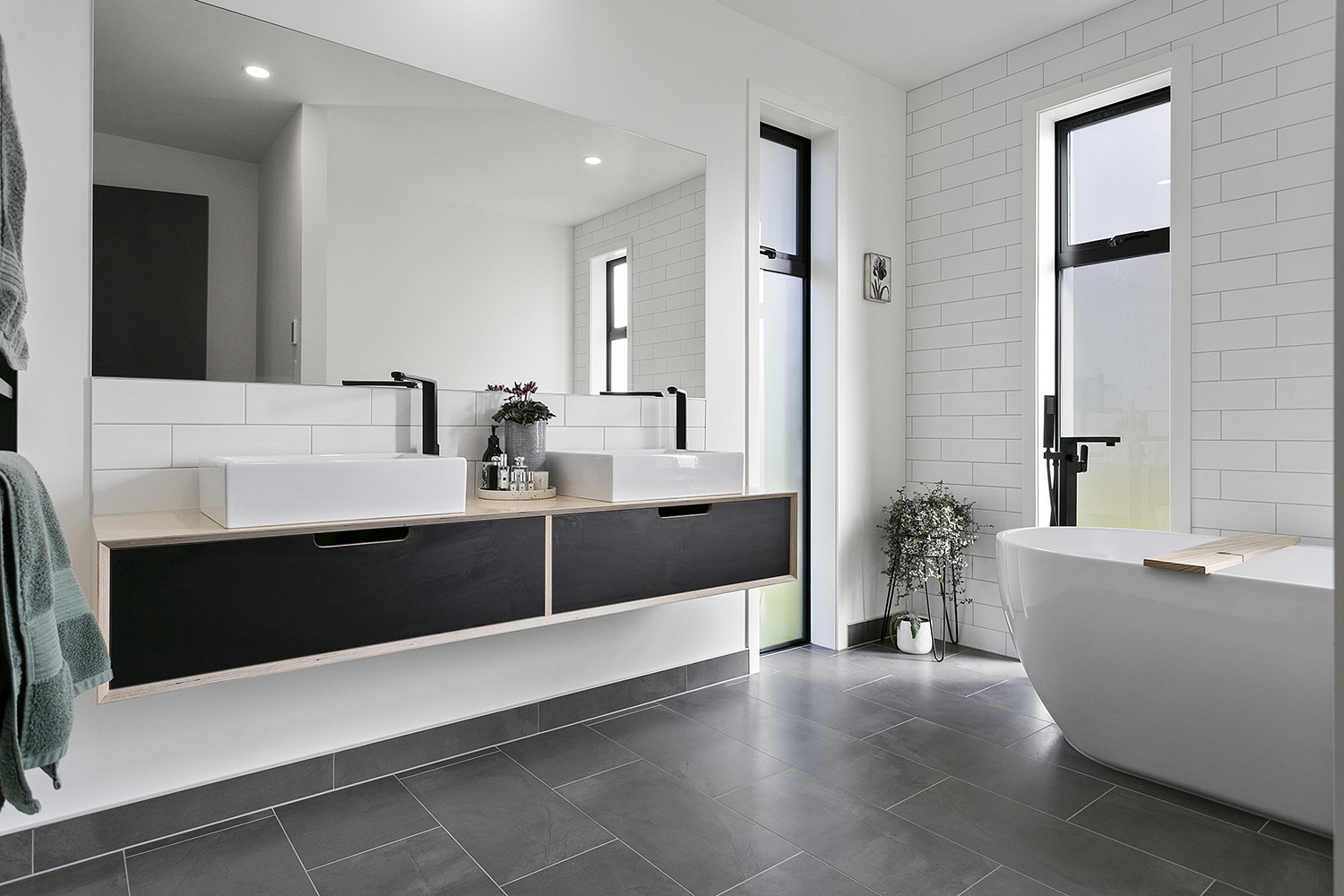 The stylish master ensuite and main bathroom feature simple but edgy ply vanities, crisp white subway tiles and modern matte black fittings. The overall effect is just dazzling.