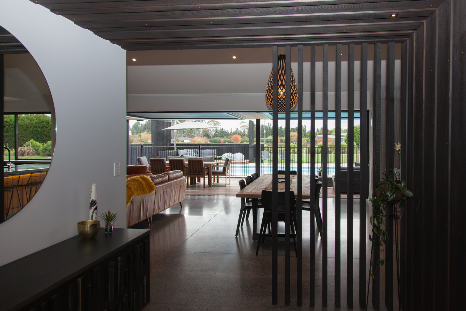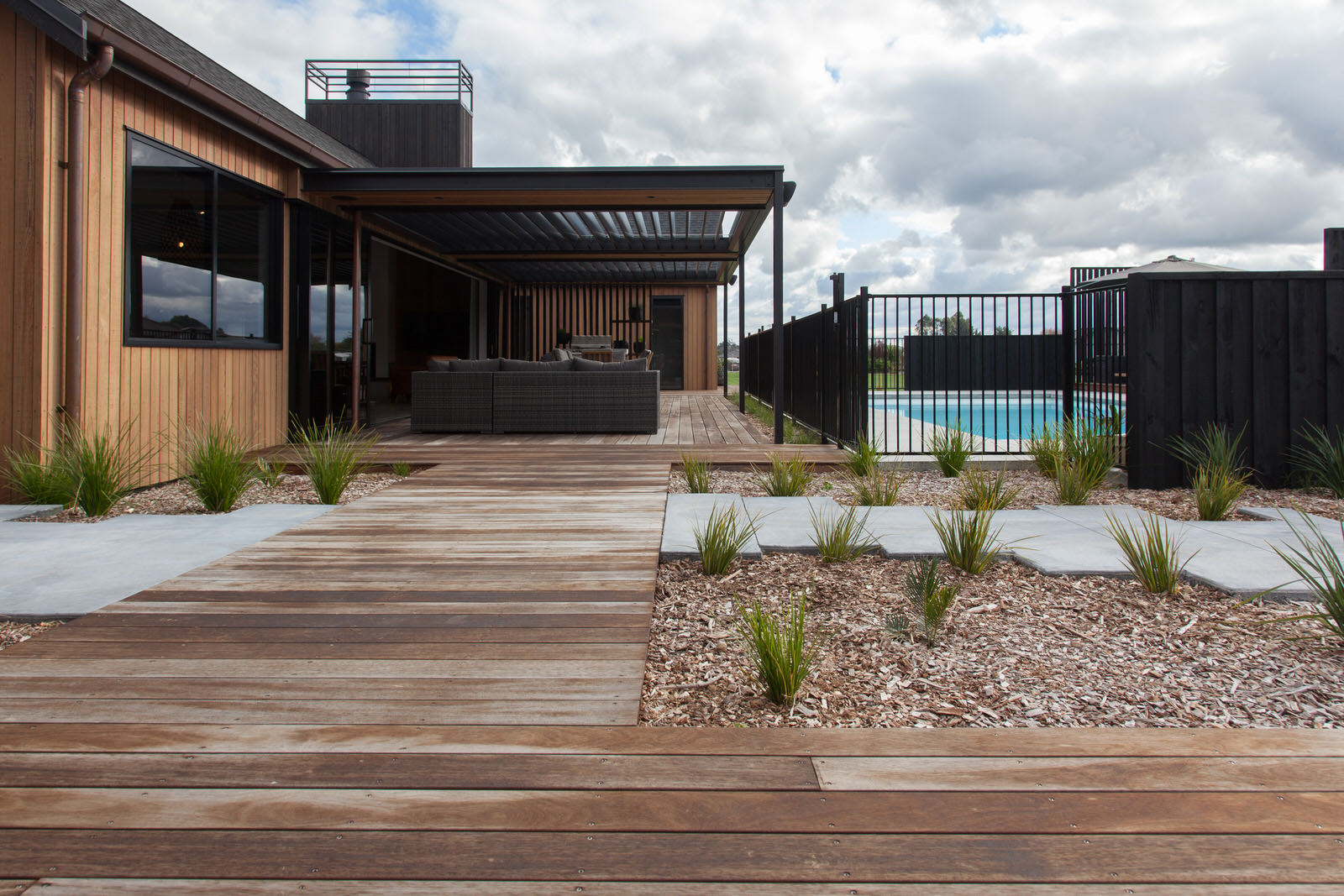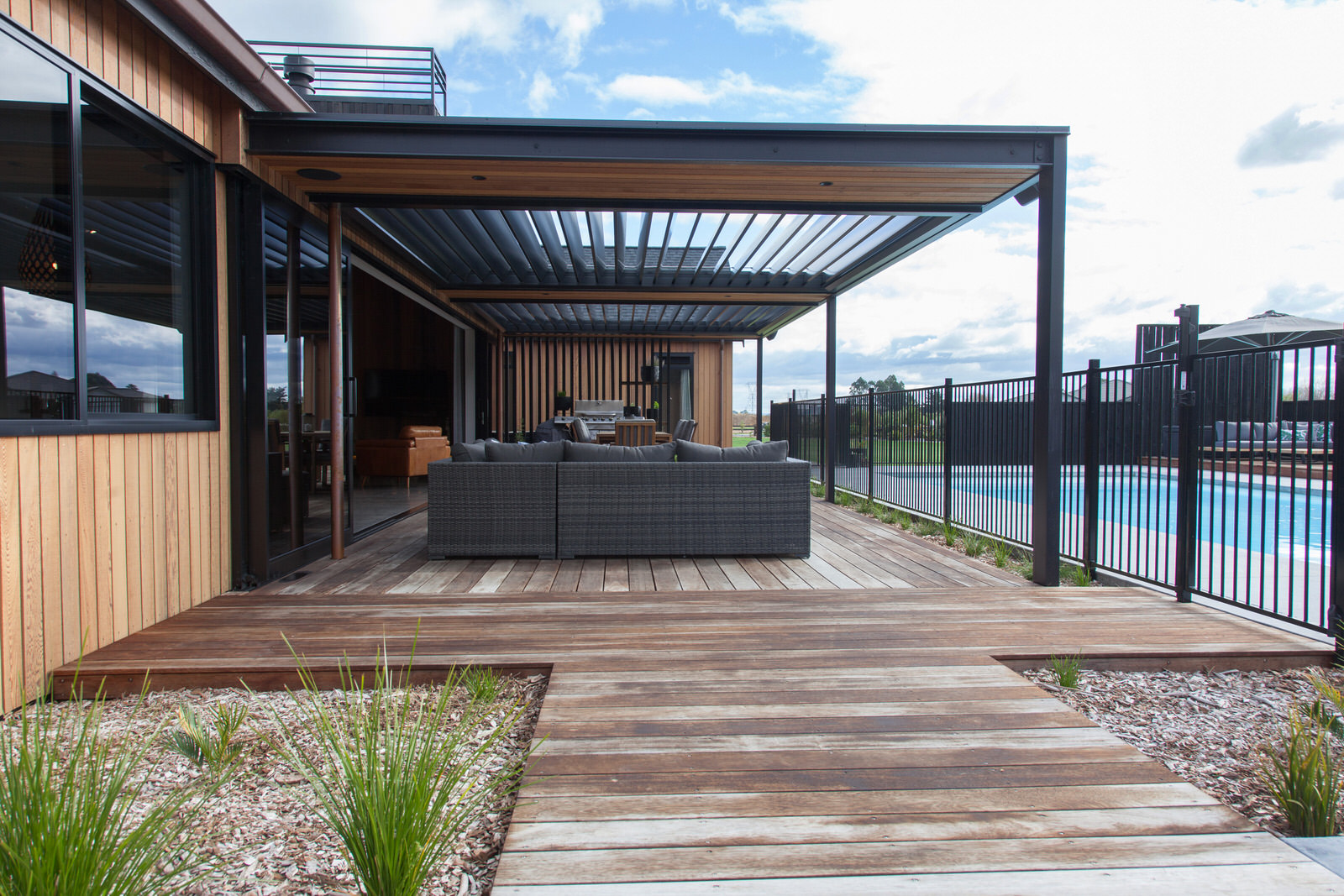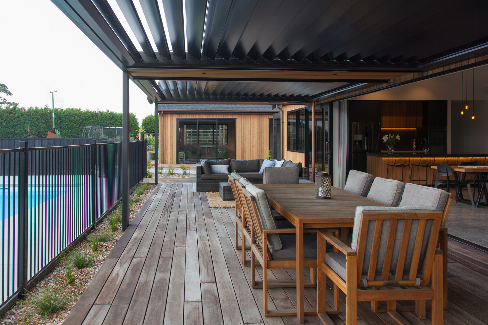 Inside flows to a louvre-roofed deck area and swimming pool via a 7m sliding door. Multiple smaller outdoor spaces provide flexibility and balance.
