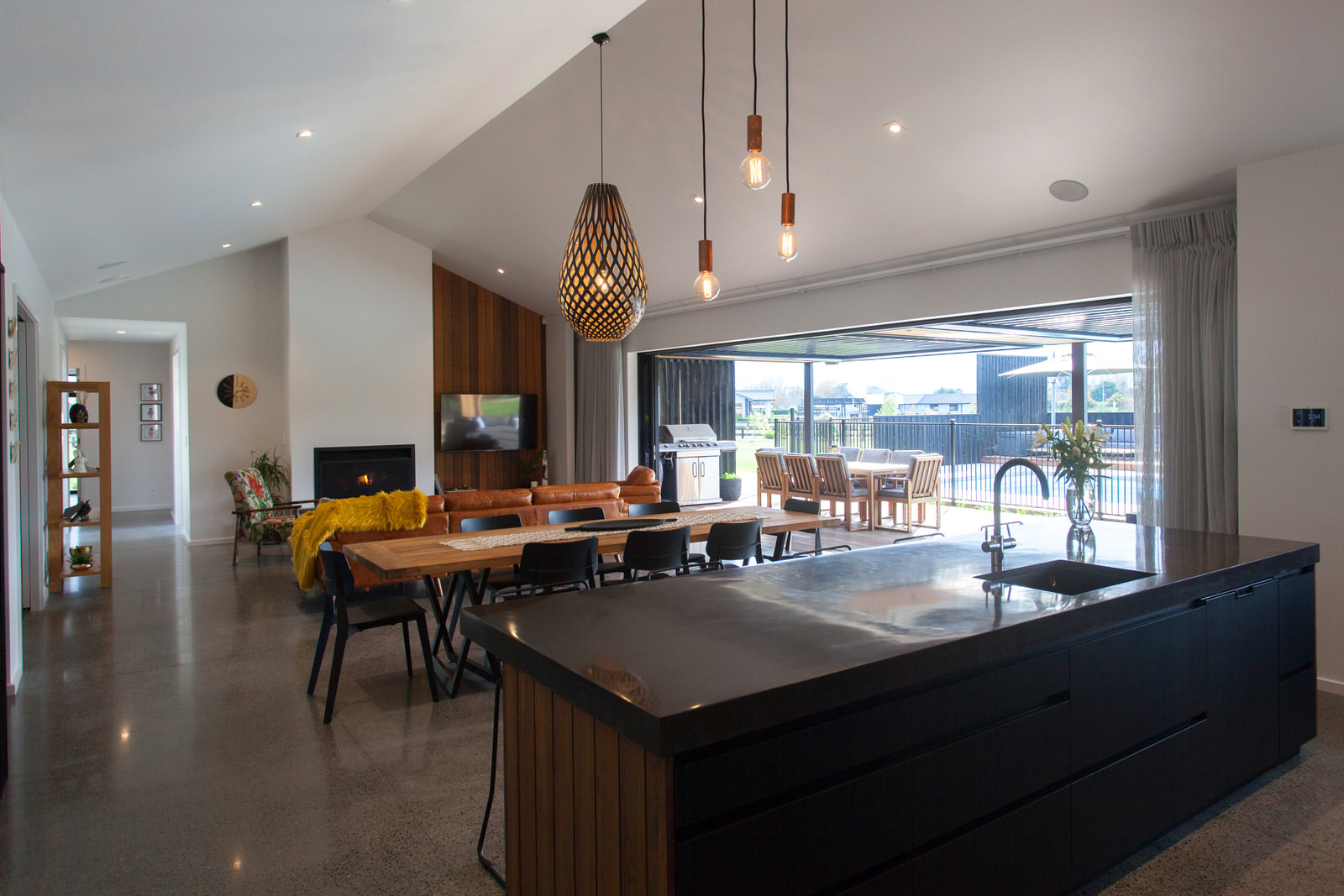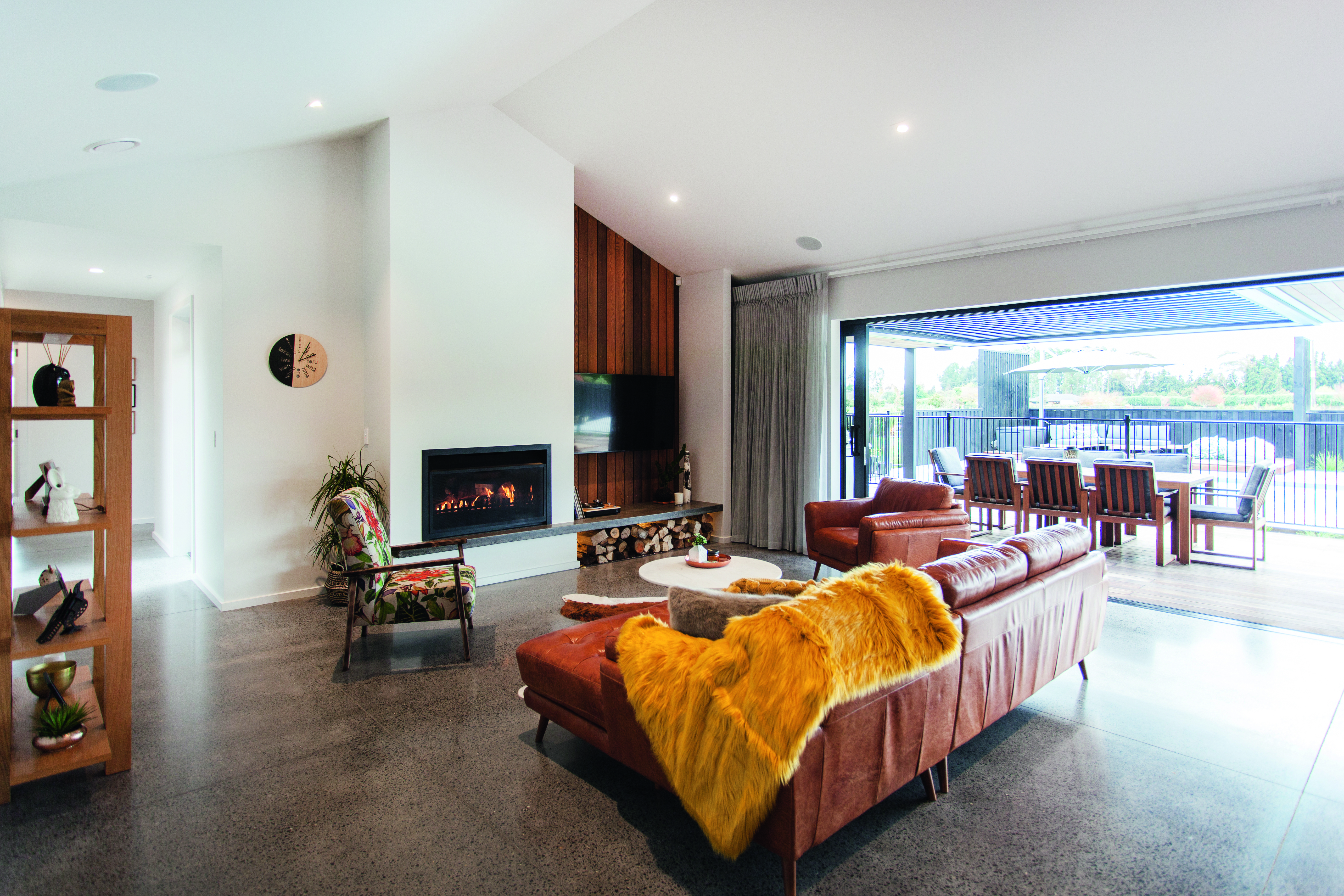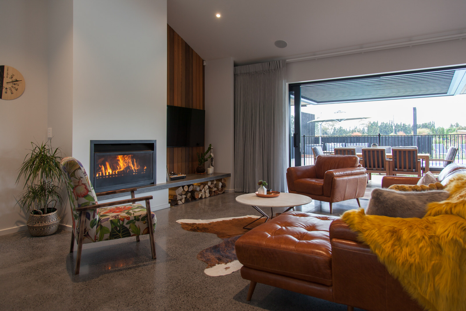A 700kg solid concrete island bench anchors the stunning custom-designed kitchen/scullery. Raking ceilings and a wood fire reflect the refined yet cosy atmosphere at the opposite end of the living space.
