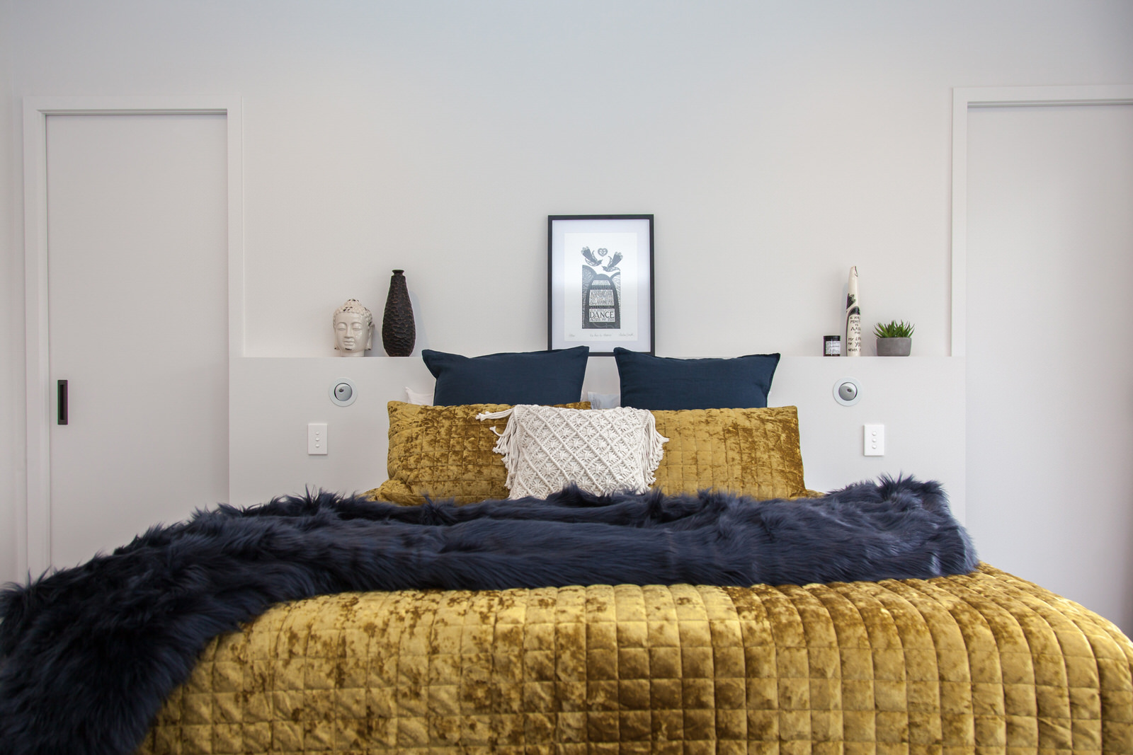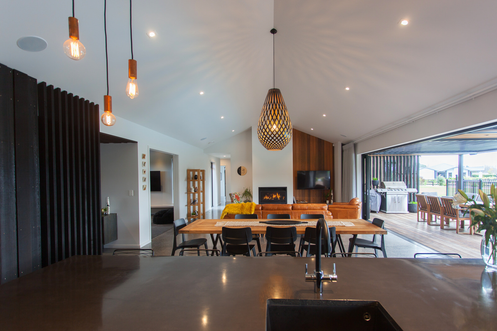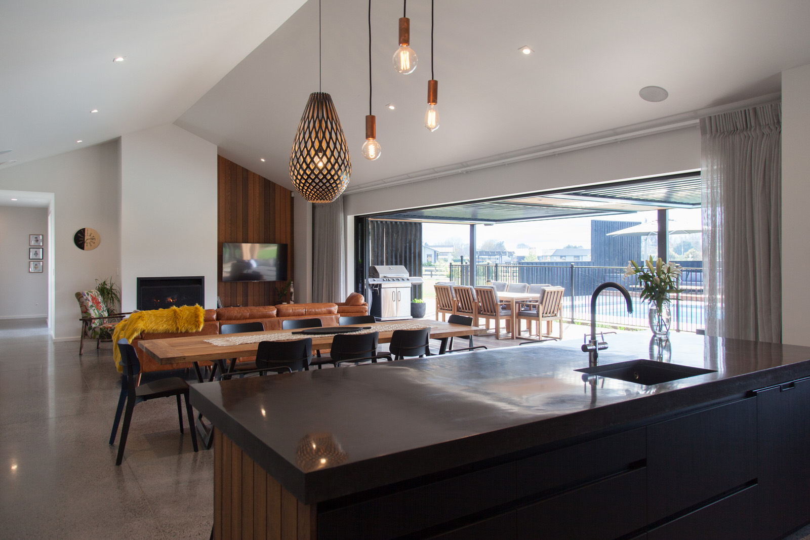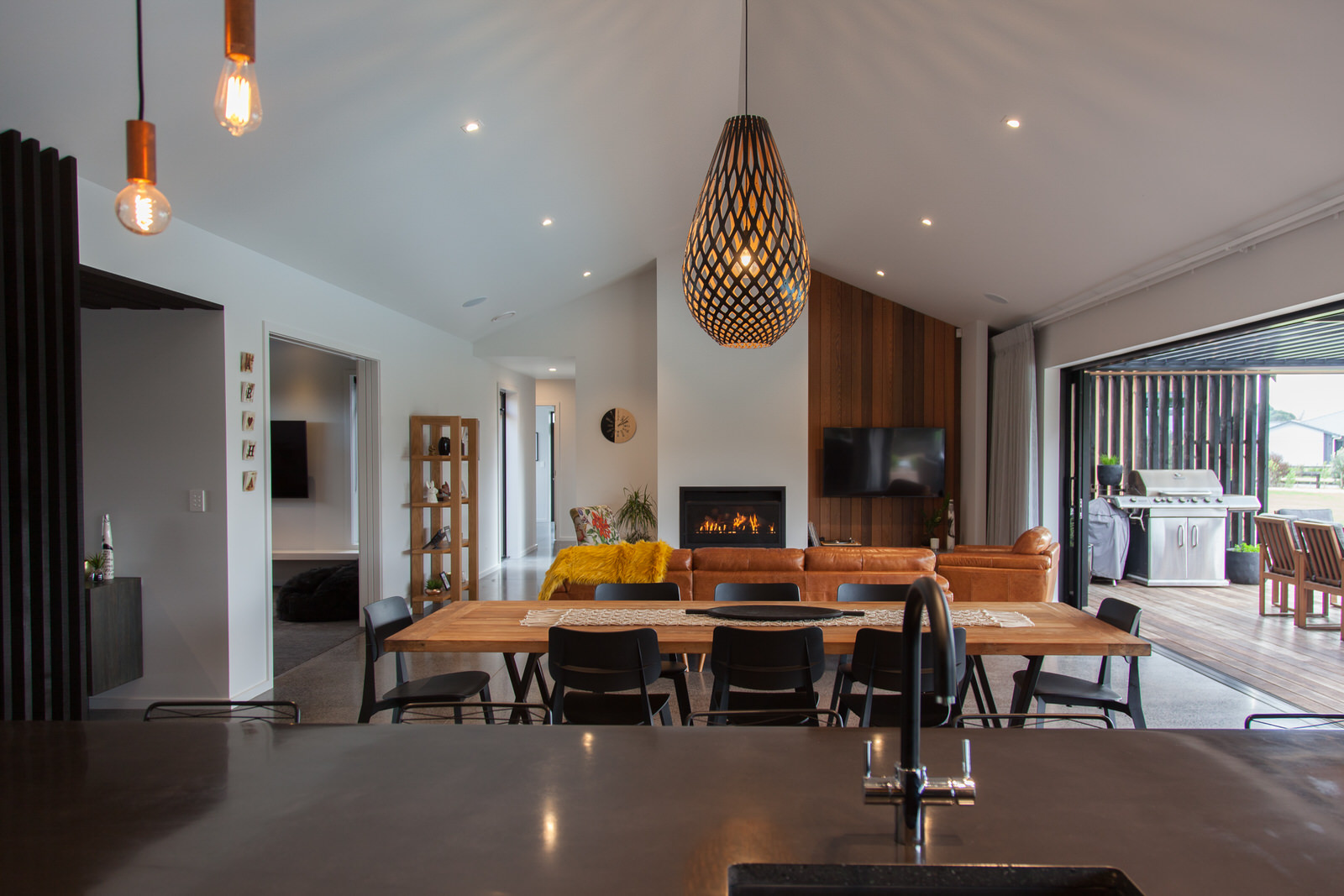 A 700kg solid concrete island bench anchors the stunning custom-designed kitchen/scullery. Raking ceilings and a wood fire reflect the refined yet cosy atmosphere at the opposite end of the living space.