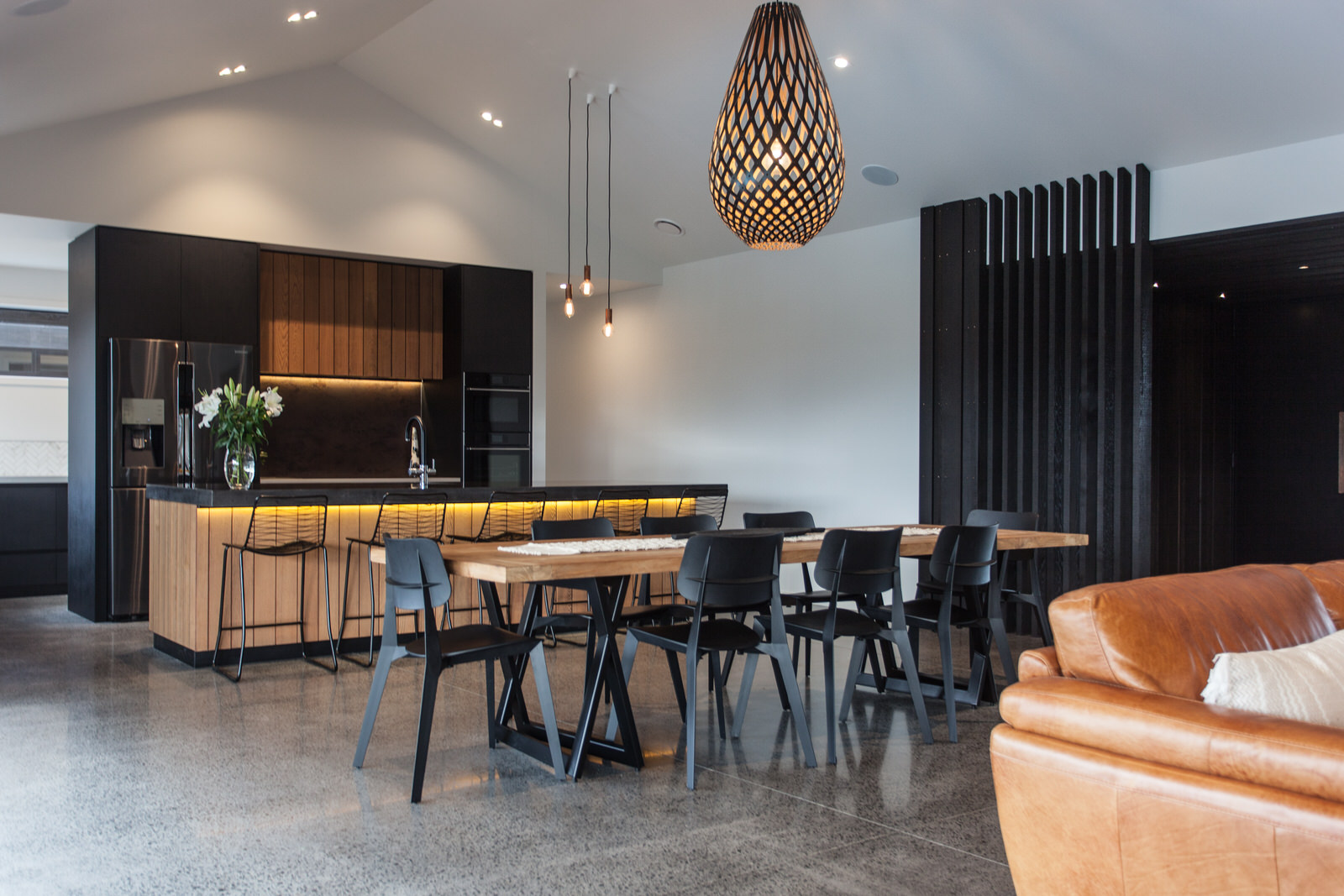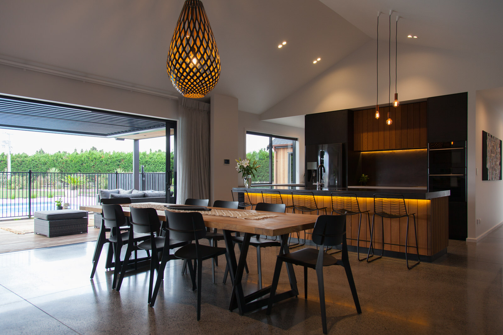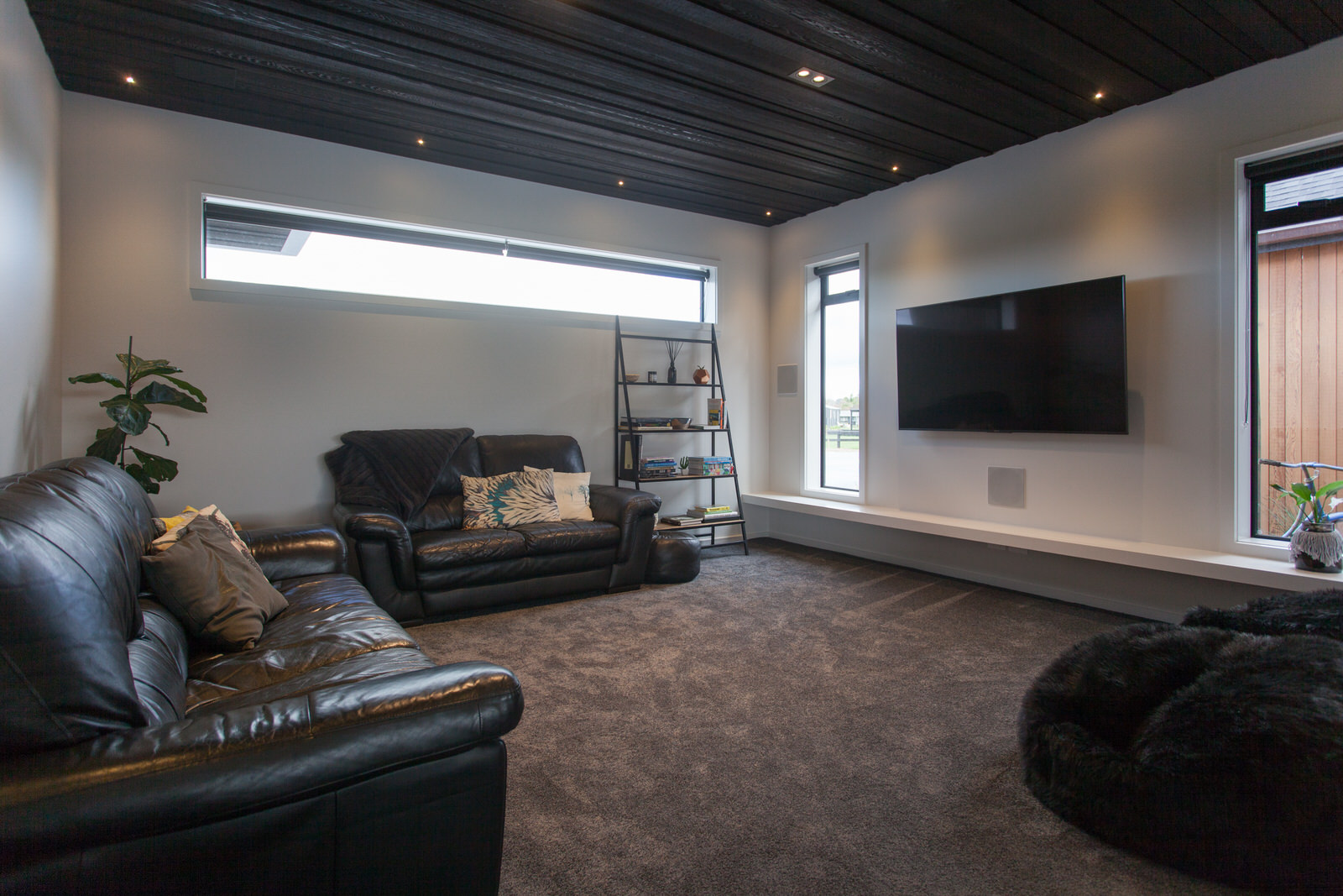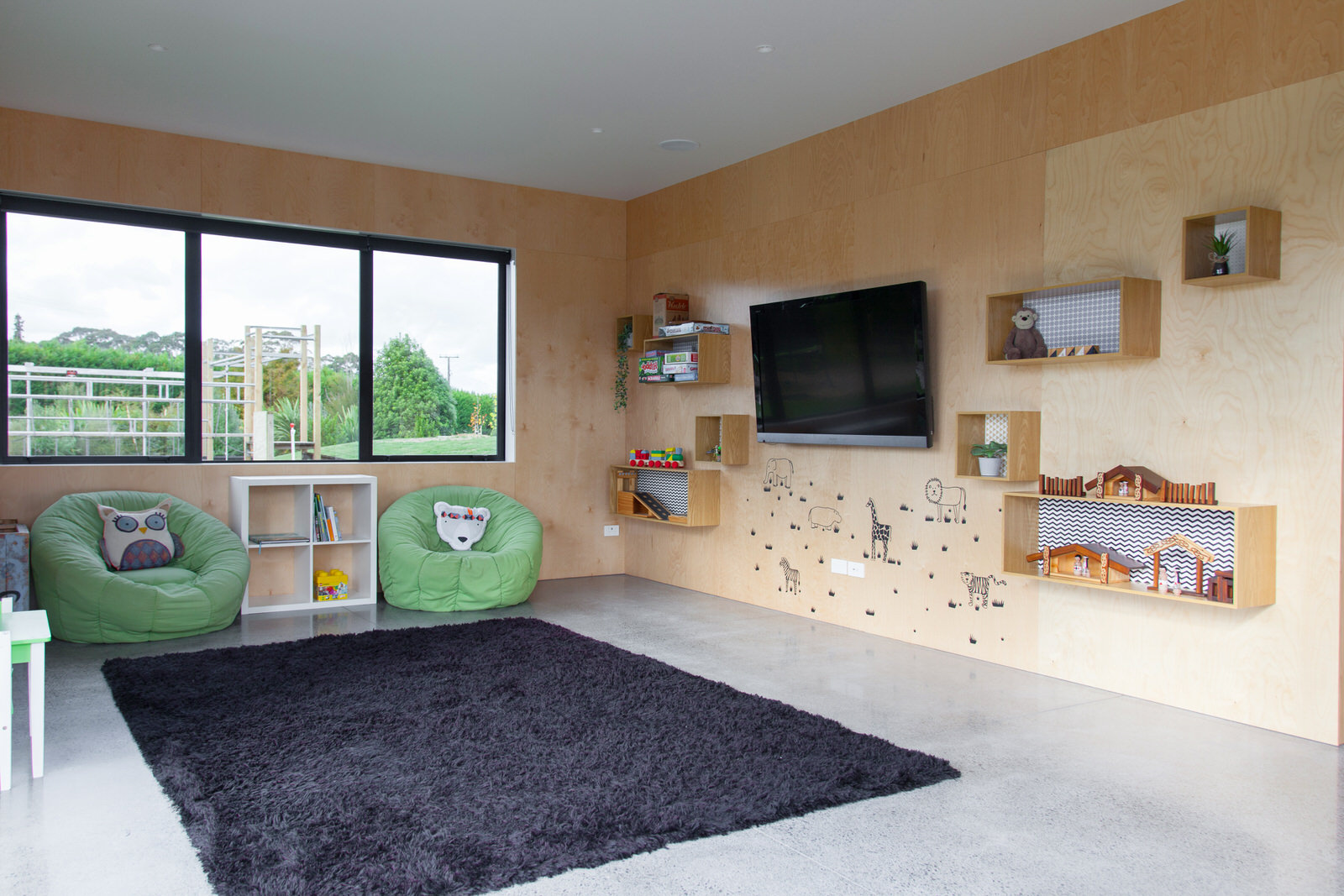 The material palette is inspired by the outdoor setting and busy family life. Polished concrete floors grace the shared spaces. Carpet keeps the bedrooms cosy. Cedar features enhance the entrance, theatre and kitchen; the games room is lined with plywood.