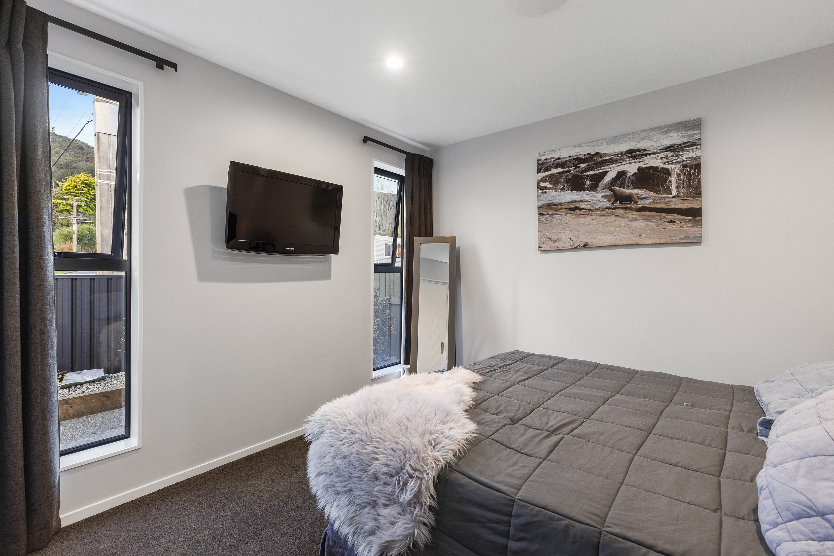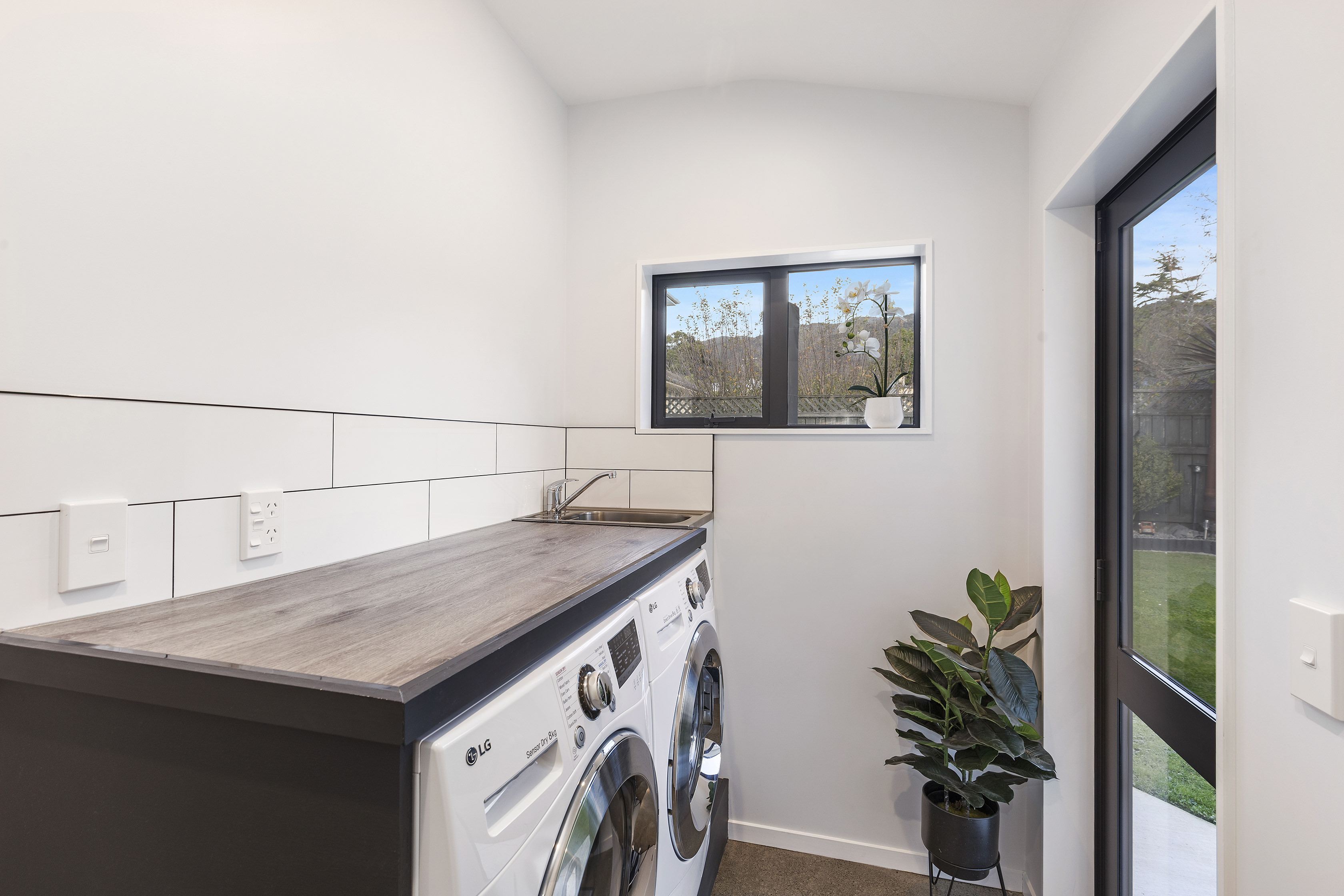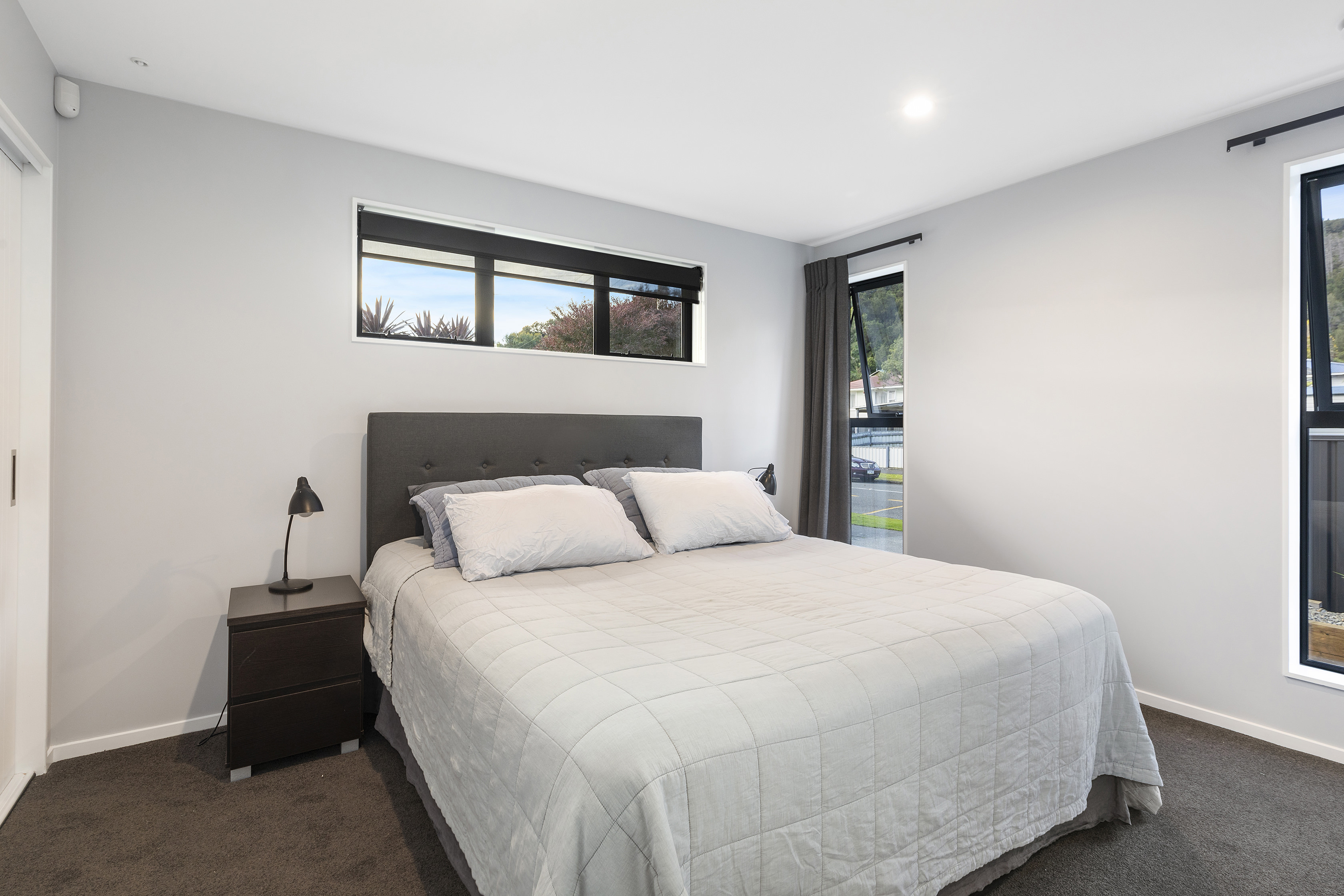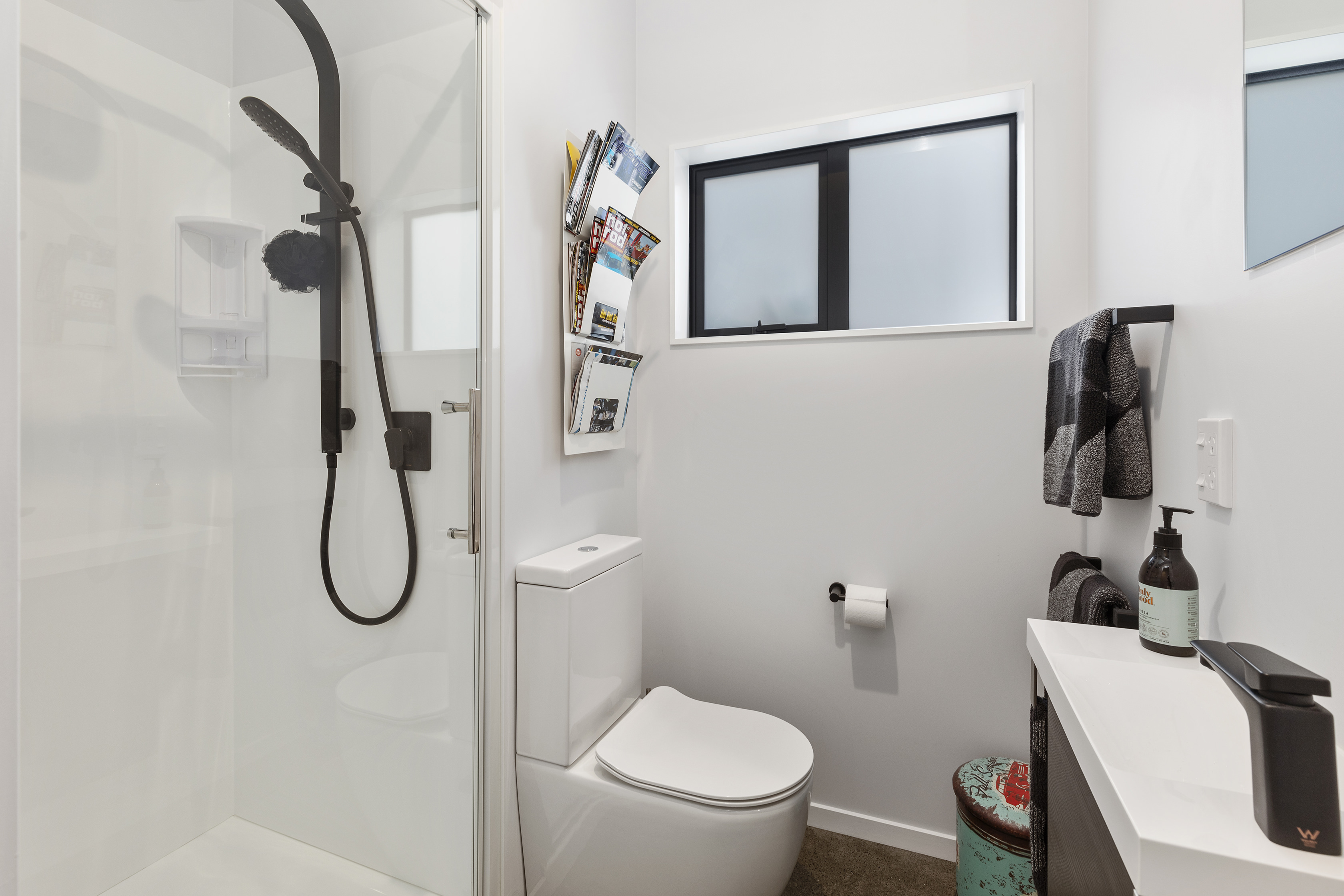 A neutral colour scheme works well with the earthy materials on show throughout. Coal-coloured kitchen cabinetry, stone benchtops, a plywood-lined garage, and polished concrete floors all nod to the environment.