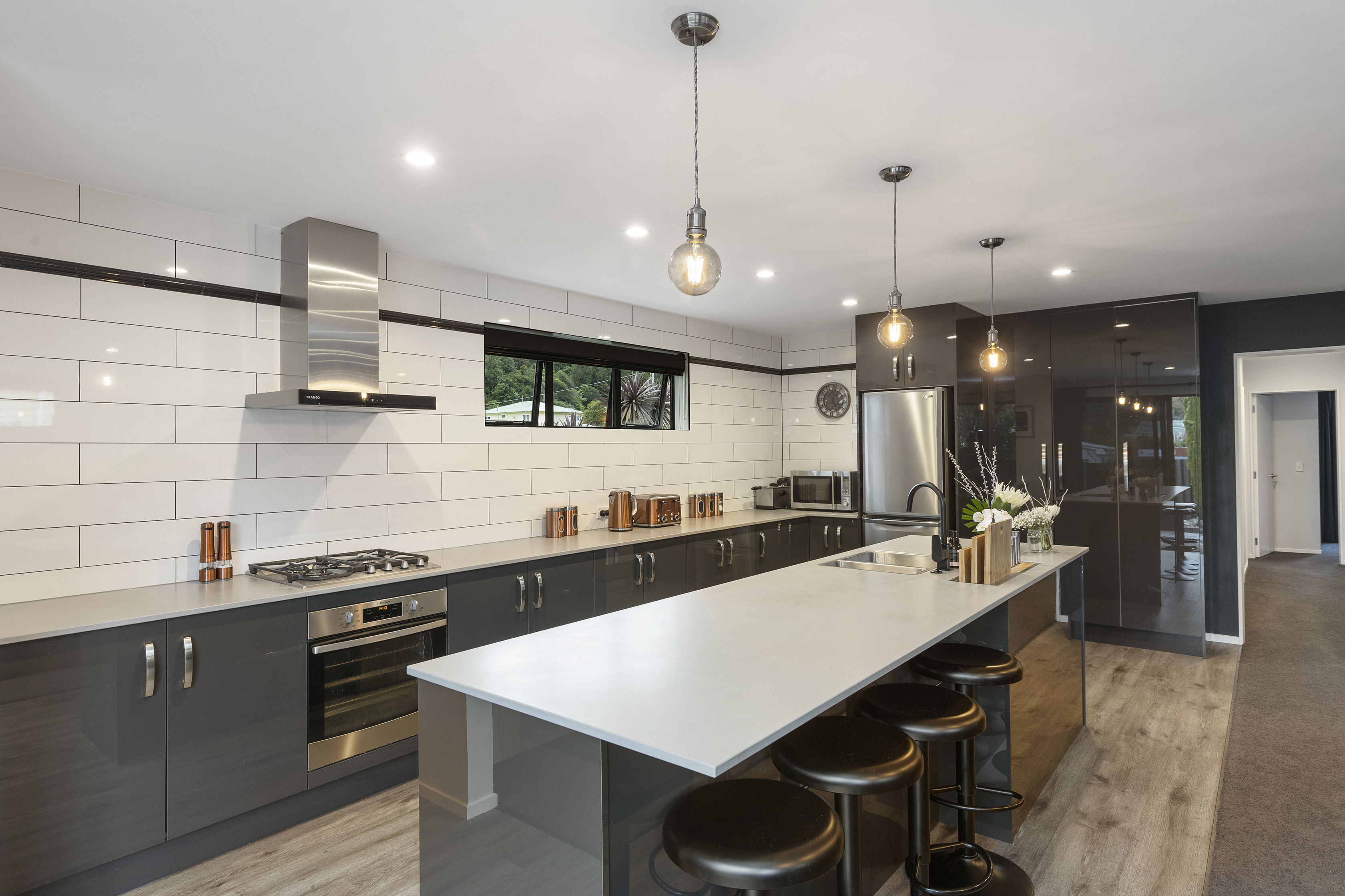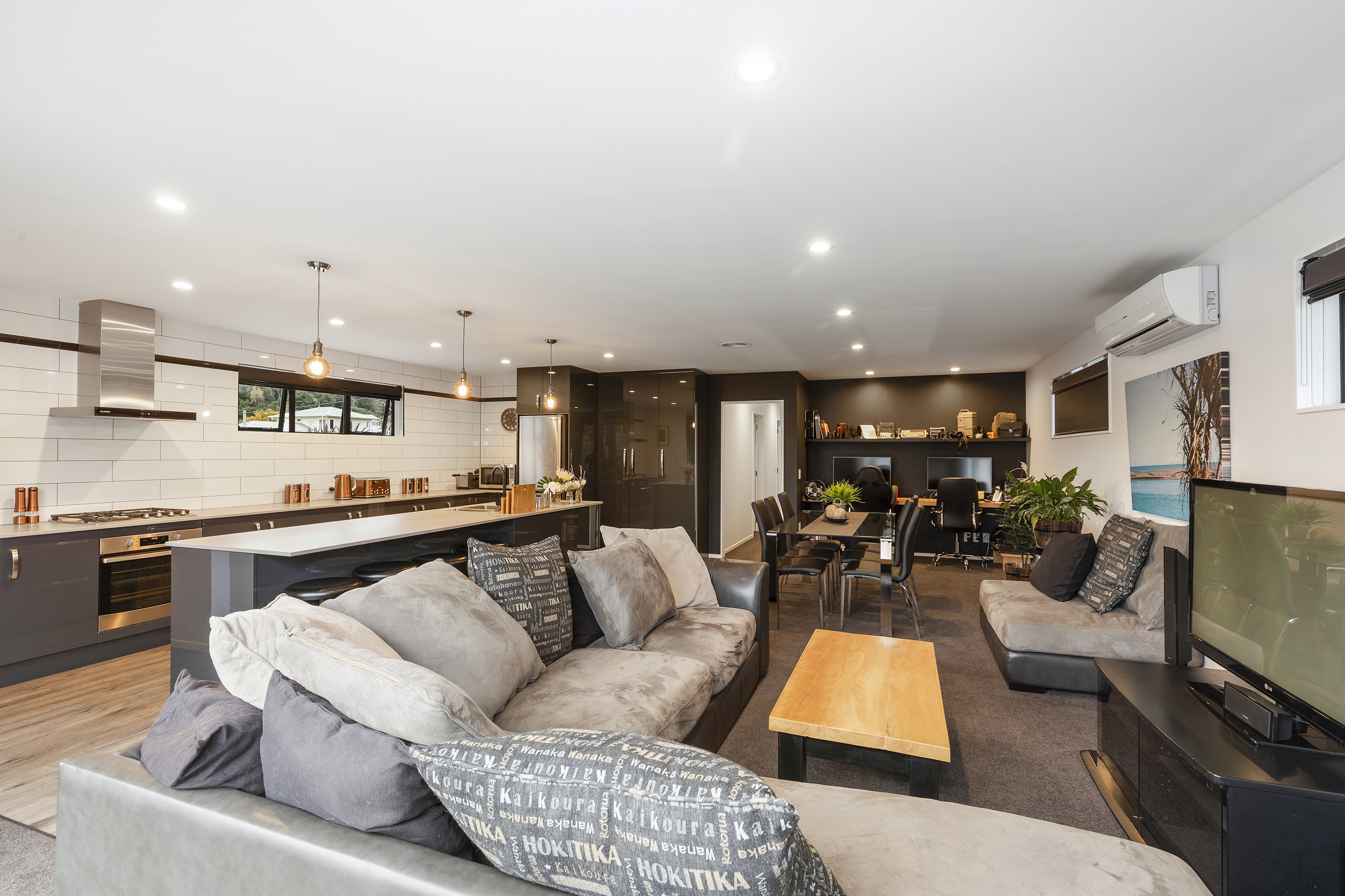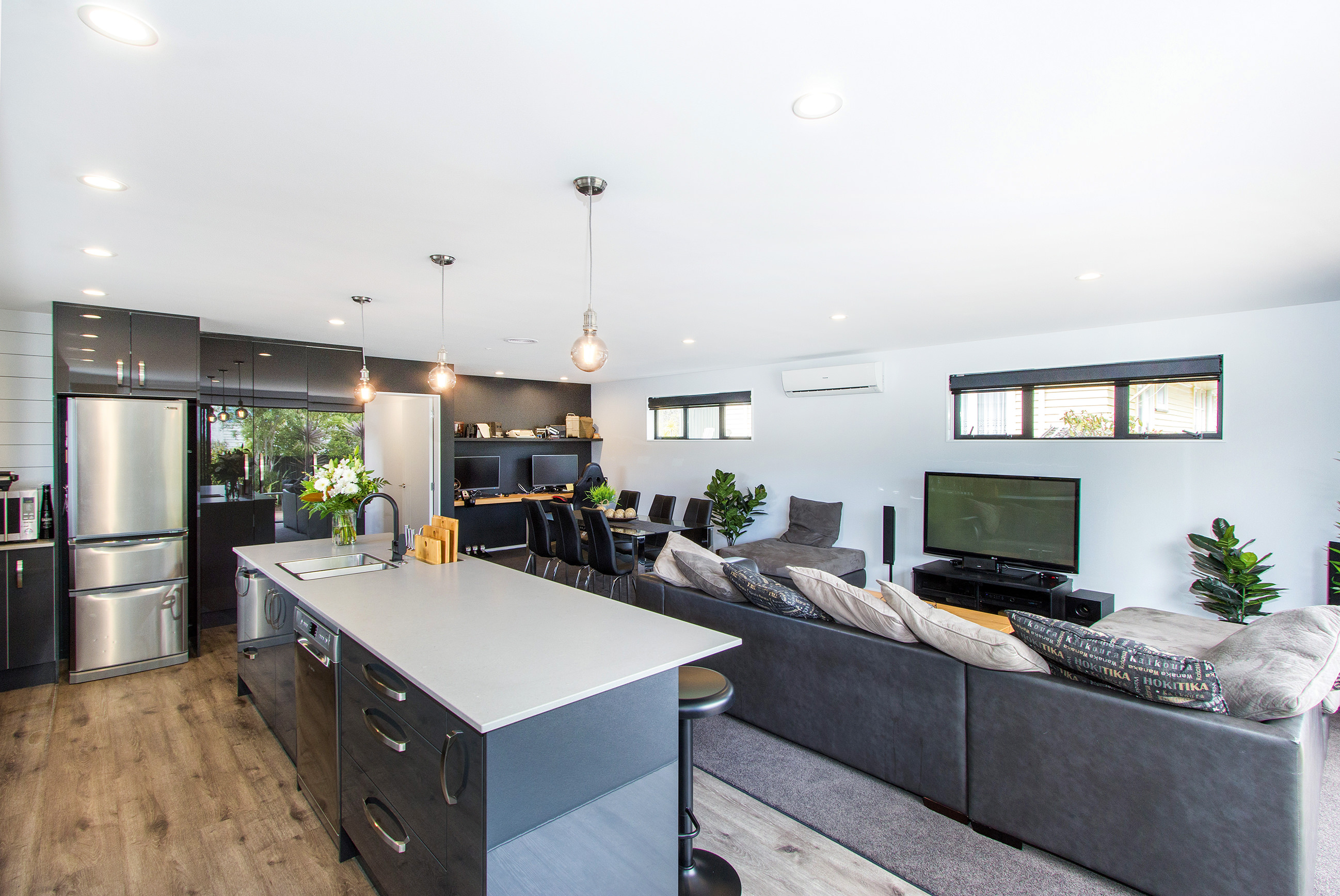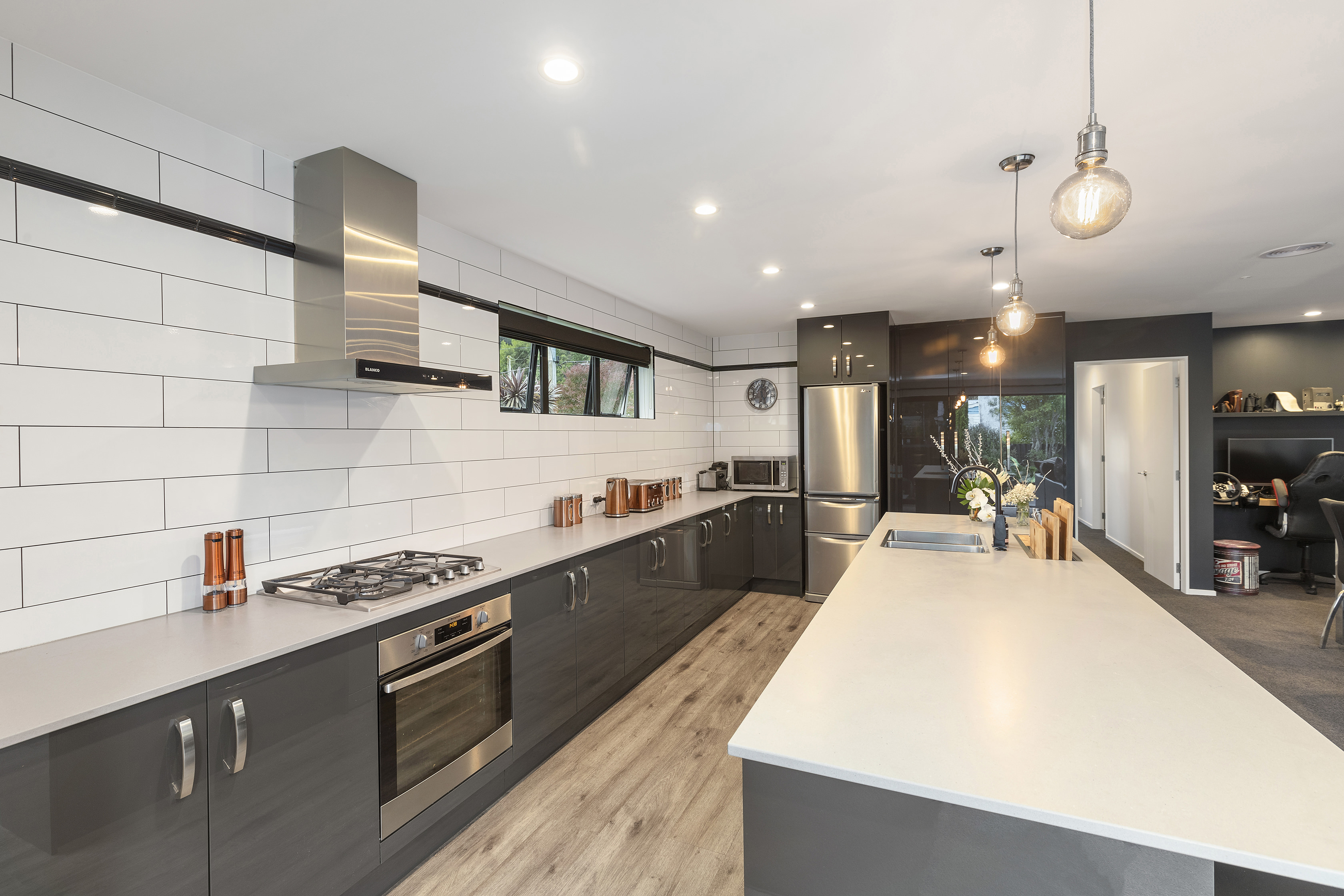 The spacious, galley-style kitchen forms the beating and stirring heart of the home. It’s well connected to the dining and lounge areas and a generous study nook with bespoke macrocarpa floating desk.