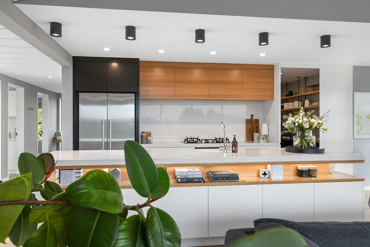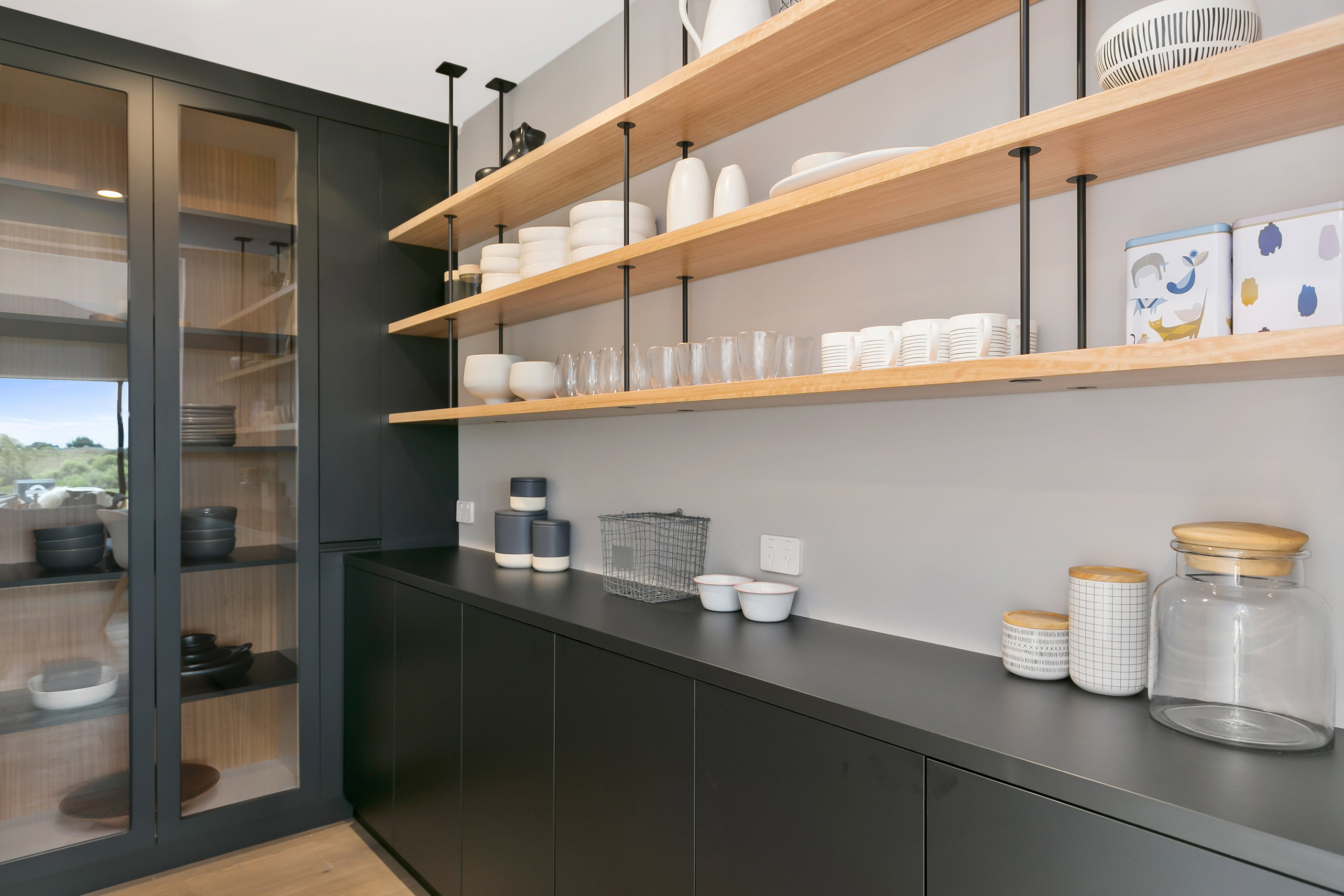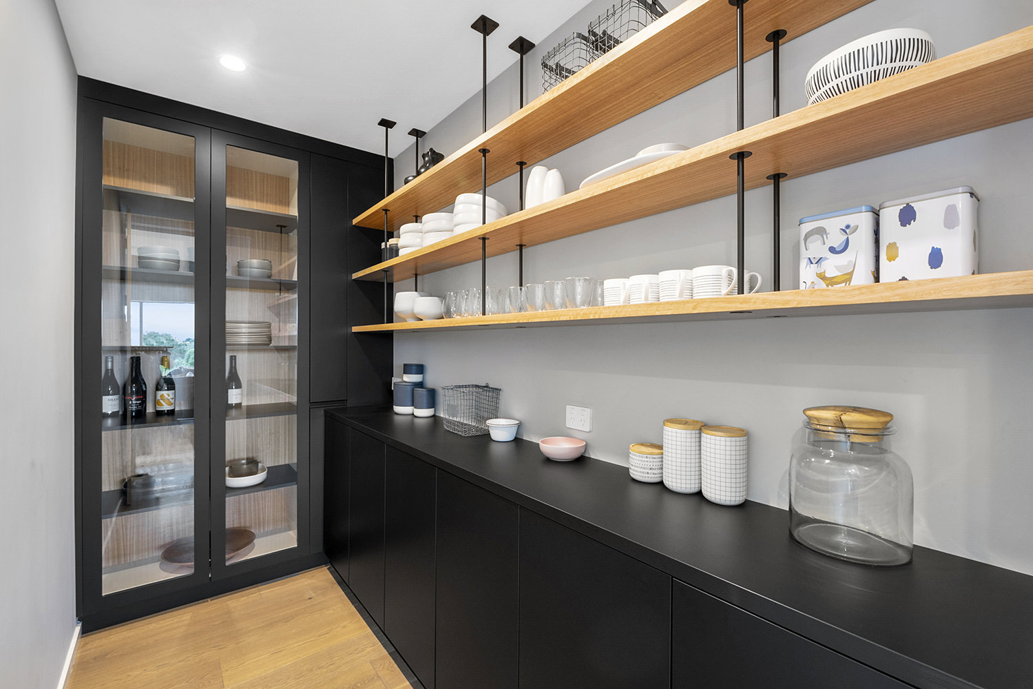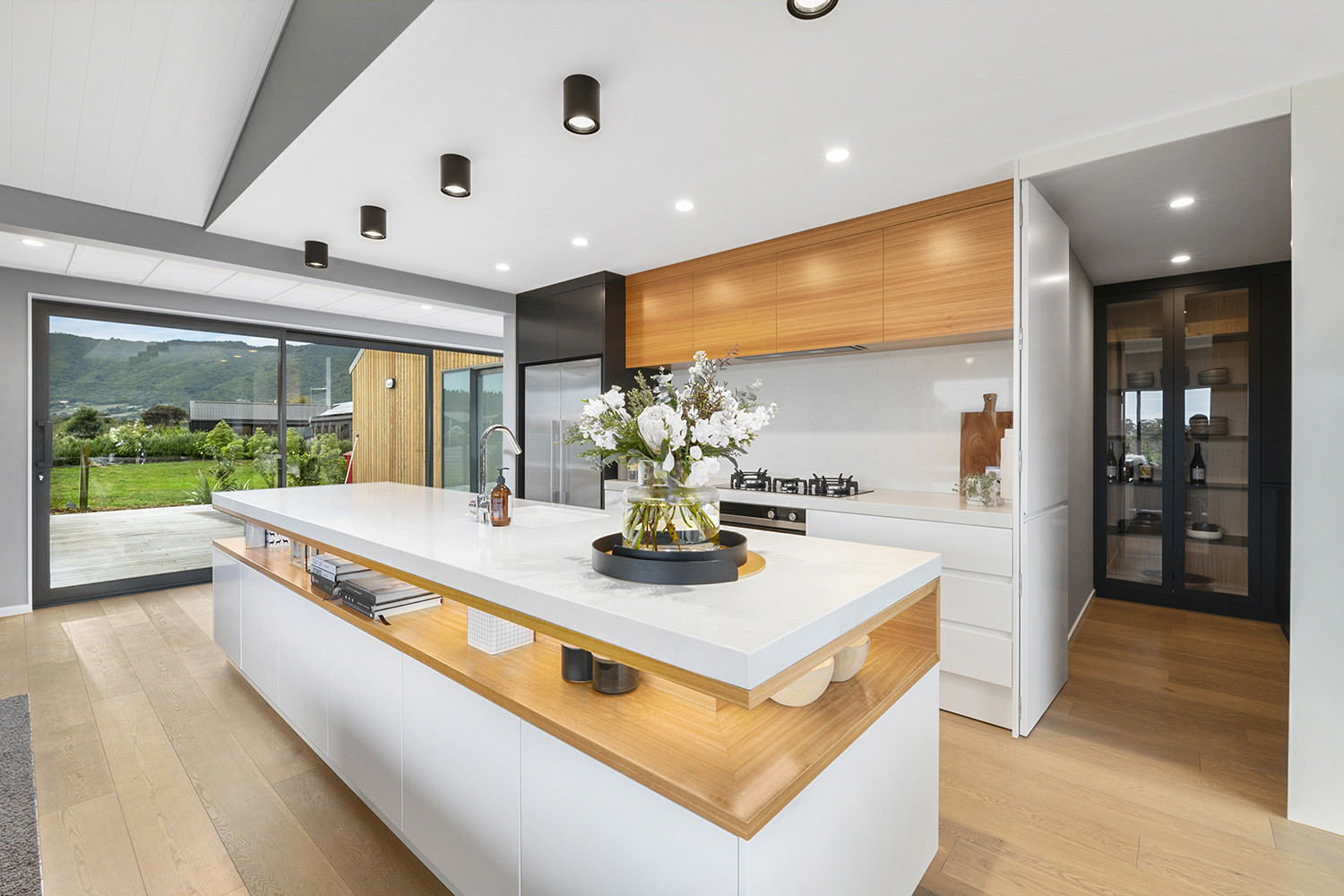 The generous kitchen boasts silky semi-gloss and ultra matte joinery. This contrasts with accents of ash timber, creating a warm and welcoming hub for entertaining. The generously sized island bench houses cabinets on both sides for maximum storage. The walk-in pantry holds more storage with a combination of glass doors, black cabinetry and open timber shelving.