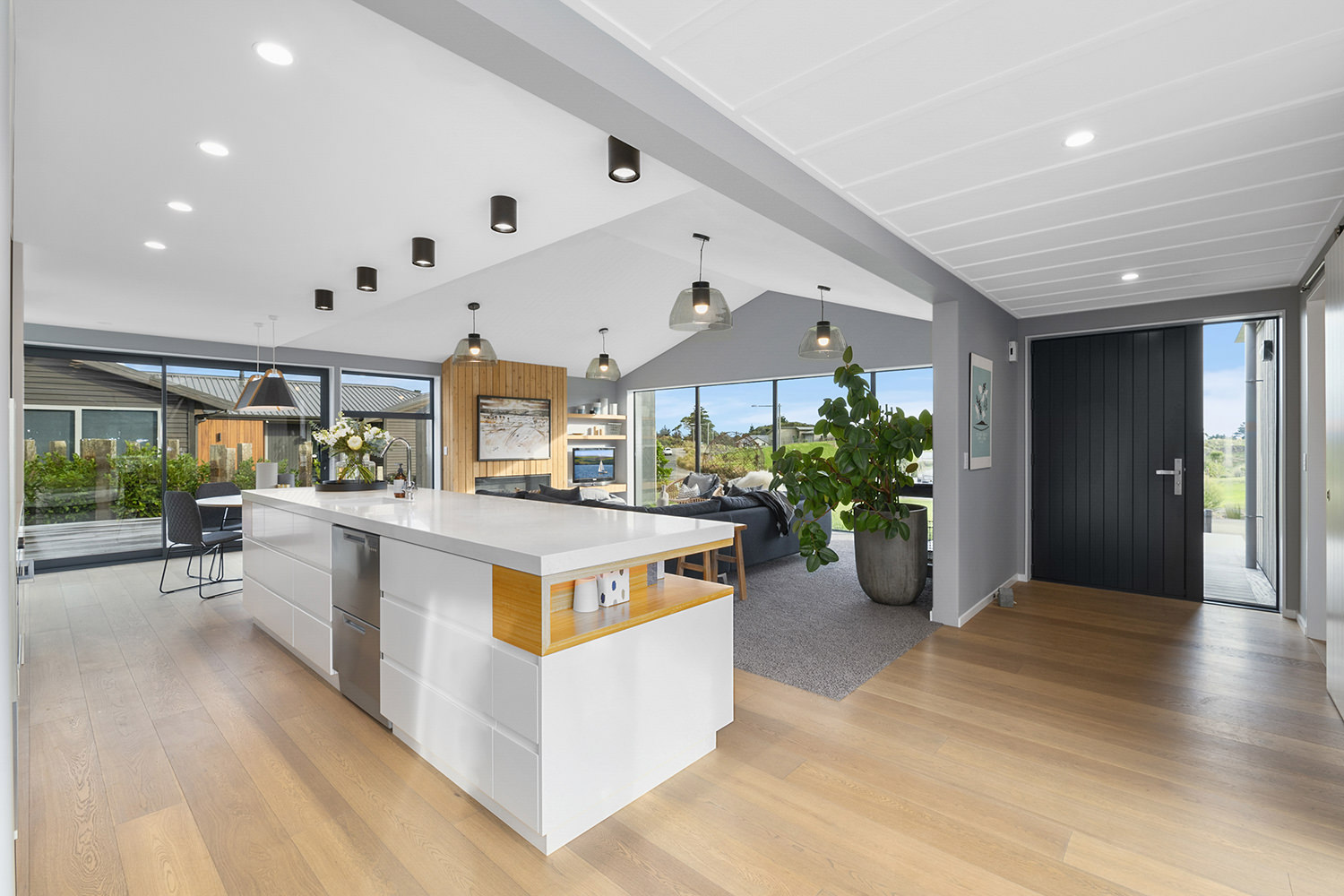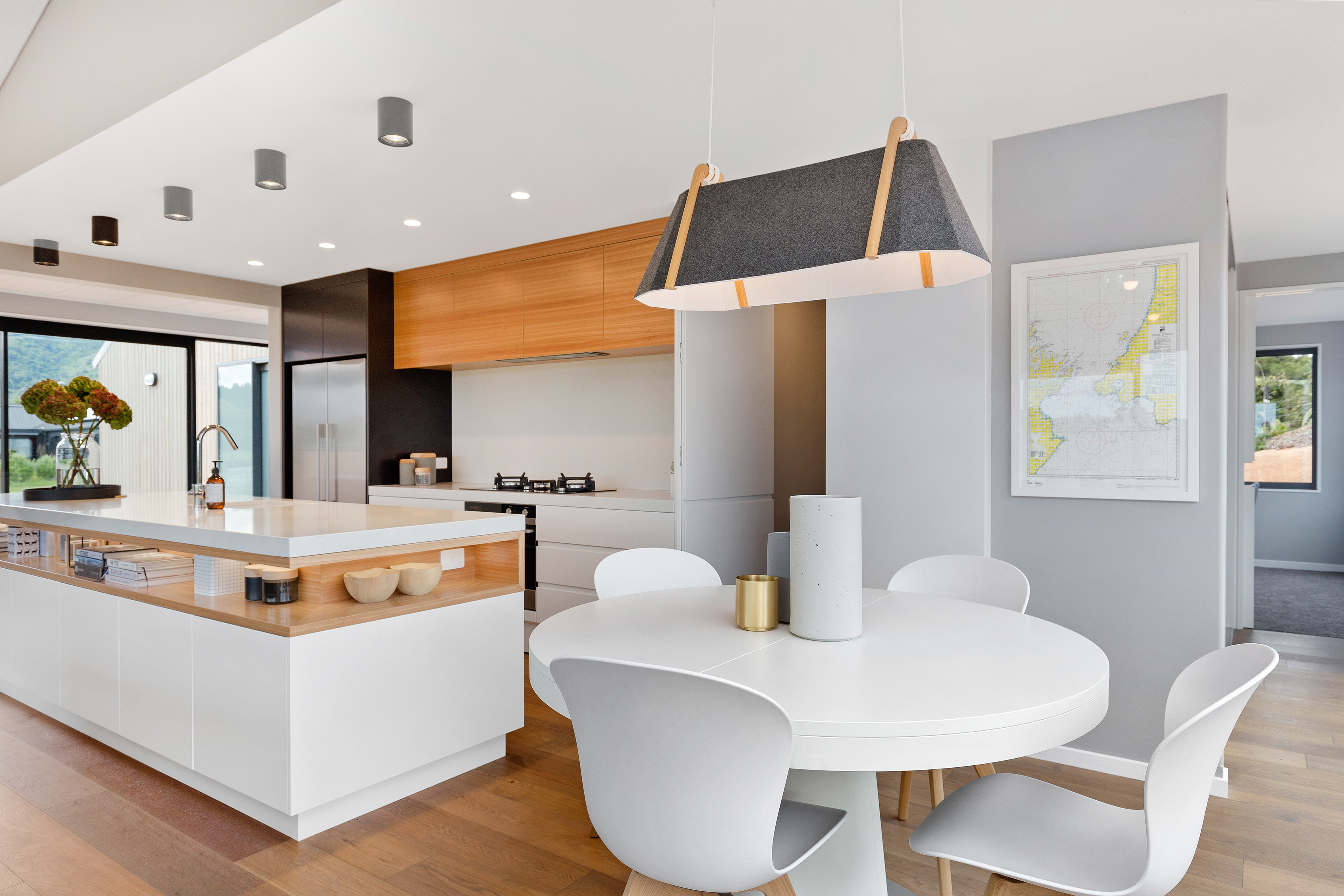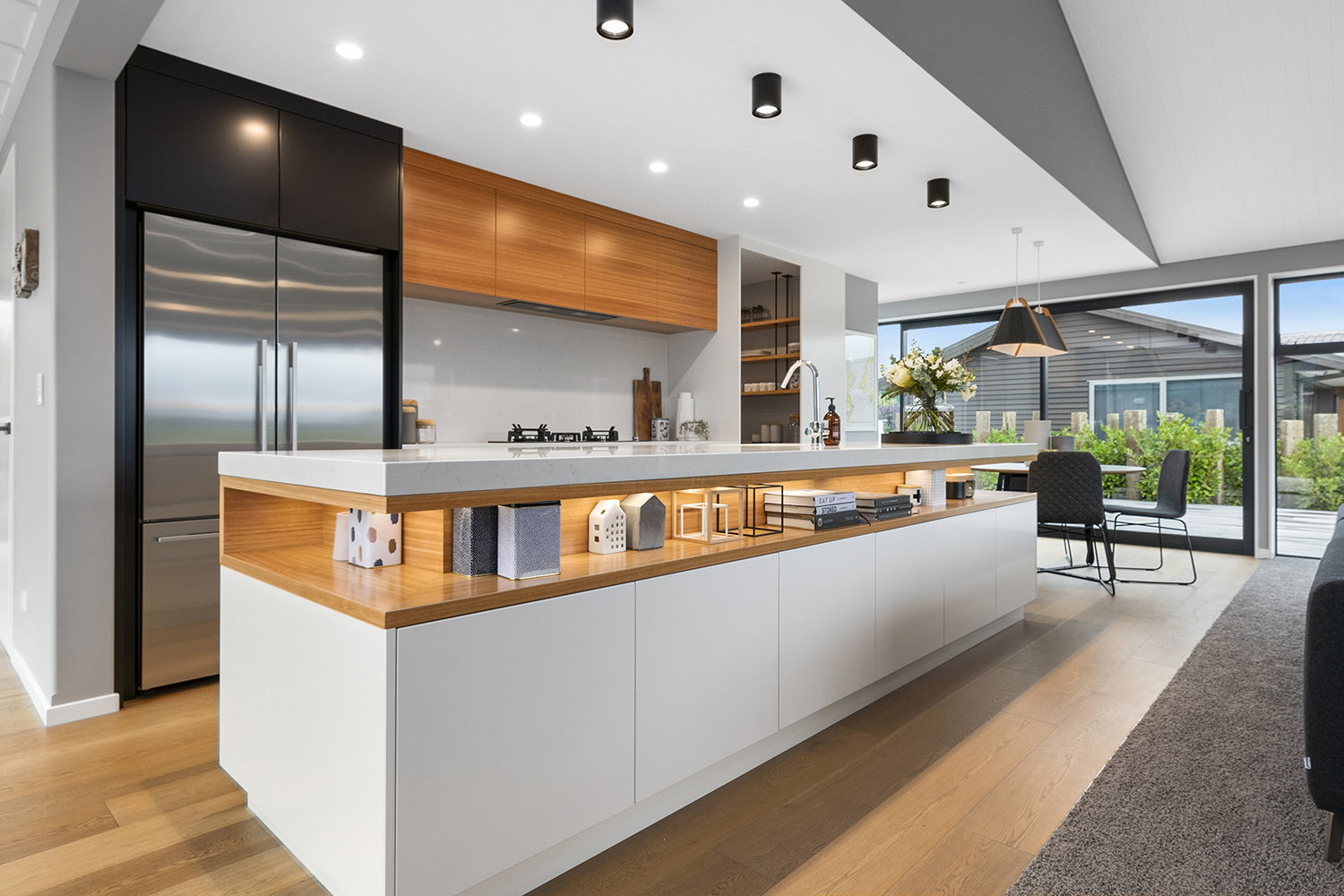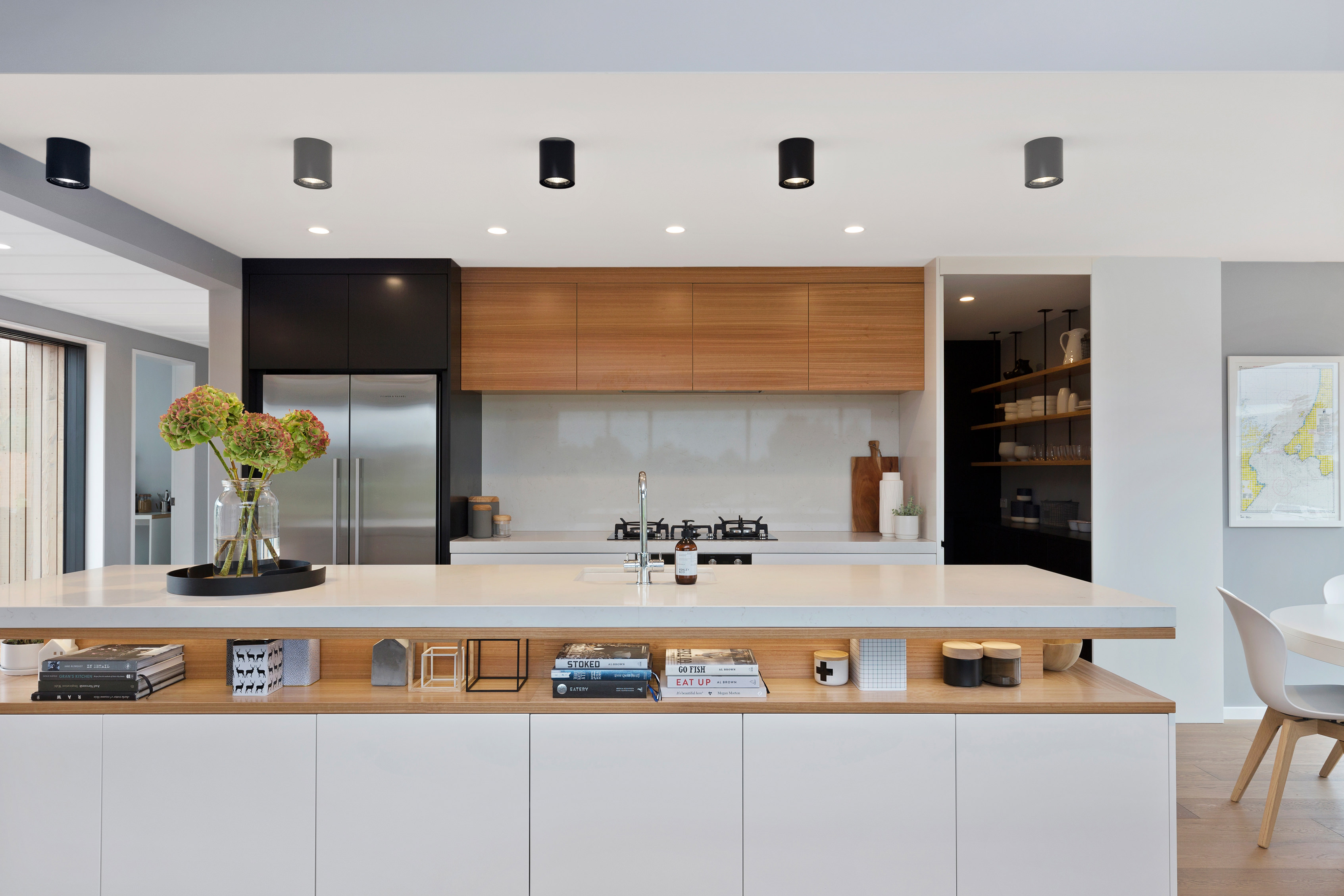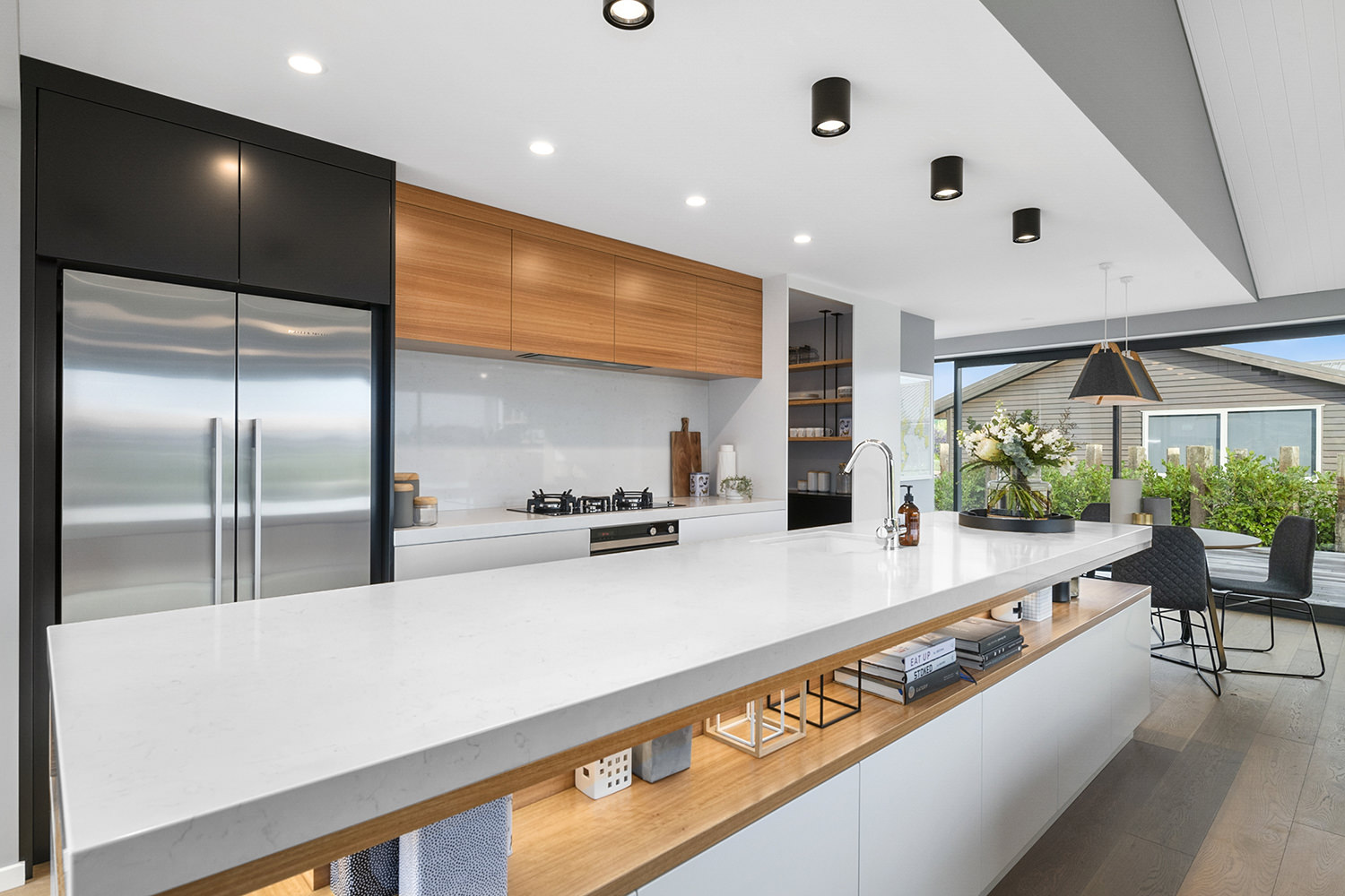 The generous kitchen boasts silky semi-gloss and ultra matte joinery. This contrasts with accents of ash timber, creating a warm and welcoming hub for entertaining. The generously sized island bench houses cabinets on both sides for maximum storage. The walk-in pantry holds more storage with a combination of glass doors, black cabinetry and open timber shelving.