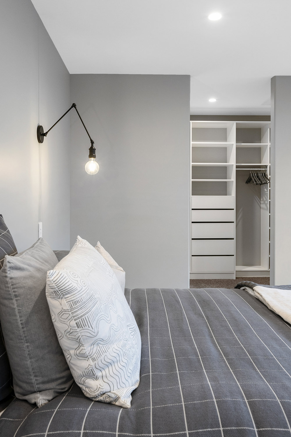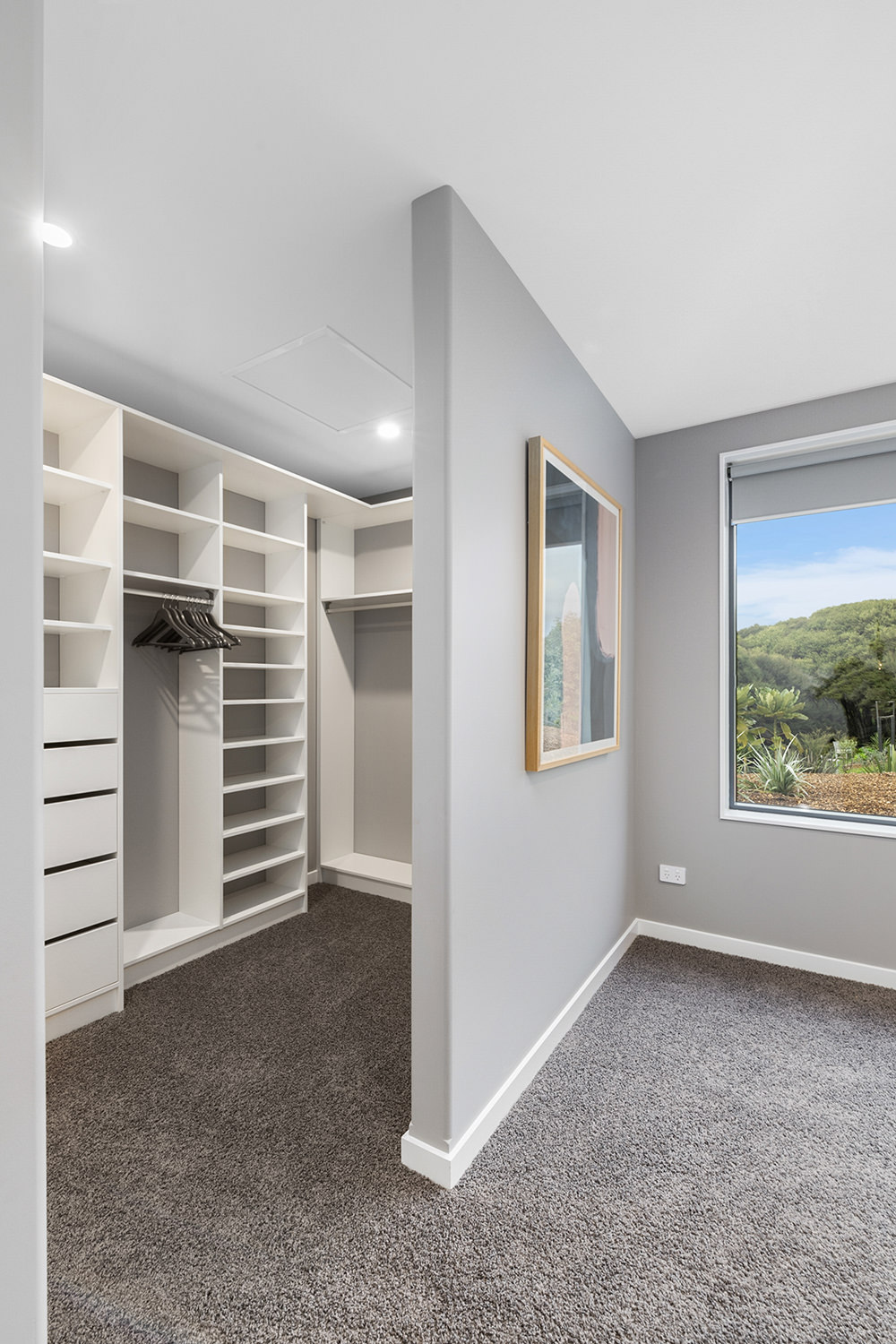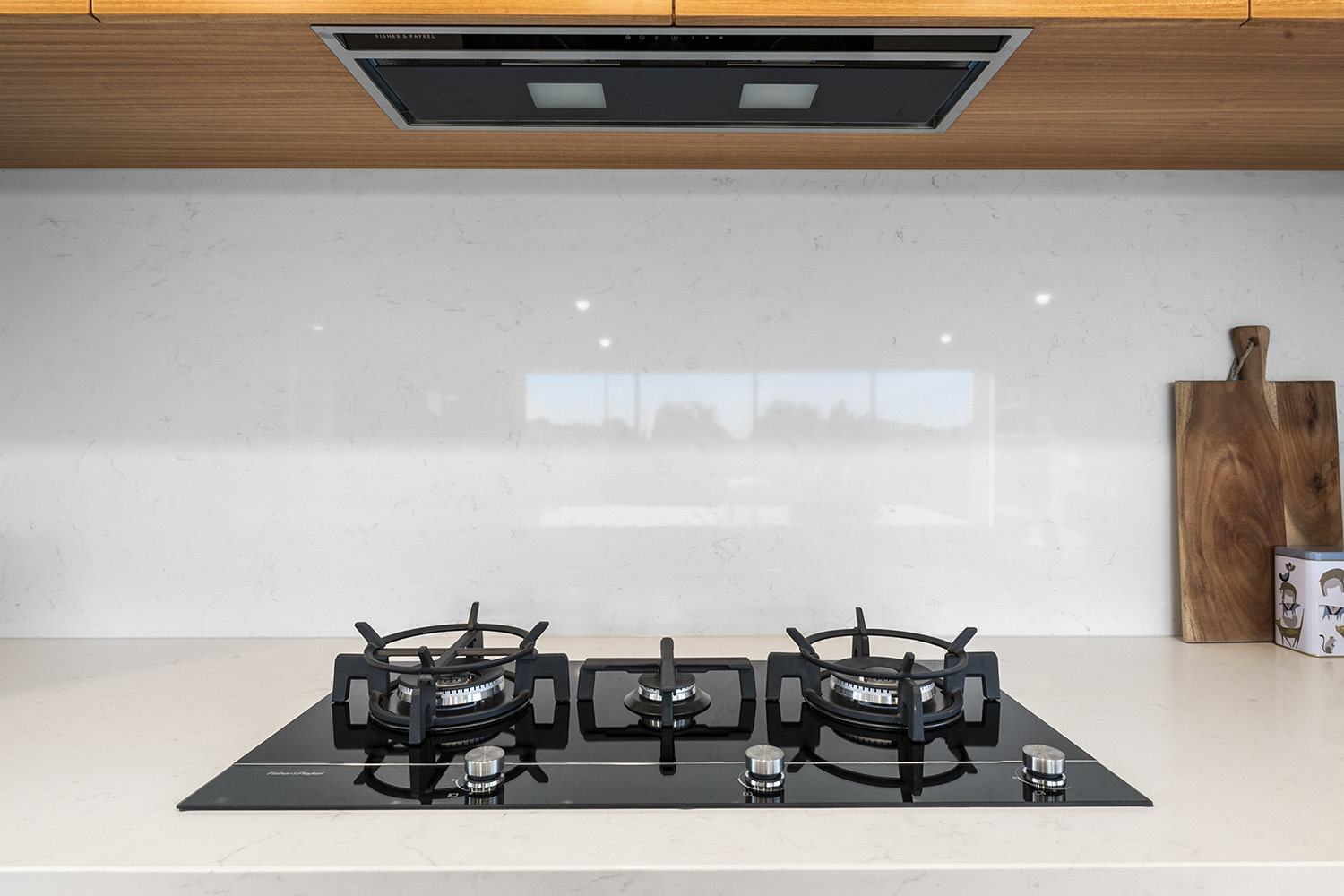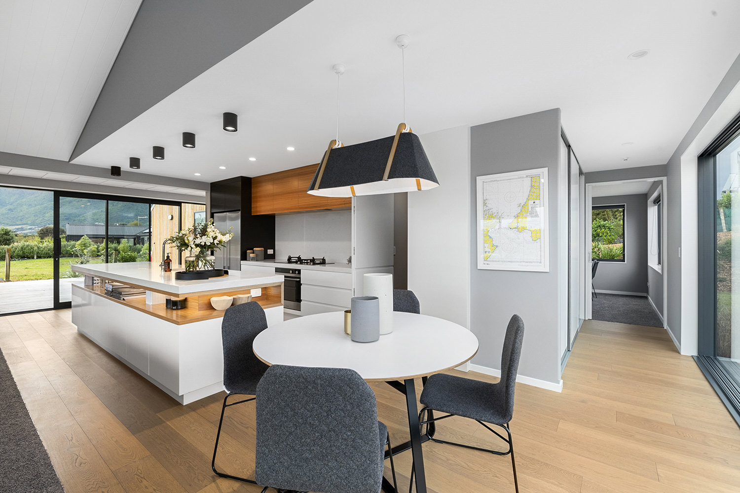 The generous kitchen boasts silky semi-gloss and ultra matte joinery. This contrasts with accents of ash timber, creating a warm and welcoming hub for entertaining. The generously sized island bench houses cabinets on both sides for maximum storage. The walk-in pantry holds more storage with a combination of glass doors, black cabinetry and open timber shelving.