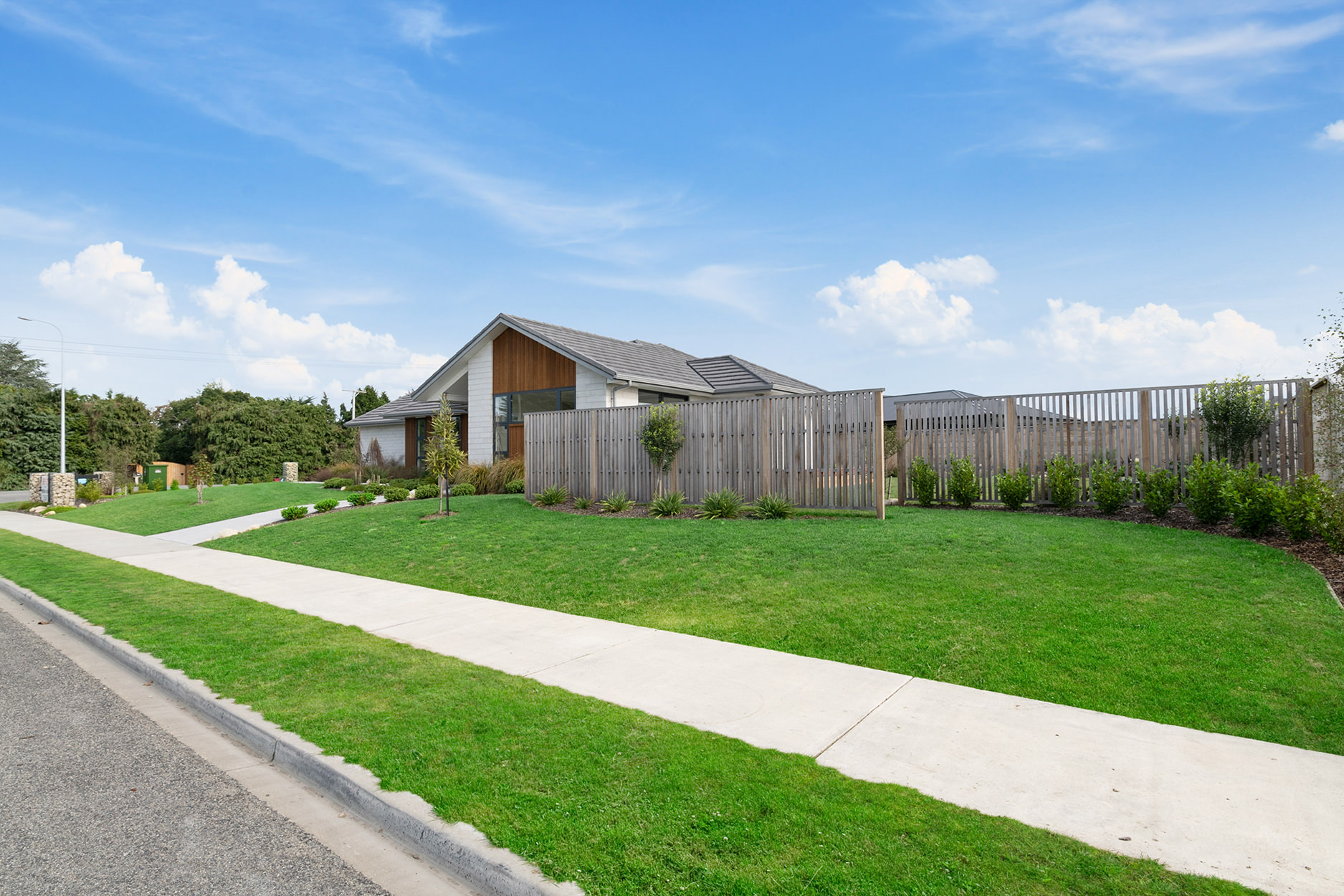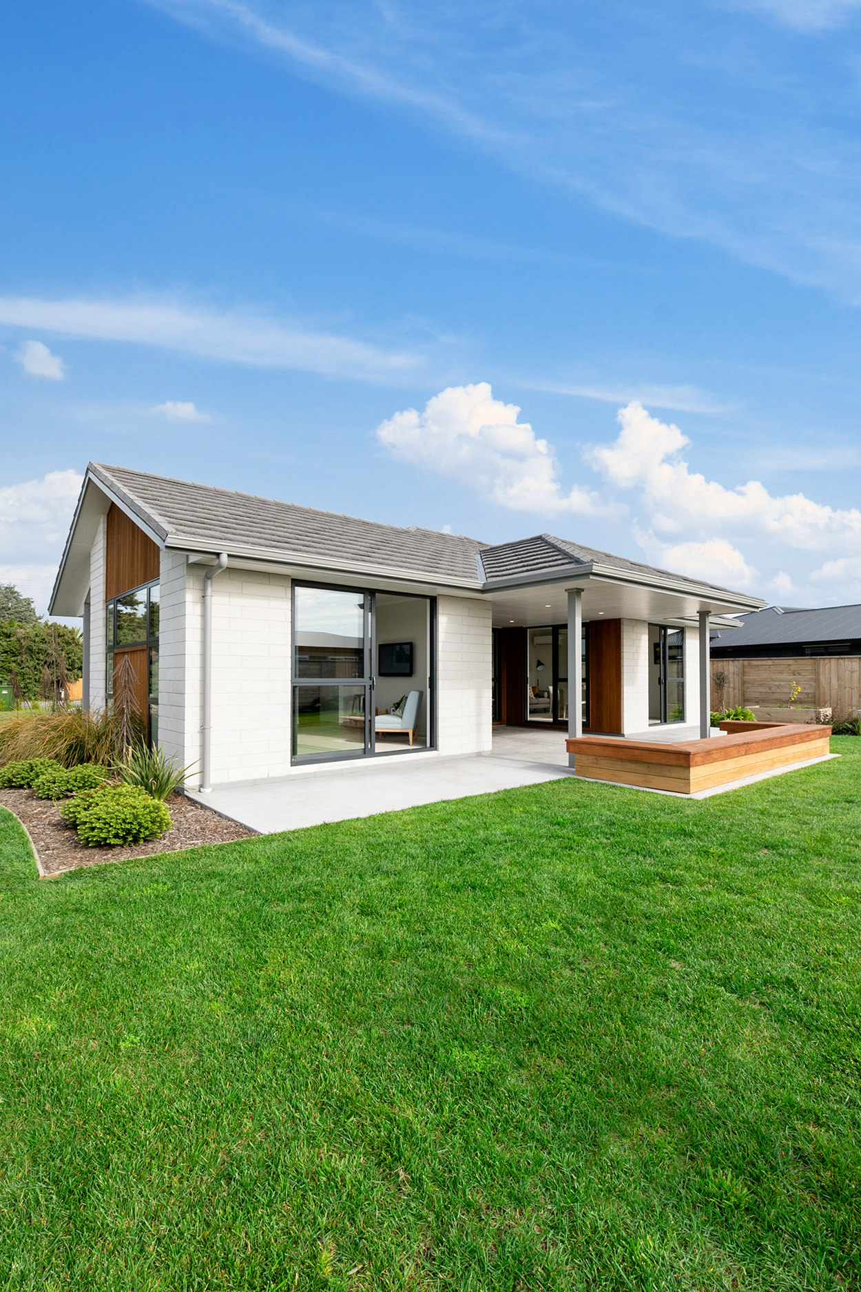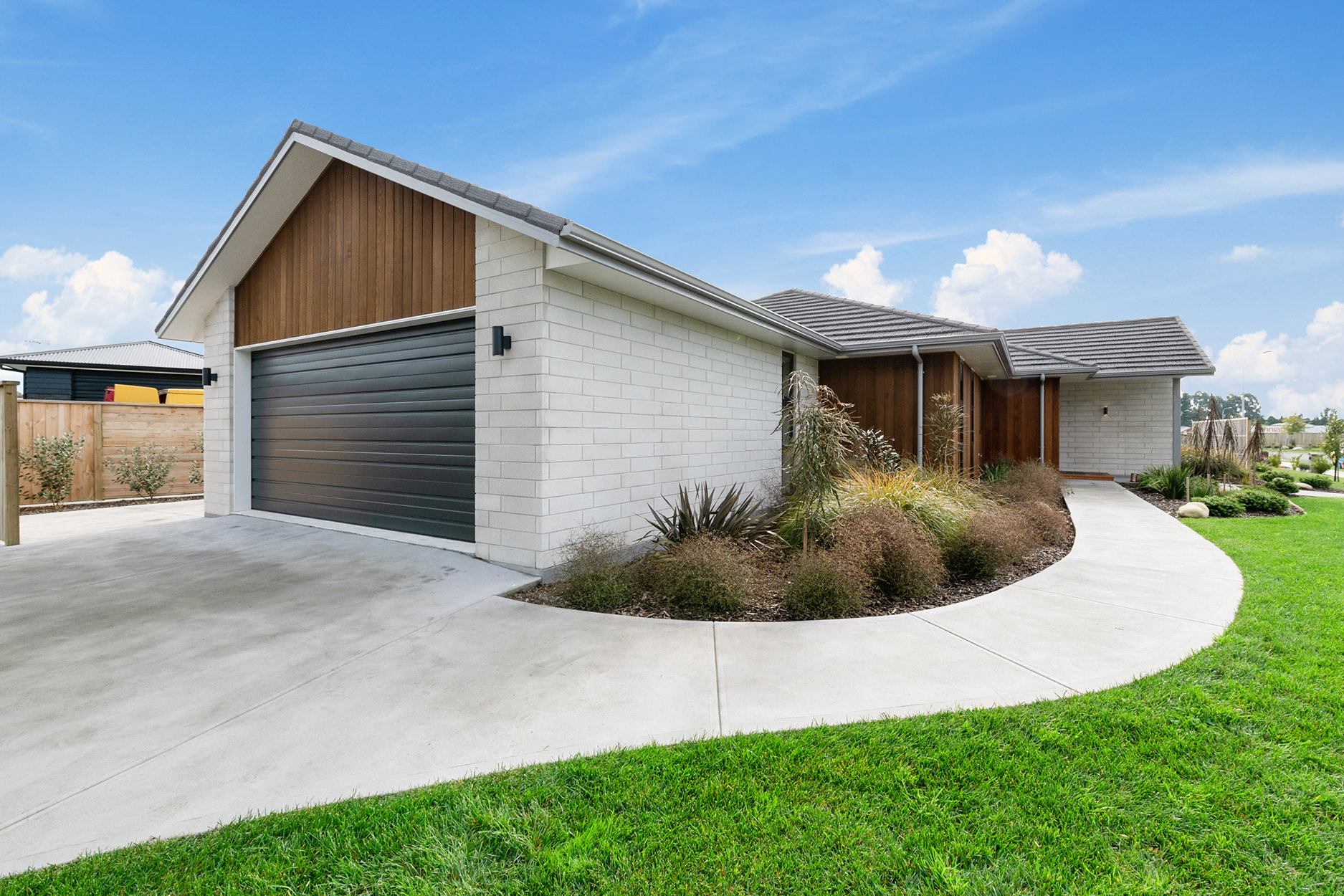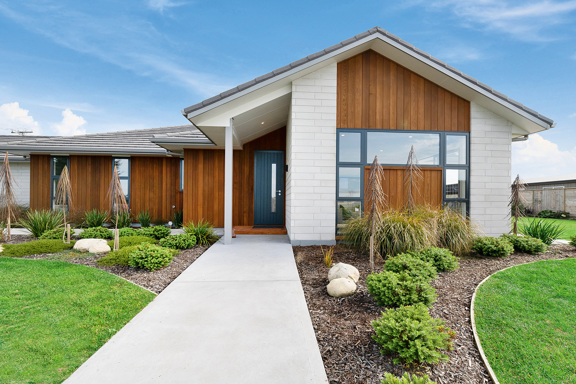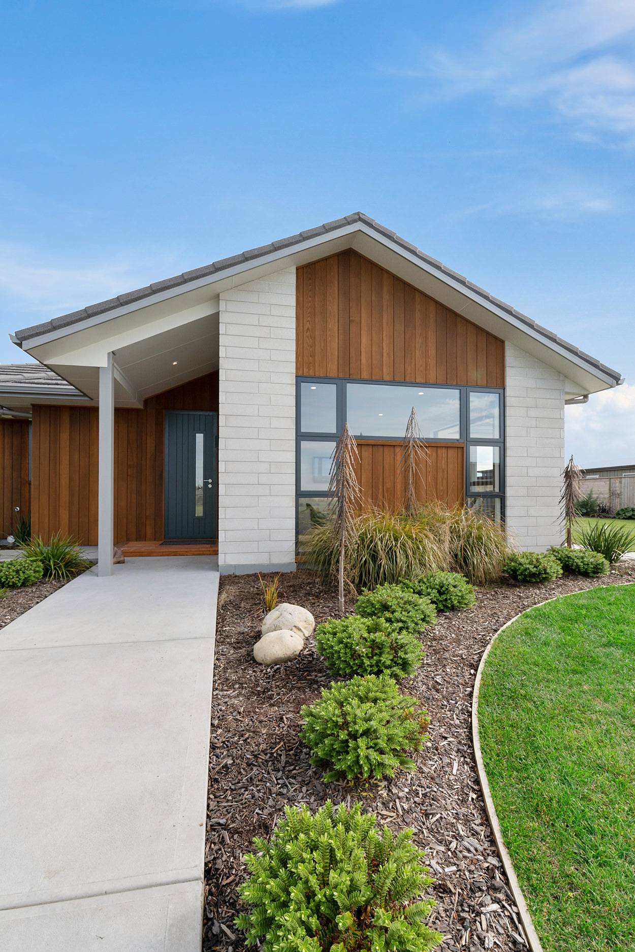 An eye-catching combination of white brick and vertical cedar sets this display home apart from the crowd. Unique and modern window designs lend undeniable street appeal.