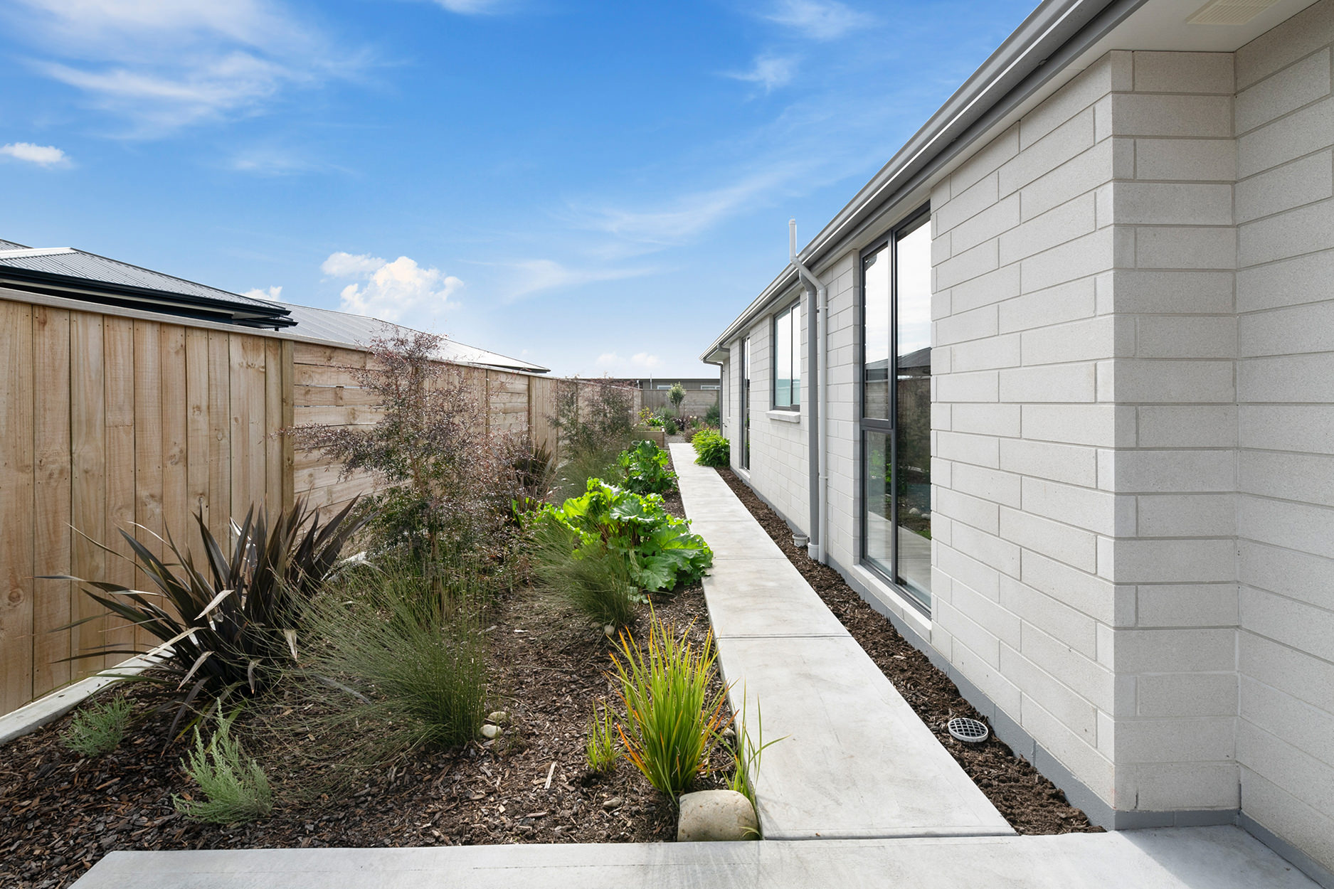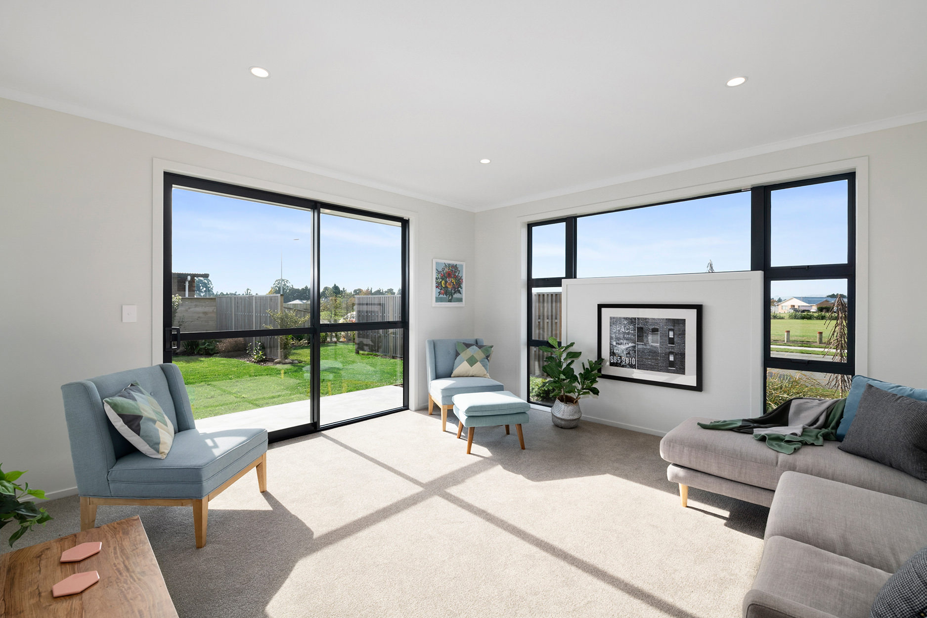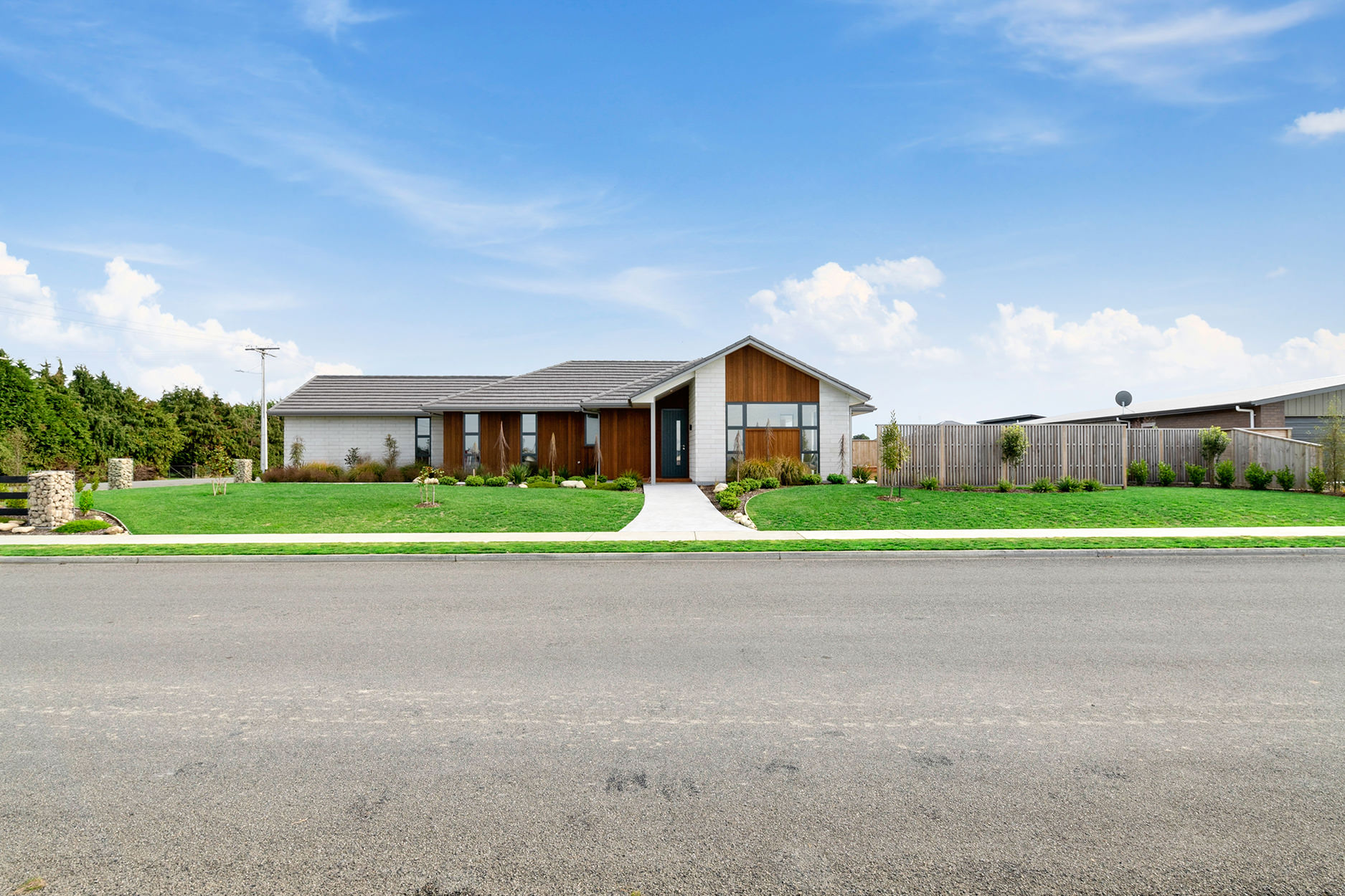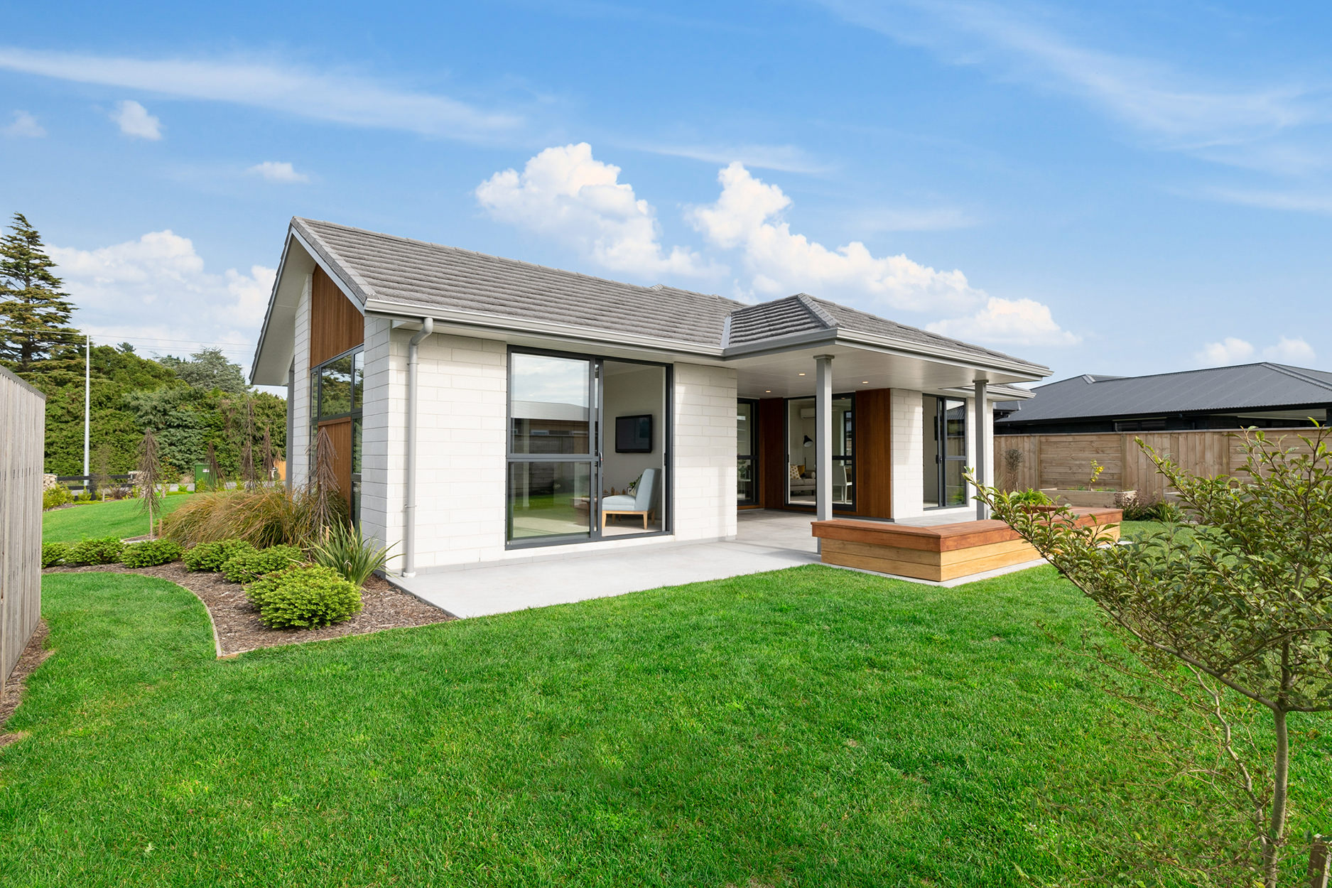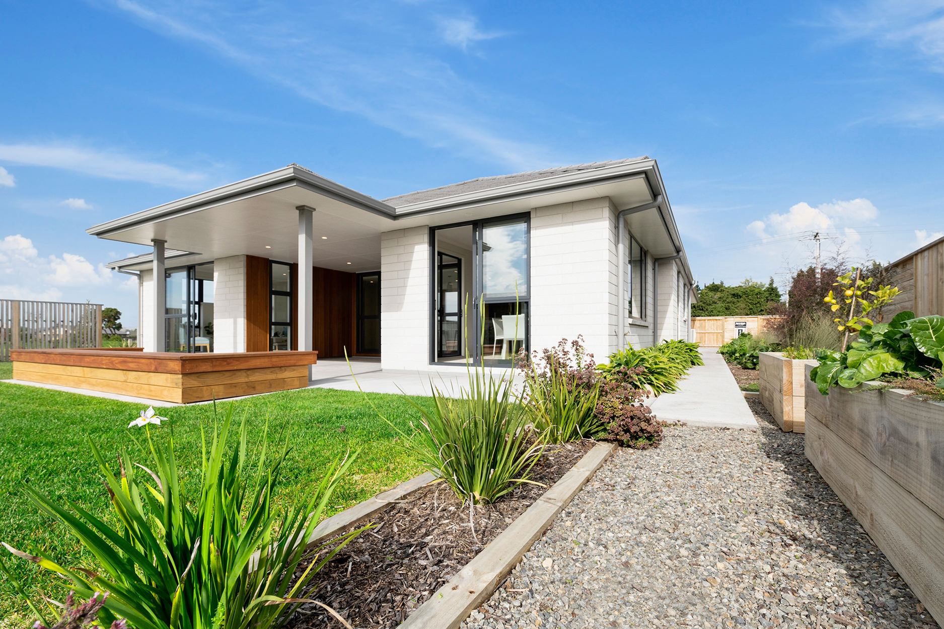 An eye-catching combination of white brick and vertical cedar sets this display home apart from the crowd. Unique and modern window designs lend undeniable street appeal.