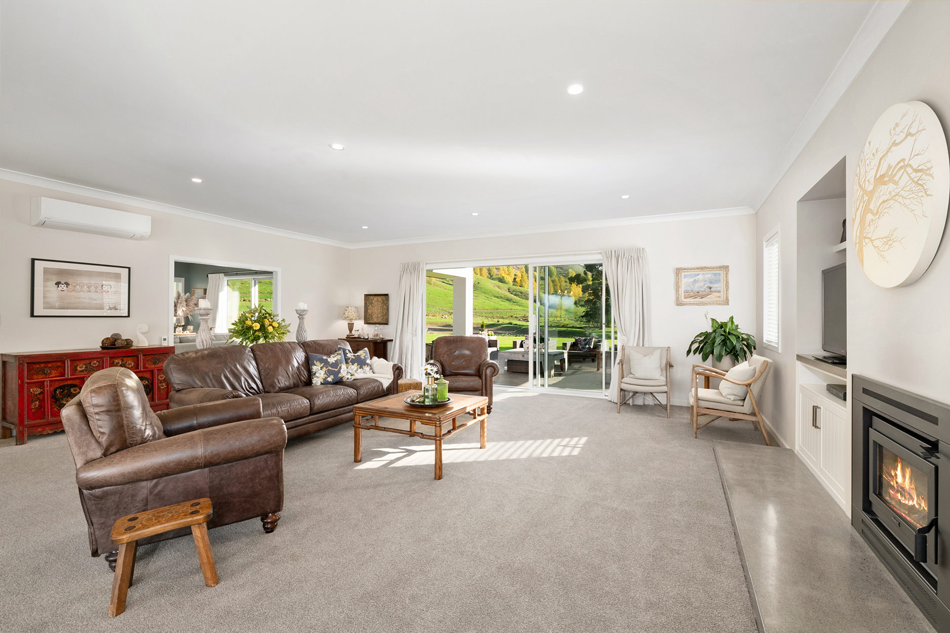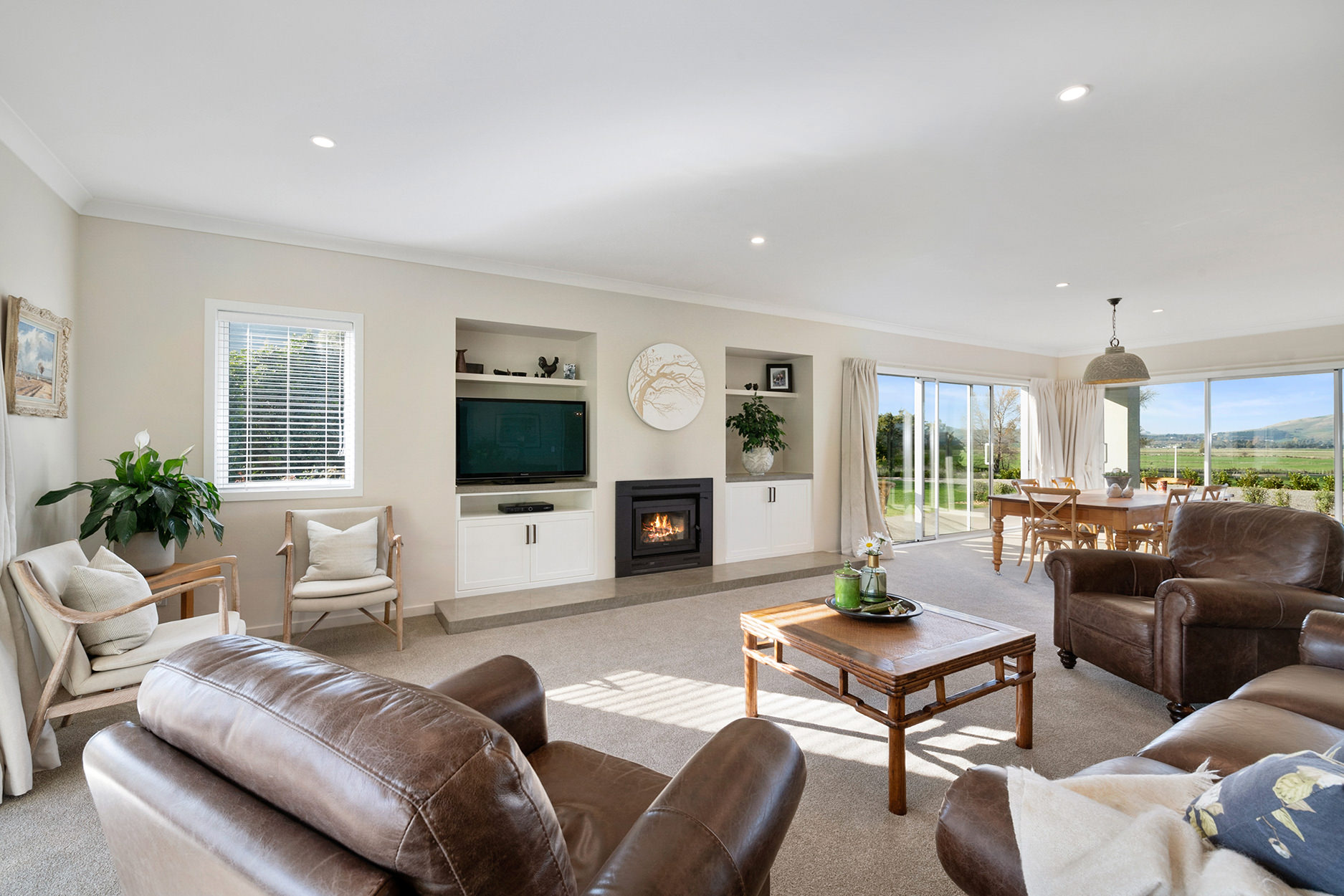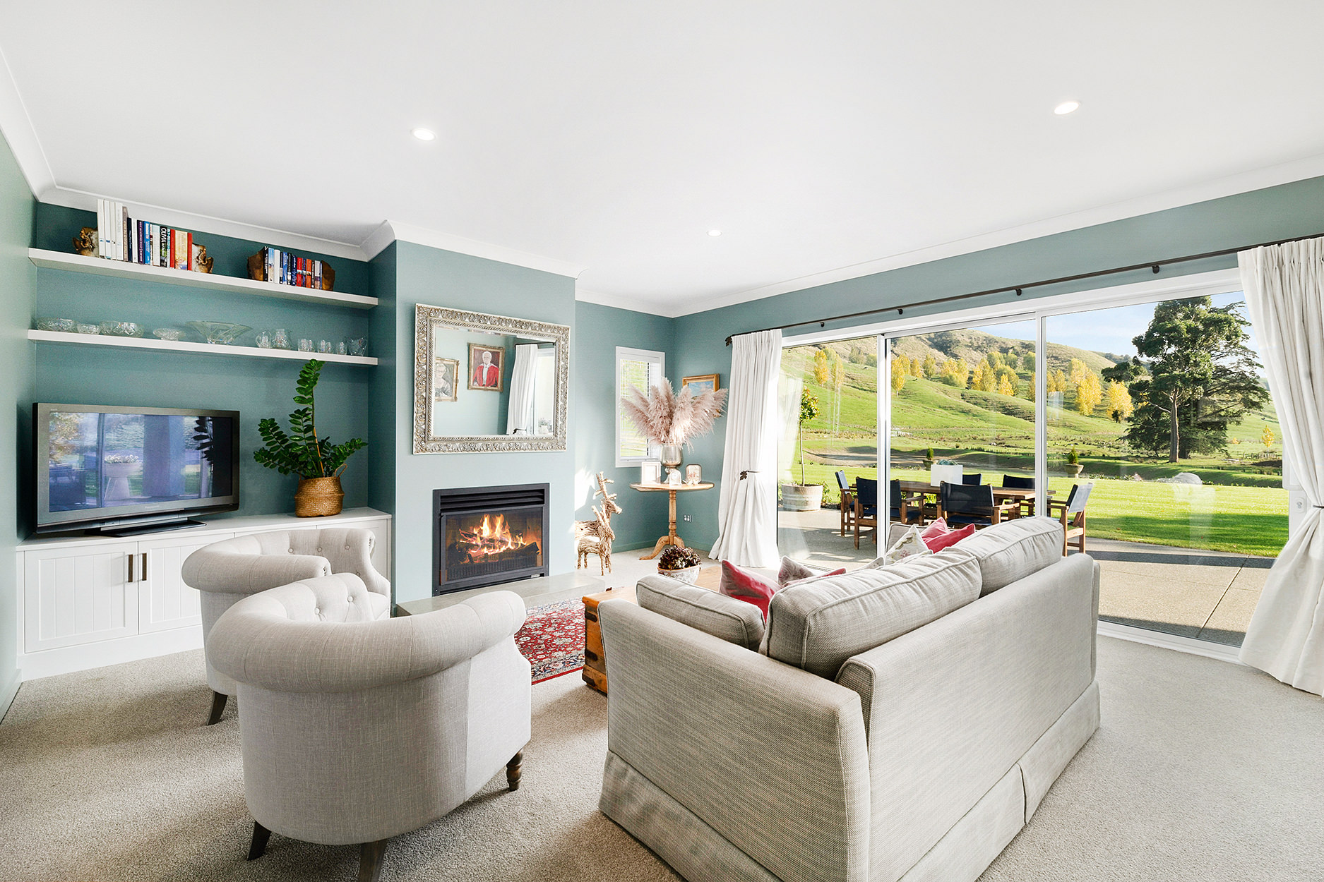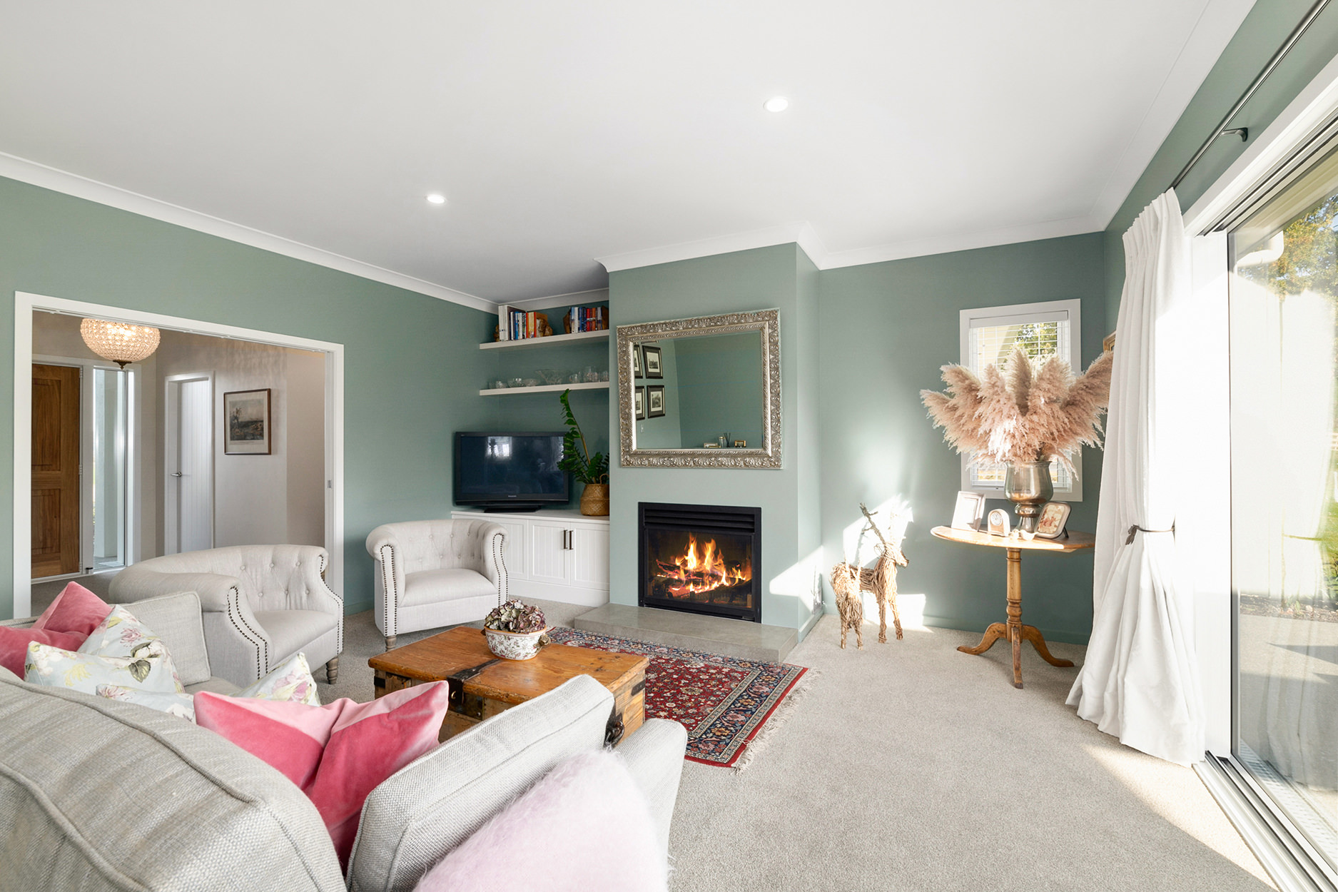 A wonderful woodburner, framed by custom joinery, is a fiery focal point in the generous open-plan living and kitchen area. A separate lounge, with a fireplace of its own, provides a quiet retreat from the shared living space.