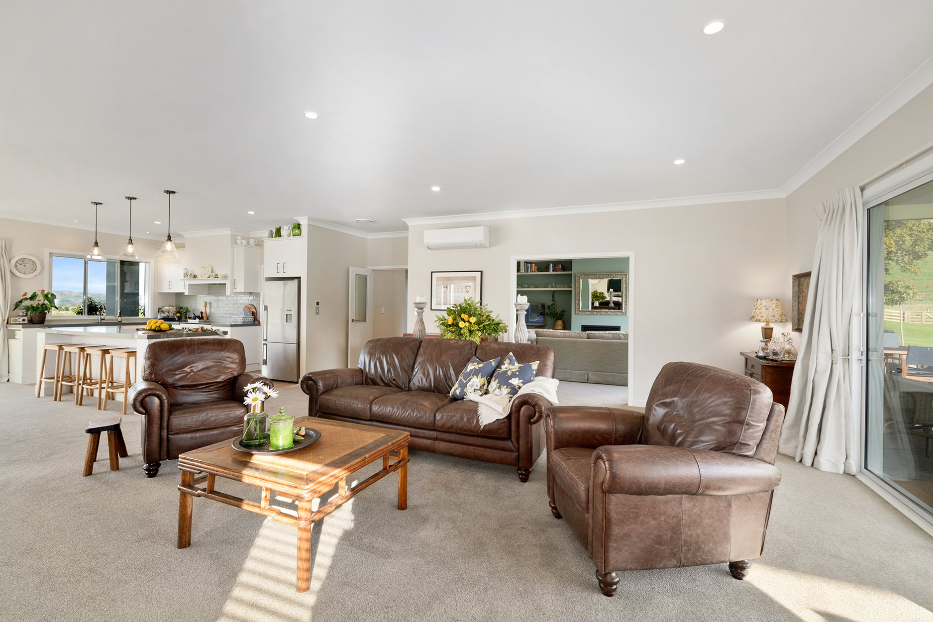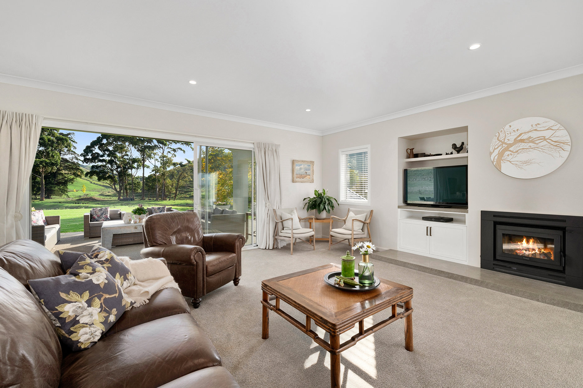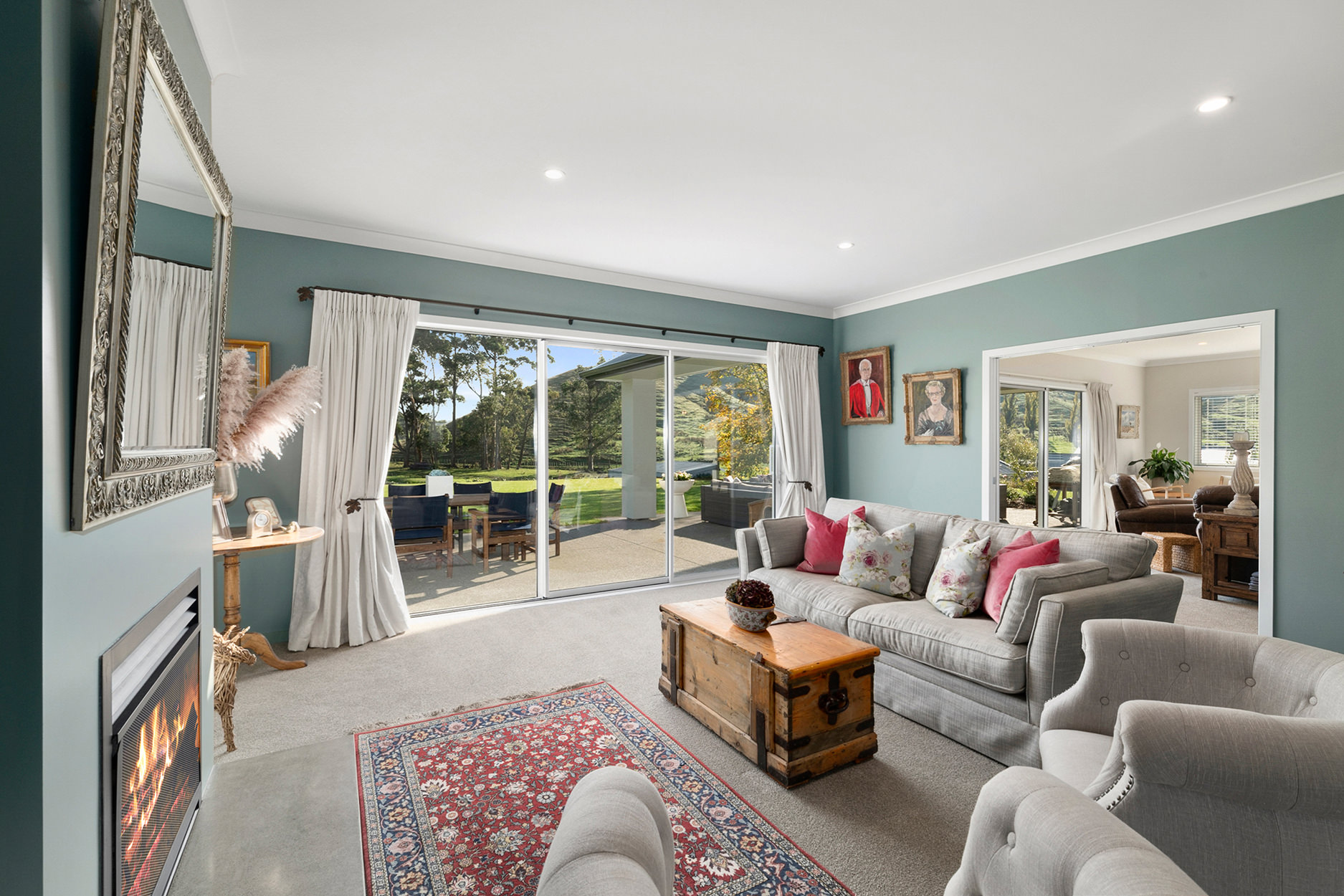 A wonderful woodburner, framed by custom joinery, is a fiery focal point in the generous open-plan living and kitchen area. A separate lounge, with a fireplace of its own, provides a quiet retreat from the shared living space.