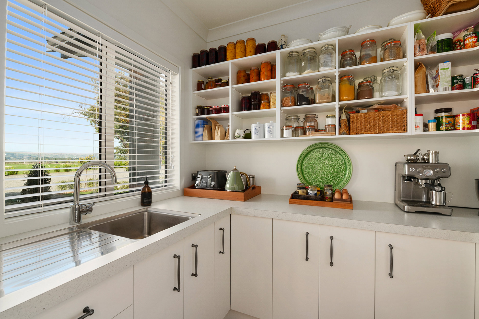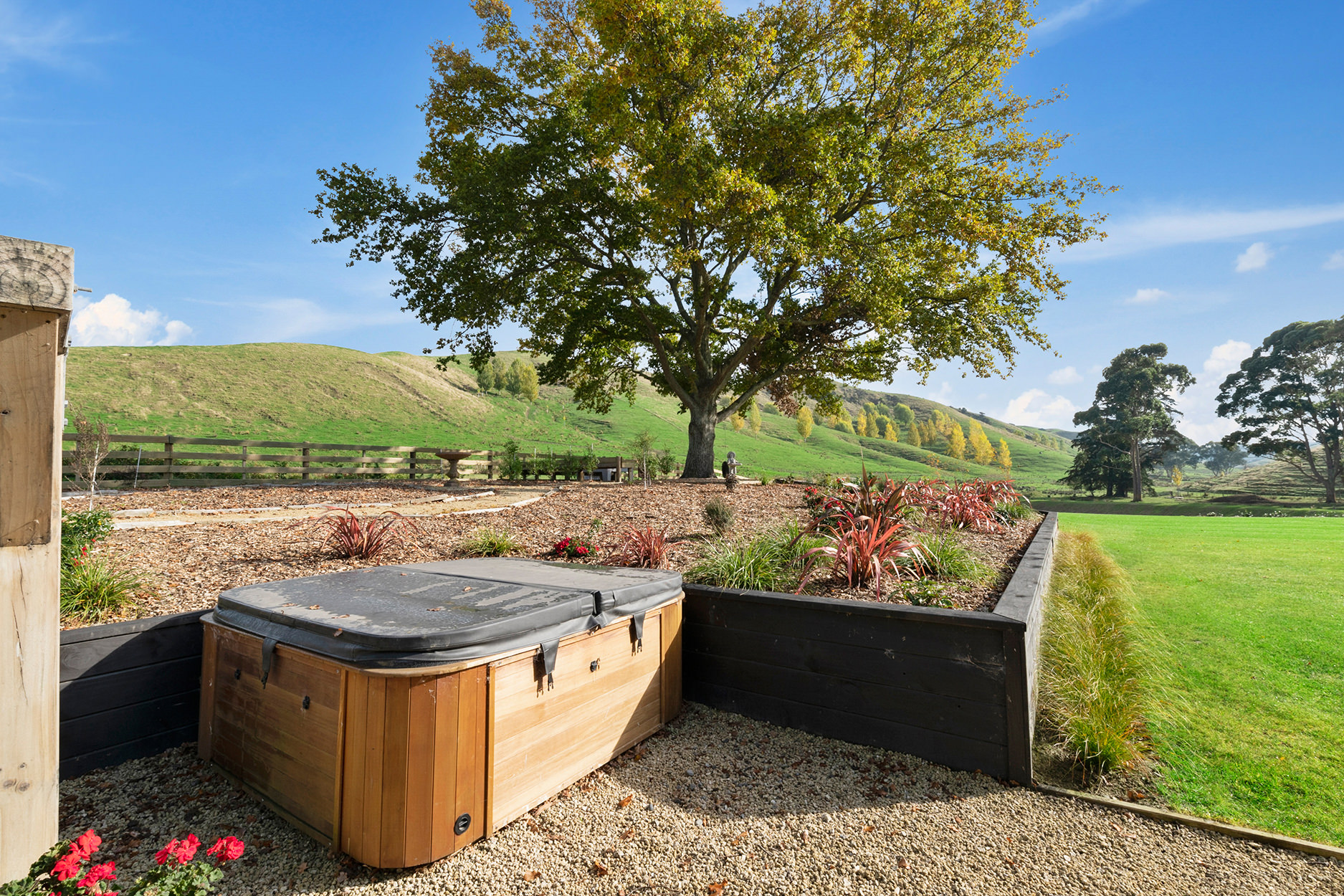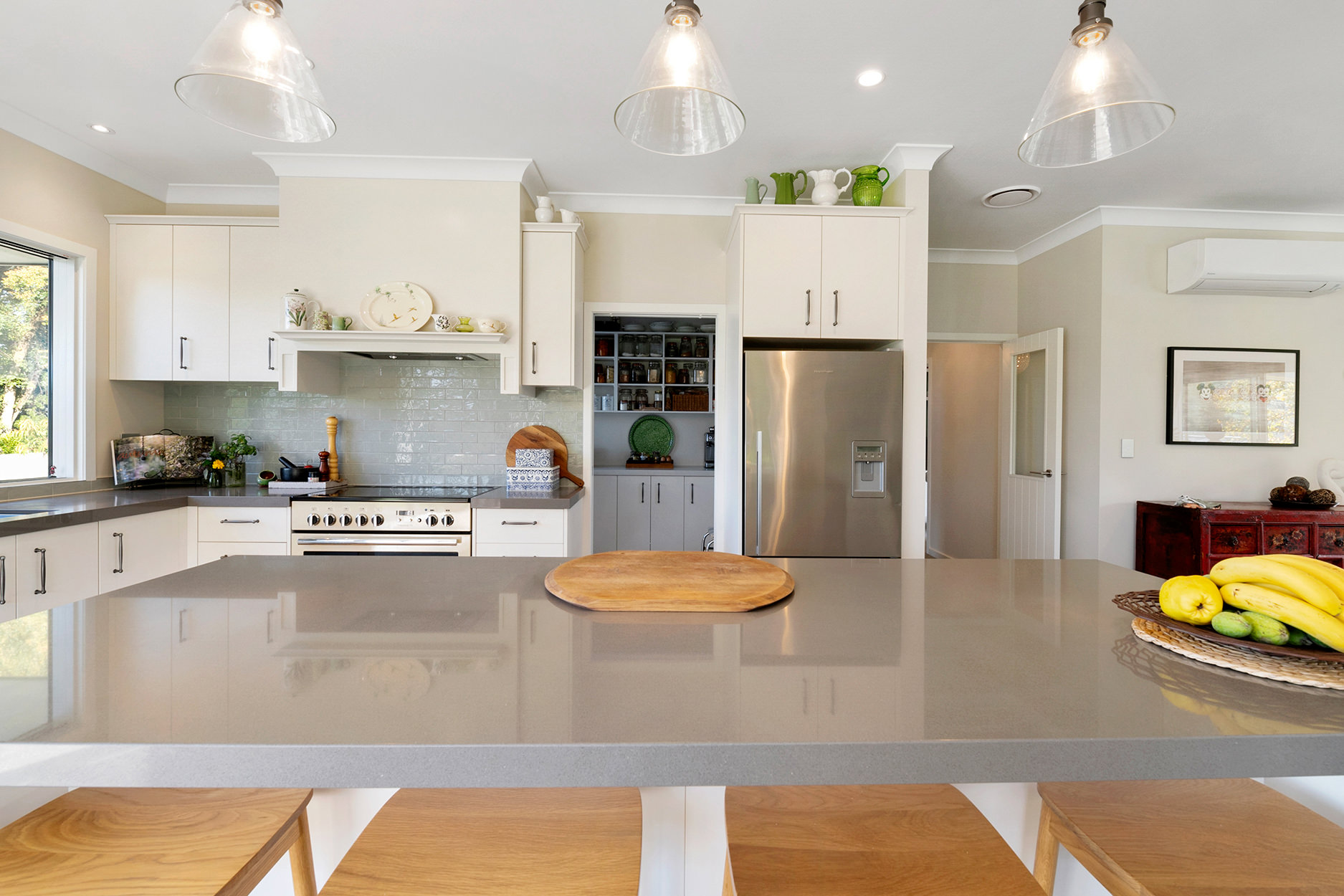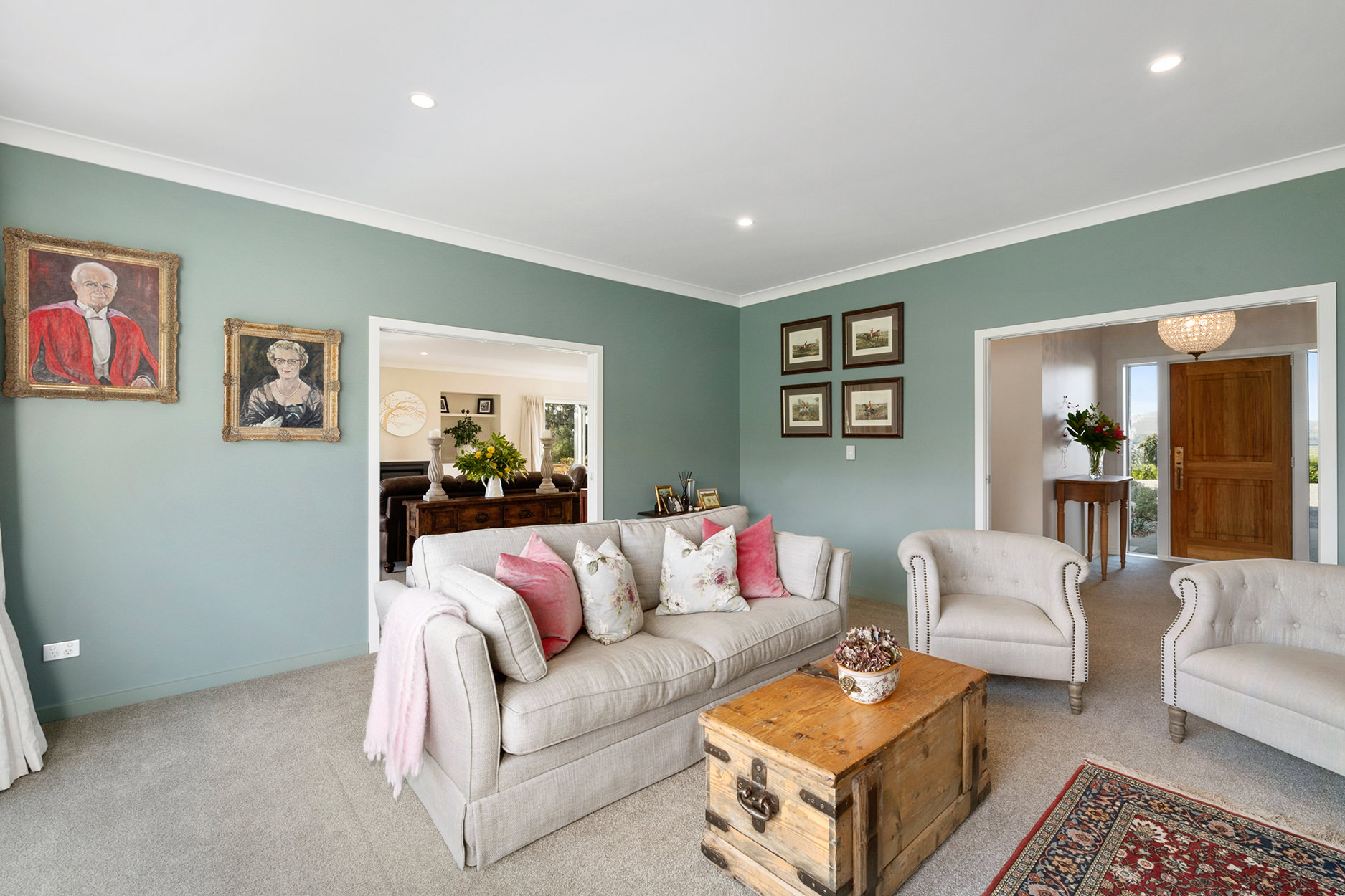 A wonderful woodburner, framed by custom joinery, is a fiery focal point in the generous open-plan living and kitchen area. A separate lounge, with a fireplace of its own, provides a quiet retreat from the shared living space.