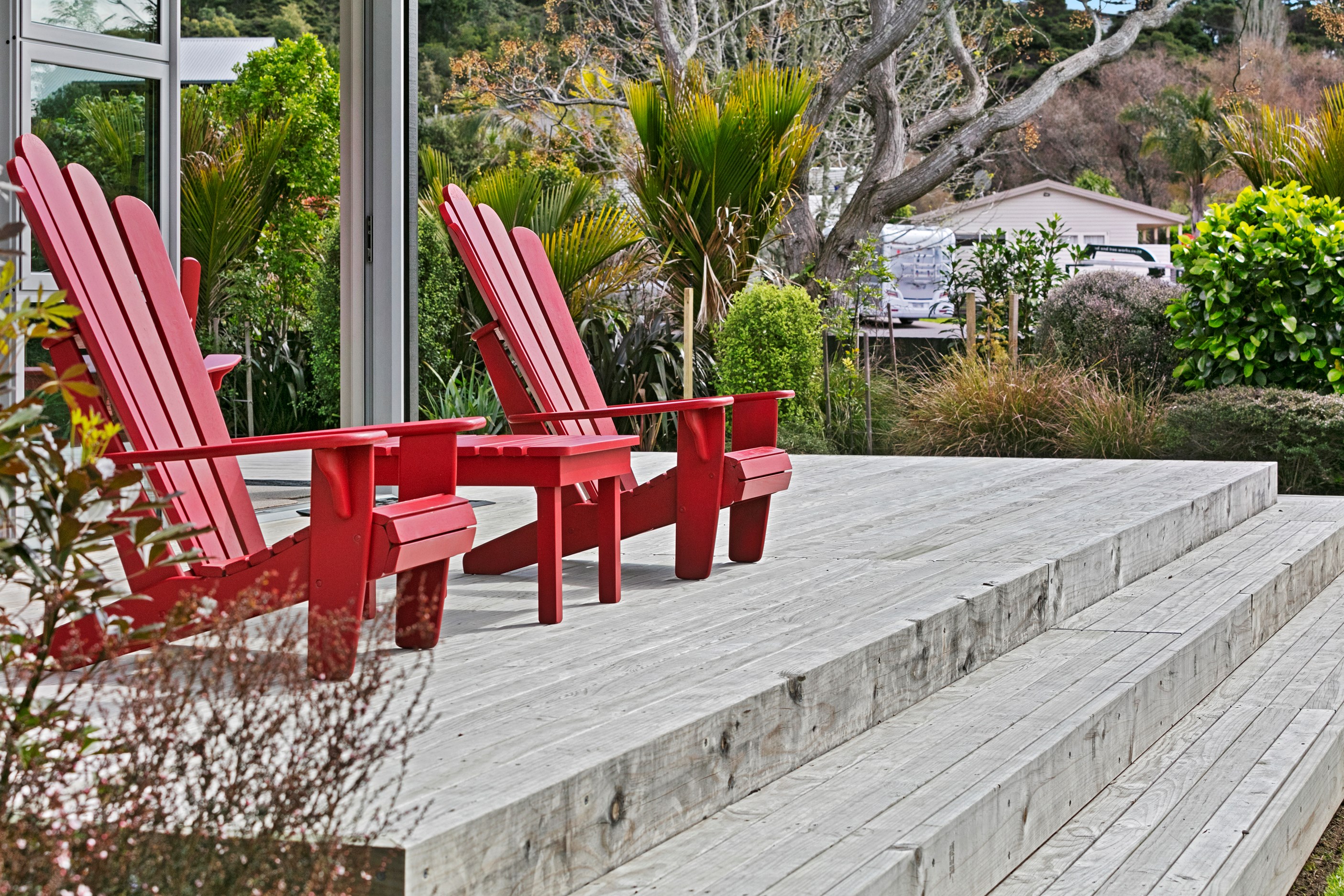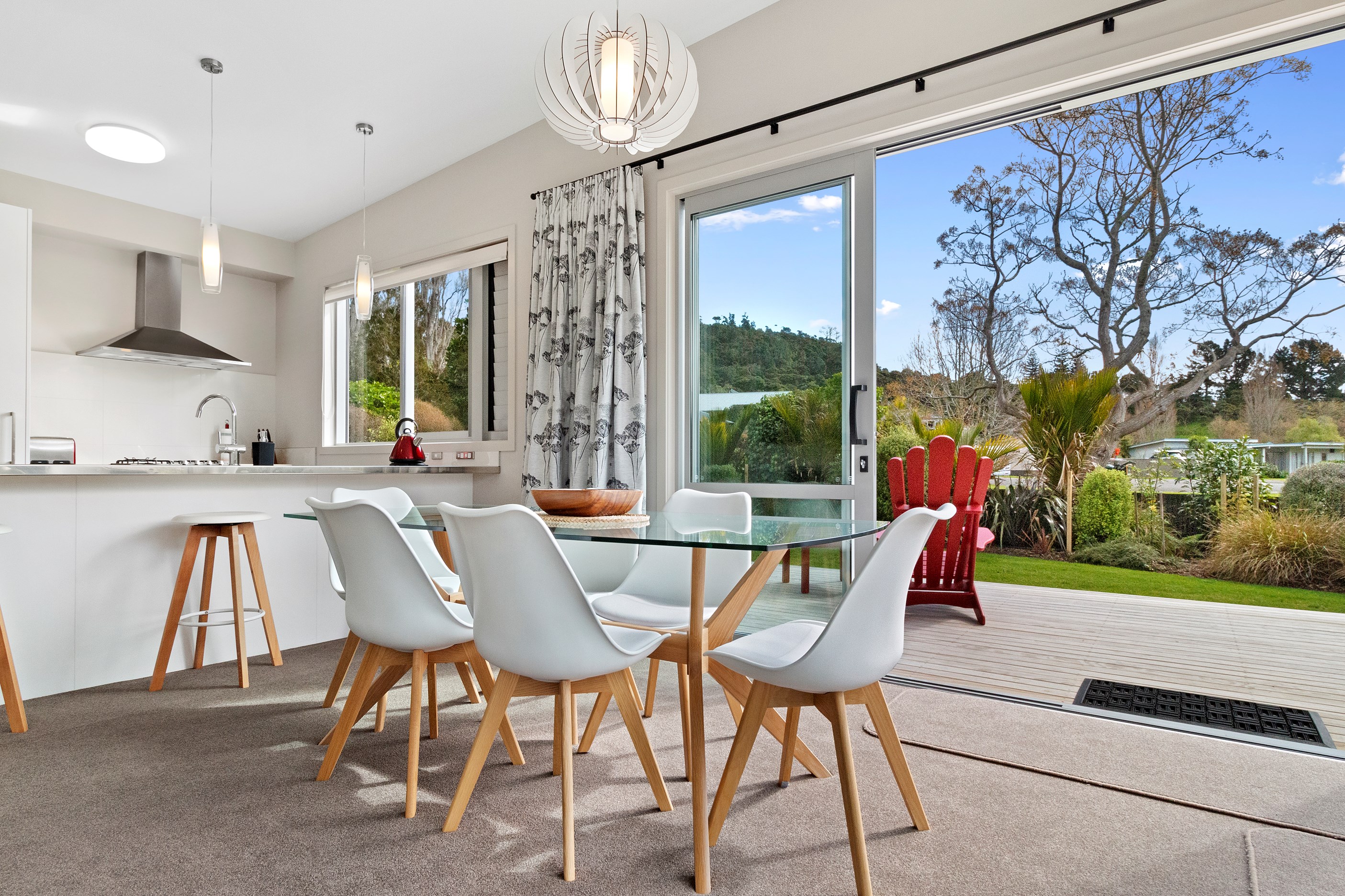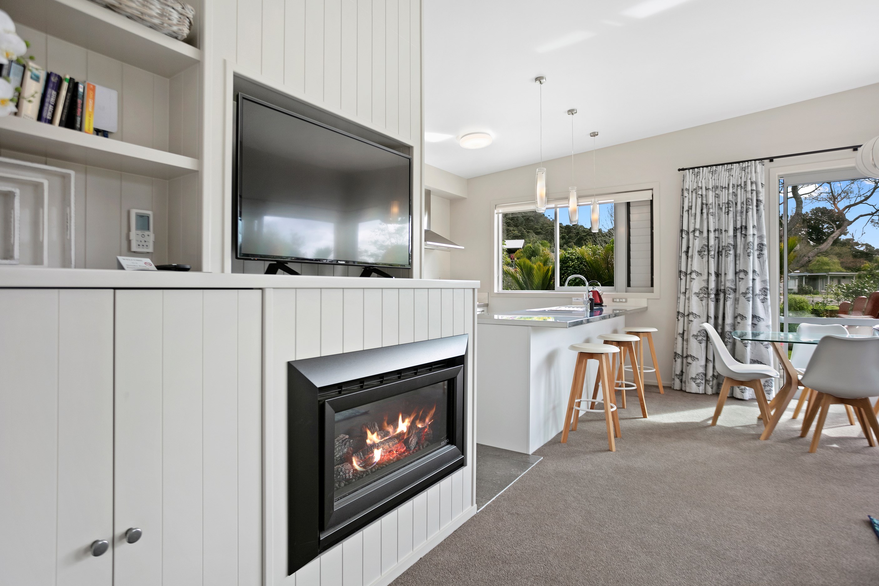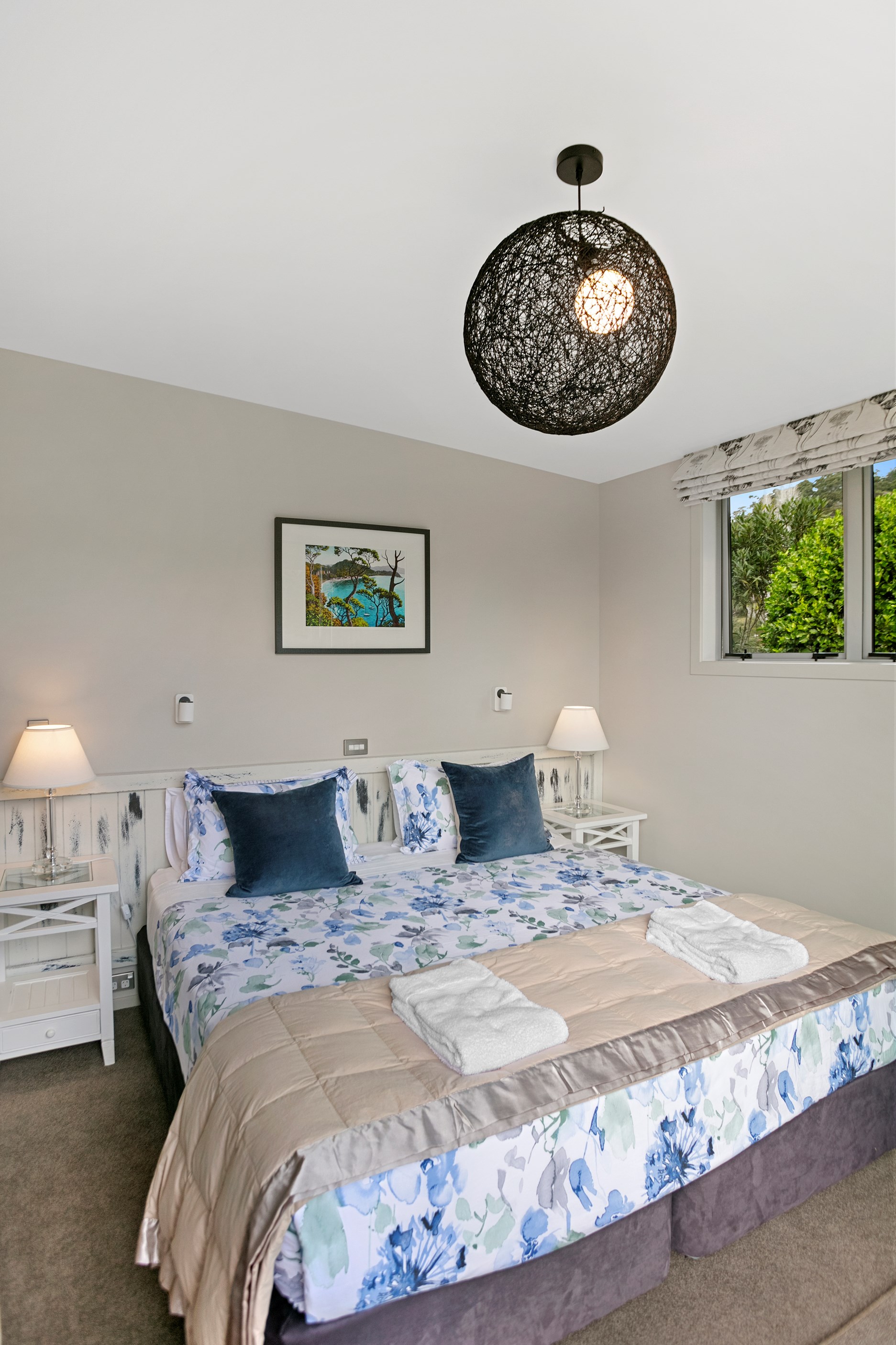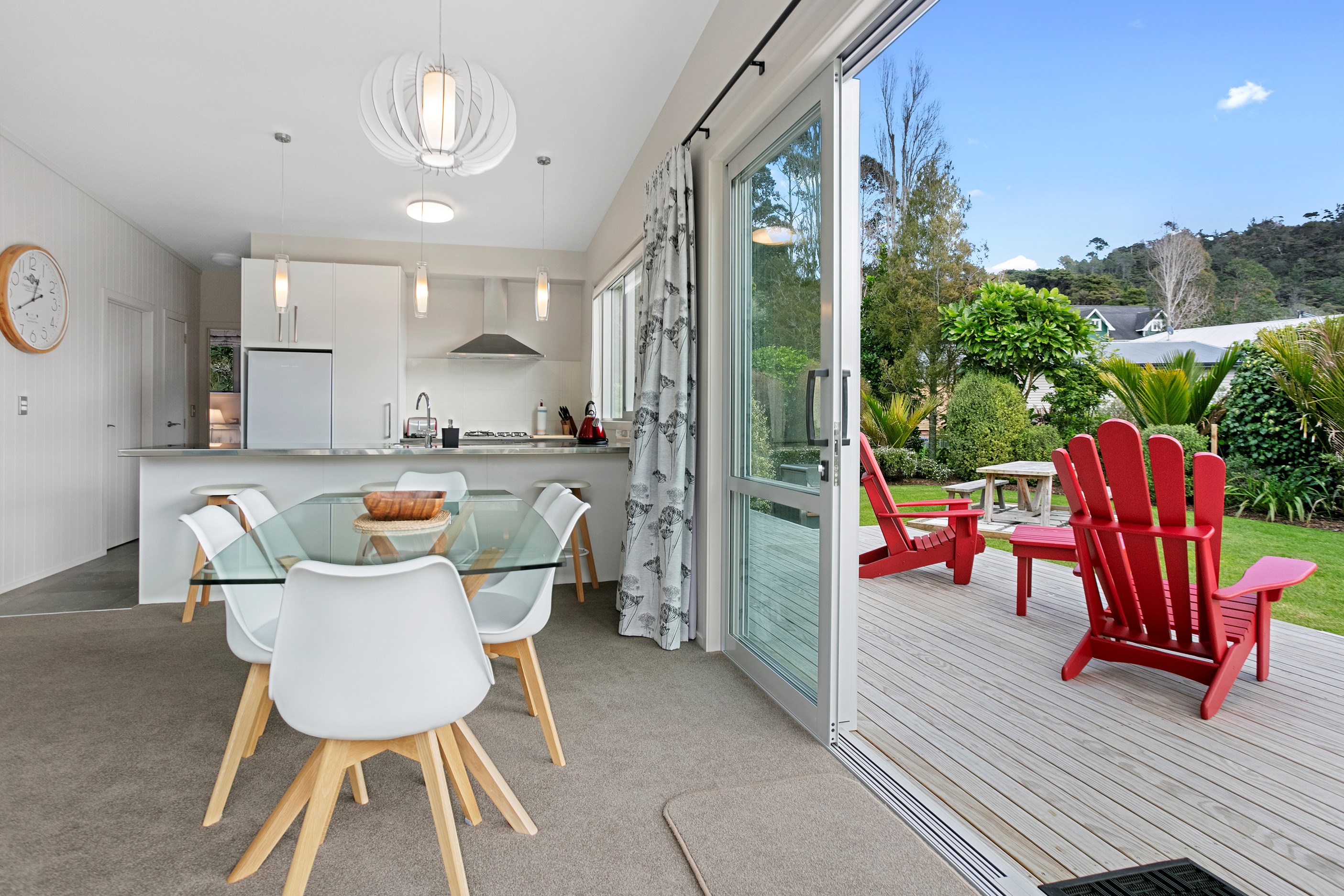 The park is just around the corner from Cooks Beach and a quick ferry ride away from Whitianga. As well as three double bedrooms, the house has two bathrooms and a kitchen with oven, gas hobs and dishwasher. There’s open-plan living with a smart TV and gas fireplace for cosy winter getaways. Slide open the doors and walk onto the large wraparound deck with a barbecue and steps leading to a lawn with seating.