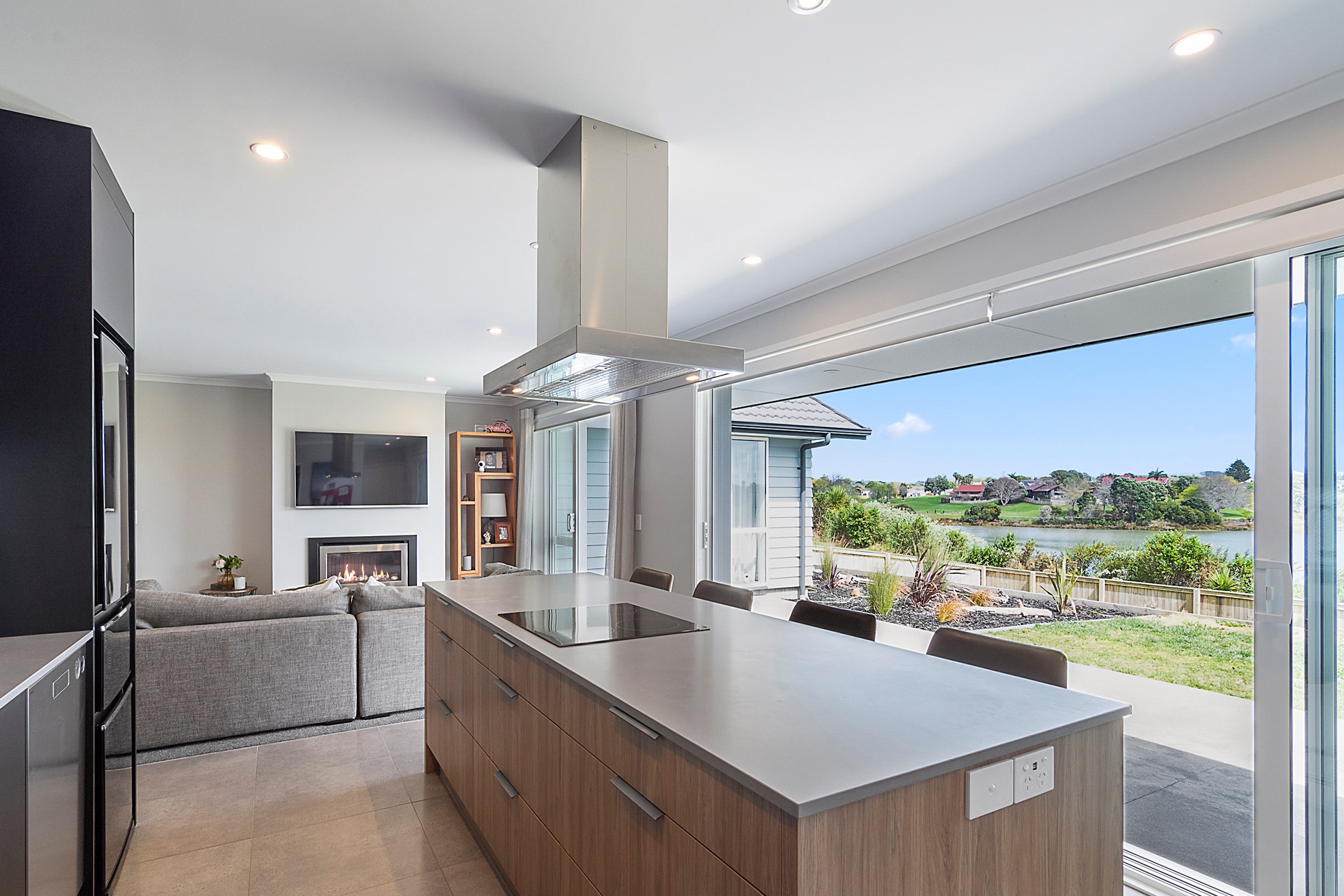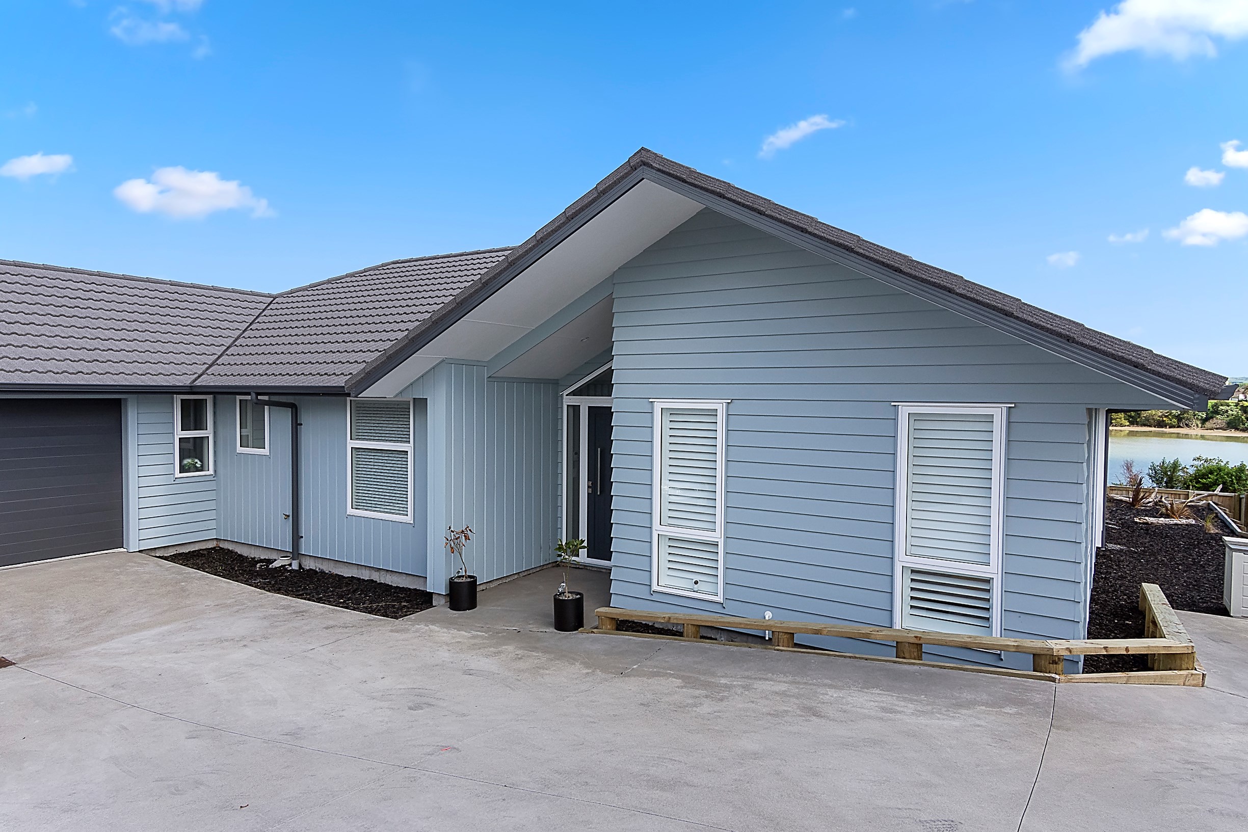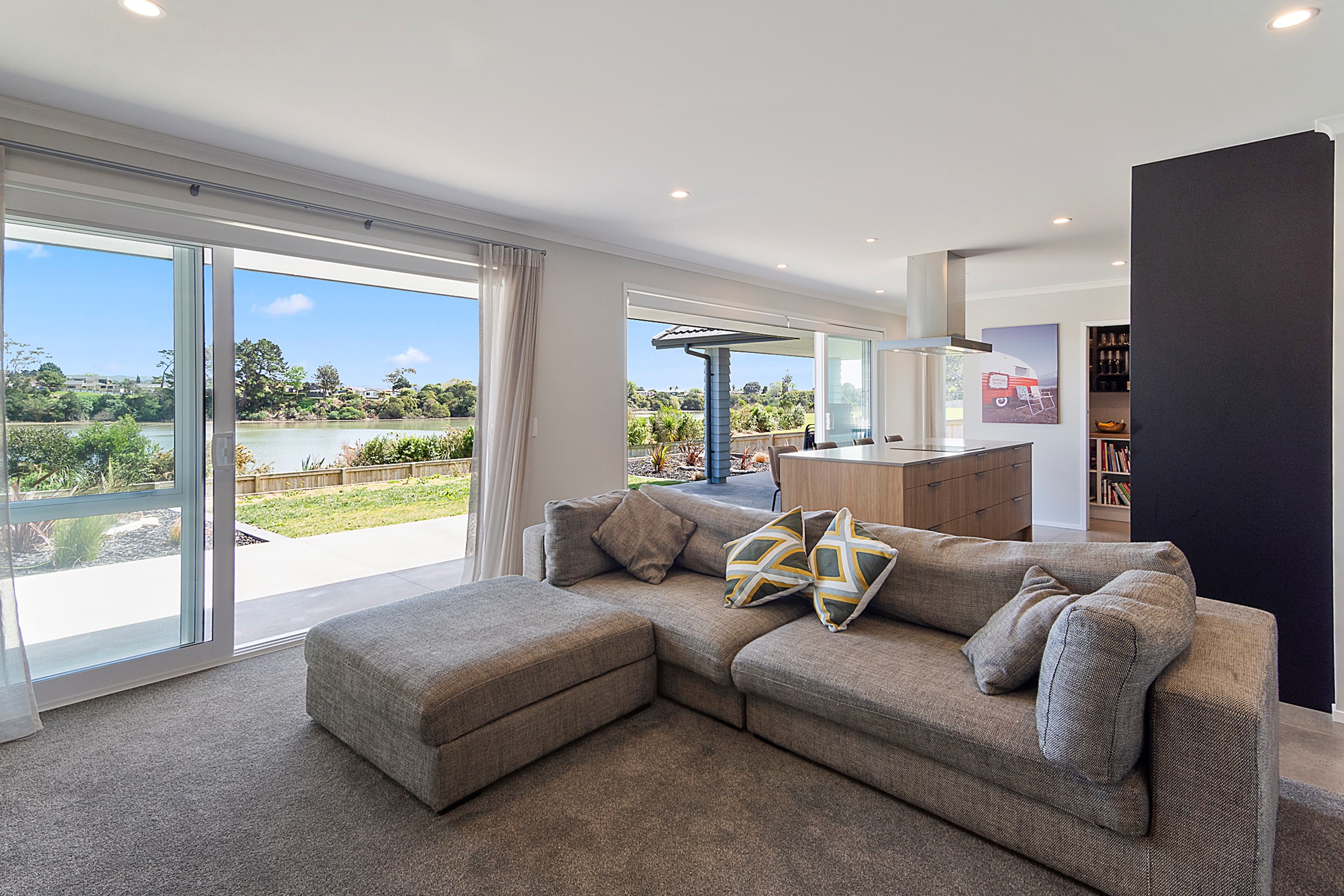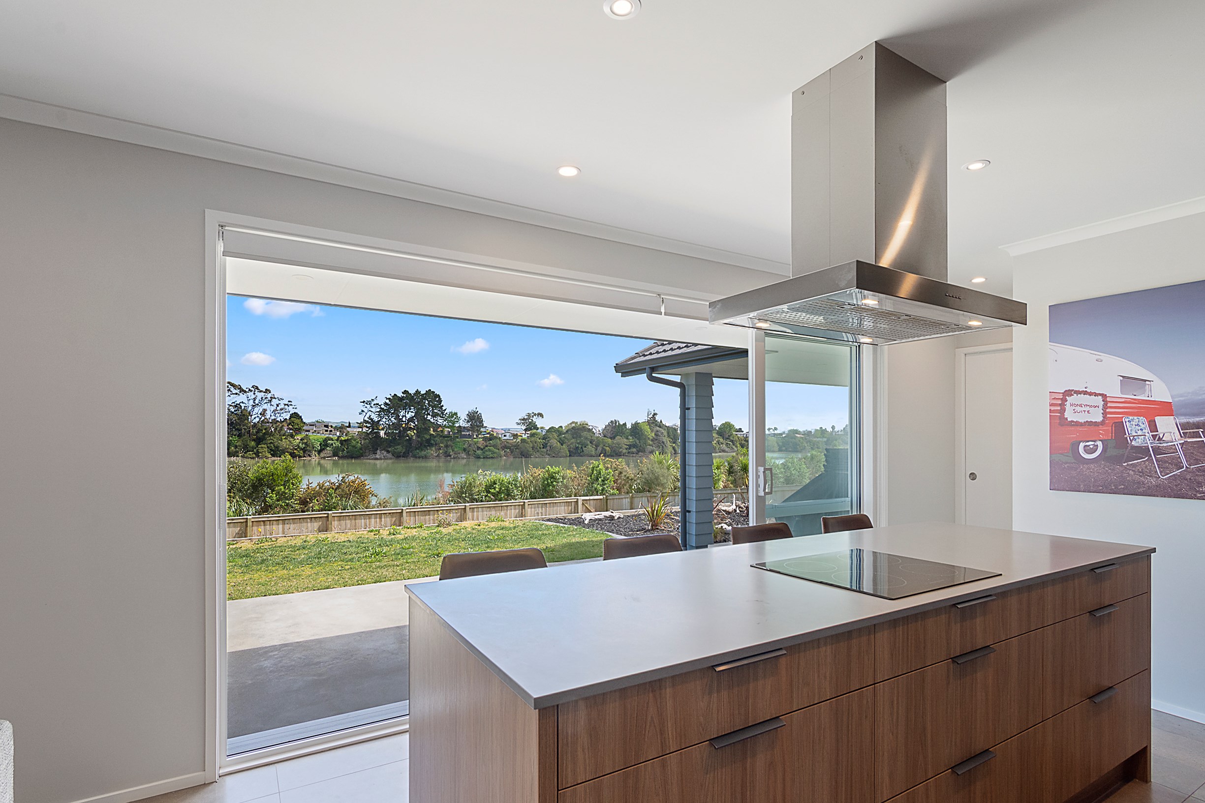 You’ll find three spacious bedrooms, including the main suite that has a designer ensuite and a walk-through wardrobe. There’s also a separate laundry and spacious garage with attic stairs for easy access to roof storage. The smart exterior is clad in James Hardie Oblique and Linea weatherboards and on the roof are Gerard pressed steel tiles – low-maintenance options that leave more time to enjoy the river views and the sunsets.